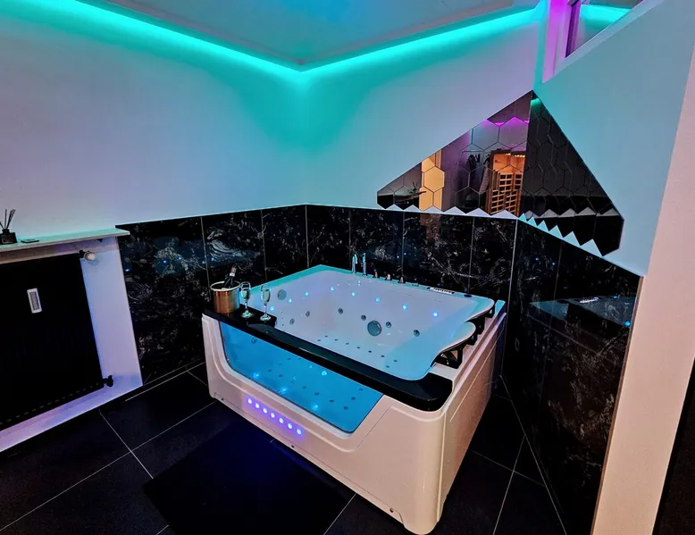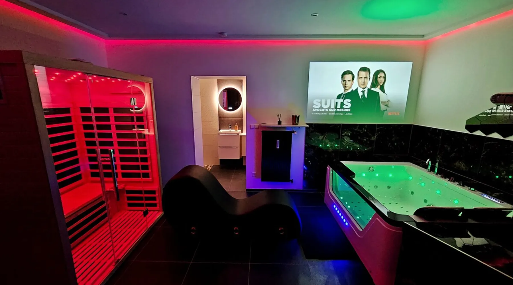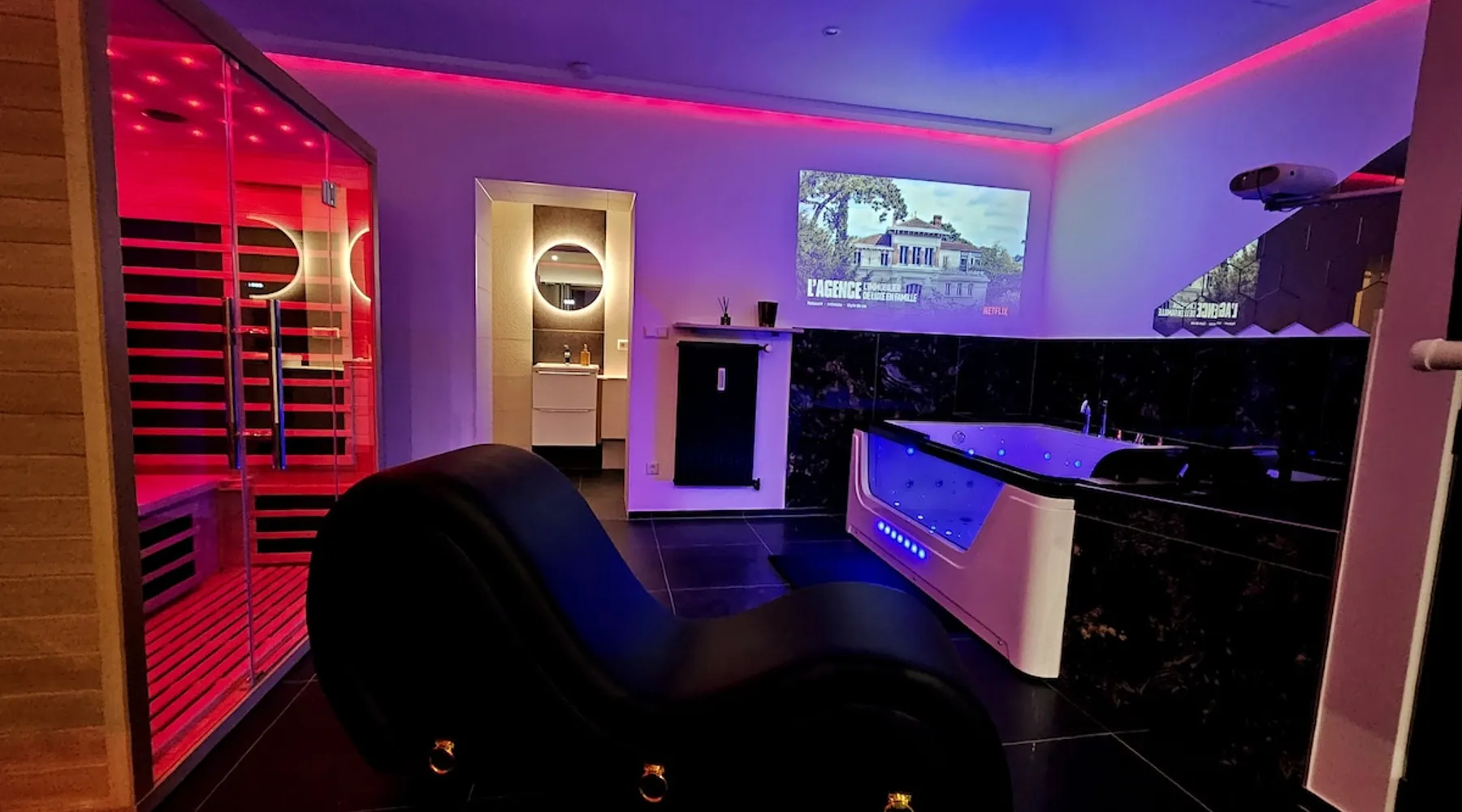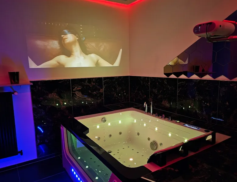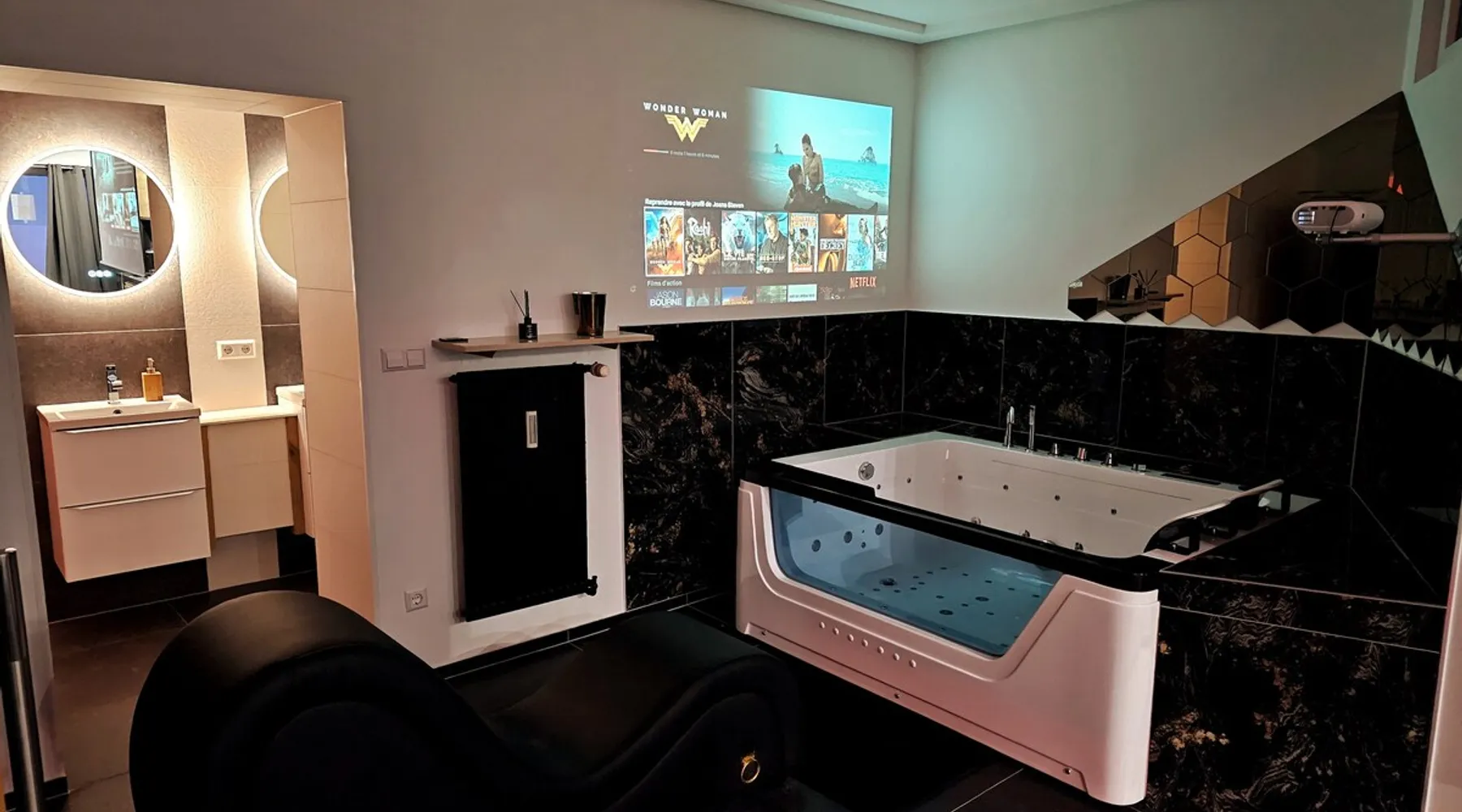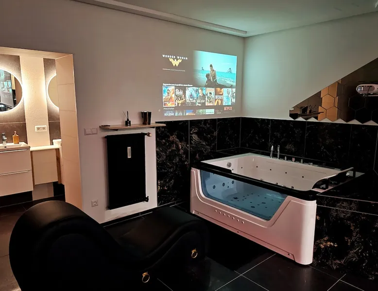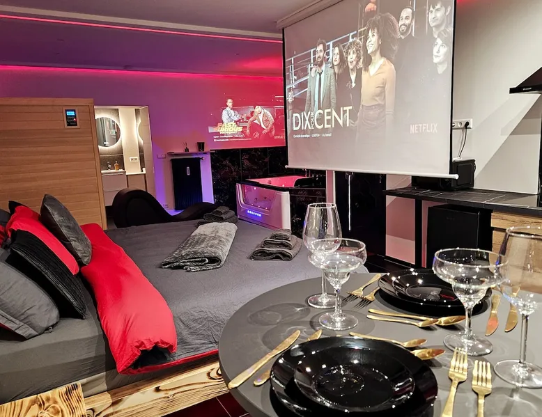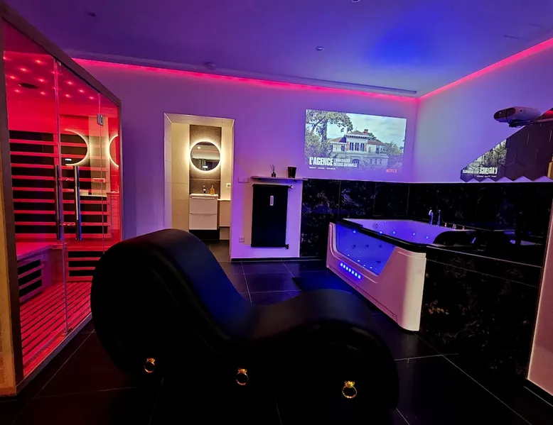 Come and meet up with your partner for an overnight getaway or a romantic weekend. Our Spa Suite offers all the comfort and equipment you need for a moment of relaxation. On the programme: large 2-seater glass Jacuzzi bath, infrared sauna, large shower, king-size bed 2m x 2m, 2 cinema screens, Tantra sofa, fully-equipped kitchen with fridge and ice maker. Discreet, self-contained arrival. Free on-street parking and amenities nearby. For 2 adults only. Reserve the Suite Spa, YOU'LL LOVE IT !!! The space Large 45 m2 suite with fully equipped kitchen and dining area for 2. Come and rest in the very large 2m x 2m bed with 2 comfort zones from which you can enjoy your favourite Netflix series and films. The relaxation area takes you into our magnificent 2-seater glass Jacuzzi bath for a chromotherapy massage session in front of your film. You can continue your journey in the infrared Sauna for a gradual rise in temperature. The Tantra Sofa will complete the experience. Finally, our huge Italian shower will bring you gently back to yourself. Would you like to enjoy this unique experience? All you have to do is book the Spa Suite or the Spa Appart, offering the same services for 4 people, with family or friends. You'll love it, as will the vast majority of our customers, judging by the comments. Sheets and towels as well as a welcome kit (coffee, tea, sugar, salt, pepper, soap, shower gel, shampoo, etc.) are available on site. Guest access The Suite Spa and its facilities are reserved for your exclusive use. Access to the suite is completely independent thanks to our secure key box. Once you have made your reservation, you will receive a confirmation message. On the day of your arrival, you will receive all the access details with the exact address and the key box code. all you have to do is enjoy. A welcome booklet in French and English is available on site. When you leave, simply lock up the Spa suite, return the keys to the key box and leave us a great Airbnb comment. Other things to note The large Jacuzzi bath, the Sauna and the Tantra sofa, as well as all the other facilities in the Suite Spa , are for your exclusive use during your stay. All these facilities are thoroughly cleaned. The Spa Suite can accommodate 2 adults only. parties and events are not permitted. security instructions on site. Come and enjoy this unique experience.