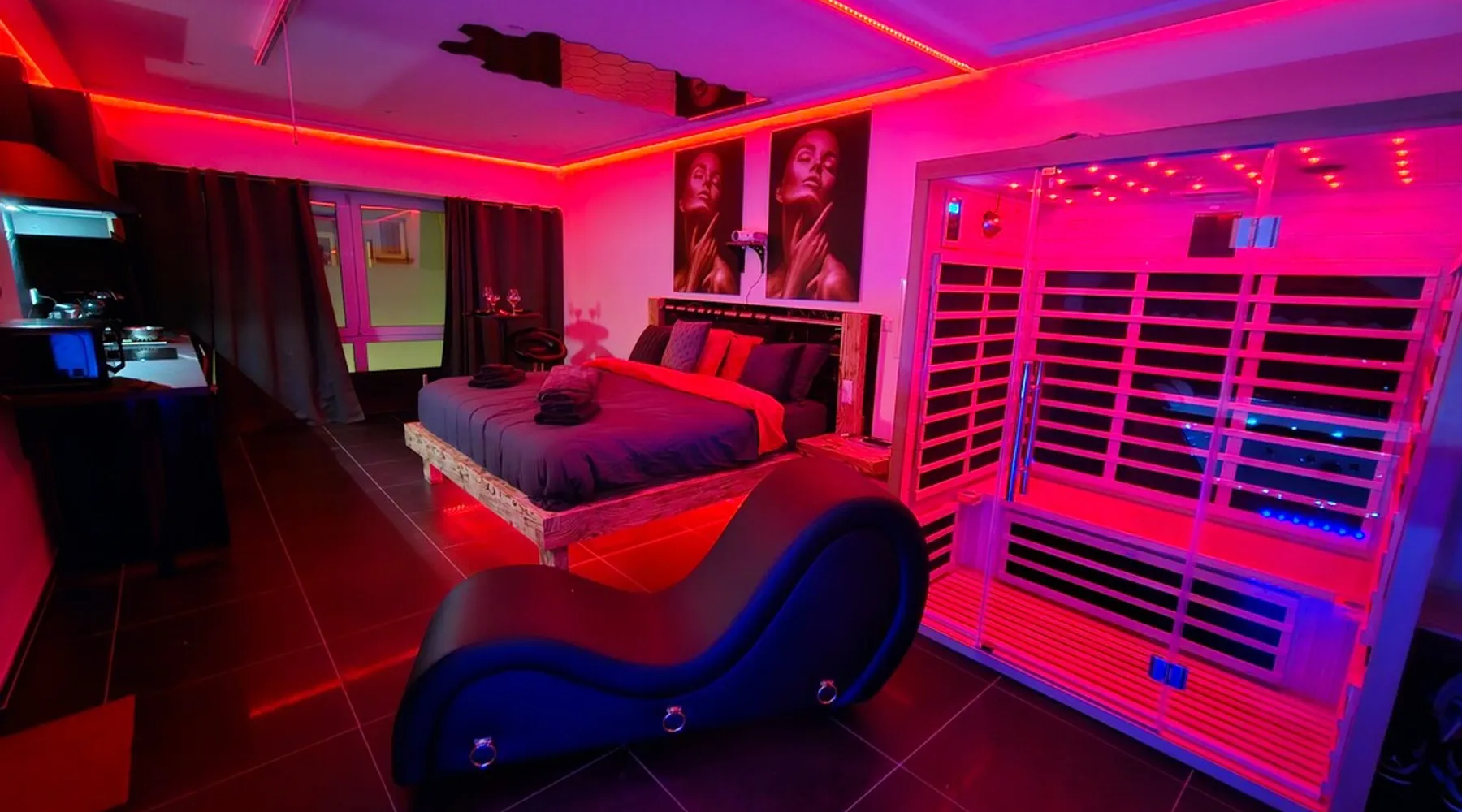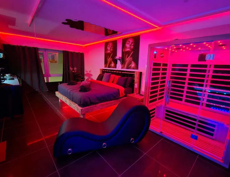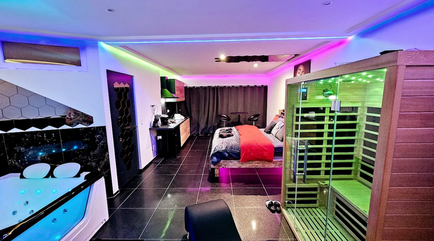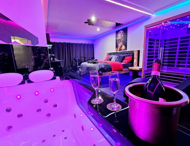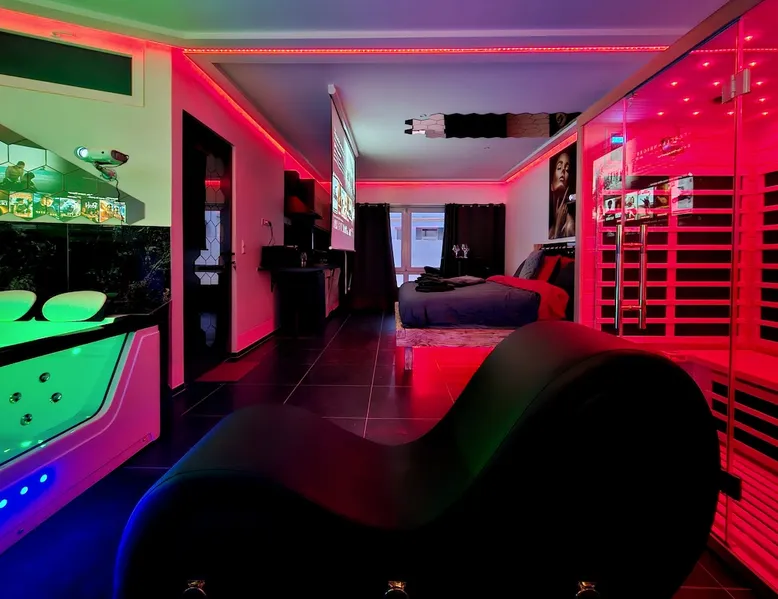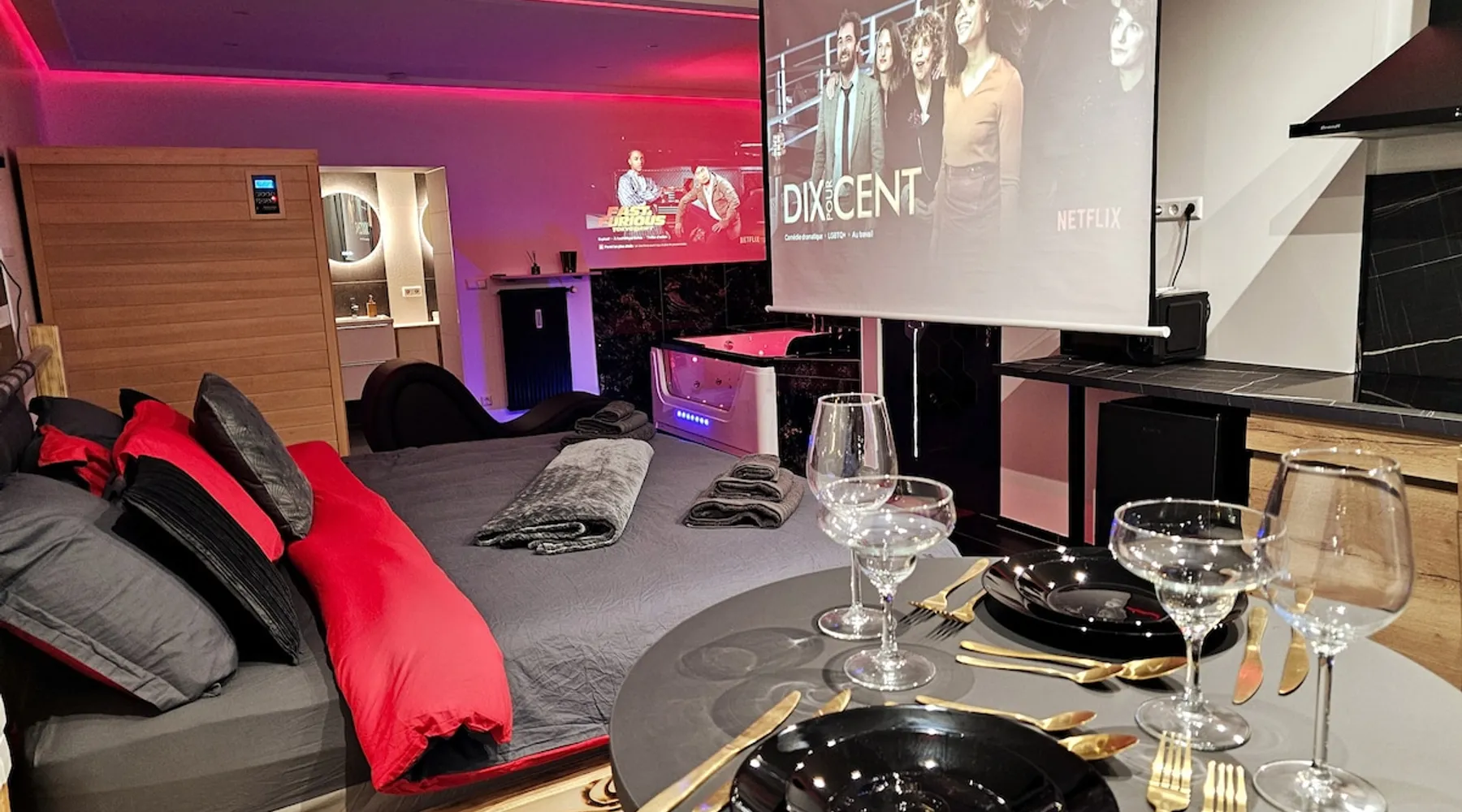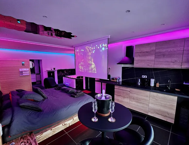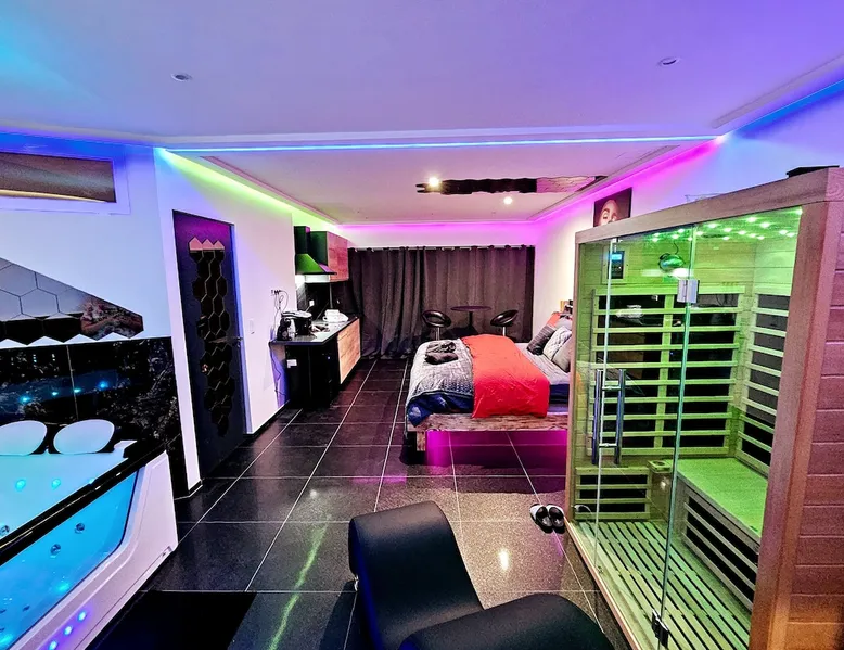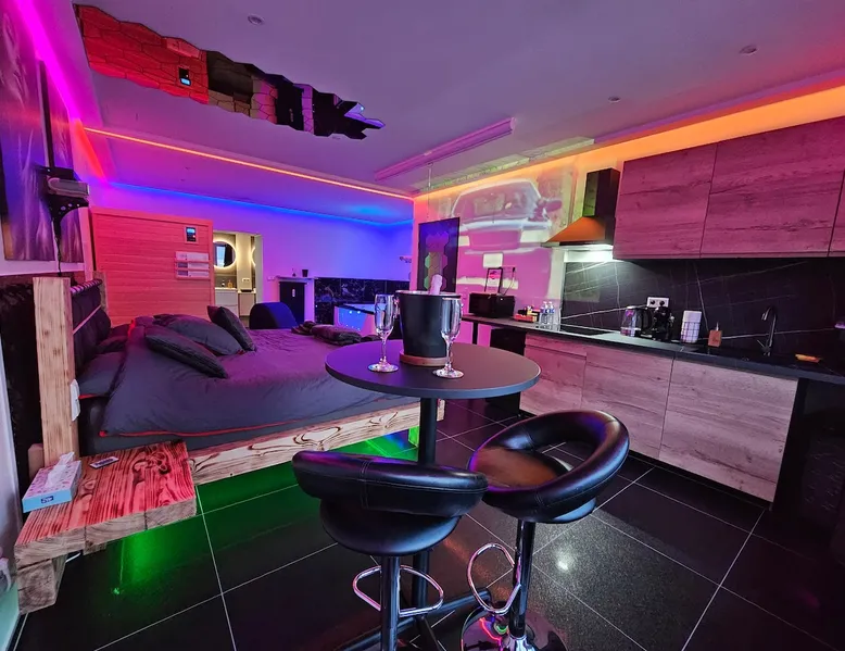 Come and meet up with your partner for an overnight getaway or a romantic weekend. Our Spa Suite offers all the comfort and equipment you need for a moment of relaxation. On the programme: large 2-seater glass Jacuzzi bath, infrared sauna, large shower, king-size bed 2m x 2m, 2 cinema screens, Tantra sofa, fully-equipped kitchen with fridge and ice maker. Discreet, self-contained arrival. Free on-street parking and amenities nearby. For 2 adults only. Reserve the Suite Spa, YOU'LL LOVE IT !!! The space Large 45 m2 suite with fully equipped kitchen and dining area for 2. Come and rest in the very large 2m x 2m bed with 2 comfort zones from which you can enjoy your favourite Netflix series and films. The relaxation area takes you into our magnificent 2-seater glass Jacuzzi bath for a chromotherapy massage session in front of your film. You can continue your journey in the infrared Sauna for a gradual rise in temperature. The Tantra Sofa will complete the experience. Finally, our huge Italian shower will bring you gently back to yourself. Would you like to enjoy this unique experience? All you have to do is book the Spa Suite or the Spa Appart, offering the same services for 4 people, with family or friends. You'll love it, as will the vast majority of our customers, judging by the comments. Sheets and towels as well as a welcome kit (coffee, tea, sugar, salt, pepper, soap, shower gel, shampoo, etc.) are available on site. Guest access The Suite Spa and its facilities are reserved for your exclusive use. Access to the suite is completely independent thanks to our secure key box. Once you have made your reservation, you will receive a confirmation message. On the day of your arrival, you will receive all the access details with the exact address and the key box code. all you have to do is enjoy. A welcome booklet in French and English is available on site. When you leave, simply lock up the Spa suite, return the keys to the key box and leave us a great Airbnb comment. Other things to note The large Jacuzzi bath, the Sauna and the Tantra sofa, as well as all the other facilities in the Suite Spa , are for your exclusive use during your stay. All these facilities are thoroughly cleaned. The Spa Suite can accommodate 2 adults only. parties and events are not permitted. security instructions on site. Come and enjoy this unique experience.