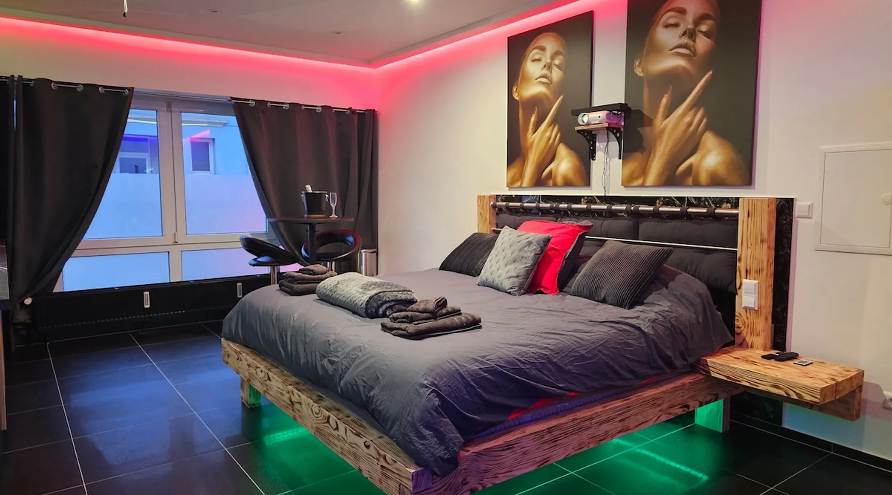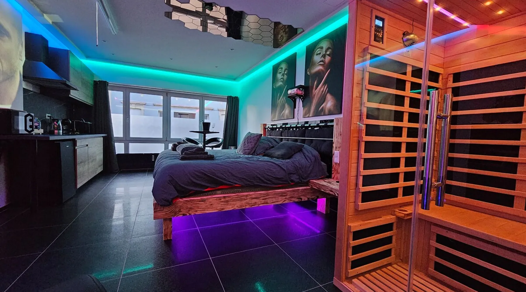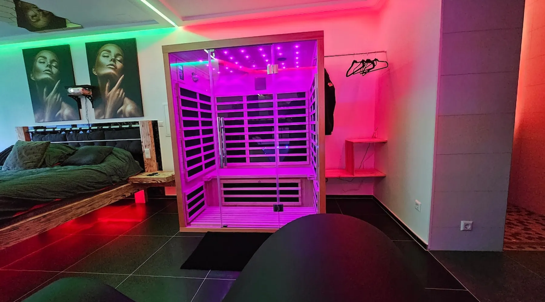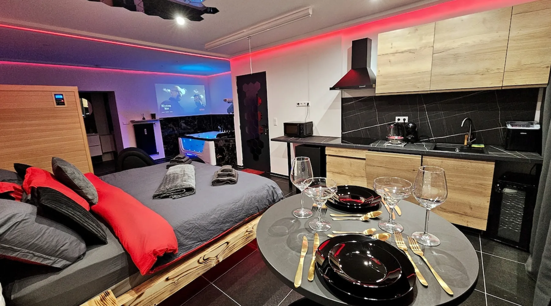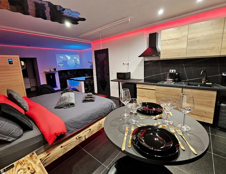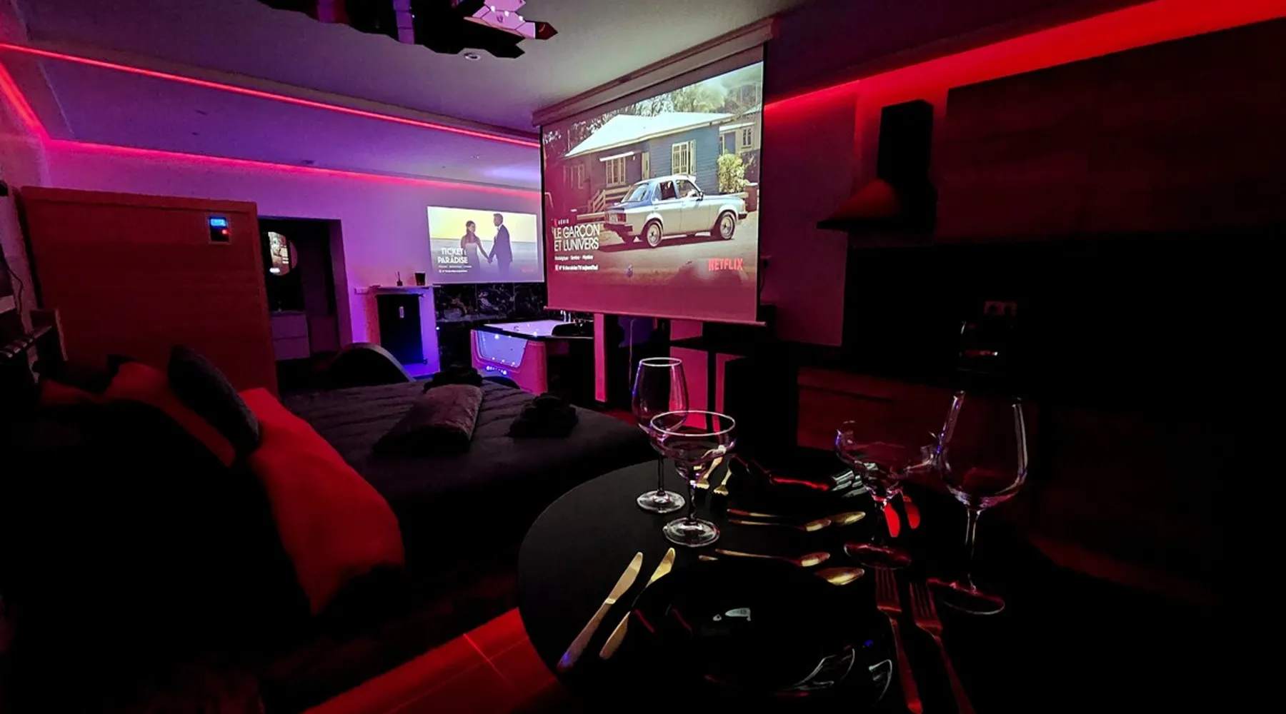 Come and meet up with your partner for an overnight getaway or a romantic weekend. Our Spa Suite offers all the comfort and equipment you need for a moment of relaxation. On the programme: large 2-seater glass Jacuzzi bath, infrared sauna, large shower, king-size bed 2m x 2m, 2 cinema screens, Tantra sofa, fully-equipped kitchen with fridge and ice maker. Discreet, self-contained arrival. Free on-street parking and amenities nearby. For 2 adults only. Reserve the Suite Spa, YOU'LL LOVE IT !!! The space Large 45 m2 suite with fully equipped kitchen and dining area for 2. Come and rest in the very large 2m x 2m bed with 2 comfort zones from which you can enjoy your favourite Netflix series and films. The relaxation area takes you into our magnificent 2-seater glass Jacuzzi bath for a chromotherapy massage session in front of your film. You can continue your journey in the infrared Sauna for a gradual rise in temperature. The Tantra Sofa will complete the experience. Finally, our huge Italian shower will bring you gently back to yourself. Would you like to enjoy this unique experience? All you have to do is book the Spa Suite or the Spa Appart, offering the same services for 4 people, with family or friends. You'll love it, as will the vast majority of our customers, judging by the comments. Sheets and towels as well as a welcome kit (coffee, tea, sugar, salt, pepper, soap, shower gel, shampoo, etc.) are available on site. Guest access The Suite Spa and its facilities are reserved for your exclusive use. Access to the suite is completely independent thanks to our secure key box. Once you have made your reservation, you will receive a confirmation message. On the day of your arrival, you will receive all the access details with the exact address and the key box code. all you have to do is enjoy. A welcome booklet in French and English is available on site. When you leave, simply lock up the Spa suite, return the keys to the key box and leave us a great Airbnb comment. Other things to note The large Jacuzzi bath, the Sauna and the Tantra sofa, as well as all the other facilities in the Suite Spa , are for your exclusive use during your stay. All these facilities are thoroughly cleaned. The Spa Suite can accommodate 2 adults only. parties and events are not permitted. security instructions on site. Come and enjoy this unique experience.