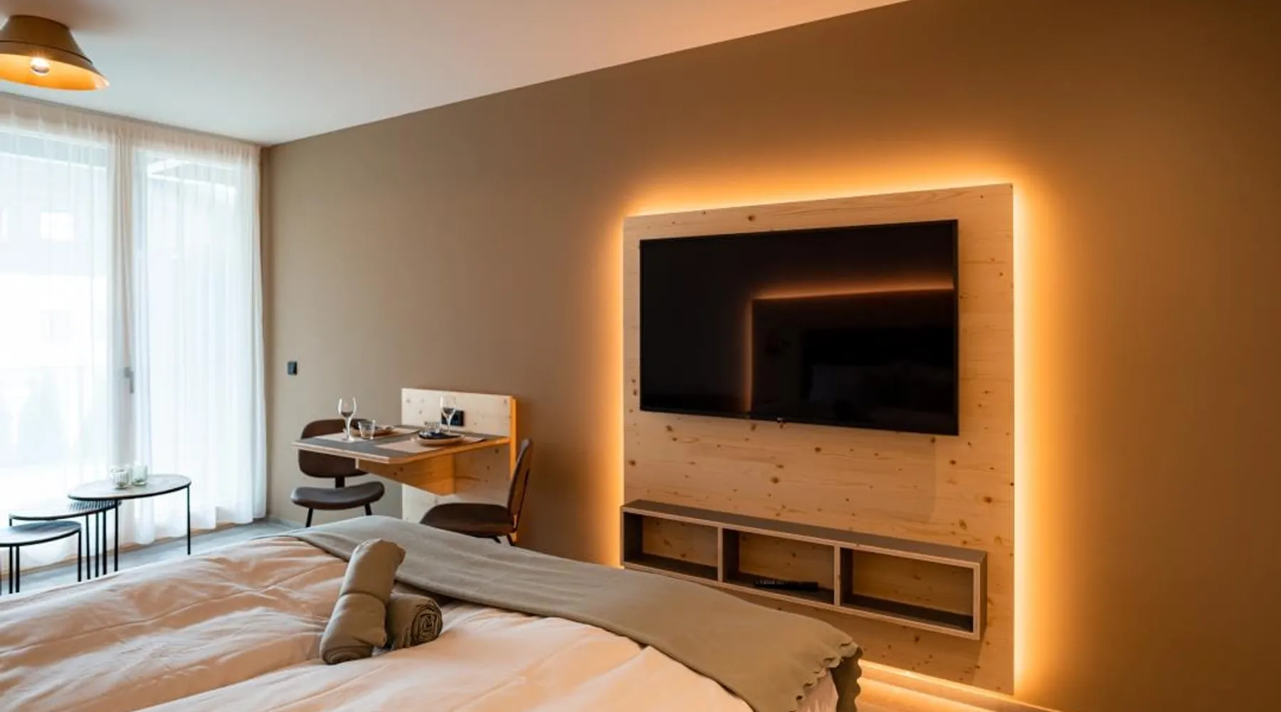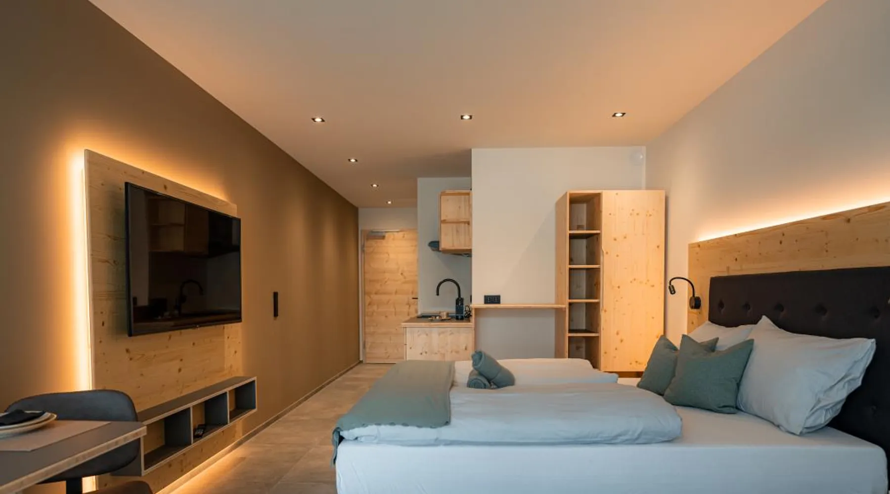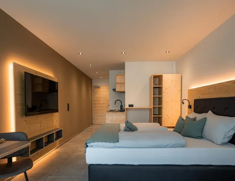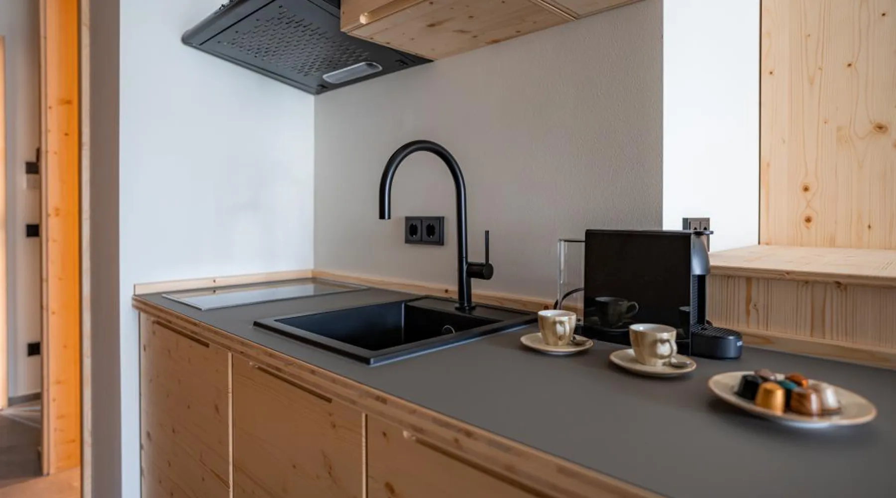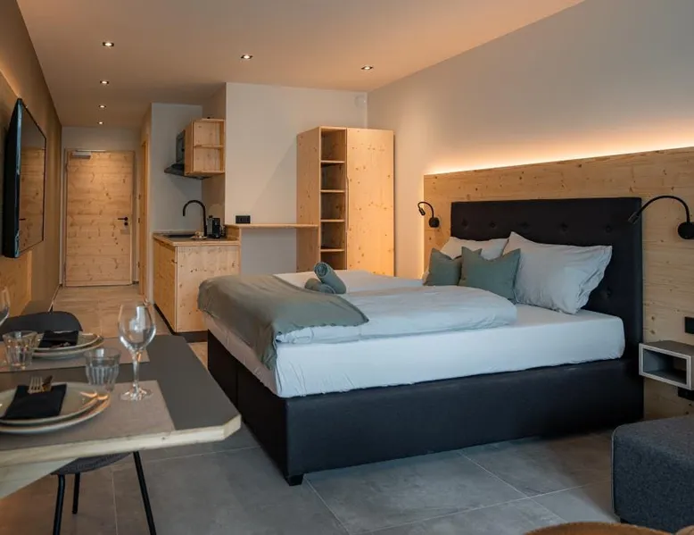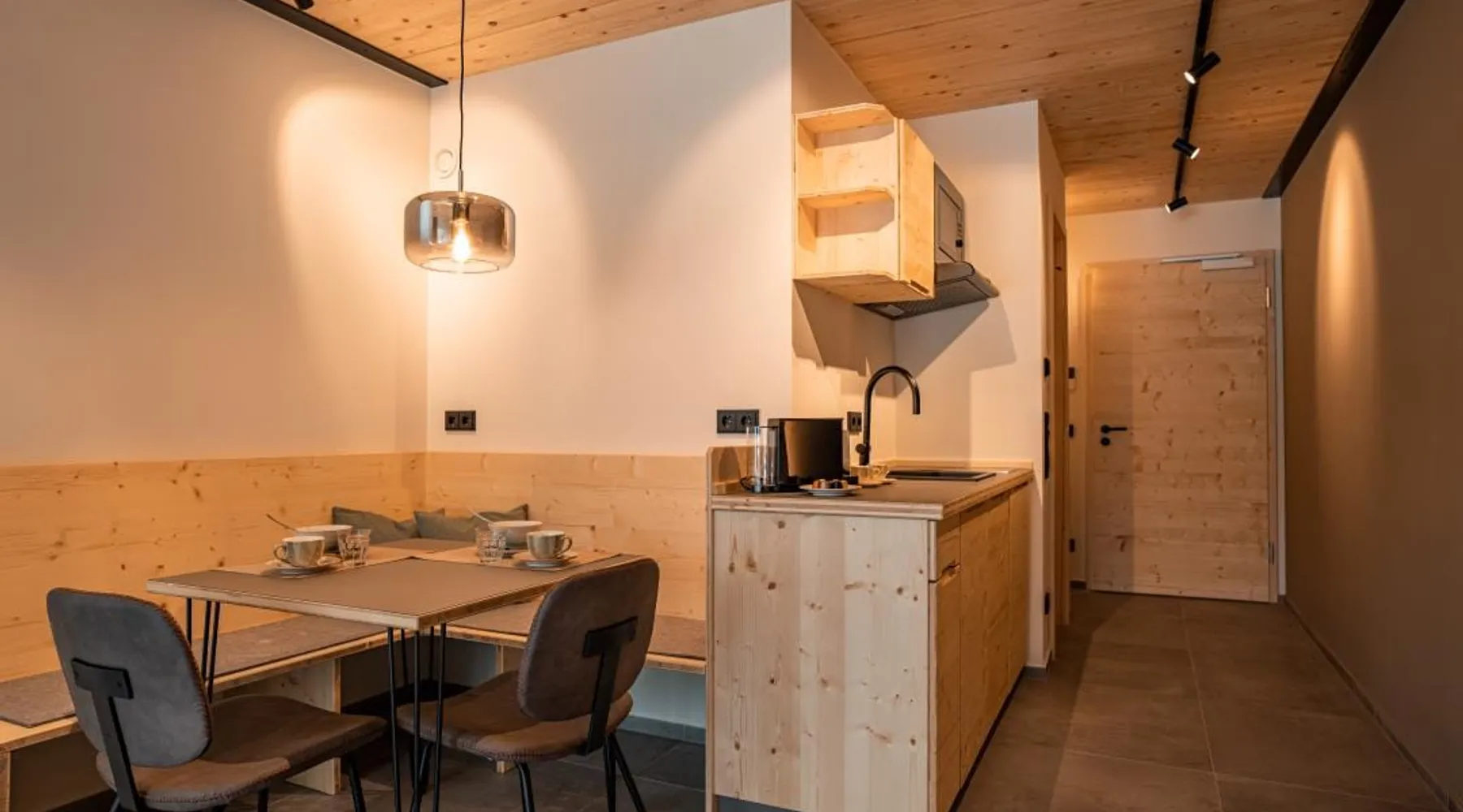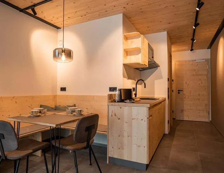 Our holiday apartments in the "Ammerglück" apartment house are elegantly and comfortably furnished and offer you the ideal facilities for your stay. The "classic" apartments are located on the first floor and have a combined living and sleeping area as well as a modern bathroom with shower, wc and hairdryer. You can spend a restful night in the comfortable double bed (1. 60 x 2. 00 m) after an eventful day. If you don't want to eat out, you can use the well-equipped kitchenette with fridge The space and microwave with integrated oven function and prepare your own meals. The cozy dining table invites you to eat, drink and socialize together. In the morning, you can enjoy a delicious breakfast on the spacious terrace and relax to your heart's content. Fast Wi-Fi is also available throughout the vacation apartment, so you can stay connected with your friends and family at home at all times. There is a washing machine and dryer in the house as well as a storage room for skis and bicycles. There are also several outdoor parking spaces for cars right next to the house. The apartment house "Ammerglück" is centrally located in the center of Oberammergau. Here you will find various sights (Passion Play House etc. ), the tourist information office, the train station and many shopping facilities. If you don't want to cook for yourself, you will find a variety of restaurants for your culinary vacation enjoyment. And of course Oberammergau and the Ammergau Alps region offer you countless opportunities for cultural and sporting leisure activities at any time of year. Welcome - we look forward to your visit!