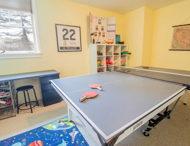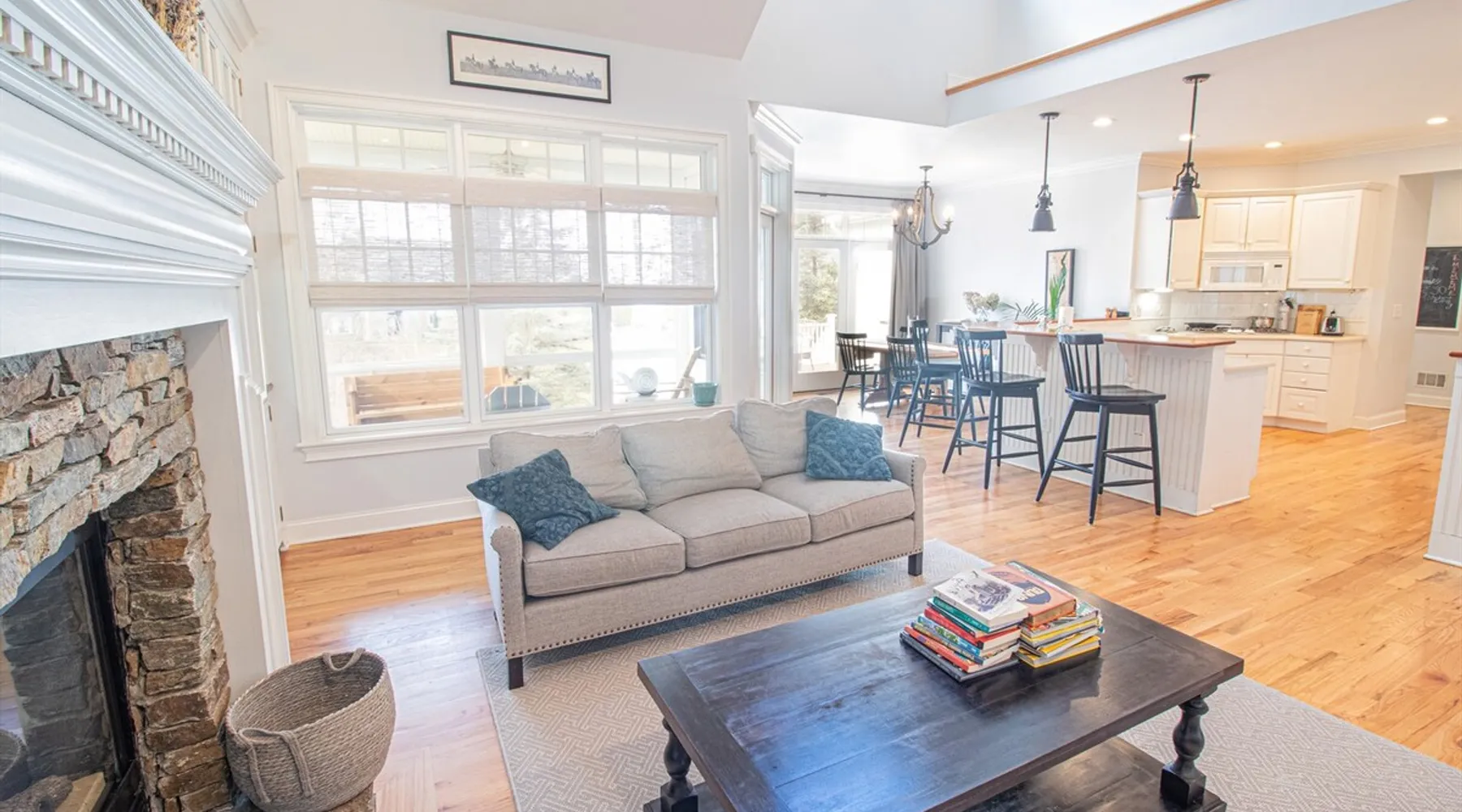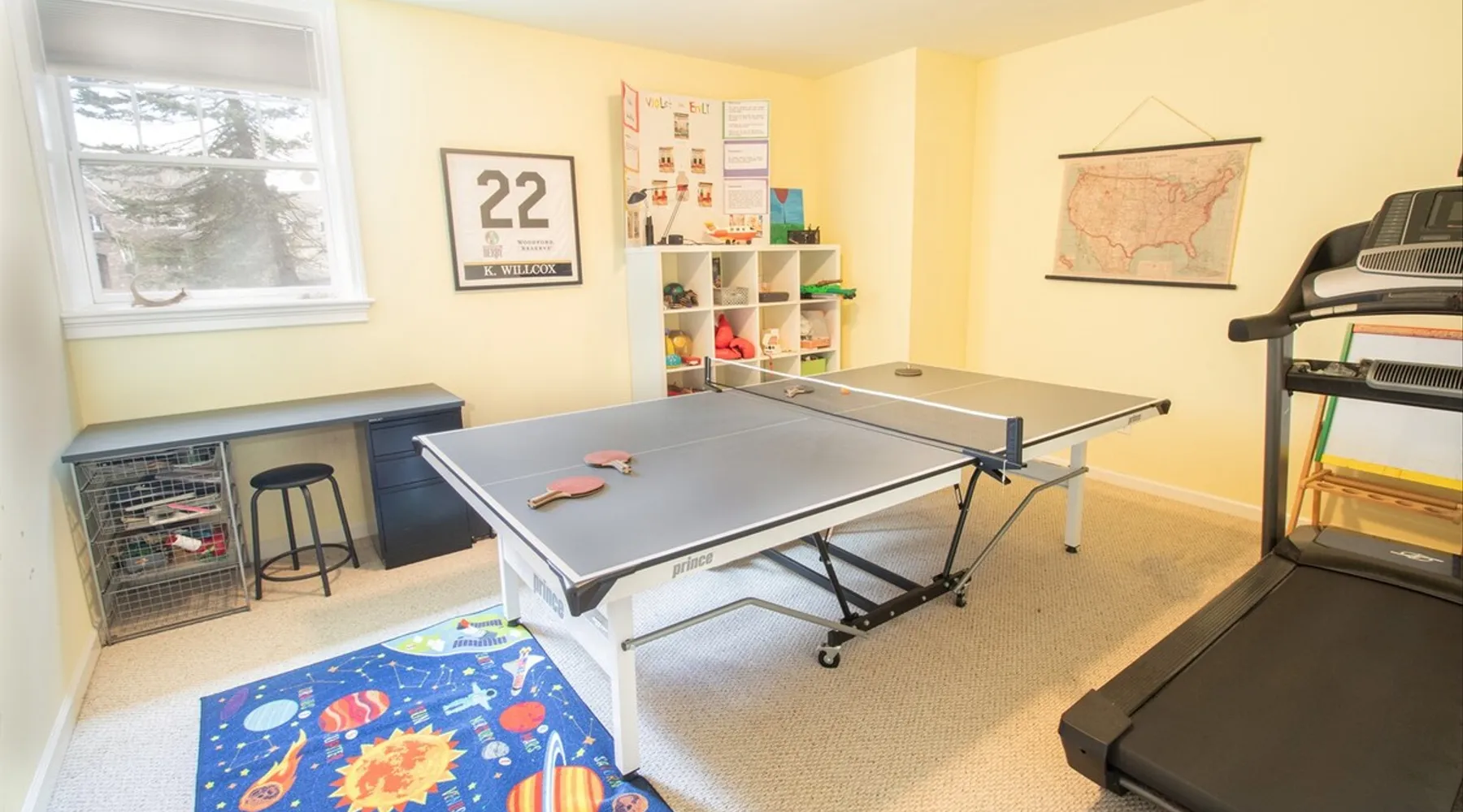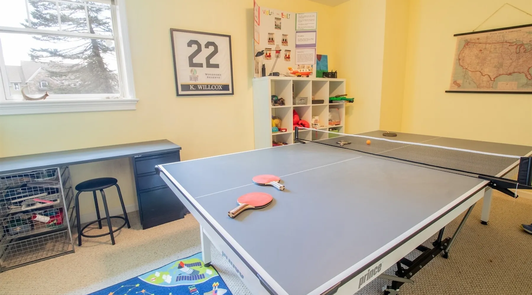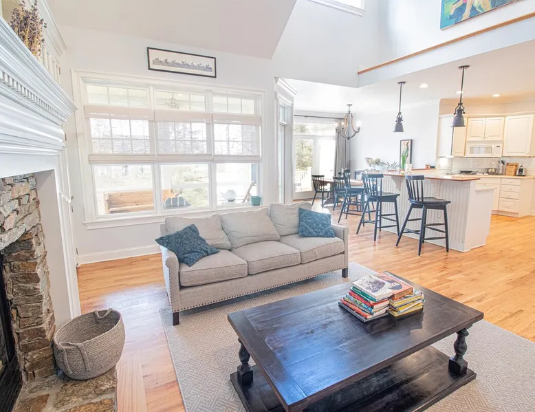 The gleaming white kitchen has all you need for meal prep, and you can choose between a dining area or the formal dining room where you can enjoy meals. The beautiful open concept living area is a great place to relax. A library provides a quiet place to read or do work or maybe you prefer a view of the lake from the screened in porch. The basement is finished with additional bedrooms and a game room with a ping pong table! Waterview of Lake Lonely. The space Bedrooms: 4 Bedrooms Bed Size & Sleeping Arrangement: 1 King size beds, 1 Queen size bed and 2 Twin trundle beds. Bathrooms: 3 1/2 Bathrooms Living Area: Sofa Center Table Fireplace Wall Mirror Kitchen: Refrigerator Stove Oven Microwave Dishwasher Coffee Maker Drip Coffee Maker Toaster Freezer Kitchen Island Dining Table Baking Sheet Barbeque/Grill Utensils Wine Glasses Patio: Large deck with outdoor seating Dining Area: Dining table for 4 in the kitchen Dining table for 6 Note: The owner recently purchased a trampoline for his children, which will be in the yard this summer.