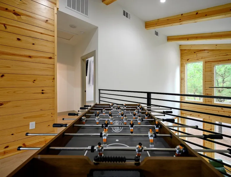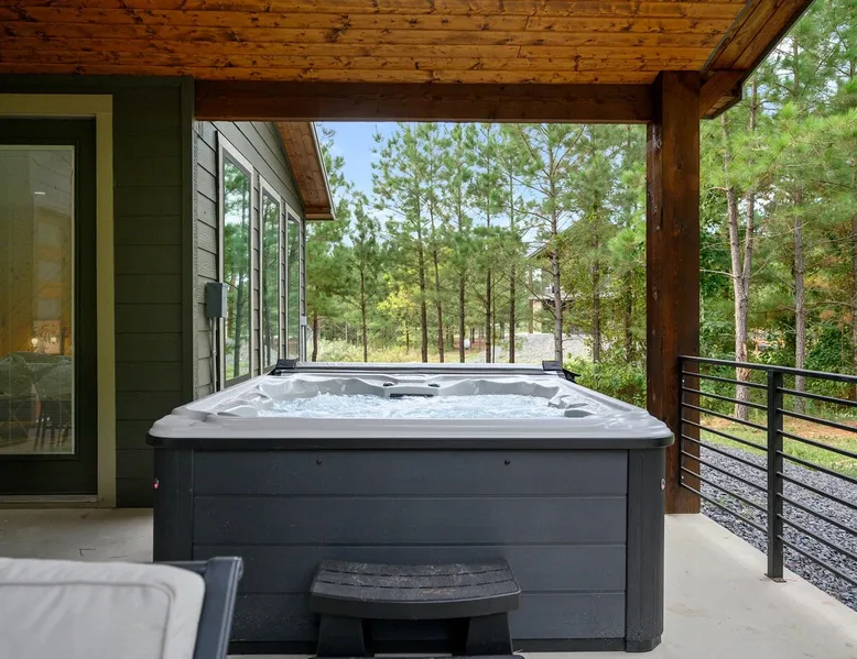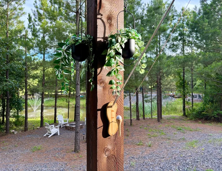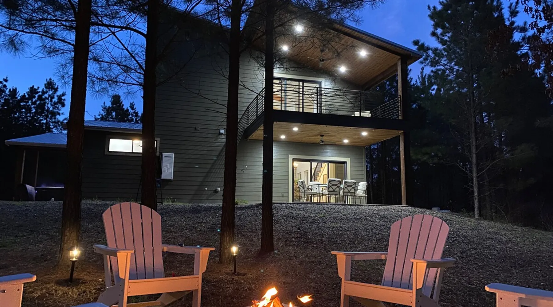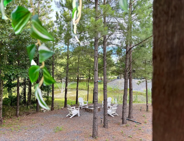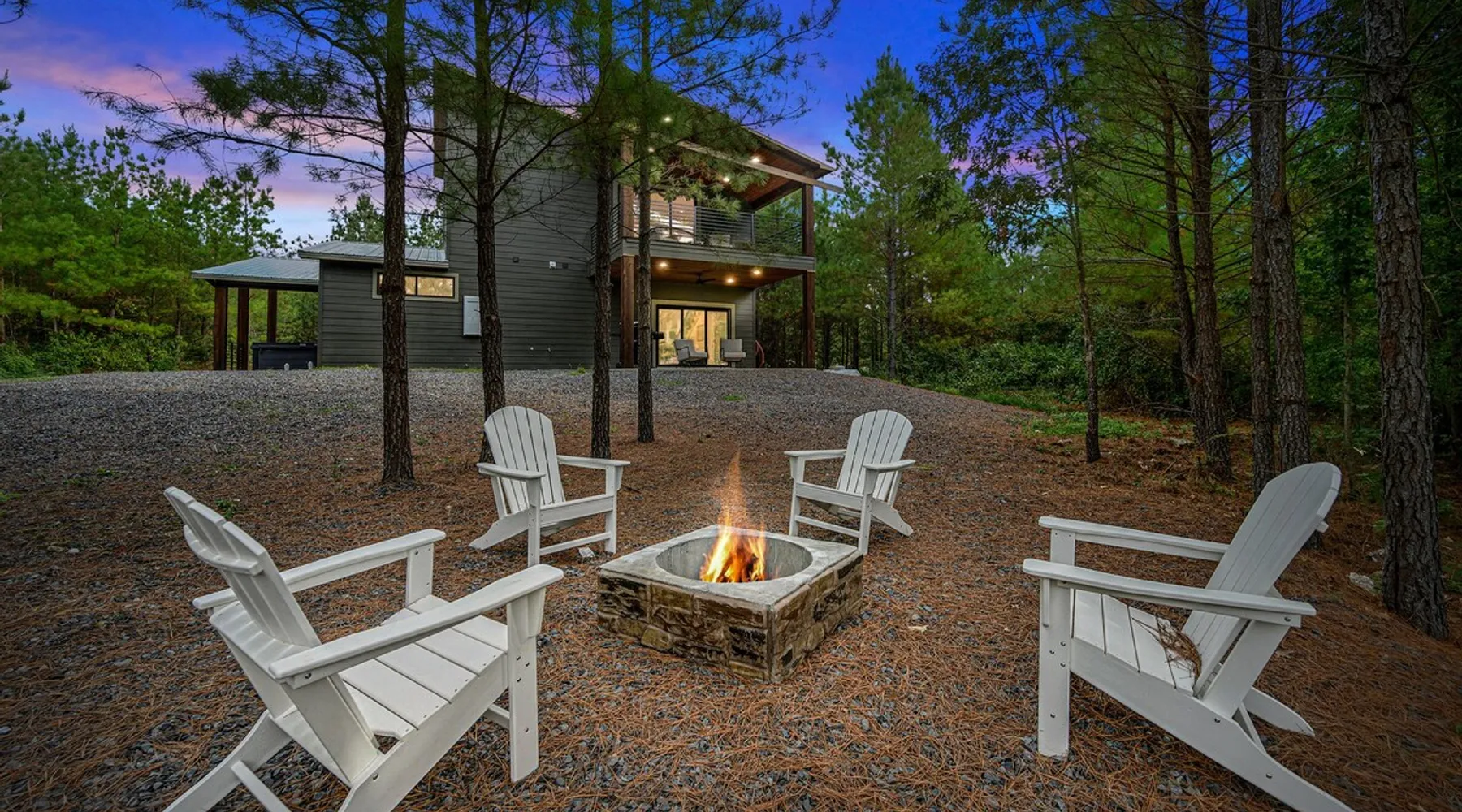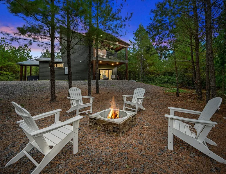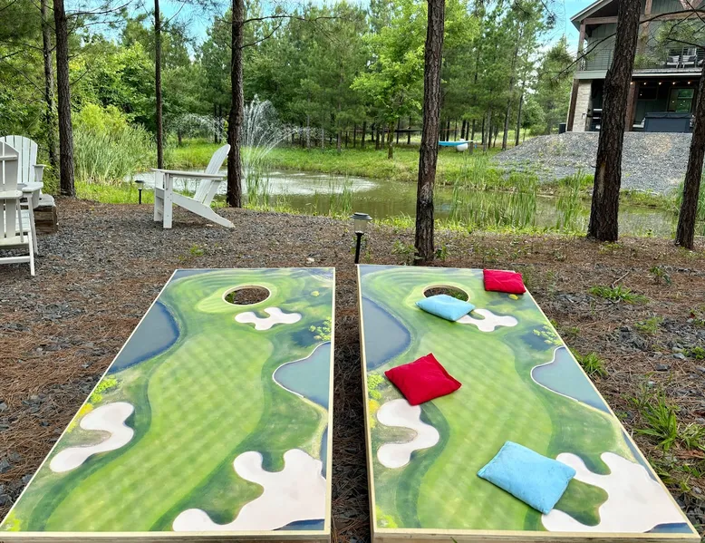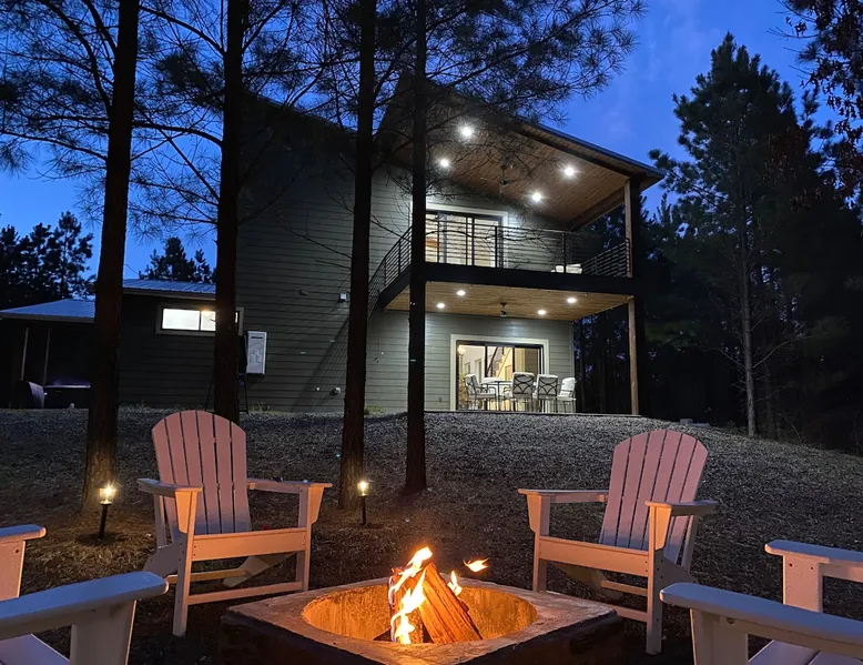 Nestled deep within a lush, dense forest, a hidden gem awaits - a tranquil cabin perched on the water's edge of a serene, beautiful pond. "Pondezvous" cabin is a sanctuary of peace and tranquility, a retreat where nature's beauty and modern luxury seamlessly merge. Surrounded by towering trees that sway gently in the breeze and the soothing sounds of chirping birds and rustling leaves, this place is a haven for those seeking an escape from the hustle and bustle of everyday life. The space Features & Fun ☀ Waterfront on your own fully stocked pond ☀ Large hot tub overlooking the water ☀ Indoor and outdoor fireplaces ☀ Axe throwing game for kids (and dads) ☀ Outdoor fire pit ☀ 2nd story balcony view overlooking the pond. ☀ Fire pit for smores, hot dogs and just relaxing by the water ☀ Fishing right out the back door for bass, catfish, bream, bluegill and crappie (catch and release only please) ☀ Outdoor dining ☀ Peaceful and quiet ☀ Luxury design ☀ Relax on the outdoor sitting area and watch your favorite movies ☀ Foosball & Air Hockey for hours of enjoyment ☀ 5 Smart TVs w/ Amazon Prime, Disney+, Hulu, Netflix, etc ☀ BBQ grill ☀ Open floor plan kitchen + living room ☀ Fully equipped kitchen w/ everything you need to cook your favorite meals ☀ Fast, free wifi w/ speeds up to 663 Mbps for work, leisure + streaming needs ☀ Washer + dryer ☀ Private backyard, back patio + front porch to enjoy tranquil country living ☆☆ OUTSIDE SPACE ☆☆ Lets start with the outside space as that will be the highlight of any Broken Bow cabin getaway. Enjoy the amazing view of the pond from hot tub, upstairs patio, downstairs patio or even the fire pit. With plenty of outdoor amenities, this cozy cabin is the perfect getaway for families who love spending time outside. Bring your fishing poles to drop a line in the water to see what you can catch. The pond is stocked with bass, catfish, bream, bluegill and crappie. Catch and release only please. Head to the back of the cabin to find the spacious outside back patio to enjoy a meal outside with views of nature and the pond. With a bubbling hot tub, a large picnic table for six, and lots of chairs for you to sit in and enjoy the scenery, we’re sure you’ll find this the perfect place to relax and watch the kids at play. This is outdoor living at its best. Cook some burgers or hot dogs on the BBQ grill. Enjoy them with a few drinks, while listening to the sound of the birds in the tall pines. Even enjoy a game of axe throwing (yes, I said axe throwing). Don’t worry, it is safe for kiddos. Cozy up by the outdoor fireplace and turn on an outdoor movie on the large outdoor smart TV. When it starts to get darker, slow the pace down a little and make use of the convenient fire pit. We’ve arranged lots of seating around it, so you’ll be able to enjoy moonlit conversations and lots of s’mores! Don’t worry when the evening starts to draw in. The ambient string lights mean that little ones will be able to carry on playing long after bedtime (parent permission pending)! Surrounded by Mother Nature, you’d have the perfect vacation simply hanging out at our cozy cabin and enjoying the wonderful amenities. ☆☆ BEDROOMS ☆☆ Surrounded by nature, this beautiful cabin offers plenty of space for 6 guests to relax, enjoy each other’s company and make wonderful memories. 2 master bedrooms (1 up and 1 down) provide guests with luxuriously comfortable king-sized beds, topped with a super comfy mattress. It’s so cozy, you may have trouble getting out of bed in the morning! Not only will you be able to enjoy your favorite TV shows on the large smart TV, but also the breathtaking views through the exceptionally large windows bringing nature indoors. In the mornings, step through the doors to enjoy alone time and a warm cup of coffee on the back patio before everyone else wakes up. Upstairs on the second floor, you’ll find the 2nd master bedroom and 2 custom built-in bunk beds in the loft area. The loft area is a great space for kids to hang out with a few board games, especially while listening to the pitter-patter of raindrops on a rainy day. Step out onto the private upper patio deck that gives you great views of the pond and forest around. ☆☆ BATHROOMS ☆☆ 2.5 full size stylish bathrooms with modern fixtures with plenty of room are available for use throughout your stay. On the first floor, the master bedroom has a private ensuite bathroom, complete with double sink vanity. The half bathroom is located on the first floor as well. The upstairs full bathroom also sports a double sink vanity and tiled shower. There’s plenty of bathroom space, so rest assured there won’t be a line for the bathroom. ☆☆ KITCHEN & LOUNGE ☆☆ As you enter the main floor of this luxurious cabin for the first time, you’ll be struck by the beauty of the high ceilings and the natural light streaming through the open-concept kitchen and living room. A fully stocked, modern kitchen is waiting for you to use as much or as little as you want! The kitchen boasts a full range of appliances, and no detail is overlooked, from the stainless stove and oven to a high-quality Keurig coffee maker. Start each day by brewing coffee your way and choosing from many outdoor spaces to enjoy it. We’ve added lots of personal touches throughout the cabin. Looking to unwind with some home cooking while you’re here? Get some cooking ideas from our favorite recipe books! We threw in a rack of spices to inspire you. We like to keep things casual yet stylish for your visit. The exquisite granite kitchen island is as functional as it is attractive, providing space for the family to gather around to enjoy meals or keep the chef company. The comfortable living room is the perfect place for the whole family to relax. Find a spot on the plump, oversized leather sofa or one of the comfy leather chairs. Flip a switch and enjoy the warming ambiance of th