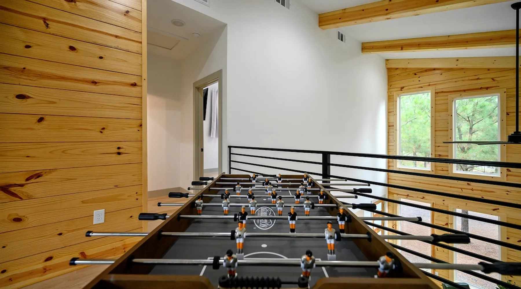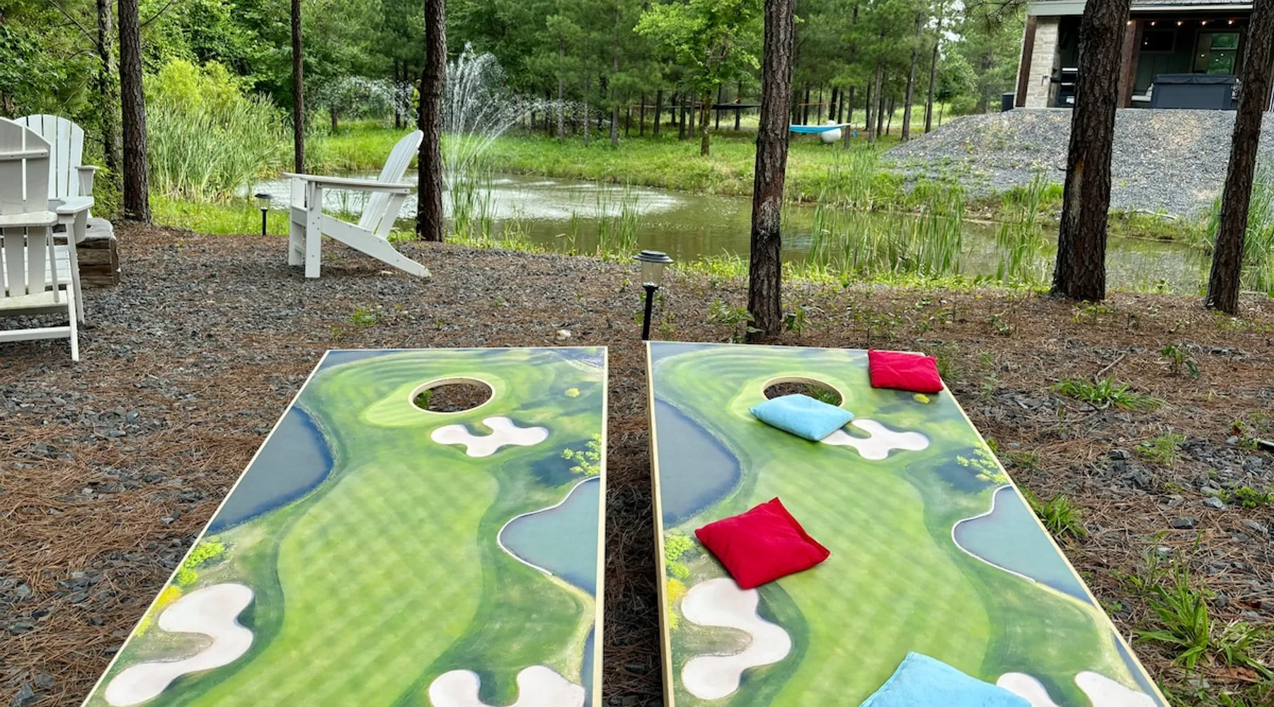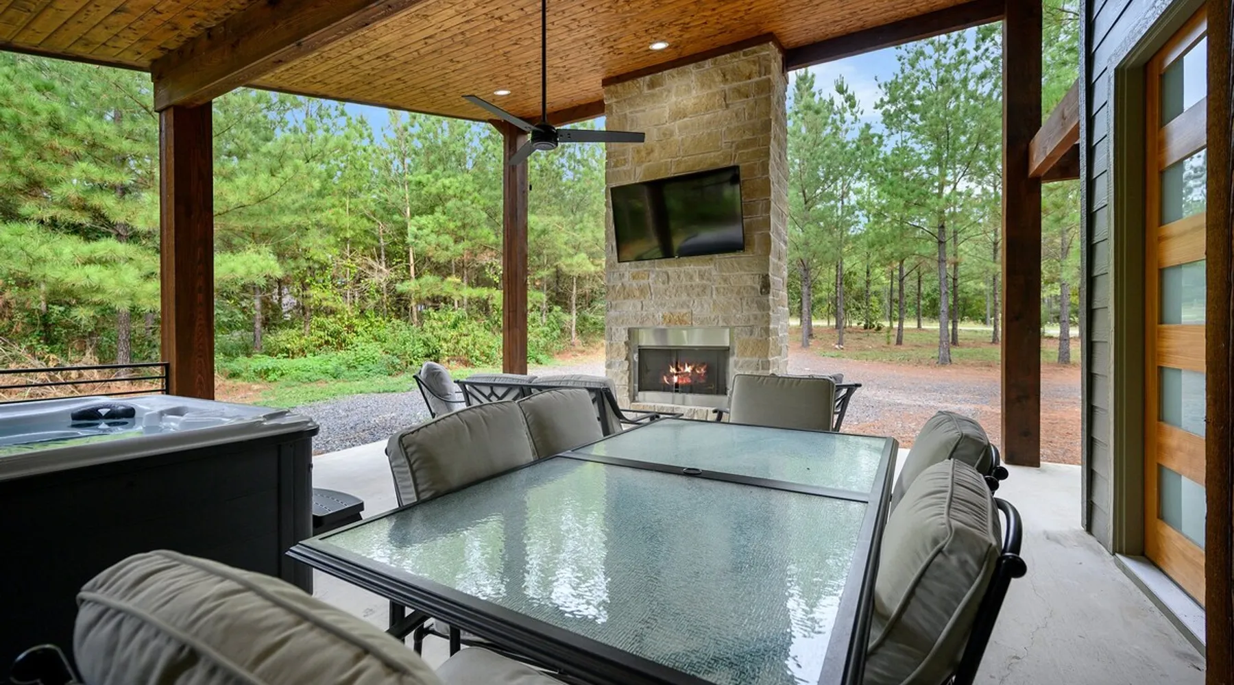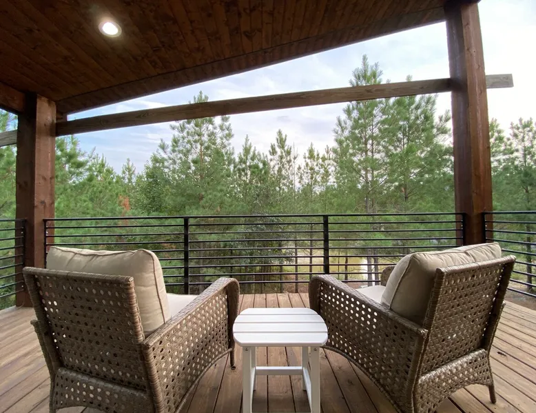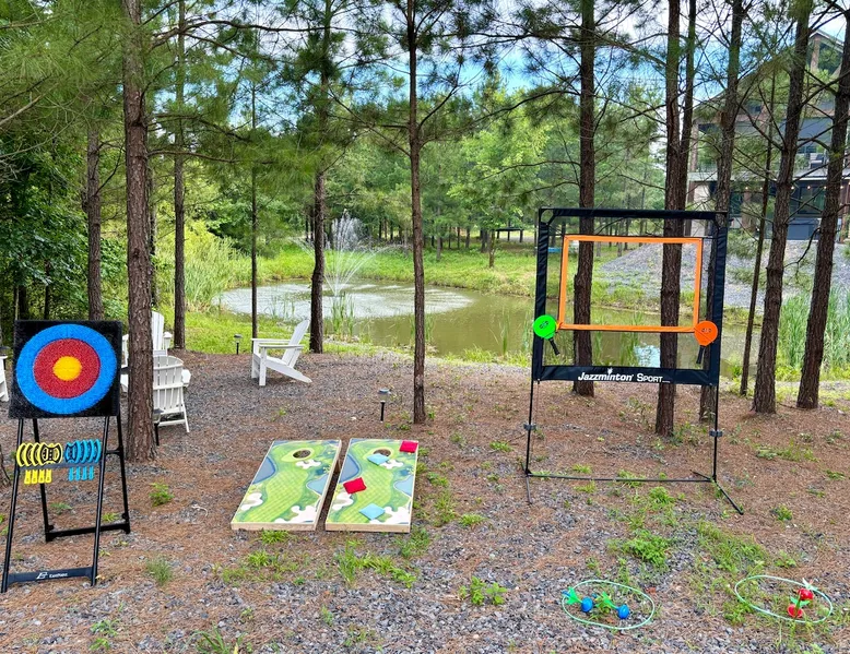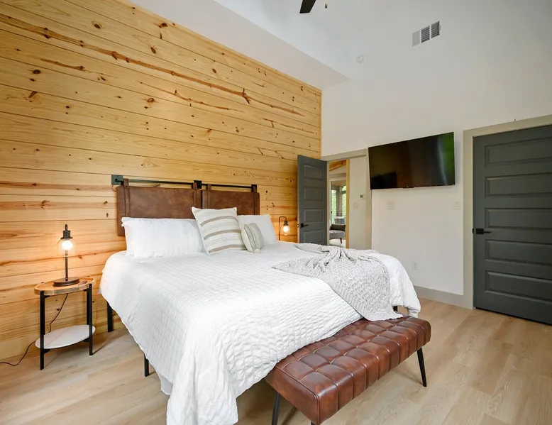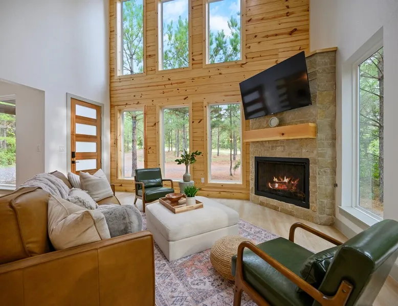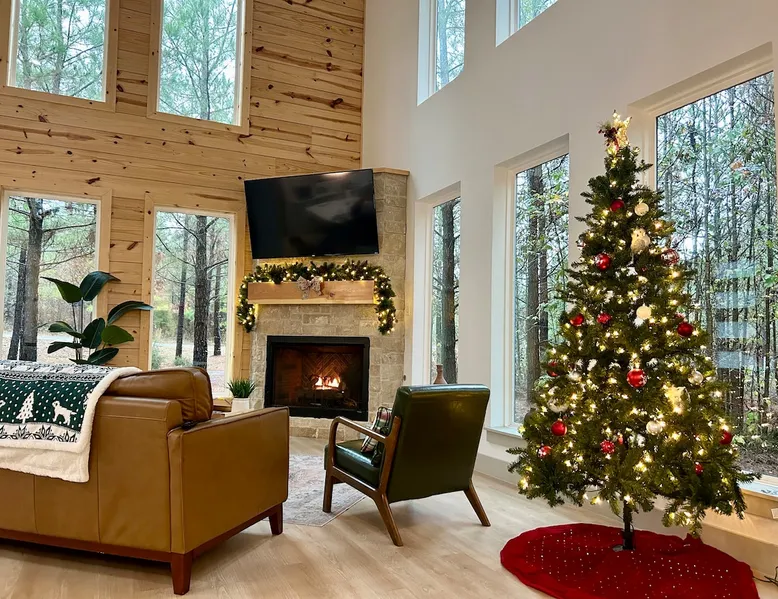Nestled deep within a lush, dense forest, a hidden gem awaits - a tranquil cabin perched on the water's edge of a serene, beautiful pond. "Pondezvous" cabin is a sanctuary of peace and tranquility, a retreat where nature's beauty and modern luxury seamlessly merge. Surrounded by towering trees that sway gently in the breeze and the soothing sounds of chirping birds and rustling leaves, this place is a haven for those seeking an escape from the hustle and bustle of everyday life. The space Features & Fun ☀ Waterfront on your own fully stocked pond ☀ Large hot tub overlooking the water ☀ Indoor and outdoor fireplaces ☀ Axe throwing game for kids (and dads) ☀ Outdoor fire pit ☀ 2nd story balcony view overlooking the pond. ☀ Fire pit for smores, hot dogs and just relaxing by the water ☀ Fishing right out the back door for bass, catfish, bream, bluegill and crappie (catch and release only please) ☀ Outdoor dining ☀ Peaceful and quiet ☀ Luxury design ☀ Relax on the outdoor sitting area and watch your favorite movies ☀ Foosball & Air Hockey for hours of enjoyment ☀ 5 Smart TVs w/ Amazon Prime, Disney+, Hulu, Netflix, etc ☀ BBQ grill ☀ Open floor plan kitchen + living room ☀ Fully equipped kitchen w/ everything you need to cook your favorite meals ☀ Fast, free wifi w/ speeds up to 663 Mbps for work, leisure + streaming needs ☀ Washer + dryer ☀ Private backyard, back patio + front porch to enjoy tranquil country living ☆☆ OUTSIDE SPACE ☆☆ Lets start with the outside space as that will be the highlight of any Broken Bow cabin getaway. Enjoy the amazing view of the pond from hot tub, upstairs patio, downstairs patio or even the fire pit. With plenty of outdoor amenities, this cozy cabin is the perfect getaway for families who love spending time outside. Bring your fishing poles to drop a line in the water to see what you can catch. The pond is stocked with bass, catfish, bream, bluegill and crappie. Catch and release only please. Head to the back of the cabin to find the spacious outside back patio to enjoy a meal outside with views of nature and the pond. With a bubbling hot tub, a large picnic table for six, and lots of chairs for you to sit in and enjoy the scenery, we’re sure you’ll find this the perfect place to relax and watch the kids at play. This is outdoor living at its best. Cook some burgers or hot dogs on the BBQ grill. Enjoy them with a few drinks, while listening to the sound of the birds in the tall pines. Even enjoy a game of axe throwing (yes, I said axe throwing). Don’t worry, it is safe for kiddos. Cozy up by the outdoor fireplace and turn on an outdoor movie on the large outdoor smart TV. When it starts to get darker, slow the pace down a little and make use of the convenient fire pit. We’ve arranged lots of seating around it, so you’ll be able to enjoy moonlit conversations and lots of s’mores! Don’t worry when the evening starts to draw in. The ambient string lights mean that little ones will be able to carry on playing long after bedtime (parent permission pending)! Surrounded by Mother Nature, you’d have the perfect vacation simply hanging out at our cozy cabin and enjoying the wonderful amenities. ☆☆ BEDROOMS ☆☆ Surrounded by nature, this beautiful cabin offers plenty of space for 6 guests to relax, enjoy each other’s company and make wonderful memories. 2 master bedrooms (1 up and 1 down) provide guests with luxuriously comfortable king-sized beds, topped with a super comfy mattress. It’s so cozy, you may have trouble getting out of bed in the morning! Not only will you be able to enjoy your favorite TV shows on the large smart TV, but also the breathtaking views through the exceptionally large windows bringing nature indoors. In the mornings, step through the doors to enjoy alone time and a warm cup of coffee on the back patio before everyone else wakes up. Upstairs on the second floor, you’ll find the 2nd master bedroom and 2 custom built-in bunk beds in the loft area. The loft area is a great space for kids to hang out with a few board games, especially while listening to the pitter-patter of raindrops on a rainy day. Step out onto the private upper patio deck that gives you great views of the pond and forest around. ☆☆ BATHROOMS ☆☆ 2.5 full size stylish bathrooms with modern fixtures with plenty of room are available for use throughout your stay. On the first floor, the master bedroom has a private ensuite bathroom, complete with double sink vanity. The half bathroom is located on the first floor as well. The upstairs full bathroom also sports a double sink vanity and tiled shower. There’s plenty of bathroom space, so rest assured there won’t be a line for the bathroom. ☆☆ KITCHEN & LOUNGE ☆☆ As you enter the main floor of this luxurious cabin for the first time, you’ll be struck by the beauty of the high ceilings and the natural light streaming through the open-concept kitchen and living room. A fully stocked, modern kitchen is waiting for you to use as much or as little as you want! The kitchen boasts a full range of appliances, and no detail is overlooked, from the stainless stove and oven to a high-quality Keurig coffee maker. Start each day by brewing coffee your way and choosing from many outdoor spaces to enjoy it. We’ve added lots of personal touches throughout the cabin. Looking to unwind with some home cooking while you’re here? Get some cooking ideas from our favorite recipe books! We threw in a rack of spices to inspire you. We like to keep things casual yet stylish for your visit. The exquisite granite kitchen island is as functional as it is attractive, providing space for the family to gather around to enjoy meals or keep the chef company. The comfortable living room is the perfect place for the whole family to relax. Find a spot on the plump, oversized leather sofa or one of the comfy leather chairs. Flip a switch and enjoy the warming ambiance of th
