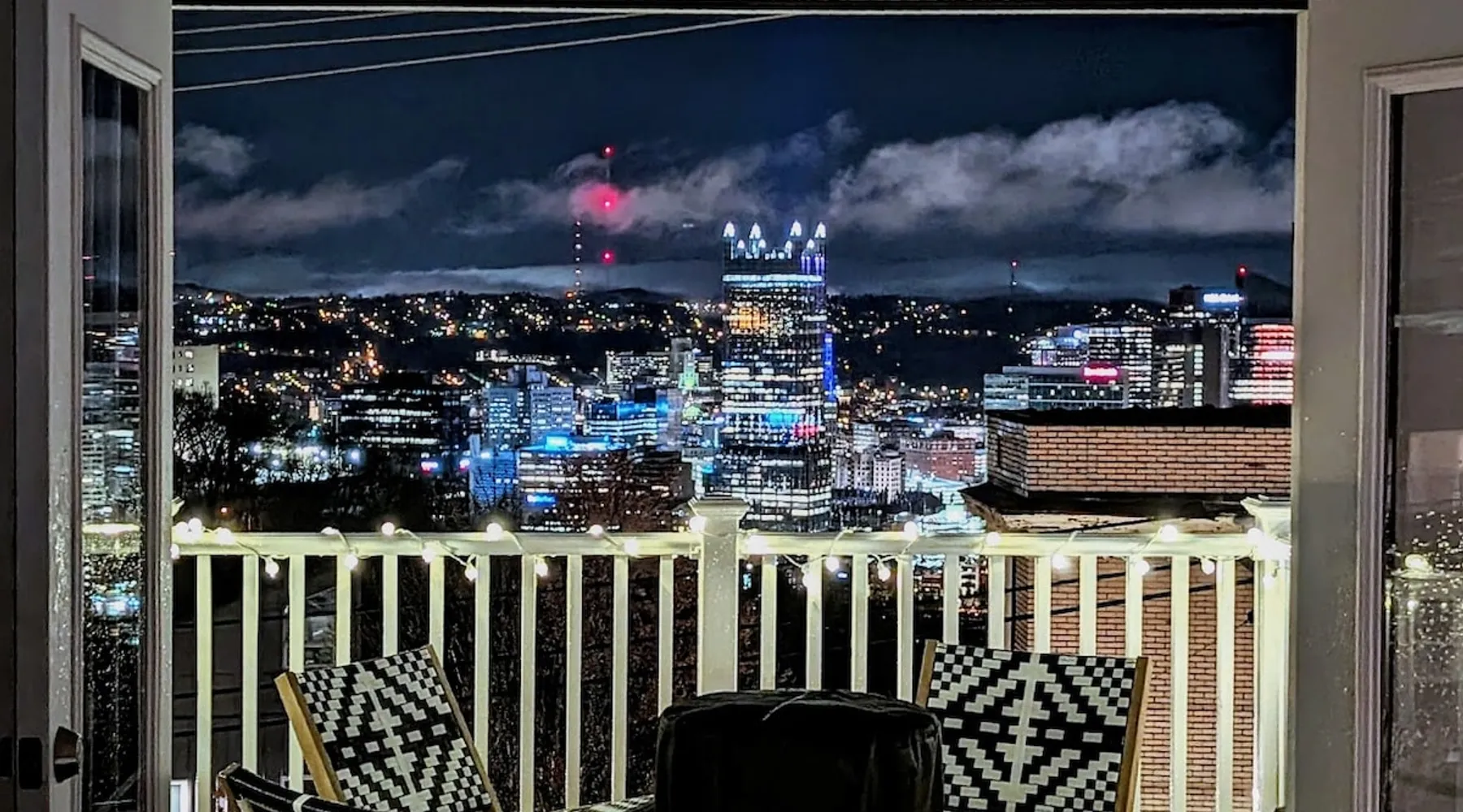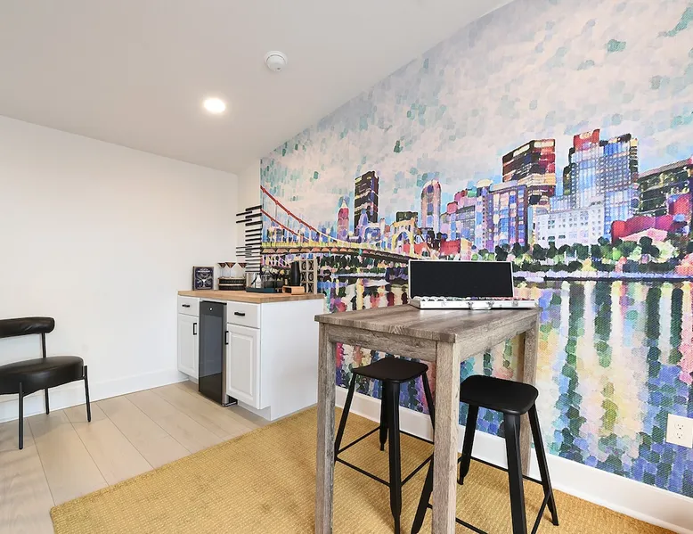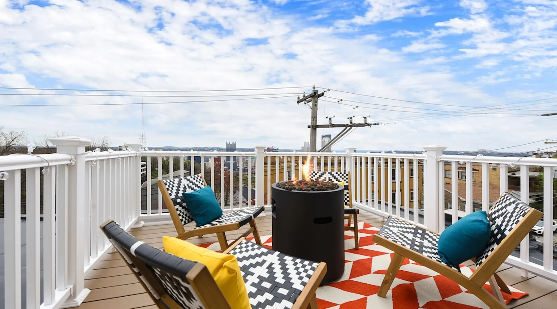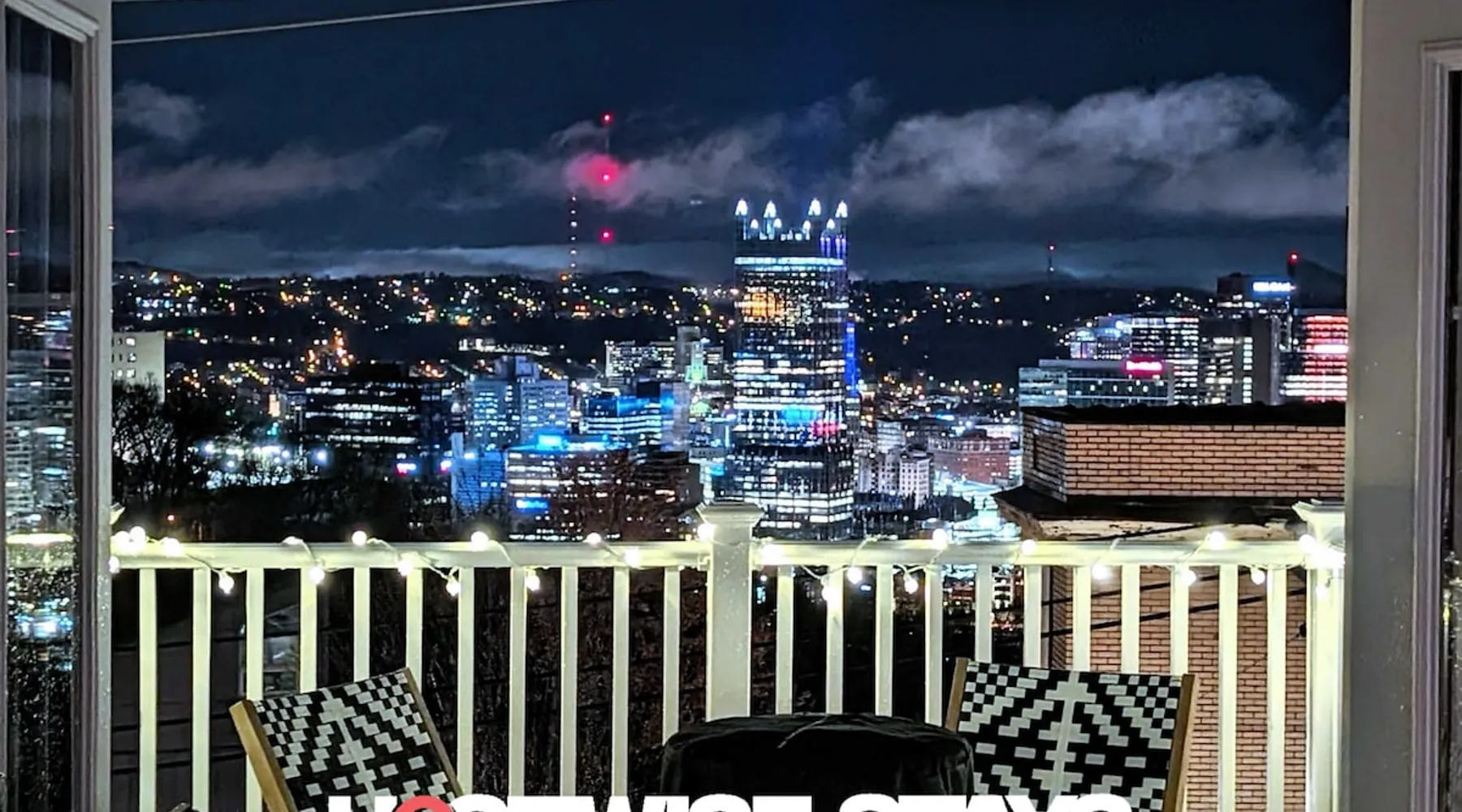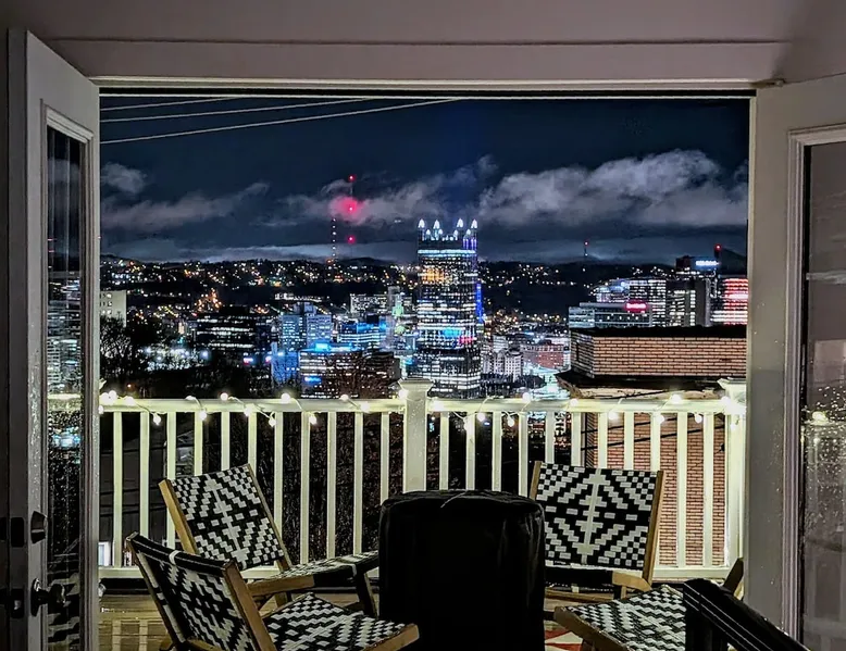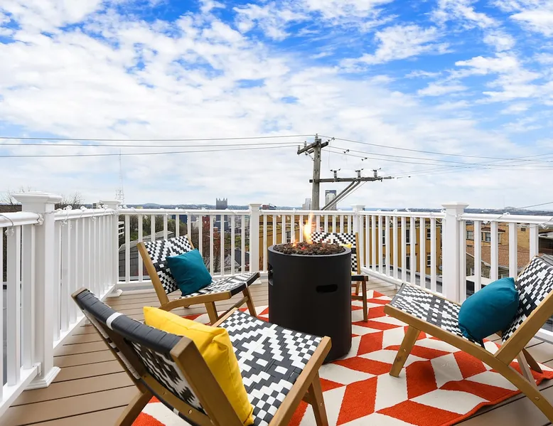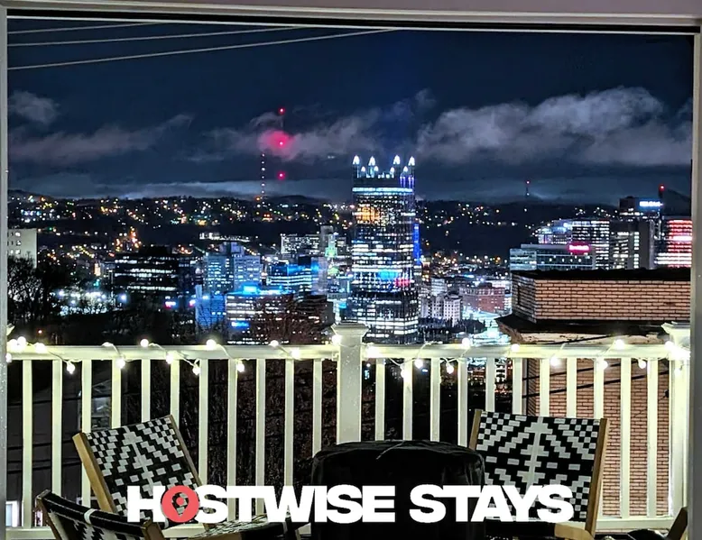 Welcome home atop Mt. Washington! Our home, brand new as of April 2024, features views of the city from the rooftop. Make yourself a cocktail at the top floor bar, then enjoy the views by the fire pit. Prepare a home-cooked meal in our bright, well-stocked kitchen & enjoy it from your Architectural Digest-inspired dining room, or walk to Shiloh St. for a great dinner out instead. With 4 bedrooms on two floors & 2 full bathrooms, our place is perfect for groups or families! The space KEY AMENITIES / DETAILS ✓ Check-out process: Chore-Free Checkout® ✓ Check-in process: Keyless entry with code ✓ Check-in technology: Dack-enabled, swipe to unlock, digital guide, more ✓ 4 Bedrooms - 2 king, 2 queen ✓ 2.5 Bathrooms ✓ Sleeps 8 ✓ Fire pit on rooftop deck w/city views ✓ Rooftop bar with wine fridge & barware ✓ Internet: High speed 300mbps ✓ Parking: Free dedicated street parking ✓ Laundry: HE washer & dryer in unit ✓ Kitchen: Fully stocked with seating for 8 ✓ Work from home: desk (with a view) ✓ Coffee: Pittsburgh's Commonplace Roasters premium whole bean coffee ✓ Tech: Smart speaker, 65" + 55" + two 43" smart TVs ✓ Eco-friendly: Recycling, earth-friendly toiletries, water filters, more ✓ HVAC: Air conditioning & forced air heating ABOUT HOSTWISE STAYS As the top-ranked professional hosts in the Pittsburgh area, we are obsessed with quality service & amenities. Like high end hotels (but better!) we have chore-free check out procedures, we only use professional cleaners, we have local full-time employees, and we're available 24 / 7 / 365. We provide our valued guests with seamless lodging experiences & top-notch amenities - fast Wi-Fi, high end coffee bars, quality linens, clean spaces, earth-friendly products, remote workspaces, stocked kitchens, premium toiletries, and more! CLEANING PROCEDURES We understand how important it is to stay in a professionally cleaned space. We don't outsource our cleaning - our cleaners are professionally trained with a passion for what they do! Our team follows an industry-leading cleaning checklist, and our Operations team performs regular inspections to ensure our high standards are upheld. DETAILED FEATURES ➤ 4 BR / 2.5 BA freestanding house on the 2nd, 3rd, 4th floor ➤ Entrance + Security - Keyless entry with unique/random codes generated via Dack-enabled security software for each guest - highly secure! ➤ Sleeps 8 comfortably ➣ 2 King mattresses + 2 Queen mattresses - semi-plush spring mattresses - super comfortable! ➤ Parking - Two dedicated street parking spots in front of our garage doors + more street parking nearby for additional vehicles, if needed ➤ Bathrooms – 2 full bathrooms with shower + tub combo (one attached to the primary bedroom) and one half bath. ➣ Includes blow dryer, plush cotton towels, and premium toiletries ➤ TVs - 65" in the living room, 55" in the primary, two 43" in other bedrooms - all HD / UHD smart TVs ➣ Most apps are free to use and / or you are able to use your cable provider's login info for "paid" apps (ESPN, HBO, Showtime, etc.) ➤ Internet - High speed 300mbps up / down Verizon FioS ➤ Work From Home - Desk + office chair in primary bedroom, with great views of the city ➤ Outdoor Space - Rooftop patio with fire pit, bar ➤ Security - External camera & non-recording decibel meter / occupancy / alarm sound detector for enhanced guest + property safety ➤ Kitchen - Fully stocked with quality pots & pans, sharp knives, silicone utensils, toaster, microwave, full coffee setup, dishwasher, stove/range, fridge, and more! ➤ Coffee & Tea - Drip coffee maker, French press, electric kettle, premium locally roasted Commonplace whole bean coffee, and Two Leaves & a Bud tea selection is provided, along with Torani syrup, organic sugar & half & half creamers ➤ Living Room - Comfy Article couch + add'l chair seating + smart TV ➤ Dining - Seating for 8 ➤ Laundry - Free washer & dryer + Dropps earth-friendly detergents available for guest use ➤ Air Conditioning / heating: Central air + heat ➤ Pets not permitted ➤ No Smoking indoors PROPERTY LAYOUT Our property is perfectly situated atop Mt. Washington, close to Shiloh St. but far enough to be a quiet area. The entry to the property has a vestibule, followed by a foyer that leads directly to a flight of ~20 stairs to the main part of the home. On the second floor, straight ahead you'll find the half bath. From the front to back of this floor is the living room, dining room, kitchen, and the lower floor bedroom with a queen bed. Off the kitchen hallway is a small outdoor patio. Up to the third floor, at the top of the stairs is the shared full bathroom. From front to back you'll find the primary bedroom with a king bed + desk along, with the attached full bathroom. The middle bedroom features a queen bed. The back bedroom features a king bed as well, and can be accessed through either the middle bedroom, or a separate set of stairs behind the kitchen. The top floor contains the rooftop patio, bar area, wine fridge, and table. Guest access Our entire property is at your disposal, with the exception of a locked housekeeping closet. Other things to note While we happily host children, parents should know that this property has multiple staircases (entrance, front of house, back of house) and so it may not be suitable for young children that are at risk of falling on stairs. Our garage dimensions are the following: Interior 18 ft wide 21 ft deep Doors 6 ft by 6 ft