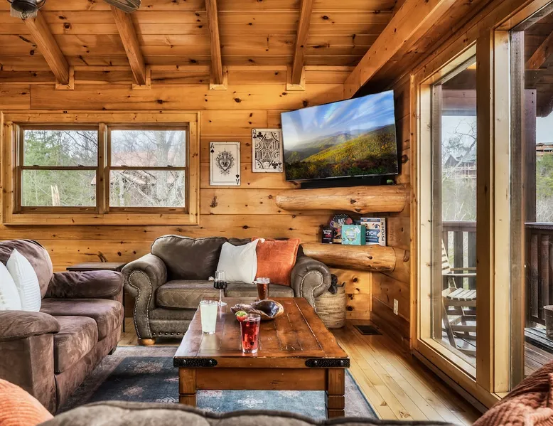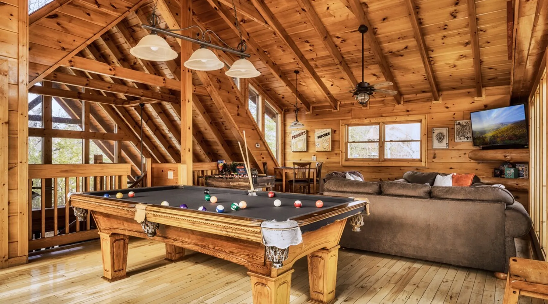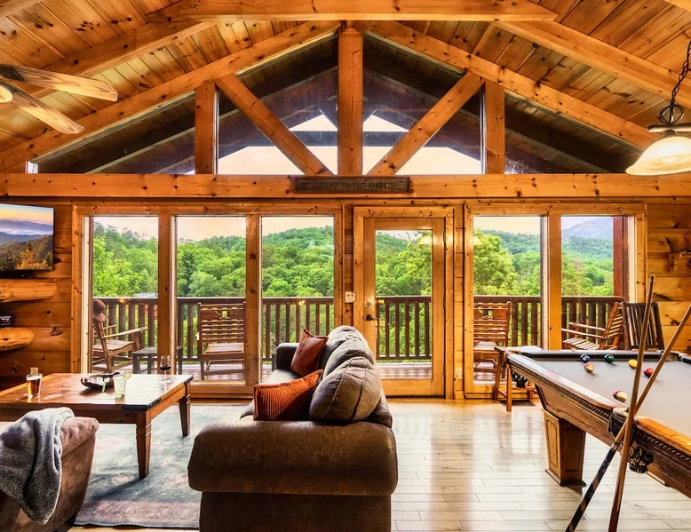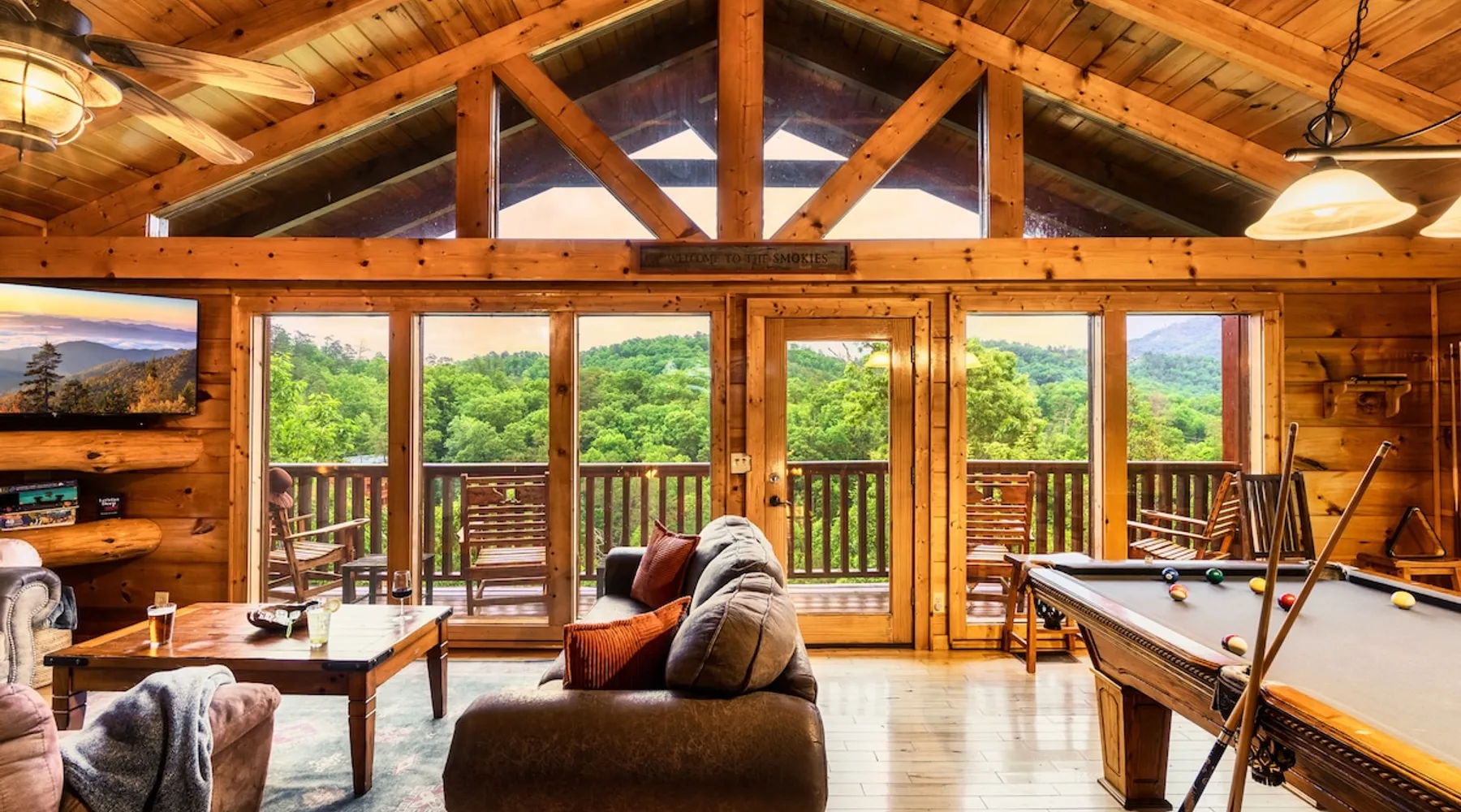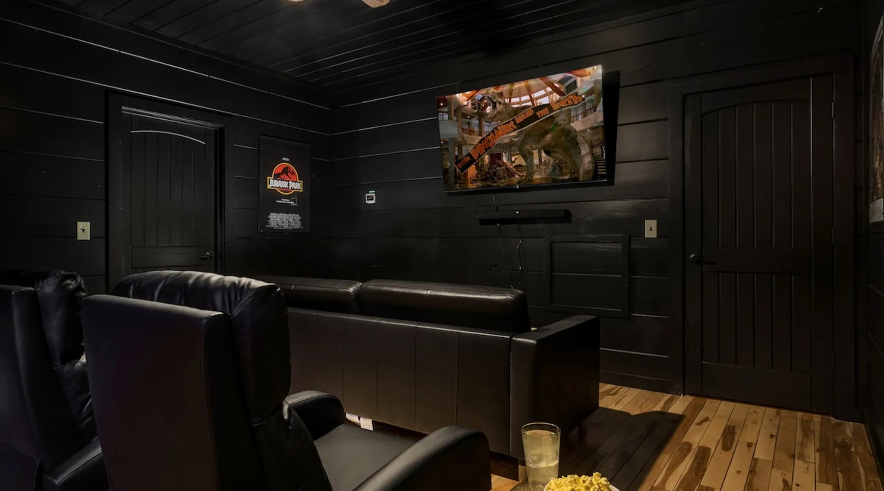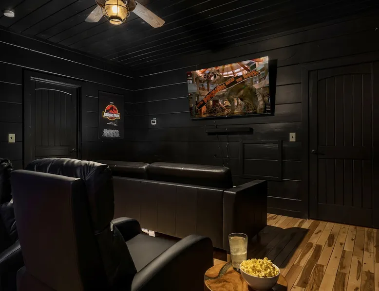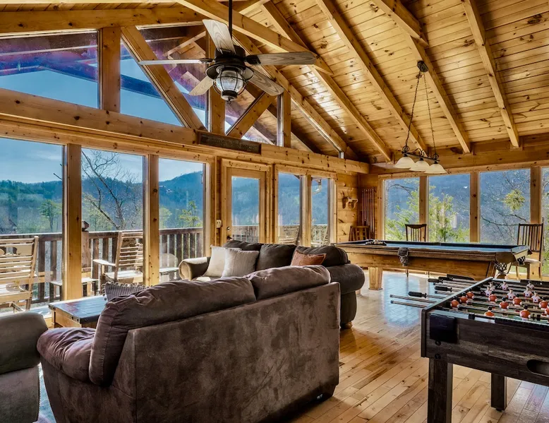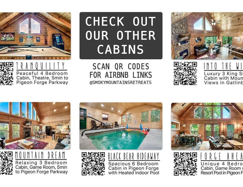 Beautifully decorated cabin with Cathedral ceilings & Majestic Mountain views from almost every room. This cabin is perfect for families & groups of friends that love to entertain: you will find a theater/movie room, a fire pit outdoor space, an entertainment-packed game room with pool table, foosball, arcade games, a kids teepee filled with toys, a hot tub and 3 relaxing decks with dramatic mountain views. Just a 15 minute drive to Pigeon Forge Parkway and 25 minutes to Gatlinburg! The space . Breathtaking Mountain Views . Private Fire pit with views . Theater/Movie room . Hot tub with views . Game Room w/ pool table, foosball & arcade games . 3 King suites / 3.5 bathrooms . 15 min drive to Pigeon Forge Parkway (restaurants, shops, attractions) . 20 min drive to Dollywood, Gatlinburg & the Smoky Mountains National Park entrance . Parking for 5 vehicles . Fully equipped & stocked kitchen . All TV’s with 125+ channels and High Speed WIFI (Starlink) . SuperHost Follow us on FB or Insta: smokymoutainsretreats ► BEDROOMS This three-story cabin accommodates up to 13 guests between the three king-size bedrooms (each with their own en-suite bathroom) and three queen-size sleeper sofas (one in the living room, one in the theater room, one in the game room). You will find a TV in every room. Main level: - 1 Master Bedroom with a King-size bed & en-suite bathroom (sleeps 2) - Great room: Queen-size sleeper Sofa (sleeps 2) Lower level: - 1 Master Bedroom with a King-size bed & en-suite bathroom (sleeps 2) - 1 Master Bedroom with a King-size bed, a full size bed & en-suite bathroom (sleeps 3) - Theater room with a Queen-size sleeper Sofa & shared bathroom (sleeps 2) Upper level: - Game room: Queen-size sleeper Sofa & half bathroom (sleeps 2) See pictures of the floor plan in the listing (last pictures). ► KITCHEN The kitchen is equipped with all the cookware, cutlery, and appliances you need to prepare delicious meals during your stay. Refrigerator, stove, microwave, dishwasher, toaster, blender, tea kettle, Crockpot, Keurig Duo with carafe & single serve pod coffee maker. The dining table comfortably seats eight, and there are four additional chairs so everyone in your group can enjoy meals together. ► OUTDOOR GRILL There is a private Gas Grill. The Grill is connected to a propane tank so you don't have to worry about running out of gas. ► OUTDOOR SPACE After a day of hiking and sightseeing, you have a lot of options to chill: *relax by the fire pit *soak in the private hot tub *kick back in the rocking chairs and enjoy the fresh mountain breeze and impressive Mountain views. ► FIRE PIT Our private fire pit is located right by the cabin and offers nice Mountain views. There are 6 outdoor chairs. It is a gas fire pit and it is connected to a propane tank, so you just have to turn it on and it's ready to enjoy! ► HOME THEATER CINEMA Enjoy some fun movie nights with your private Home Theater cinema! ► GAME ROOM You will love playing in the game room outfitted with a pool table, foosball table, video arcade games. There is also an assortment of board games and a TV to watch your favorite shows/games. ► PETS We are a pet friendly cabin and you can bring up to 3 dogs as long as they are house broken/potty trained. We welcome all breeds of dogs and have no restrictions on weight. The pet fee is $175 for the whole stay for up to 3 dogs (the fee is not per dog). ► INTERNET/CABLE High Speed Wireless Internet Smart TVs in the living room/game room as well as in each bedrooms. ► LAUNDRY Full size washer and dryer. ► AMENITIES Our cleaning service provides start-up supplies including: paper towels, dish soap, dish washer soap, kitchen trash can liners, toilet paper, hand soap and bathroom trash liners. Depending on the length of your stay, you may need to purchase additional items when the initial supply runs out. ► PRIVATE PARKING Flat parking for up to 5 vehicles in the driveway. ► ENTRY The front door is equipped with an electronic keypad, we will send a personalized door code. ► SMOKING No Smoking indoors. You can smoke on the decks though. We will always strive to obtain a 5-star ★★★★★ review from all our guest and can’t wait to host your next holidays and make them UNFORGETTABLE! *** Please favorite the property by clicking "save" or "heart shape" in the upper right-hand corner, this will help you find it again and share with others *** Guest access Guests will enjoy the entire cabin/private hot tub/fire pit. Other things to note For security reasons, we have placed 1 outside camera. It is located on the porch facing the entrance door. Wyze camera in place and actively recording. Wyze camera is activated by motion and will record anyone that walks in front of them. These recordings are saved and can be reviewed and shared with the booking platform. If we believe that house rules are being violated, we have the ability to access these cameras in real time. Please remember that you are staying in our home away from home. Please treat our cabin with respect. "Out of our control" problems could arise, please note we will do everything in our power to resolve any issue ASAP, as your comfort means everything to us.