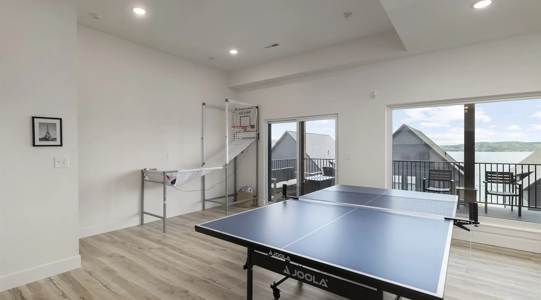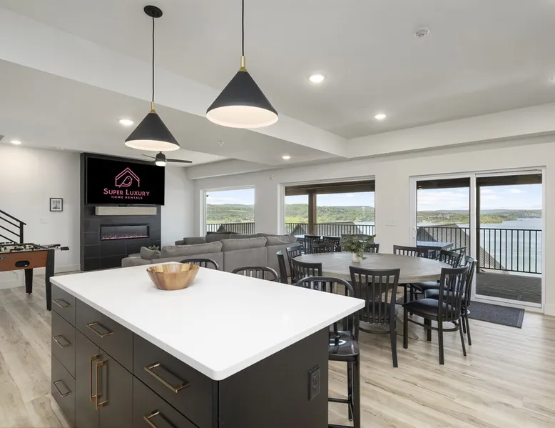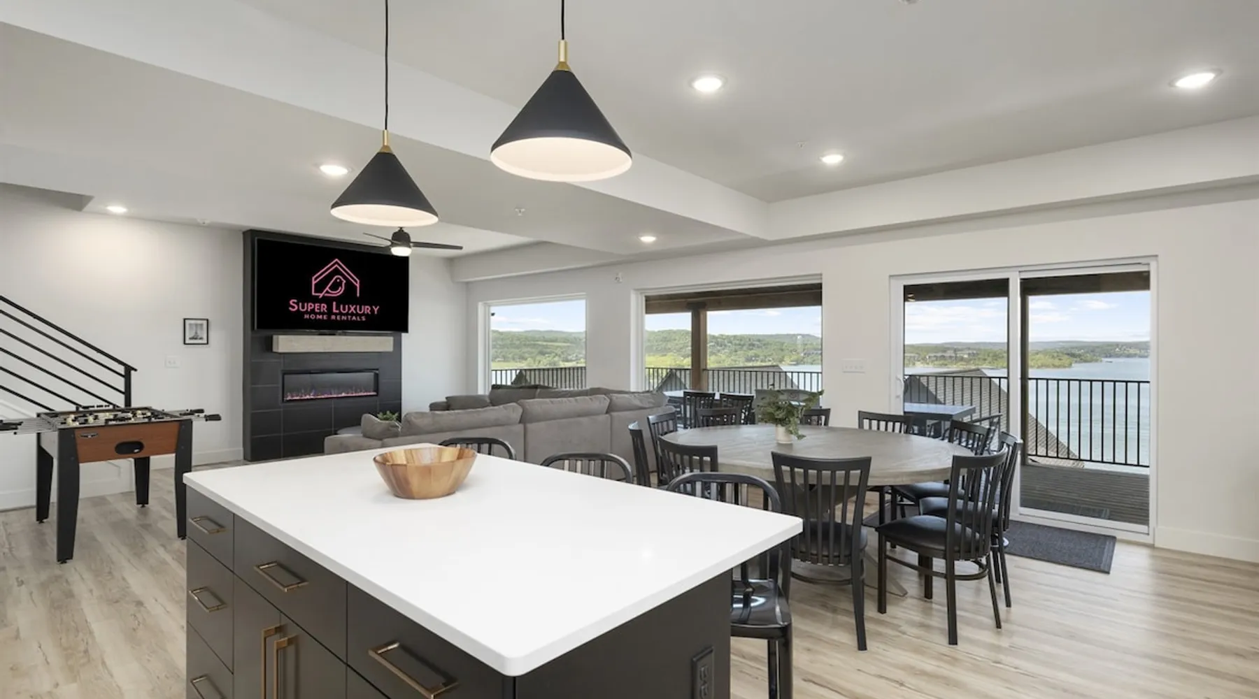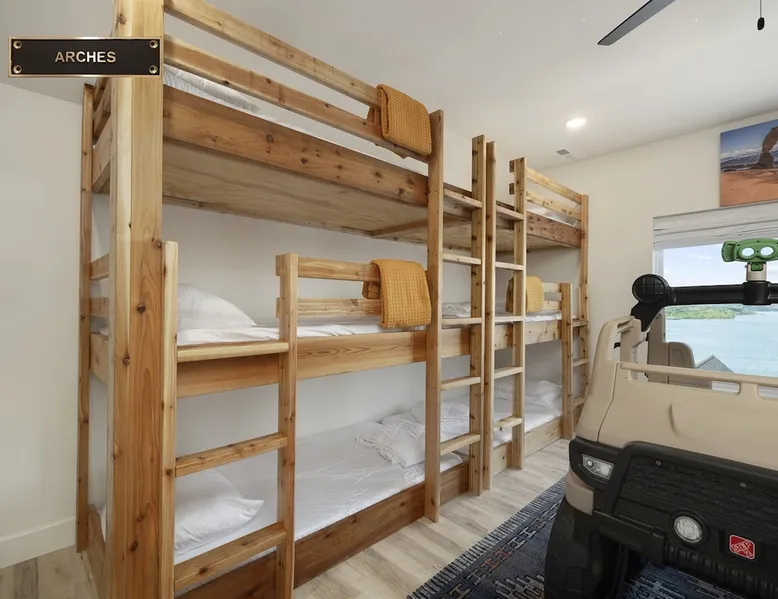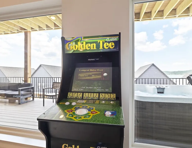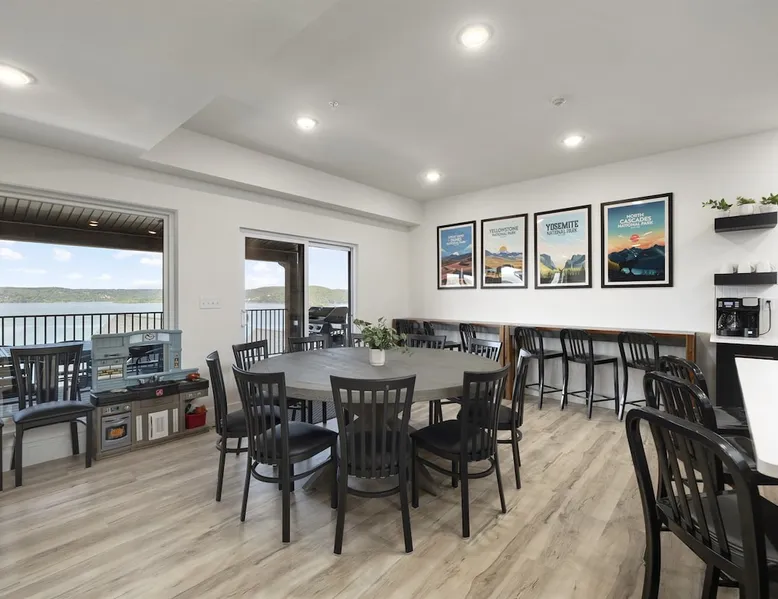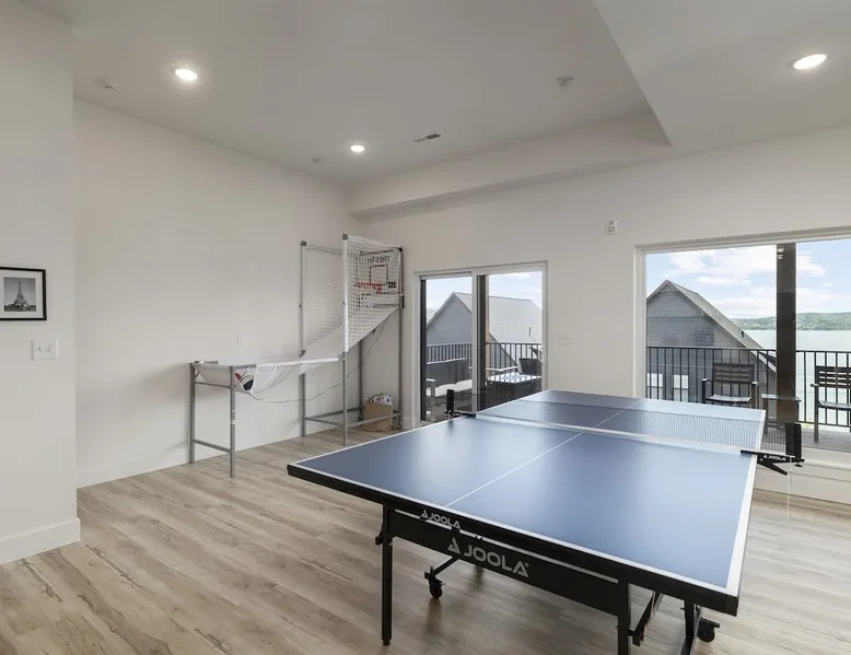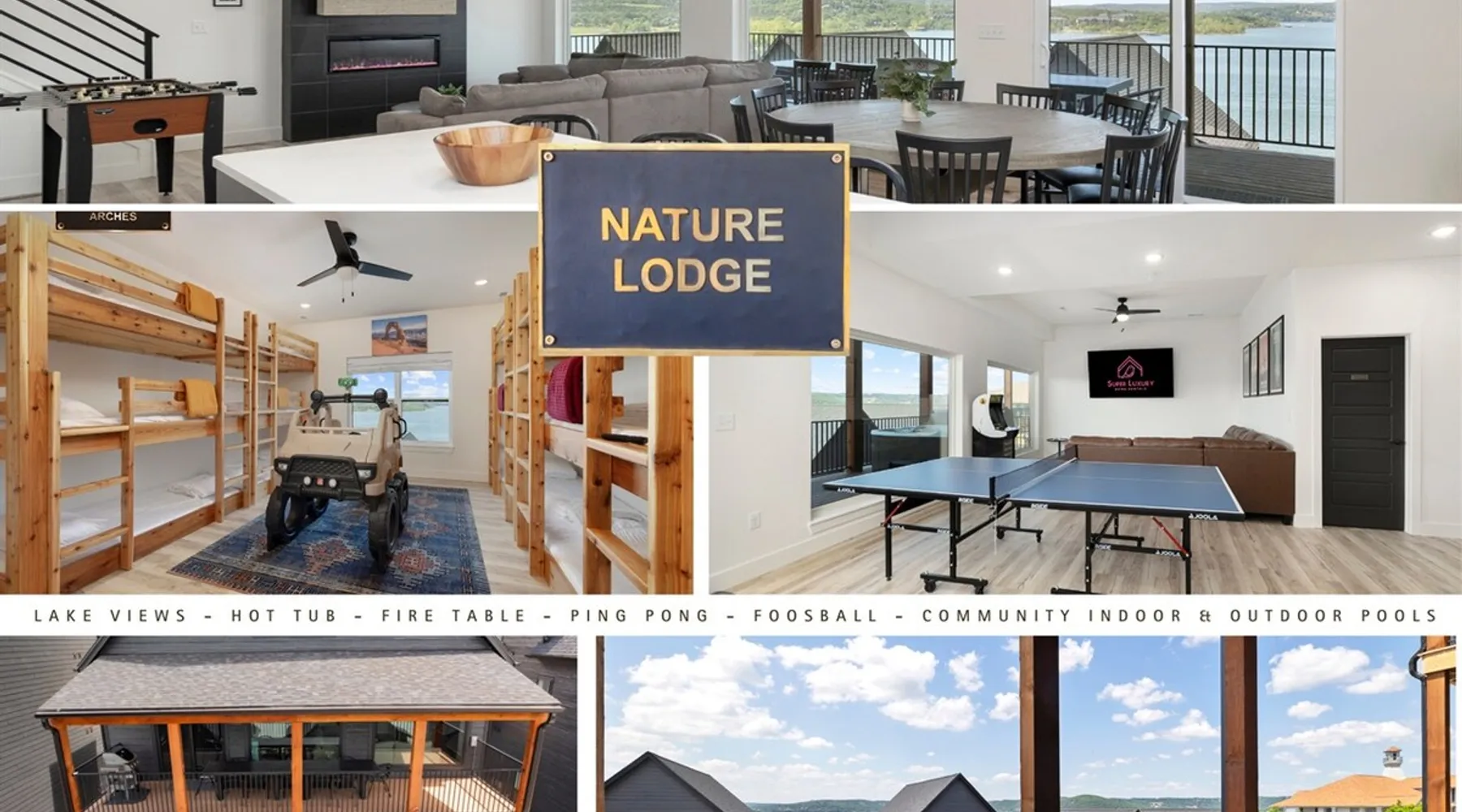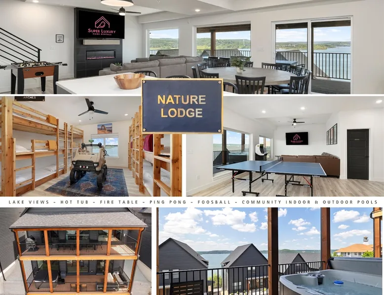 Nature Lodge is ready to accommodate, entertain, & delight gatherings for any occasion sleeping 28 people on beds. The home has amazing lake views that are fully celebrated by the hot tub, outdoor dining & fire table. Indoors the home is ready to entertain w/ 85' TVs, Xbox, classic arcade game, Pop-A-Shot, foosball table, & ping pong table. The 7 bedrooms are perfectly organized: 5 with king size Thuma beds & 2 bedrooms with bunks sleeping 6 and 12. The space Nature Lodge is a 7 bedrooms and 7 bathrooms that sleeps up to 28 guests. Main Level - Front porch is up 2 stairs and has a table with two chairs next to the lighted entrance - Primary bedroom #1 has an en-suite bathroom, a Thuma king bed, a 50" TV, blackout shades, ceiling fan, and a desk & chair - Primary bedroom #2 has en-suite bathroom with access from the living room, a Thuma king bed, a 50" TV, blackout shades, & ceiling fan - Fully stocked kitchen is equipped with all the kitchen utensils, supplies, and appliances to make feeding 28 people a breeze - Dining area has a 6' circle Restoration Hardware table seating 12 and counter height bar stool seating 9 - Spacious living room with large sectional couch, fireplace, 85" TV - Out the sliding glass door to the patio there is 14' of dining tables seating 16 and a Weber bbq grill to enjoy the views. Basement Level - Family & Game Room has foosball table, ping pong table, pop-a-shot, Xbox, and 85" TV - Off the family room there is a wet bar with everything needed to enjoy a libation or two - The outdoor patio has private Aquaterra hot tub accommodating 6 and outdoor sofas surrounding a fire table - Primary bedroom #3 with en-suite bathroom, a Thuma king bed, blackout shades, ceiling fan, and a 50" TV - Primary bedroom #4 with en-suite bathroom, a Thuma king bed, blackout shades, ceiling fan, and a 50" TV - Bedroom #5 with the small bunk room with two triple bunk twin beds sleeping 6, blackout shades, ceiling fan, and a 50" TV Upper Level - Primary bedroom #6 has en-suite bathroom, has a Thuma king bed, deck & chair, blackout shades, ceiling fan, and 50" TV - Bedroom #7 is our large bunk room with 4 triple bunk twin beds sleeping 12, blackout shades, ceiling fan, a 50" TV with en-suite bathroom with tub & shower - In the hall there is a laundry closet with a stackable front load Samsung washer and dryer Additional Home Amenities - Kid friendly including Pack n Play, High Chair, & Kids Dishware - Driveway Parking for up to 3 vehicles - Thoughtful sleep environments: ceiling fans in all bedrooms, white noise machines, and portable fans provided - High speed internet (1Gbps) You must be at least 21 years old to book. Legal agreements and security deposit are managed using an approved API-connected software provider called OwnerRez. The security deposit is a temporary hold on the credit card in case of any damages incurred during the stay. This property allows pets up to 2 dogs with a fee. The maximum guest count must be adhered which is 28 for this property. Guest access The entire home and parking area are included in this rental as well as access to the shared community amenities: indoor pool & outdoor pool. Please make yourself at home and enjoy our property.