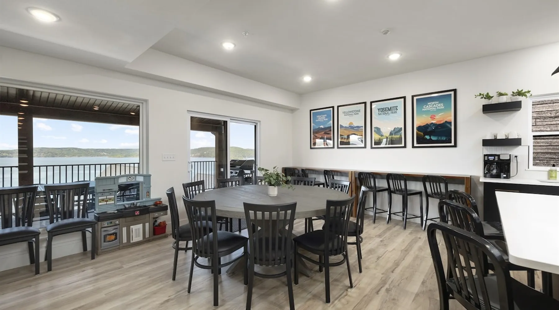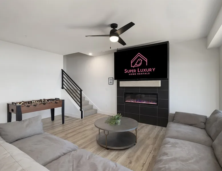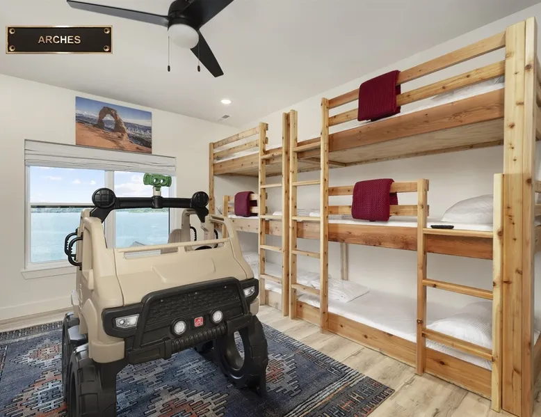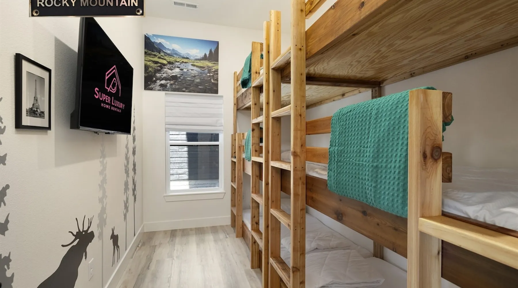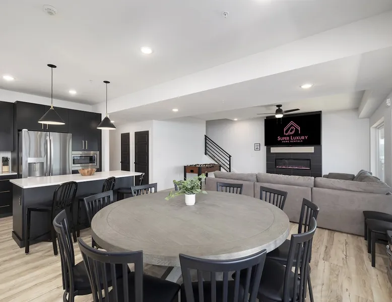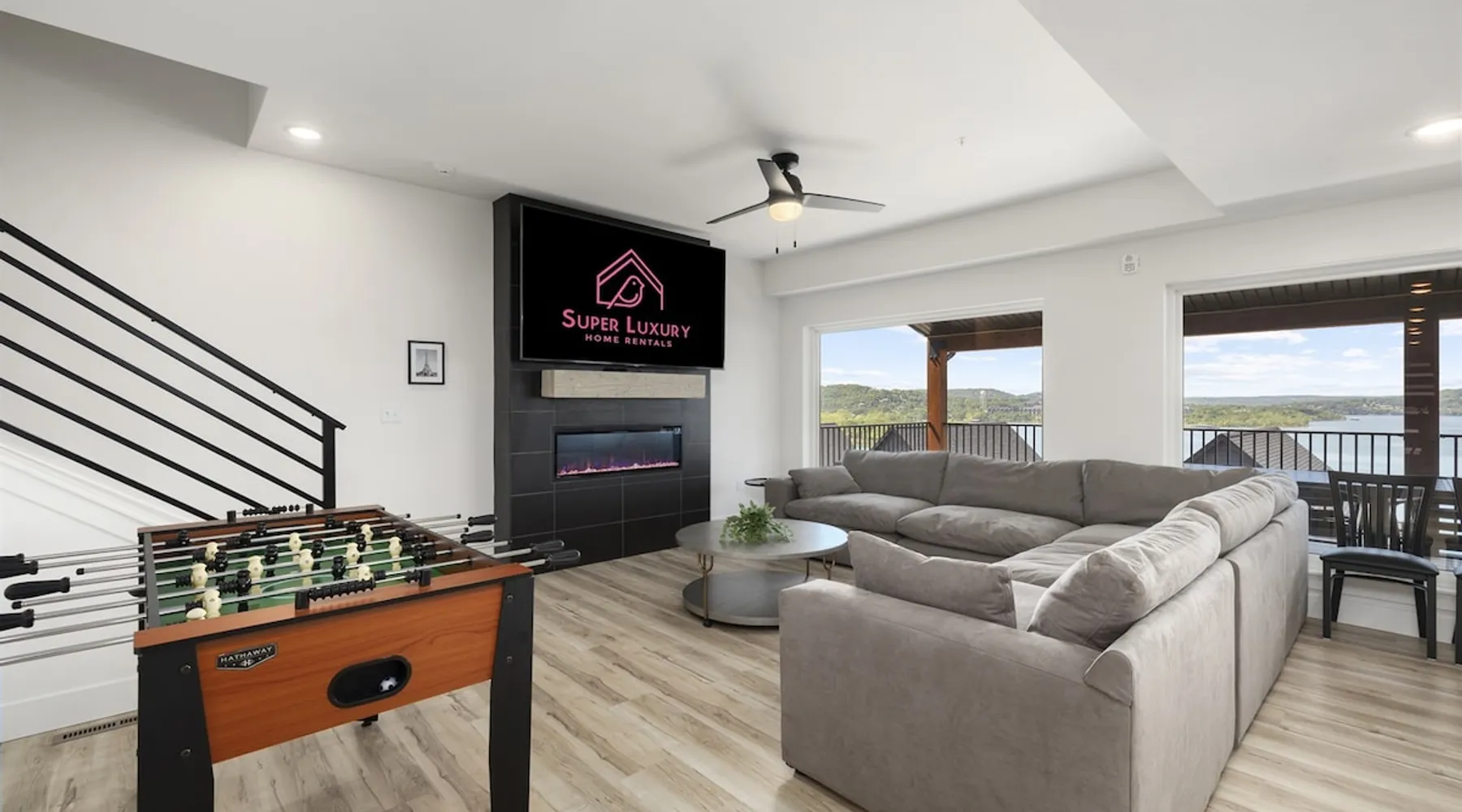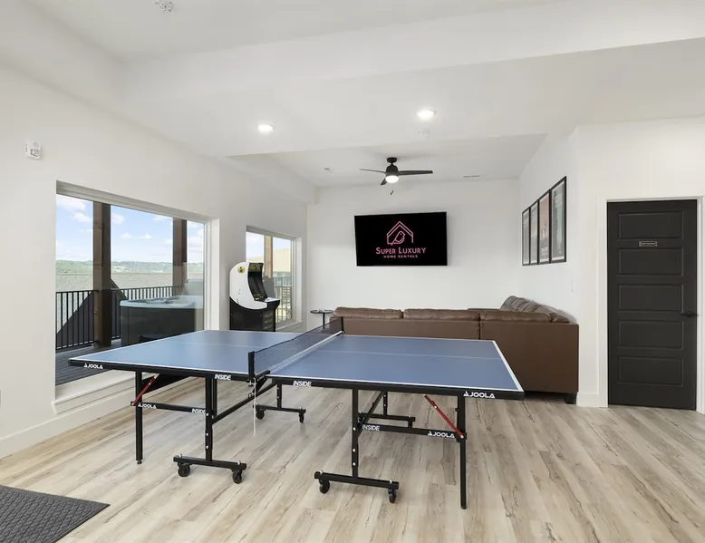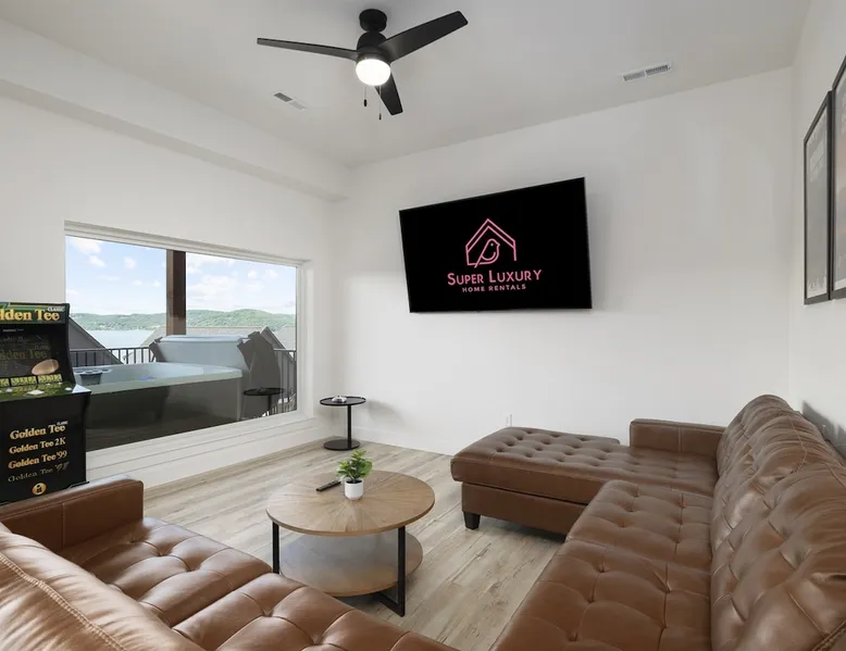 Nature Lodge is ready to accommodate, entertain, & delight gatherings for any occasion sleeping 28 people on beds. The home has amazing lake views that are fully celebrated by the hot tub, outdoor dining & fire table. Indoors the home is ready to entertain w/ 85' TVs, Xbox, classic arcade game, Pop-A-Shot, foosball table, & ping pong table. The 7 bedrooms are perfectly organized: 5 with king size Thuma beds & 2 bedrooms with bunks sleeping 6 and 12. The space Nature Lodge is a 7 bedrooms and 7 bathrooms that sleeps up to 28 guests. Main Level - Front porch is up 2 stairs and has a table with two chairs next to the lighted entrance - Primary bedroom #1 has an en-suite bathroom, a Thuma king bed, a 50" TV, blackout shades, ceiling fan, and a desk & chair - Primary bedroom #2 has en-suite bathroom with access from the living room, a Thuma king bed, a 50" TV, blackout shades, & ceiling fan - Fully stocked kitchen is equipped with all the kitchen utensils, supplies, and appliances to make feeding 28 people a breeze - Dining area has a 6' circle Restoration Hardware table seating 12 and counter height bar stool seating 9 - Spacious living room with large sectional couch, fireplace, 85" TV - Out the sliding glass door to the patio there is 14' of dining tables seating 16 and a Weber bbq grill to enjoy the views. Basement Level - Family & Game Room has foosball table, ping pong table, pop-a-shot, Xbox, and 85" TV - Off the family room there is a wet bar with everything needed to enjoy a libation or two - The outdoor patio has private Aquaterra hot tub accommodating 6 and outdoor sofas surrounding a fire table - Primary bedroom #3 with en-suite bathroom, a Thuma king bed, blackout shades, ceiling fan, and a 50" TV - Primary bedroom #4 with en-suite bathroom, a Thuma king bed, blackout shades, ceiling fan, and a 50" TV - Bedroom #5 with the small bunk room with two triple bunk twin beds sleeping 6, blackout shades, ceiling fan, and a 50" TV Upper Level - Primary bedroom #6 has en-suite bathroom, has a Thuma king bed, deck & chair, blackout shades, ceiling fan, and 50" TV - Bedroom #7 is our large bunk room with 4 triple bunk twin beds sleeping 12, blackout shades, ceiling fan, a 50" TV with en-suite bathroom with tub & shower - In the hall there is a laundry closet with a stackable front load Samsung washer and dryer Additional Home Amenities - Kid friendly including Pack n Play, High Chair, & Kids Dishware - Driveway Parking for up to 3 vehicles - Thoughtful sleep environments: ceiling fans in all bedrooms, white noise machines, and portable fans provided - High speed internet (1Gbps) You must be at least 21 years old to book. Legal agreements and security deposit are managed using an approved API-connected software provider called OwnerRez. The security deposit is a temporary hold on the credit card in case of any damages incurred during the stay. This property allows pets up to 2 dogs with a fee. The maximum guest count must be adhered which is 28 for this property. Guest access The entire home and parking area are included in this rental as well as access to the shared community amenities: indoor pool & outdoor pool. Please make yourself at home and enjoy our property.