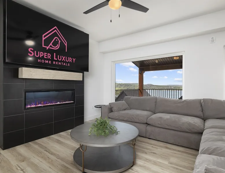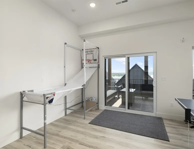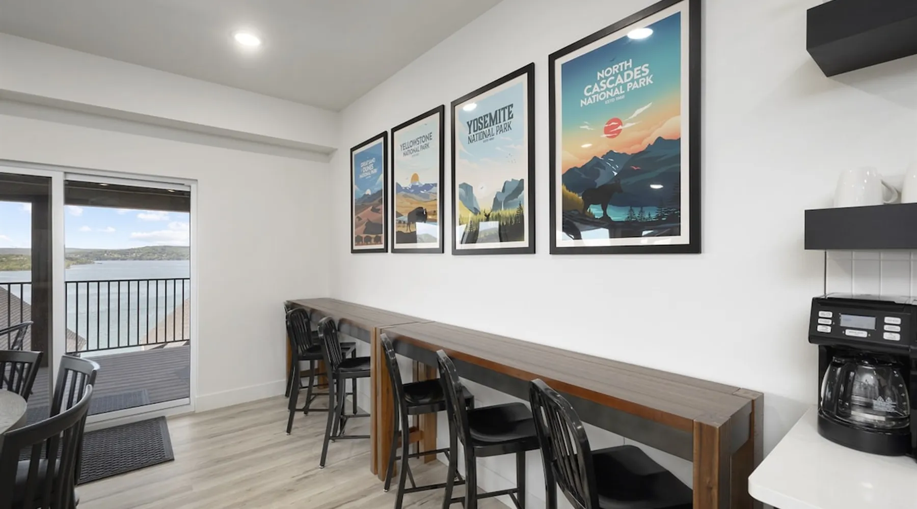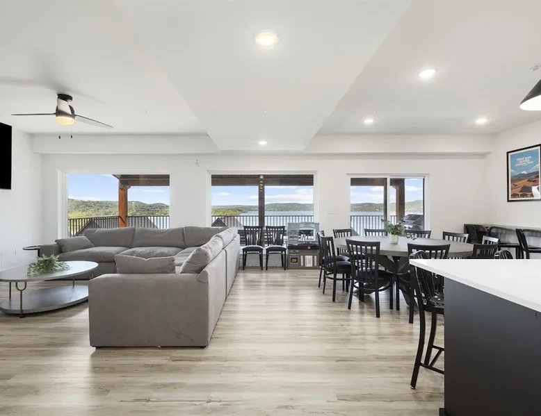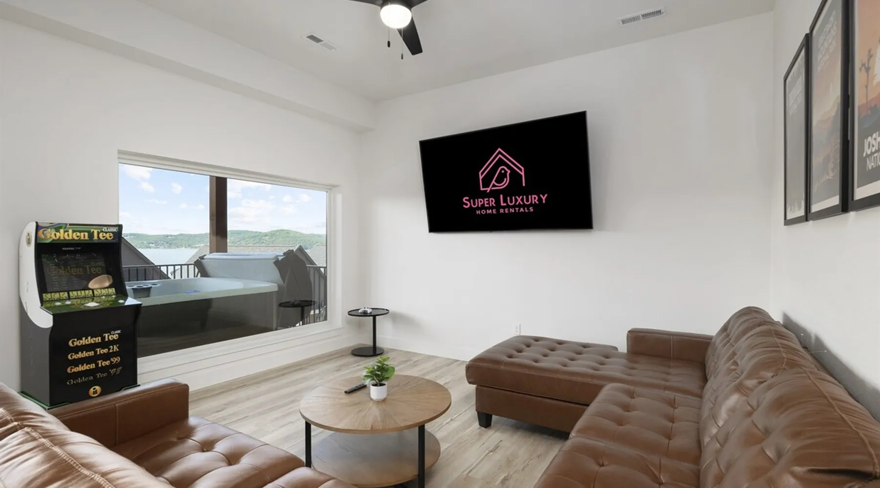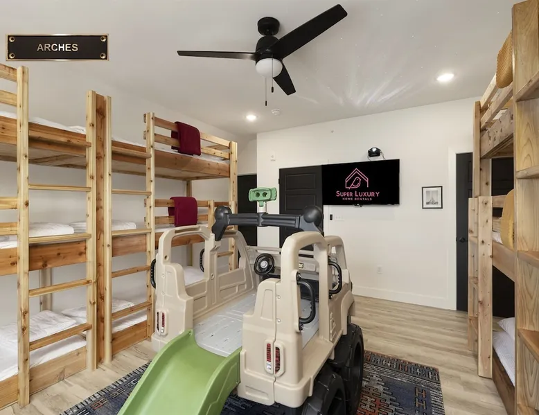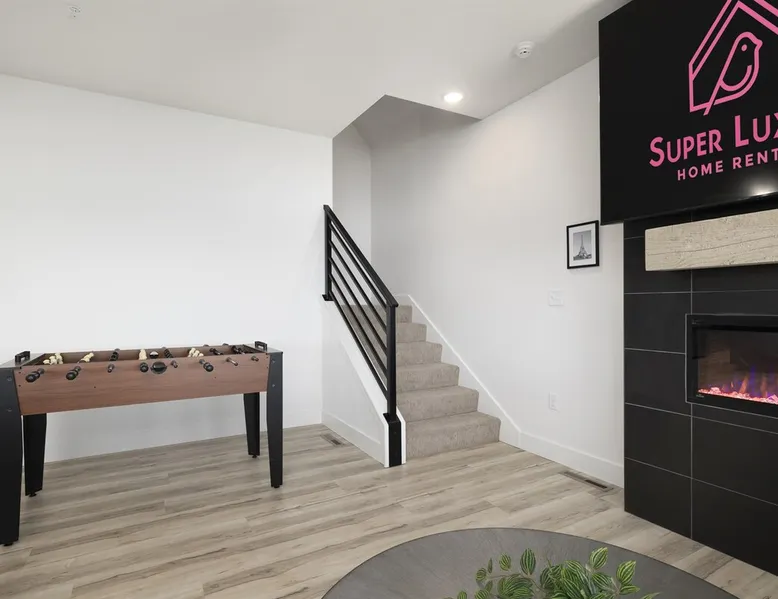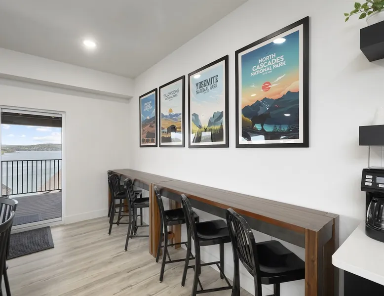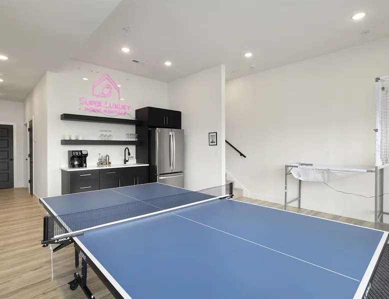 Nature Lodge is ready to accommodate, entertain, & delight gatherings for any occasion sleeping 28 people on beds. The home has amazing lake views that are fully celebrated by the hot tub, outdoor dining & fire table. Indoors the home is ready to entertain w/ 85' TVs, Xbox, classic arcade game, Pop-A-Shot, foosball table, & ping pong table. The 7 bedrooms are perfectly organized: 5 with king size Thuma beds & 2 bedrooms with bunks sleeping 6 and 12. The space Nature Lodge is a 7 bedrooms and 7 bathrooms that sleeps up to 28 guests. Main Level - Front porch is up 2 stairs and has a table with two chairs next to the lighted entrance - Primary bedroom #1 has an en-suite bathroom, a Thuma king bed, a 50" TV, blackout shades, ceiling fan, and a desk & chair - Primary bedroom #2 has en-suite bathroom with access from the living room, a Thuma king bed, a 50" TV, blackout shades, & ceiling fan - Fully stocked kitchen is equipped with all the kitchen utensils, supplies, and appliances to make feeding 28 people a breeze - Dining area has a 6' circle Restoration Hardware table seating 12 and counter height bar stool seating 9 - Spacious living room with large sectional couch, fireplace, 85" TV - Out the sliding glass door to the patio there is 14' of dining tables seating 16 and a Weber bbq grill to enjoy the views. Basement Level - Family & Game Room has foosball table, ping pong table, pop-a-shot, Xbox, and 85" TV - Off the family room there is a wet bar with everything needed to enjoy a libation or two - The outdoor patio has private Aquaterra hot tub accommodating 6 and outdoor sofas surrounding a fire table - Primary bedroom #3 with en-suite bathroom, a Thuma king bed, blackout shades, ceiling fan, and a 50" TV - Primary bedroom #4 with en-suite bathroom, a Thuma king bed, blackout shades, ceiling fan, and a 50" TV - Bedroom #5 with the small bunk room with two triple bunk twin beds sleeping 6, blackout shades, ceiling fan, and a 50" TV Upper Level - Primary bedroom #6 has en-suite bathroom, has a Thuma king bed, deck & chair, blackout shades, ceiling fan, and 50" TV - Bedroom #7 is our large bunk room with 4 triple bunk twin beds sleeping 12, blackout shades, ceiling fan, a 50" TV with en-suite bathroom with tub & shower - In the hall there is a laundry closet with a stackable front load Samsung washer and dryer Additional Home Amenities - Kid friendly including Pack n Play, High Chair, & Kids Dishware - Driveway Parking for up to 3 vehicles - Thoughtful sleep environments: ceiling fans in all bedrooms, white noise machines, and portable fans provided - High speed internet (1Gbps) You must be at least 21 years old to book. Legal agreements and security deposit are managed using an approved API-connected software provider called OwnerRez. The security deposit is a temporary hold on the credit card in case of any damages incurred during the stay. This property allows pets up to 2 dogs with a fee. The maximum guest count must be adhered which is 28 for this property. Guest access The entire home and parking area are included in this rental as well as access to the shared community amenities: indoor pool & outdoor pool. Please make yourself at home and enjoy our property.