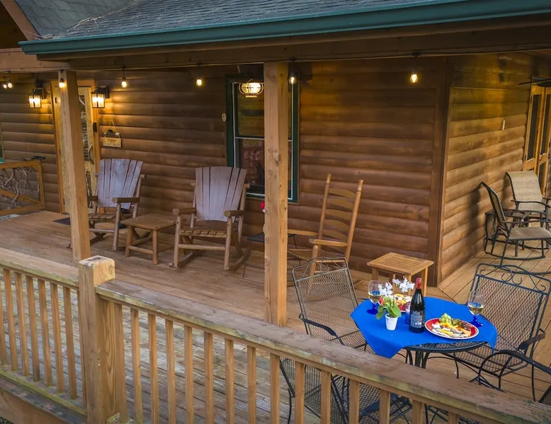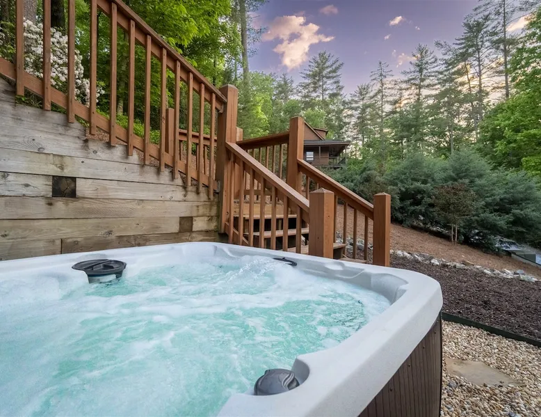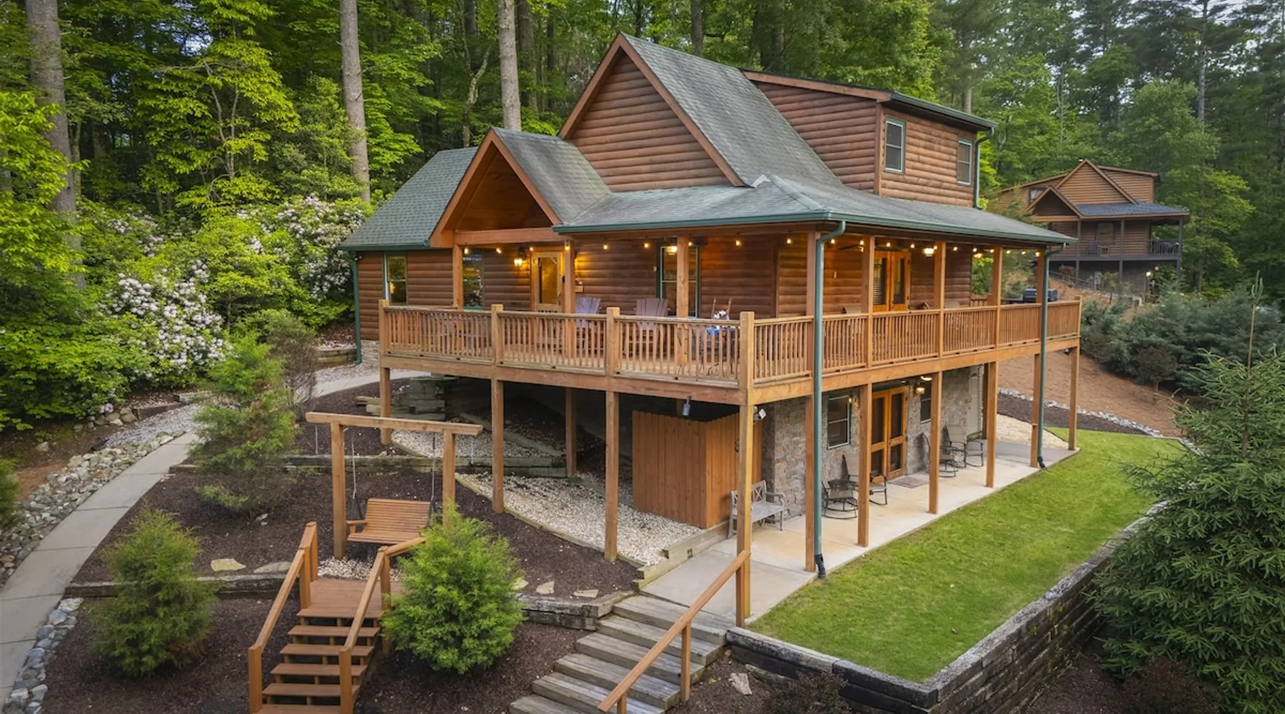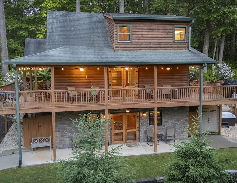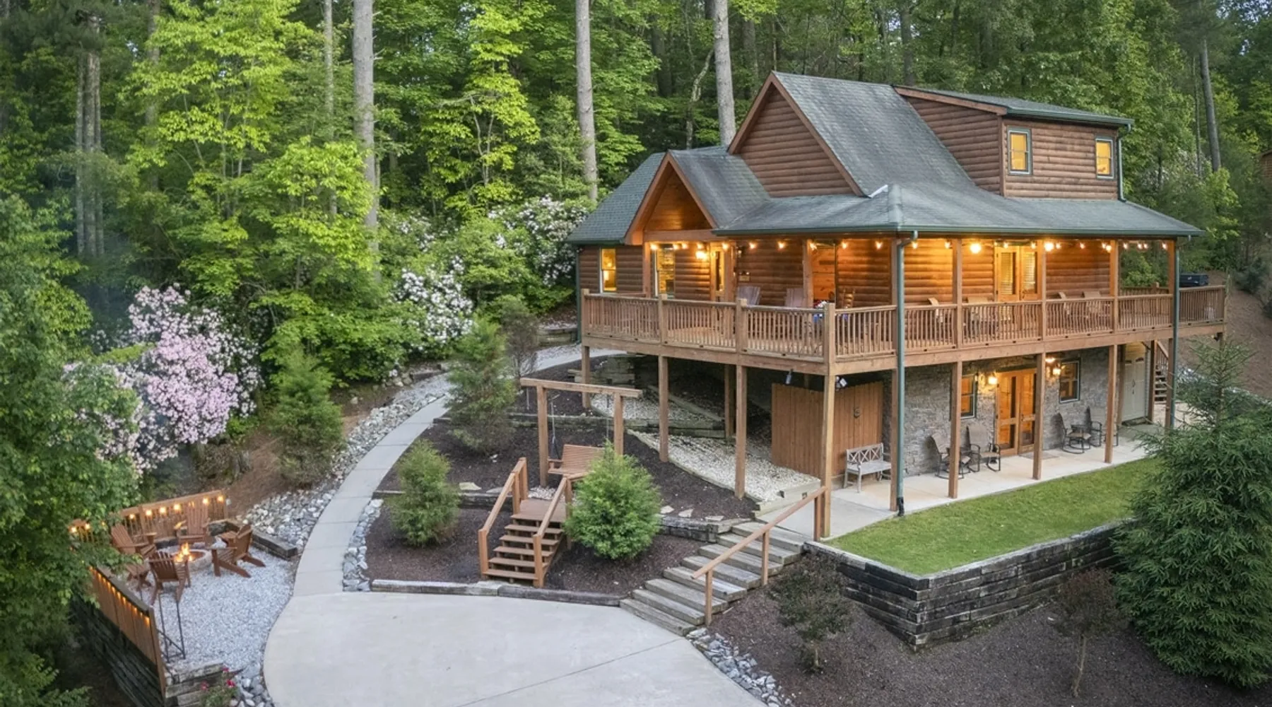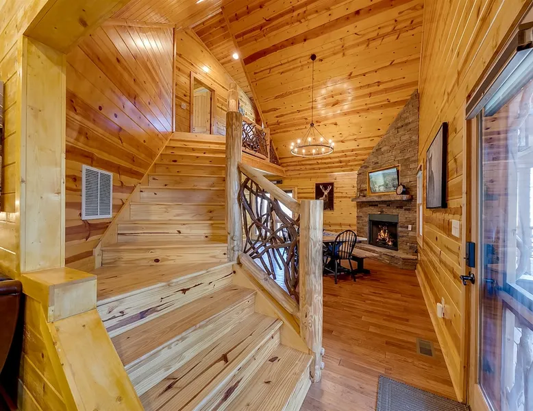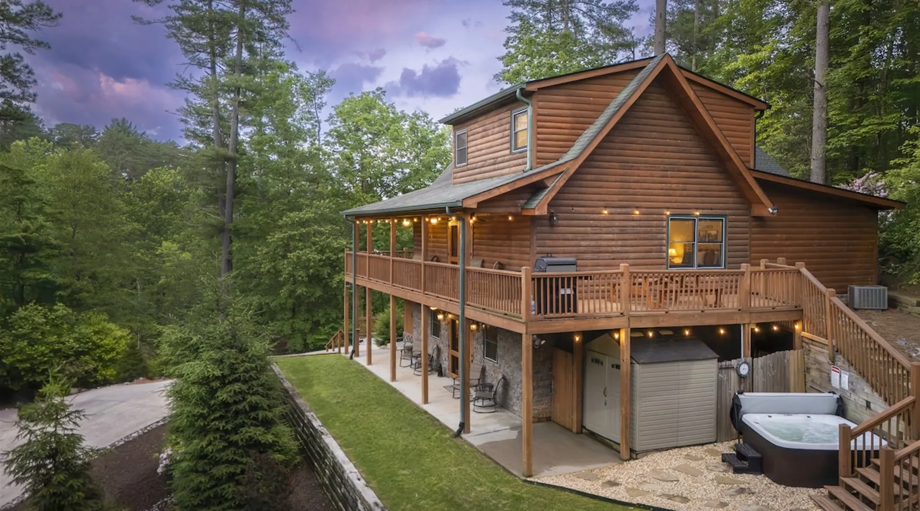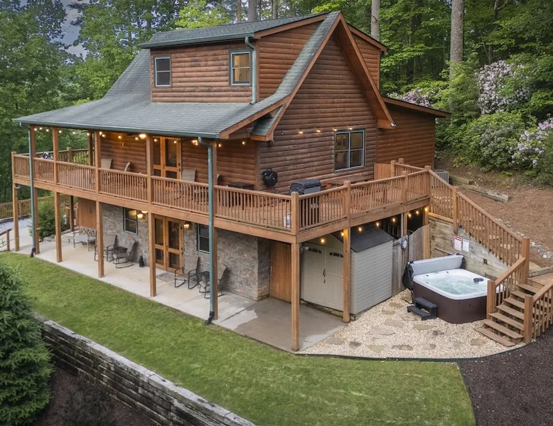 4 Bed/3 Bath - Beautiful & Secluded with Hot Tub, Game Room, Fire Pit & Easy Access to Downtown Helen The space “Hilltop Haven” is a secluded rustic cabin with a hot tub located North of Helen near Richard Russell Scenic Hwy and Smithgall Woods Park & less than 2 miles from the fun & exciting center of Helen, GA. This 3 level 4 bedroom, 3 bathroom cabin has a great bedroom layout and is thoughtfully decorated with many custom furniture pieces throughout. The fully-stocked kitchen with granite countertops and stainless steel appliances has everything needed to enjoy a home-cooked meal. In the living area it boasts a gas log fireplace, gorgeous vaulted ceilings and a 55 inch Smart TV. On the terrace level you will find an area that adults and children alike will enjoy! There is aone bedroom Queen with bunk beds and a game room with Foosball Table and Dart Board. This area leads out to the Cozy Outdoor Fire Pit with Four Adirondack Chairs, 2 benches and an Outdoor Swing. Main Level of the home has two bedrooms with Queen Beds, , a shared hall bath, kitchen, living area, and access to the Gas Grill, Beverage Cooler and open air deck with multiple seatings areas enjoy al fresco dining. The ornate staircase from the main level leads up to the Primary Bedroom with a King Bed, Large Bathroom with Shower, Soaking Tub & Vanity. Boat and tubing rentals are a short drive away to explore the Chattahoochee River or enjoy a day to explore the local vineyards and wineries. With so much to see and do in the area you will want to come back year after year! Things to Know: • 25+ age requirement for lead guest. No exceptions. • This property is not pet-friendly. No exceptions. • Digital rental agreement will be required to sign and complete after property is booked. • Firewood not supplied. Firewood not allowed in the gas fireplace. *Please be aware there are outdoor cameras and a Ring Doorbell camera at the front door.