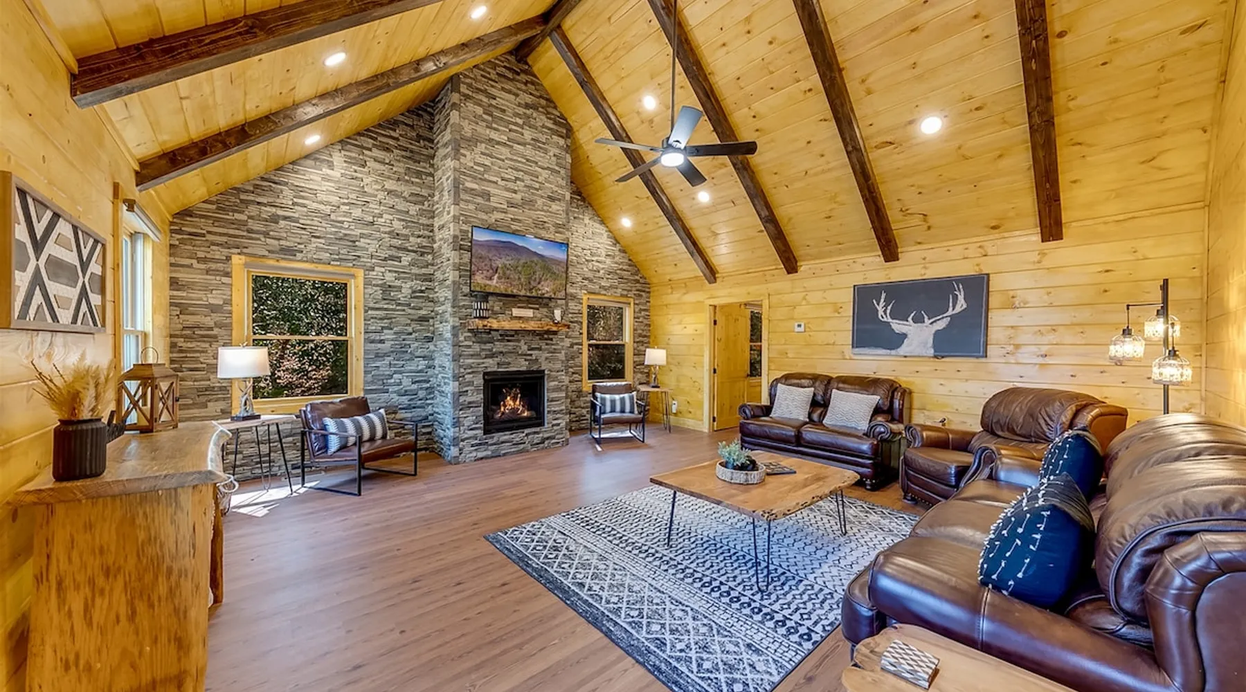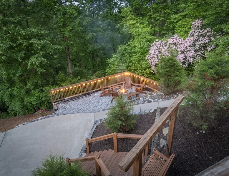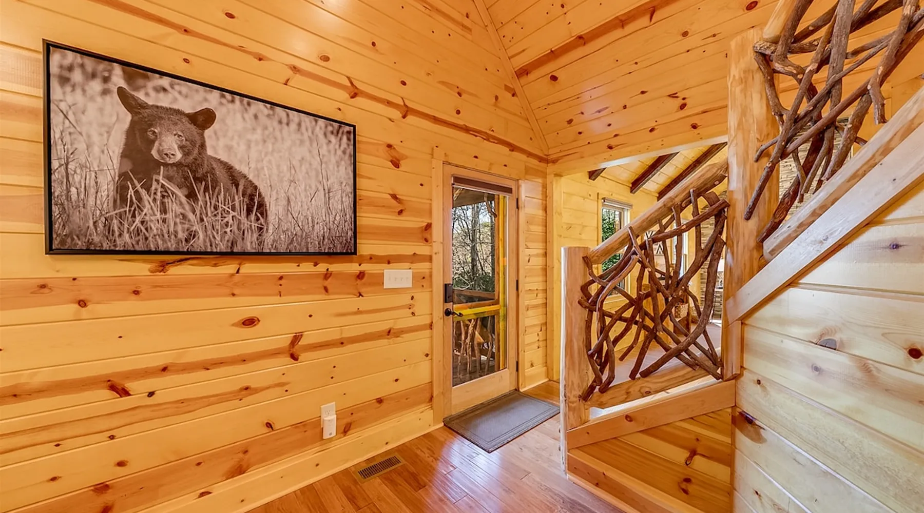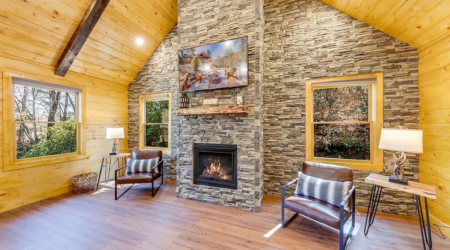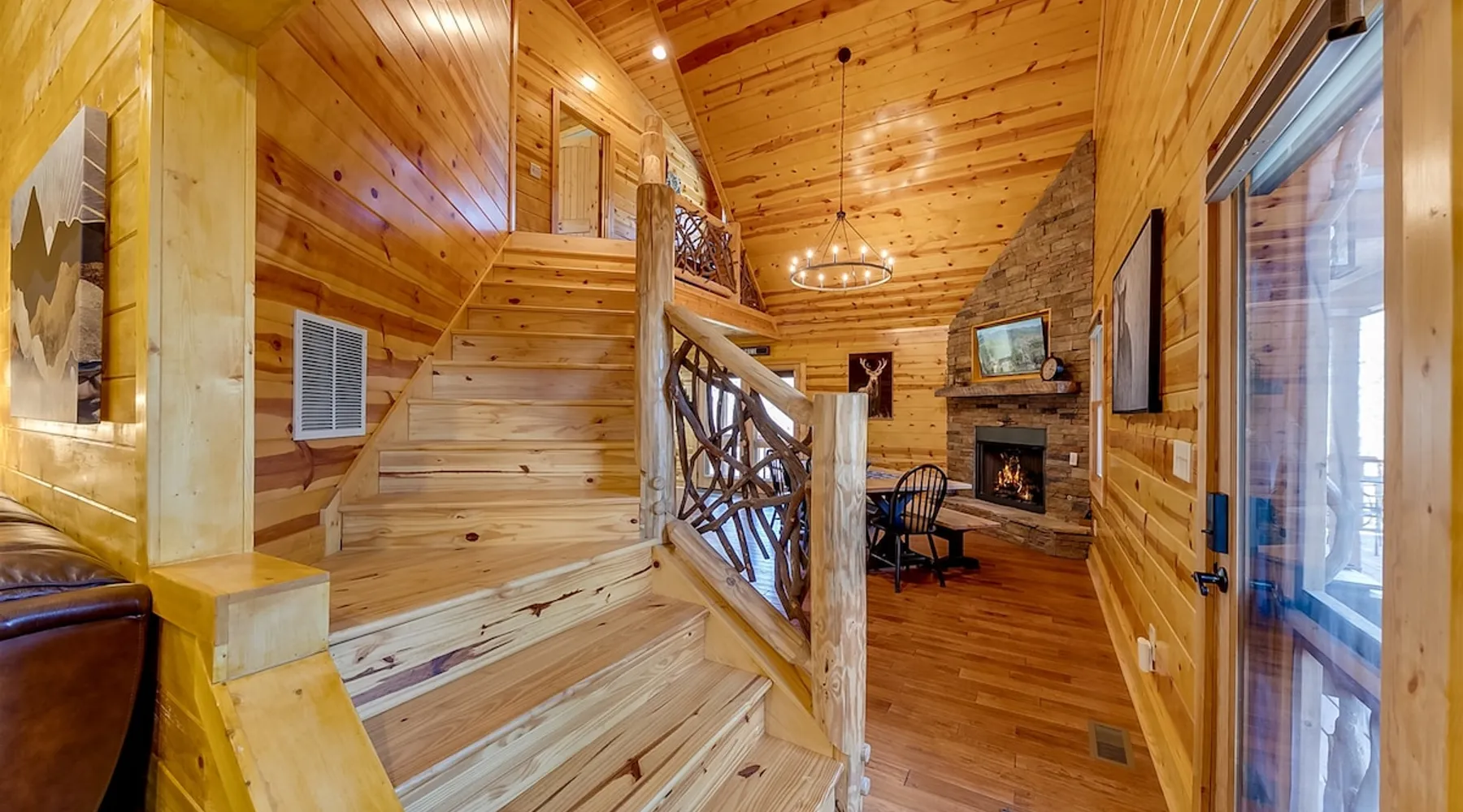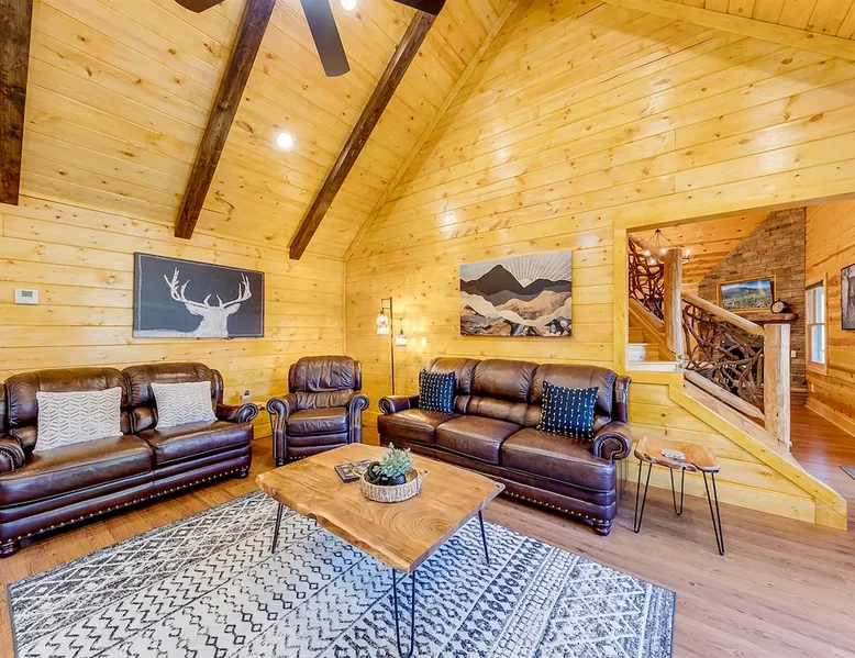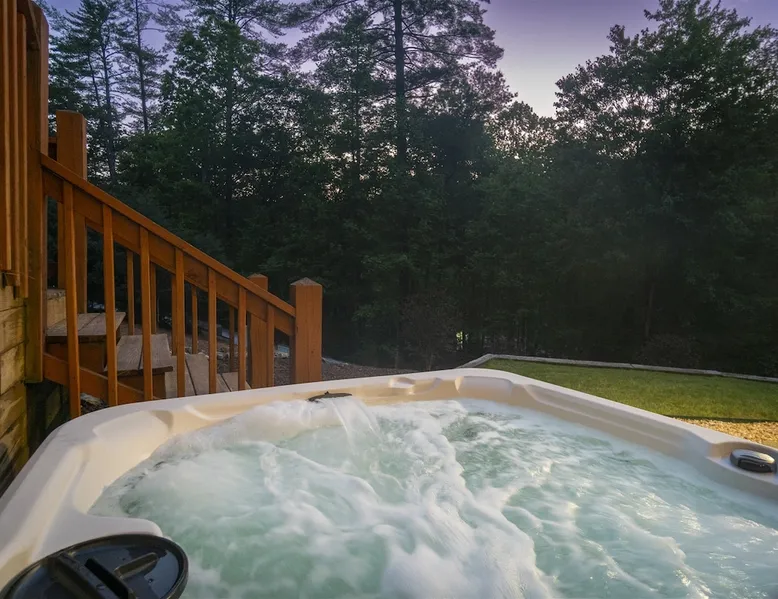 4 Bed/3 Bath - Beautiful & Secluded with Hot Tub, Game Room, Fire Pit & Easy Access to Downtown Helen The space “Hilltop Haven” is a secluded rustic cabin with a hot tub located North of Helen near Richard Russell Scenic Hwy and Smithgall Woods Park & less than 2 miles from the fun & exciting center of Helen, GA. This 3 level 4 bedroom, 3 bathroom cabin has a great bedroom layout and is thoughtfully decorated with many custom furniture pieces throughout. The fully-stocked kitchen with granite countertops and stainless steel appliances has everything needed to enjoy a home-cooked meal. In the living area it boasts a gas log fireplace, gorgeous vaulted ceilings and a 55 inch Smart TV. On the terrace level you will find an area that adults and children alike will enjoy! There is aone bedroom Queen with bunk beds and a game room with Foosball Table and Dart Board. This area leads out to the Cozy Outdoor Fire Pit with Four Adirondack Chairs, 2 benches and an Outdoor Swing. Main Level of the home has two bedrooms with Queen Beds, , a shared hall bath, kitchen, living area, and access to the Gas Grill, Beverage Cooler and open air deck with multiple seatings areas enjoy al fresco dining. The ornate staircase from the main level leads up to the Primary Bedroom with a King Bed, Large Bathroom with Shower, Soaking Tub & Vanity. Boat and tubing rentals are a short drive away to explore the Chattahoochee River or enjoy a day to explore the local vineyards and wineries. With so much to see and do in the area you will want to come back year after year! Things to Know: • 25+ age requirement for lead guest. No exceptions. • This property is not pet-friendly. No exceptions. • Digital rental agreement will be required to sign and complete after property is booked. • Firewood not supplied. Firewood not allowed in the gas fireplace. *Please be aware there are outdoor cameras and a Ring Doorbell camera at the front door.