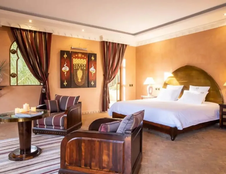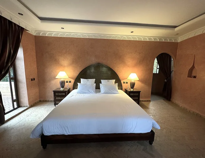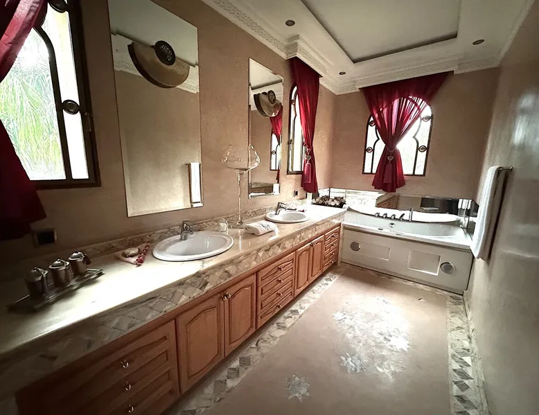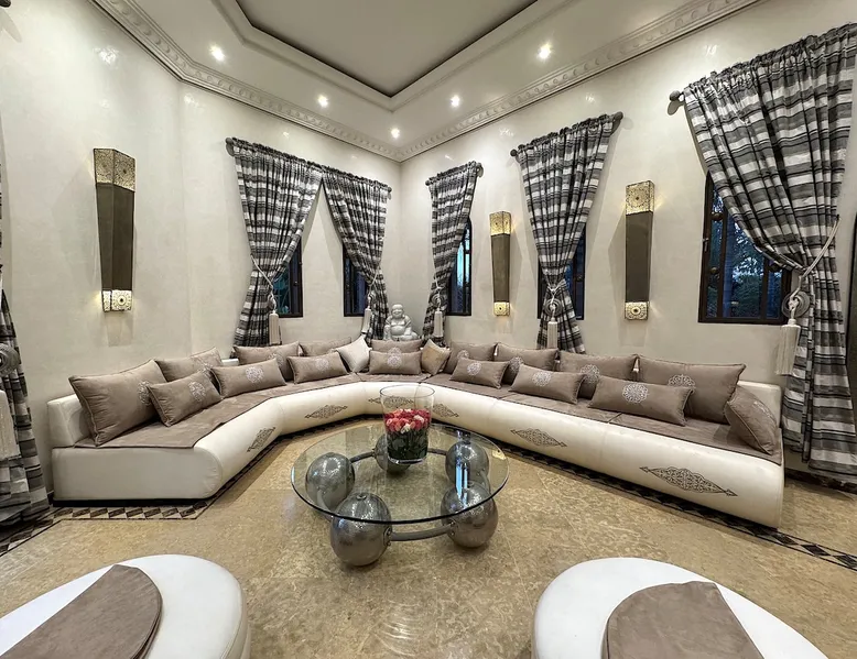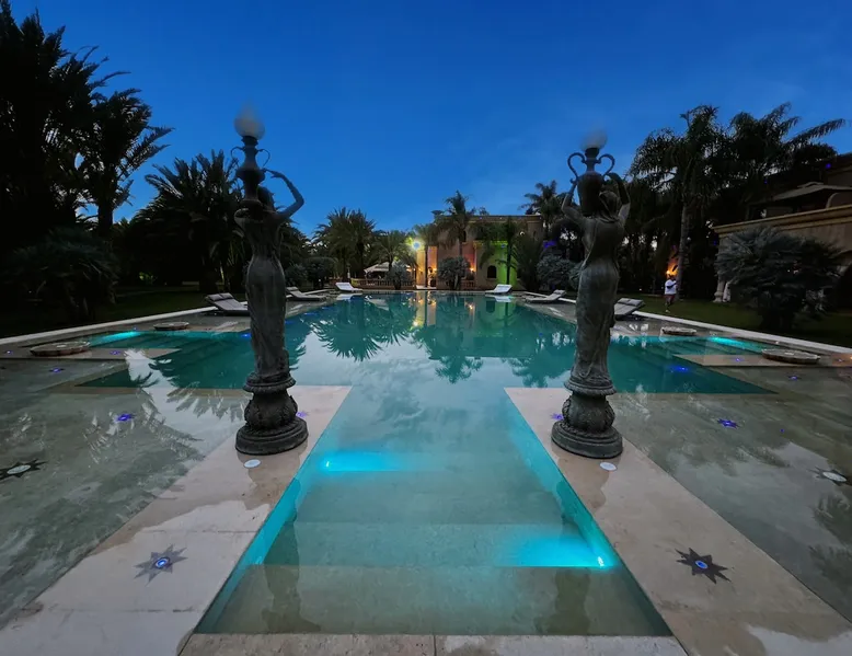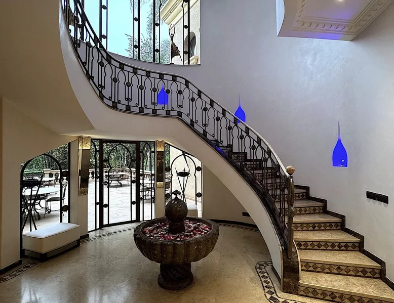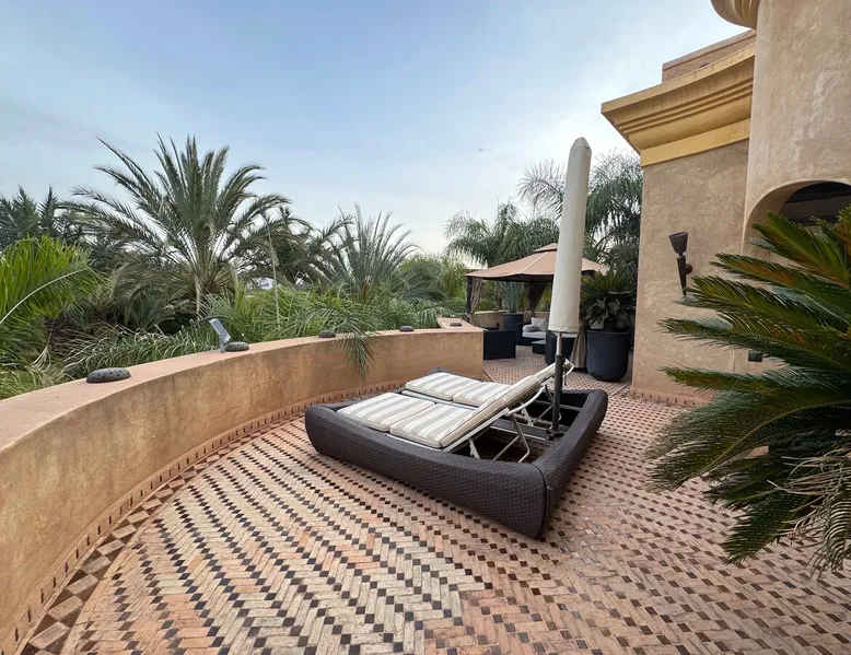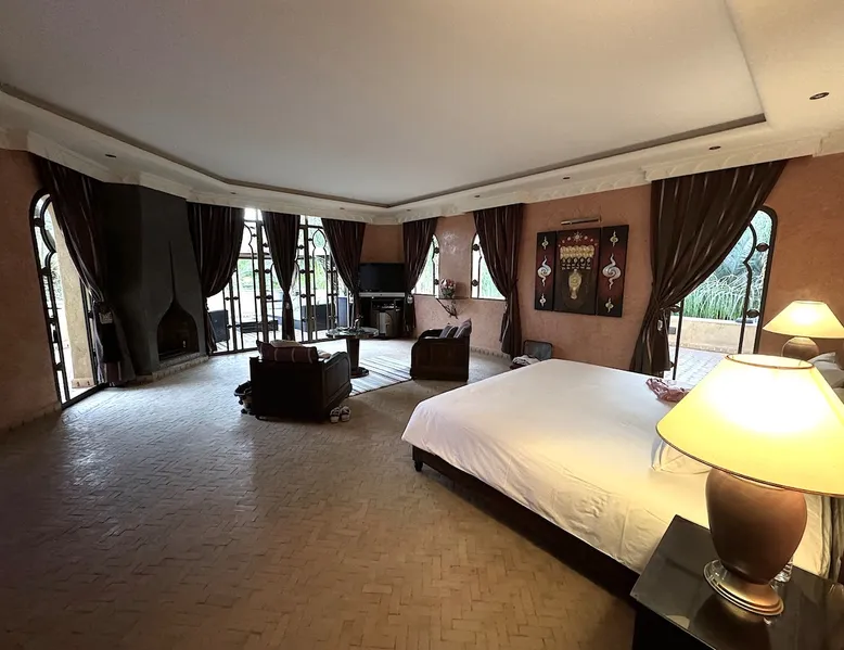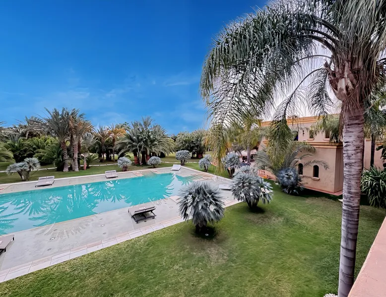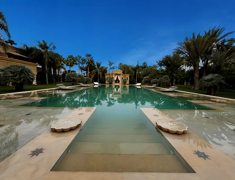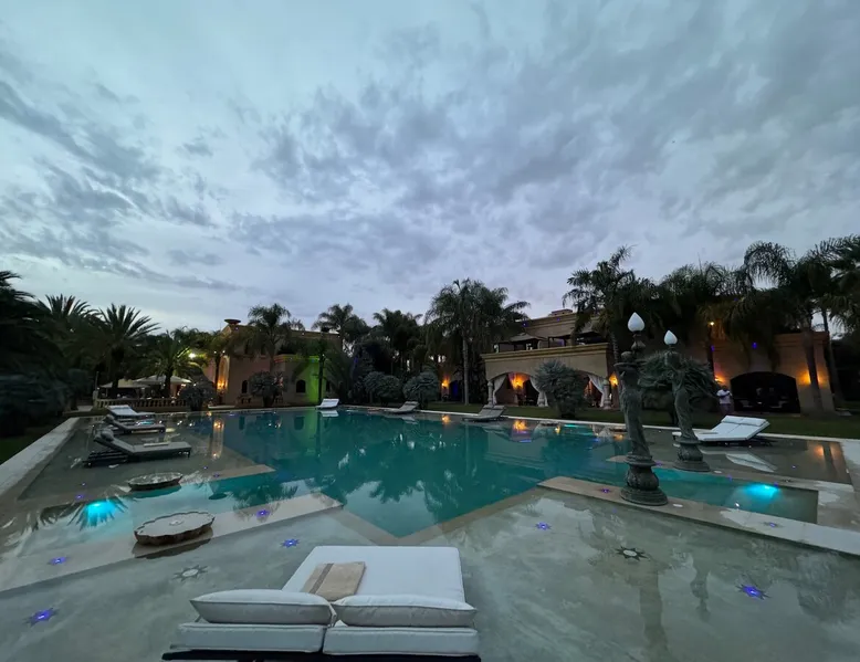 Welcome to Palais Mirage, where traditional Moroccan opulence converges with contemporary luxury, crafting an extraordinary experience. Each corner of this majestic palace narrates a tale of exquisite craftsmanship, from enchanting mosaics to verdant gardens. Indulge in sumptuous interiors exuding unparalleled elegance, offering breathtaking views of Marrakech's grandeur. The space Step into our lavish palace, just 20 minutes from Marrakech! This exceptional abode boasts 10 elegantly appointed rooms, each featuring a mini-bar, a safe, a dressing room, a luxurious bathroom, a desk with impeccable WiFi, and of course, air conditioning. Every room includes a private terrace overlooking the majestic Atlas Mountains, while wood-fired fireplaces elevate your evenings. Savor the meticulously designed details for your utmost comfort. Outside, immerse yourself in our infinity pool boasting 14 diving boards, or unwind on our water-edge sunbeds. Picture-perfect gardens adorned with majestic palm trees and vibrant roses await, with lemon trees lending a Mediterranean ambiance. Embark on a total wellness journey with our spa offering hairdressing and massage services. Rejuvenate in our hammam, where tranquility reigns supreme, or explore our hot tub for ultimate relaxation. Extend your leisure with a heated swimming pool (at an additional cost). Our dedicated staff is on hand to ensure an unforgettable stay. **Please note that the listed price is for maximum accommodation. We are happy to offer different rates for groups of up to 4 people or up to 6 people. Please inquire for more details.** Guest access Situated 17km from the city center and 25 minutes from Marrakech airport, guests enjoy full access to the entire property (except for certain amenities at an additional fee). Other things to note The estate is secured by a 24/7 caretaker. Please note: Moroccan law prohibits the hosting of unmarried Moroccan couples, with no exceptions. Hosting "paid" guests at Palais Mirage is strictly prohibited by Moroccan law. Only registered guests are allowed on the property; no exceptions will be made. **Please note that the listed price is for maximum accommodation. We are happy to offer different rates for groups of up to 4 people or up to 6 people. Please inquire for more details.**