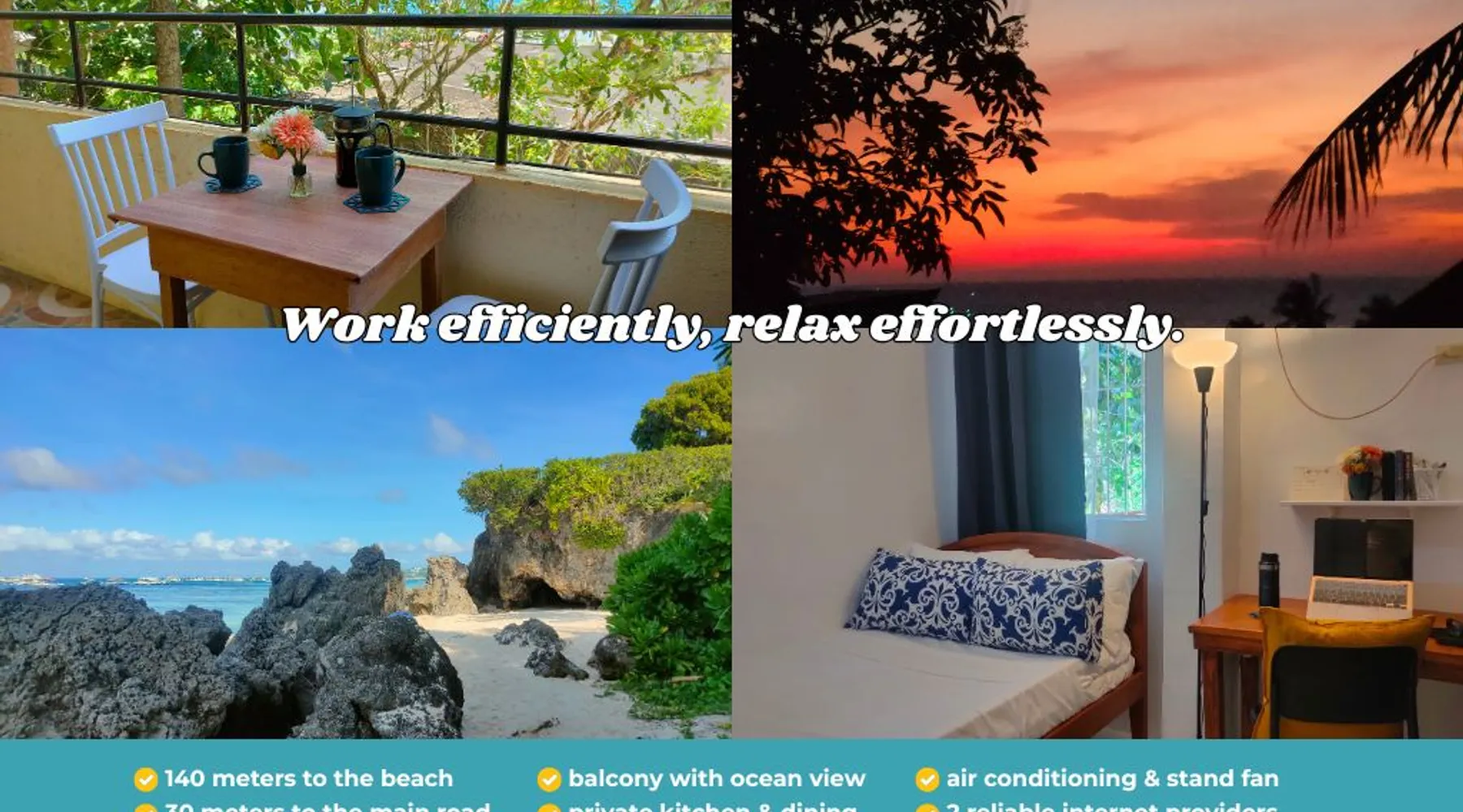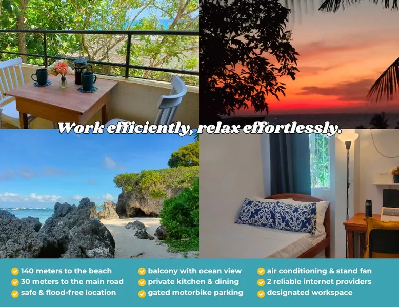 THIS PLACE IS FOR YOU IF YOU PREFER: โ Peace over party vibes โ Simplicity over luxury WHAT OUR HAPPY GUESTS LOVED MOST: ๐๏ธ 2-min walk to quiet White Beach (Station 3) ๐ป Fast, reliable Wi-Fi (150 Mbps + backup) ๐ Balcony & rooftop with sunset/ocean views ๐งบ Free use of beach mats, floaties & produce ๐ Safe, flood-free area with easy road access ๐๏ธ Near restaurants, laundry & grocery shops ๐งโโ๏ธ Perfect for remote work & local island living Canโt find your dates? Check our other listings! The space โ ๏ธ THIS PLACE IS NOT SUITABLE FOR EVERYONE โ ๏ธ If you're not physically fit to comfortably walk a short distance of 140 meters (about 2โ5 minute walk) to the beach or climb stairs, we recommend booking a beachfront hotel for your convenience. ๐ก THE APARTMENT: 22 sqm 1-Bedroom Apartment on the 2nd floor ๐ซ Stairs only. No elevator. A comfortable haven for couples and solo travelers. ๐ก THE LAYOUT: Located on the second floor, the apartment opens through a shared balcony โ a cozy spot for coffee, sunsets, or working outdoors. Since there are only two apartments on each floor, the space still feels private and peaceful. Inside, youโll find a kitchen and dining area filled with natural light, separated by a wall from the bedroom for added privacy. This rare layout lets you cook, work, or take calls without disturbing your rest space โ ideal for solo travelers and couples who value calm and flow. ๐ BEDROOM: Wake up to the chirping of birds and turquoise ocean views. ๐๏ธ Comfortable 48โ bed for 1-2 adults ๐ช Windows with blackout curtains ๐ช Designated workspace โ๏ธ AC and stand fan ๐งณ Cabinet ๐ INTERNET: Enjoy seamless productivity and tranquillity. ๐ถ Each apartment has its own router ๐ก Supported by two internet providers โก Speeds of 150 Mbps and 50 Mbps โ perfect for Zoom calls ๐ณ KITCHEN & DINING: Equipped with all you need for light cooking. ๐ฒ Pots and pans ๐ด Utensils ๐ง Fridge ๐ฅ Stove โ Electric kettle ๐ Rice cooker ๐ฟ BATHROOM: Clean, no-nonsense setup ๐งป With bidet, hot & cold shower ๐ชฃ Wash basin for your wet beachwear ๐ BALCONY ๐ท Dine al fresco or enjoy a drink at sunset ๐ผ Can double as an outdoor office ๐ด ROOFTOP: Rare island feature with panoramic views of White Beach and lush greenery ๐ง Ideal for yoga, meditation, or stargazing โต Watch colorful sails drift across the horizon ๐RARE STRATEGIC LOCATION ๐ Safe from flooding even on rainy days ๐ถ Easy walk to both the beach and the main road ๐ค Just 1 km to Cagban Port and less than 2 km to Tambisaan Port โ your main entry and exit points to the island Some of the awesome people whoโve stayed with us and loved their time here: ๐ป Digital nomads and remote workers who enjoyed the serenity while staying connected ๐ Foreign students learning English at nearby schools ๐ Book authors (local & foreign) who found the quiet they needed to finish their book ๐คฟ Scuba divers who made friends at nearby dive shops over beers ๐ฃ Spearfishers who cooked up their fresh catch in the kitchen ๐โโ๏ธ Fitness buffs who turned the 4 km stretch of White Beach into their outdoor gym ๐ง Yogis and mindfulness folks doing their inner work ๐ฎ Astrologers tuning into the stars ๐ช Kite surfers chasing wind and waves ๐ด Travelers just looking to slow down and soak up island life Guest access ๐๏ธ Free access to the beach, just a 2-minute walk to the more secluded and laid-back part of White Beach. Plus, you can use our beach mats and floaties for free. ๐ Enjoy snorkeling in our coral gardens โ just bring your own gear or rent it nearby. ๐ป No TV, but if you have a laptop, weโd be happy to share our Netflix account with you. ๐ฟ Feel free to pick some of our homegrown fruits and veggies โ moringa, papaya, chili, spinach, avocado, and more. ๐ต Free parking for motorbikes. ๐ฃ๏ธ Easy access to the main road and public transport. Other things to note ๐ THIS PLACE IS NOT SUITABLE FOR EVERYONEโผ๏ธ If you're not physically fit to comfortably walk a short distance of 140 meters (about 2โ5 minute walk) to the beach or climb stairs, we recommend booking a beachfront hotel for your convenience. ๐ MONTHLY STAYS: Water, electricity, and gas for cooking are excluded in the discounted monthly rate (28 nights or more) ๐OUR NEIGHBORHOOD: Nearby pups contribute to the local charm and also help keep our neighborhood safe; harmless insects and lizards are all part of the local ecosystem. ๐ SAFE PLACE POLICY: We are committed to providing a safe and respectful environment for all guests. We have zero tolerance for drugs, violence, and any romantic or inappropriate interactions between adults and minors on our property. ๐ DRONES: Prohibited on the island for personal use. ๐ POWER OUTAGES: They are usually scheduled and announced in advance, and guests will be notified accordingly. Unexpected outages may occur due to emergencies like severe weather or fire, though power is generally restored within an hour, we donโt have a generator. There are nearby restaurants, and co-working spaces equipped with generators and Wi-Fi. ๐Angol (Beachfront) -Nagisa -Love Shack Bistro (Beside Cocoloco) -Villa Caemilla ๐Bulabog Beach -Lazydog Boracay -The Monkey Tree Cafe and Bar ๐Sinagpa Beach The Strand