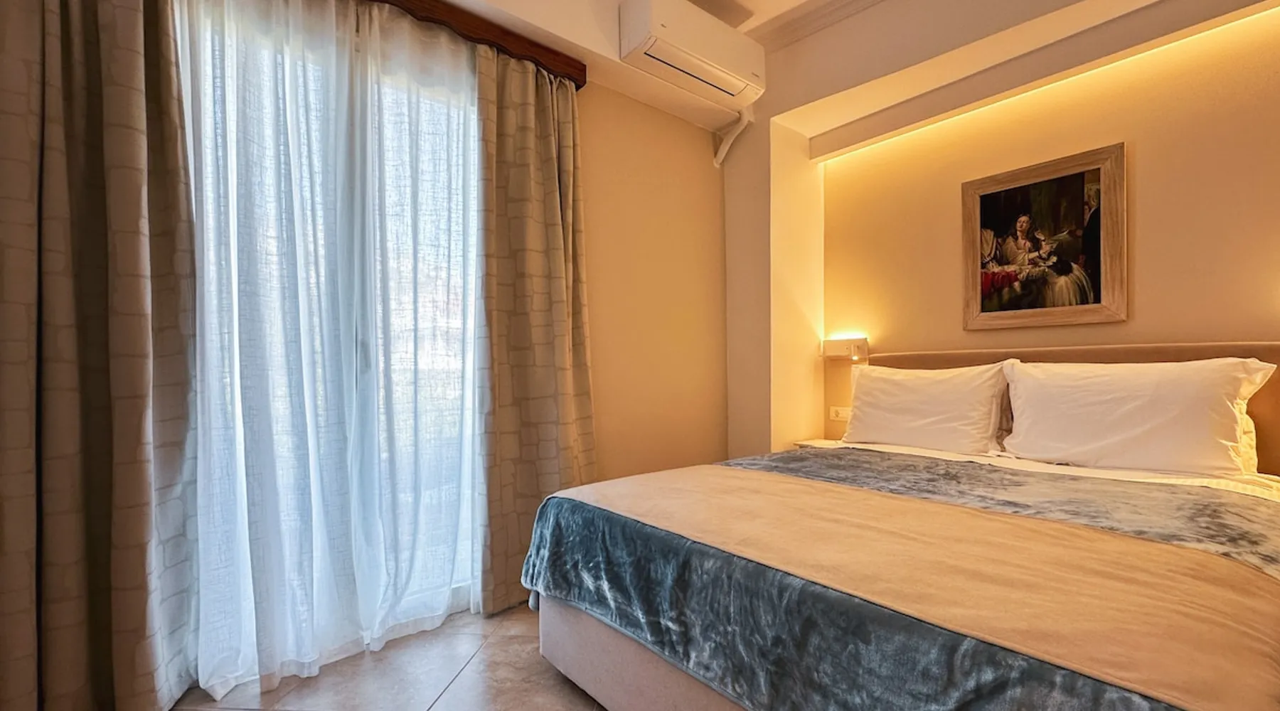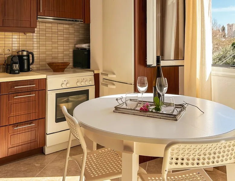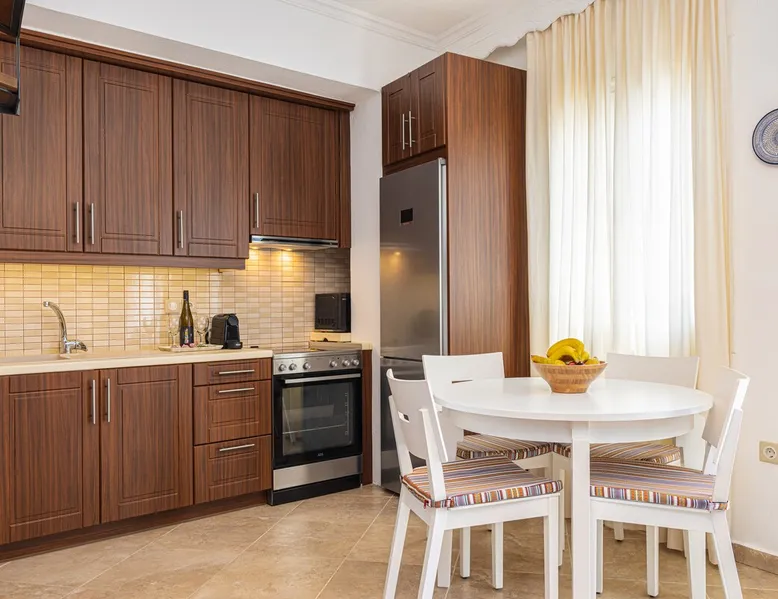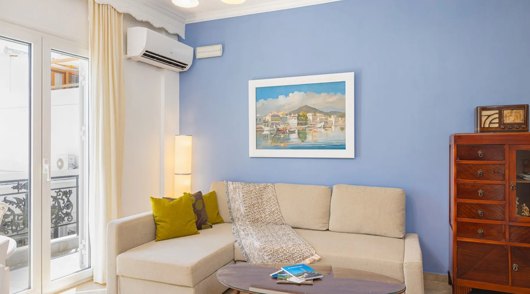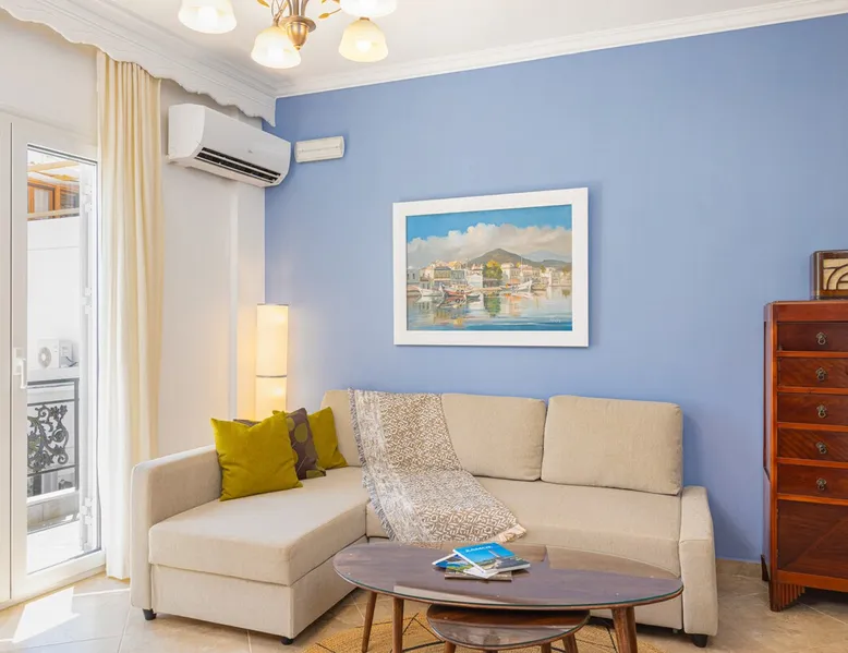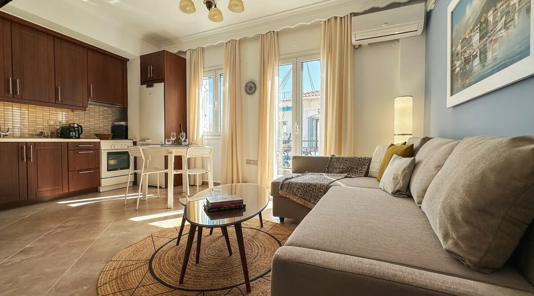 The 50m2 apartment combines comfort and style, fully renovated (2024) to ensure you an excellent quality of stay. It is in a very central location, 3km from Samos airport, 100m from the Archaeological Museum, 150m from the nearest beach and very close to all points of archaeological or tourist interest. It has direct access to the main pedestrian street which allows you to reach all the popular restaurants, tourist shops and coffee bars in 2 to 5 minutes on foot. The space The house can accommodate up to three (3) people (ideally up to 2 adults and up to 1 children), with a queen-size bed (160x200cm) in the main bedroom and a large comfortable corner sofa (140X200cm) in the living room. The bedroom, featuring a queen-size bed (160x200cm), a spacious wardrobe, and a balcony, offers a direct view of the property's large garden and the mountain. In the living room, there is a large (150X230cm) and comfortable corner sofa that doubles as a bed for two persons. A large 43-inch high-definition Smart TV is provided for your entertainment. The large living room and dining room are forming a single space, and have access to the main balcony, which offers a view over the main street of Pythagorio. Guest access The visitor during his stay can make use of all areas of the accommodation as well as the large garden located in the front of the apartment. Other things to note Communication is key, and we want to ensure you have a worry-free stay. Prior to your check in we will provide you an analytic guide regarding the apartment, things to do around the island and how to communicate with us. Registration Details 00002452749
