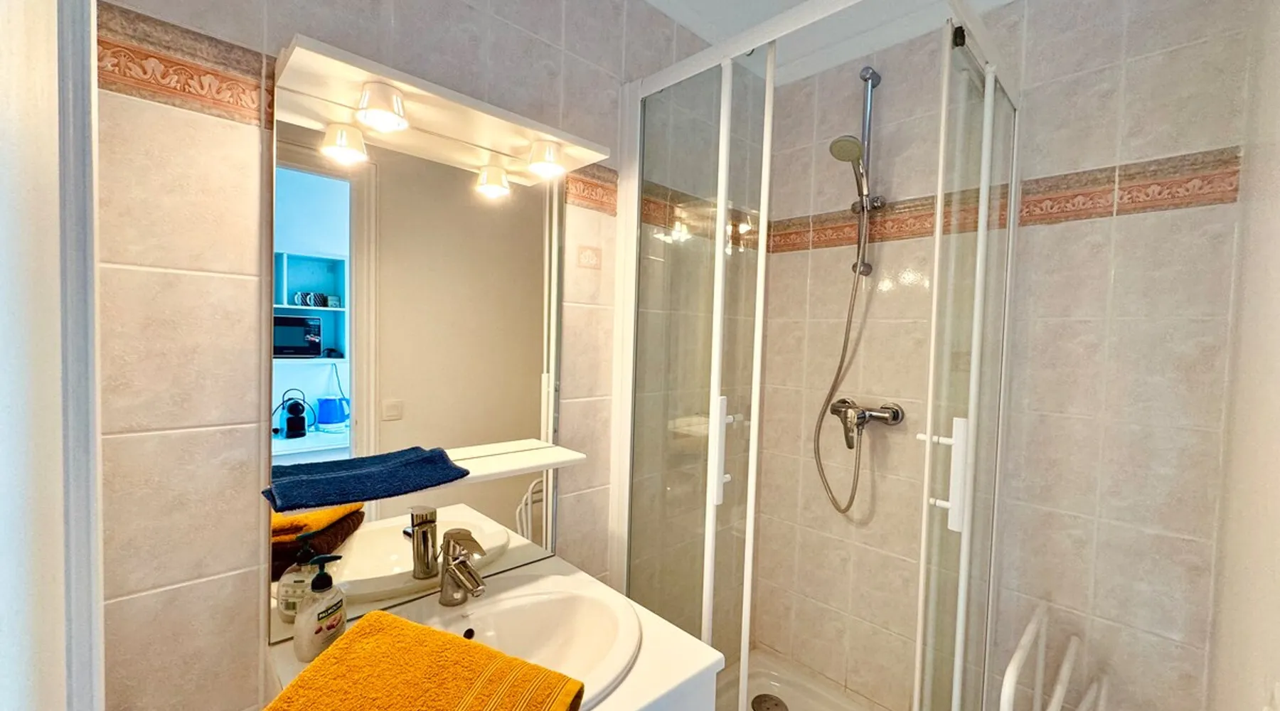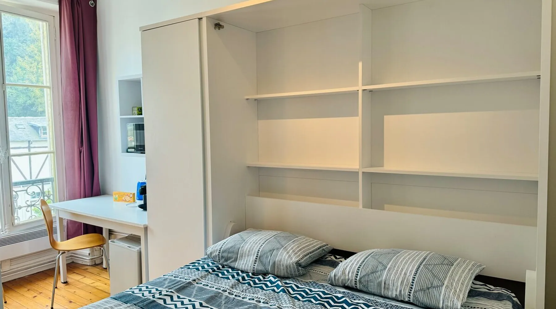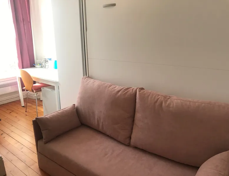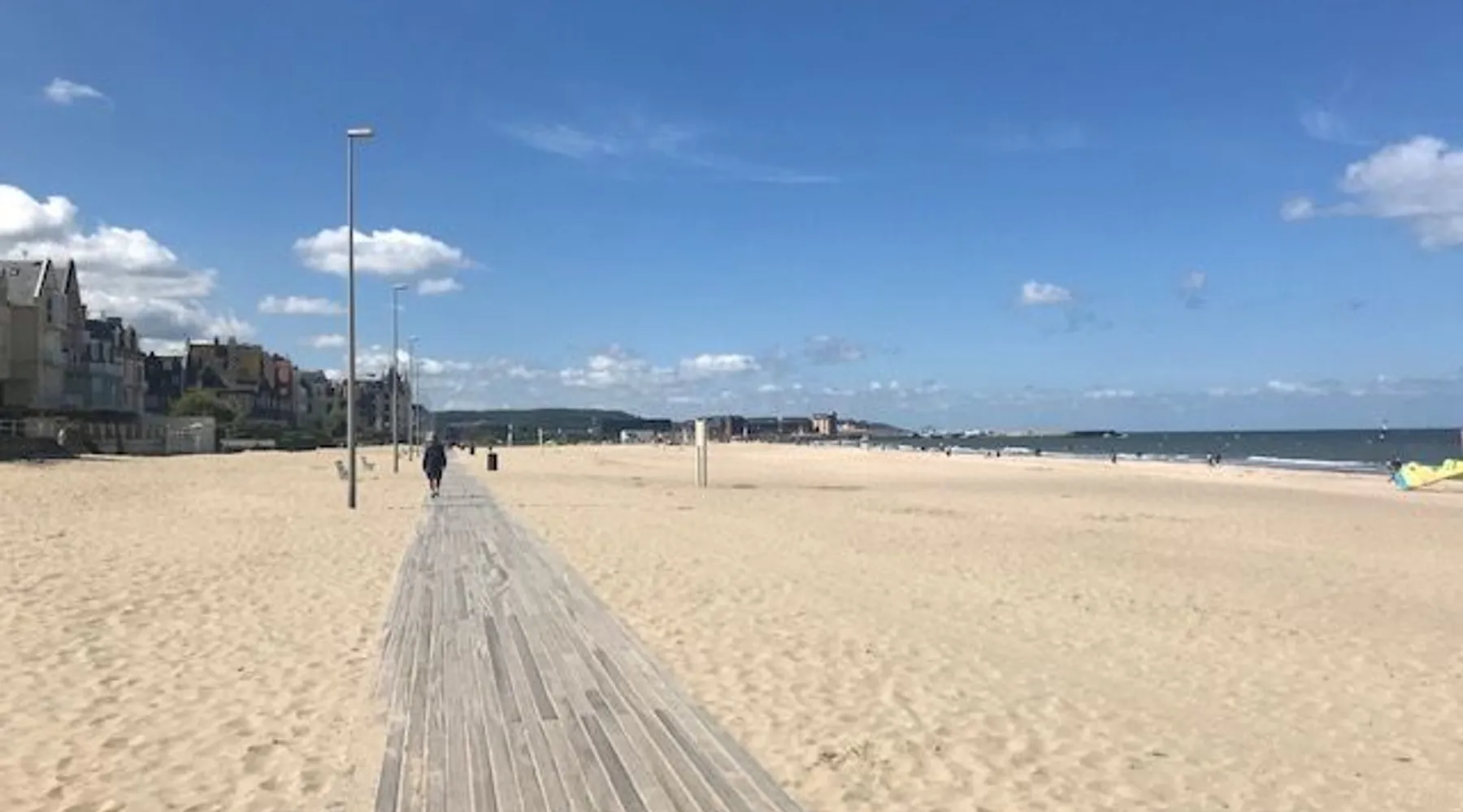 Located in Trouville-sur-Mer, ideally located facing the sea with direct access to the beach. The magnificent hall classified as a historical monument, deck overlooking the sea, private parking, caretaker. Small bedroom (13 m2) refurbished on the 2nd floor floor with elevator elevator elevator. 160 x 190 cm foldaway bed (very comfortable mattress of 24 cm), a 163 cm HD TV, Wi-Fi, private parking, ultra quiet fridge, shower with sink and mirror. Toilet on the landing to be shared with very few residents.