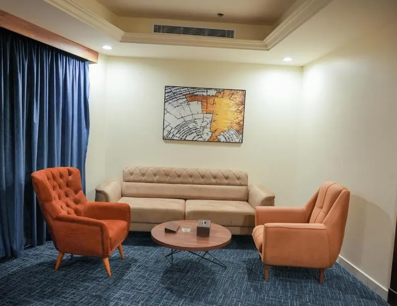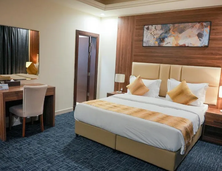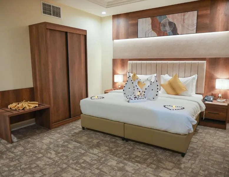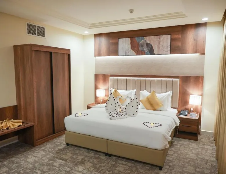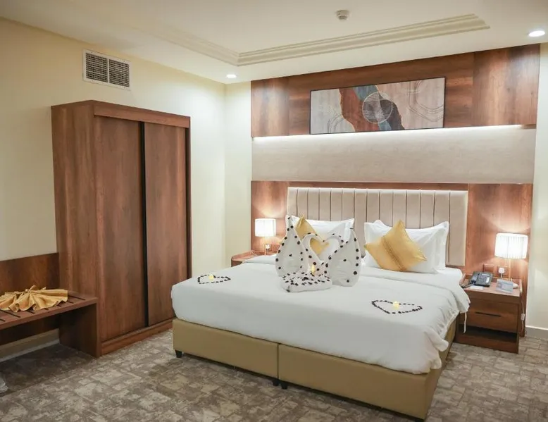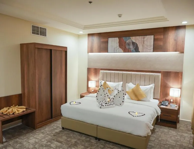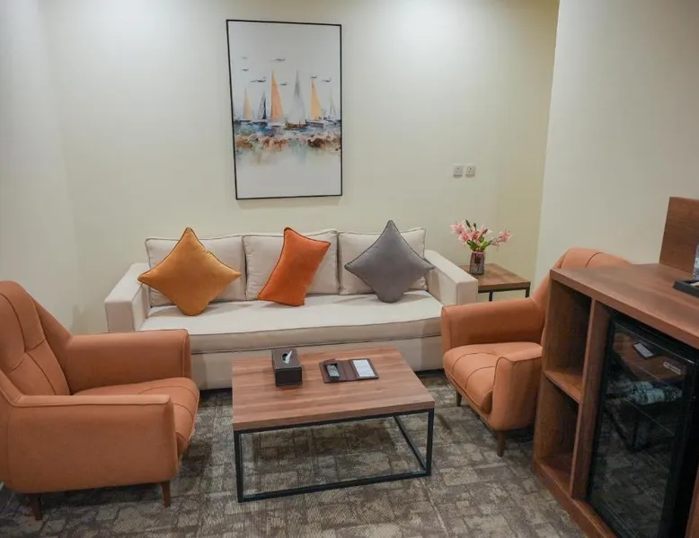 Comfortable Accommodations: فندق المدى العربية الفندقية in Jazan offers family rooms with air-conditioning, private bathrooms, and modern amenities. Guests enjoy free WiFi, a fitness center, indoor swimming pool, and spa facilities. Dining Experience: The hotel features a family-friendly restaurant serving American, Middle Eastern, local, and international cuisines. Breakfast options include continental, American, buffet, vegan, halal, gluten-free, and kosher. Convenient Location: Located 1.9 mi from Jizan Regional Airport, the hotel is near attractions such as Al Khazzan Park (2.5 mi) and Happy Times Theme Park (3 mi). Free on-site private parking is available. Guest Satisfaction: Highly rated for room cleanliness, staff support, and comfort, the hotel ensures a pleasant stay for all visitors. This suite's special features are the hot tub and the sauna. Featuring a private entrance, this air-conditioned suite consists of 1 living room, 3 separate bedrooms and 2 bathrooms with a walk-in shower and a bath. The suite's kitchen, which features a refrigerator, is available for cooking and storing food. The spacious suite provides soundproof walls, a mini-bar, a tea and coffee maker, a flat-screen TV with satellite channels, as well as city views. The unit offers 6 beds.