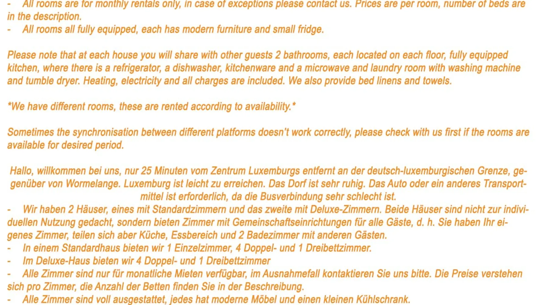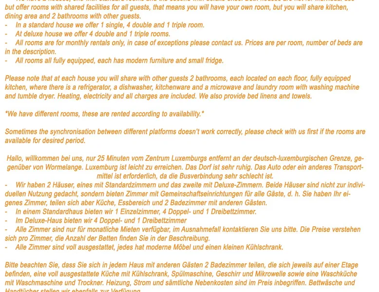 Hello, welcome to out place, situated only 25 minutes from Luxembourg centre on German Luxembourg border, opposite Wormelange. Easy access to Luxembourg. We offer 4 double rooms on monthly bases only, please contact us for details. The space We offer 4 double rooms, for monthly rentals, all fully equipped, with shared 2 bathrooms, kitchen and dining room. Number of rooms depends on current availability. All double room that have modern furniture and small fridge, as well as a shared bathroom featuring a walk-in shower and a hairdryer. In the fully equipped kitchen, guests will find a refrigerator, a dishwasher, kitchenware and a microwave. The double room offers heating and a quiet street view. The unit offers 2 beds. *We have 4 double rooms, these are rented according to availability.*
