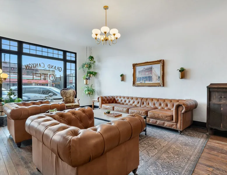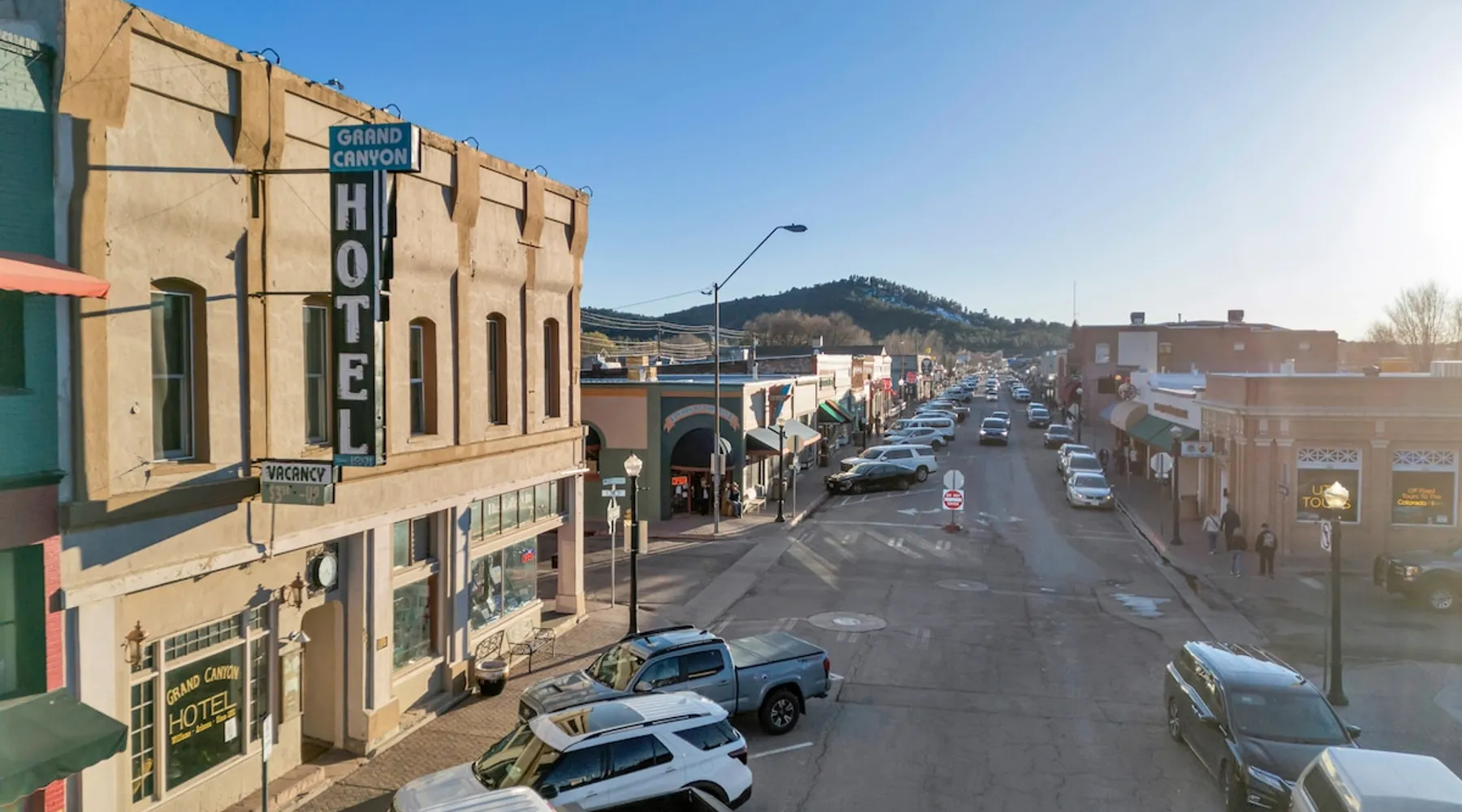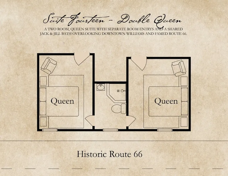 Experience historic charm with modern comfort at the Historic Grand Canyon Hotel, Arizona's oldest hotel! Nestled in downtown Williams, our two-room suite offers stunning views of Route 66. Relax in style with new mattresses and linens for a rejuvenating stay. Perfect for couples or friends, enjoy privacy with separate bedroom entrances connected by a Jack and Jill bathroom. Book your getaway now for an unforgettable Northern Arizona adventure! The space Two queen beds with views of route 66, private bathroom between the two rooms. Guest access Guests can enjoy access to the shared lobby and library, complete with books and games for relaxation and entertainment. The back patio is also available, offering patio tables and chairs for your comfort. Breakfast is served daily in the lobby from 6:30 to 9:00 AM, and all guests are welcome to join. Exciting updates are on the way! A newly renovated ballroom will soon serve as the breakfast area and an additional shared space during mornings. Stay tuned for this enhanced experience! Other things to note Discover the Historic Grand Canyon Hotel, perfectly situated on iconic Route 66 in the heart of downtown Williams, Arizona. Immerse yourself in the vibrant energy of the town, with shops, dining, and entertainment just steps away. Plus, we're only a quick five-minute trip from the train station, making your journey as convenient as it is unforgettable. Stay with us and experience history, charm, and the best of Williams all in one place.
