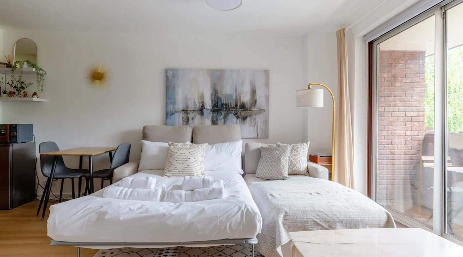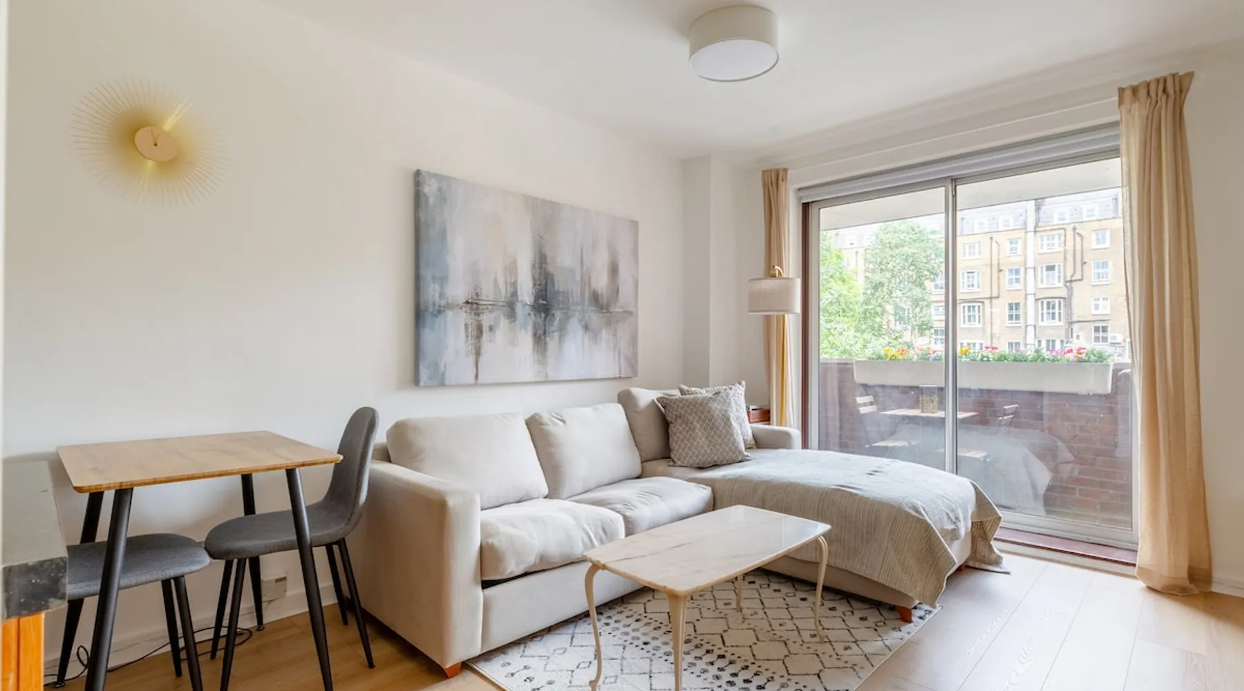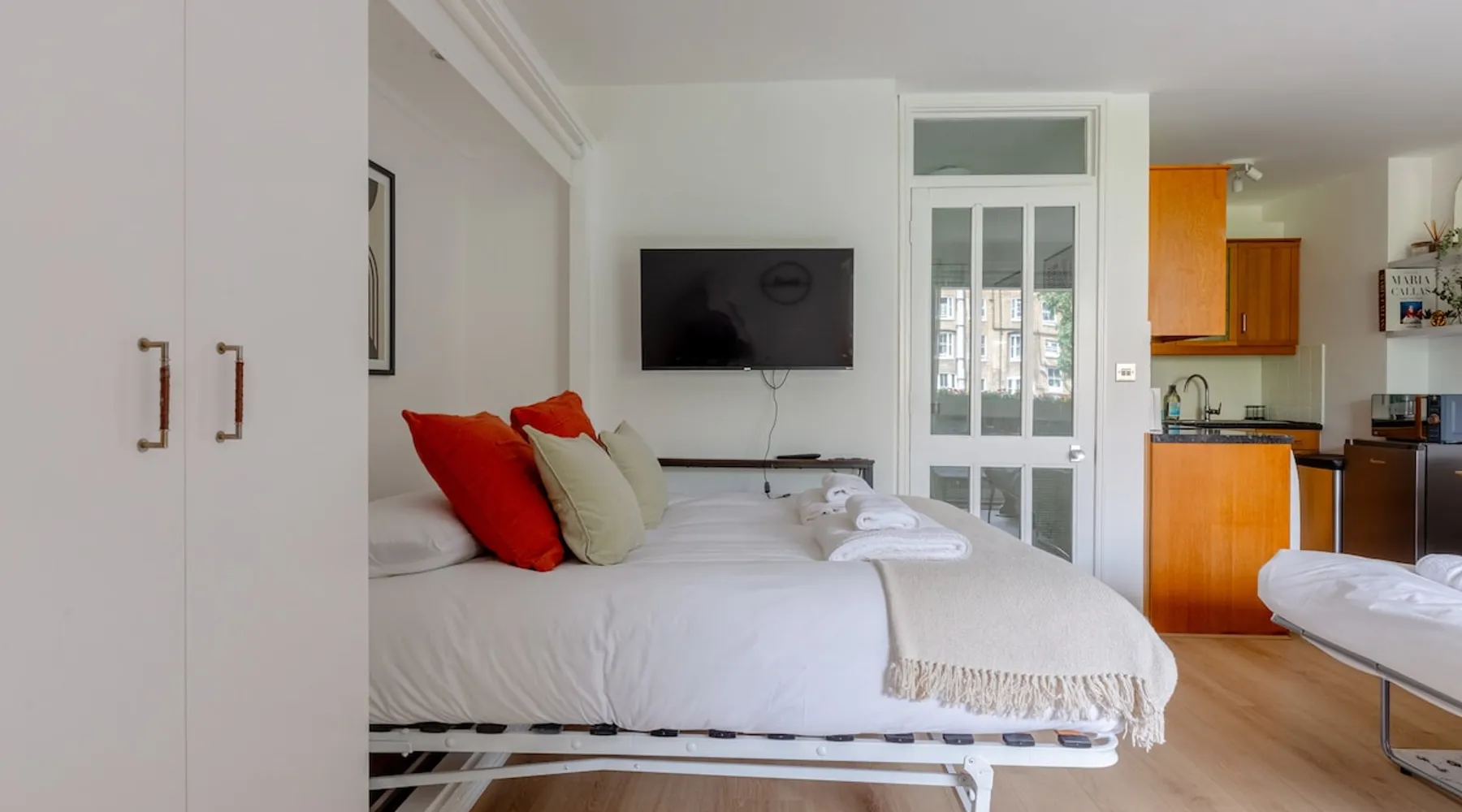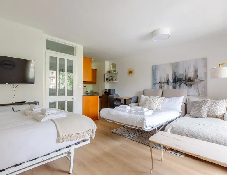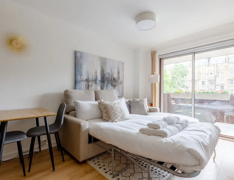 Welcome to this stylish studio retreat, just a stone's throw from Earl's Court Station! Perfectly located in the heart of West London, this quiet studio flat offers the ideal blend of comfort and convenience. Step inside to find a thoughtfully designed space, featuring chic décor, a cosy sleeping area, and a fully-equipped kitchen. Situated just minutes away from the tube, you'll have easy access to the rest of London's iconic attractions, museums and eateries. Book your stay now! The space - 24/7 guest support - Professionally cleaned - Hotel-quality bed linen and towels - Wifi available - Please be advised that this property operates on a fully self-catered basis. While certain amenities such as salt and pepper, cooking oil, and toiletries may be provided, their availability is not guaranteed and may vary between bookings. Experience the perfect blend of contemporary comfort, luxury and convenience at this newly refurbished studio flat in West London. Whether you are immersing yourself in the dynamic cityscape or unwinding after a day of exploration, this home ensures an unforgettable stay in the pulsating heart of London. From boutique shops and trendy cafes to buzzing restaurants and lively bars, you'll find plenty to see and do right on your doorstep. The flat has been newly decorated and is located in a quiet and peaceful spot ready for you to relax and enjoy. We look forward to hosting you soon! Kitchen: Step into a culinary haven featuring a newly updated kitchen equipped with a selection of state-of-the-art integrated appliances. The contemporary design ensures effortless meal preparation, while immaculate wooden cabinets neatly organise all your kitchen essentials. Adjacent to the kitchen, a wooden table with two seats provides a cosy spot to sit, chat, and create lasting memories together. Living Space: The inviting lounge serves as a versatile space for relaxation and convenience. Sink into the comfort of the L-shaped sofa as you unwind after a fun day exploring London. If you're in need of extra sleeping space, you'll find that the sofa conveniently transforms into a double bed, making it perfect for accommodating additional guests! (Please note that the sofa will be set up as a bed upon arrival, feel free to change it back into a sofa should you not need to make use of it) Bedroom: This space boasts a lavish king-size bed fitted with hotel-quality linen that guarantees a tranquil and rejuvenating night's sleep. Built-in cupboards ensure a clutter-free stay, while vibrant green plants and carefully chosen decor brighten up the space. The large glass windows flood the room with natural light during the day, creating a serene haven for relaxation. Bathroom: Start your day with a refreshing bath or shower in the well-appointed four-piece bathroom. Complete with a bath and connected shower, toilet and basin area featuring a large light-up mirror, this space is perfect for getting ready for the day or a night out. There are also hotel-quality towels available for your comfort and convenience. Private Balcony: Furnished with a two-seater wooden table, escape to your very own private oasis! Enjoy your morning coffee al-fresco in this gorgeous space, or unwind or soak up the summer sun in total privacy! Guest access Guests have access to the full property during their stay. Other things to note We kindly request that you read the house rules prior to booking and respect them during your stay. Parties or events of any kind will not be tolerated. Violation of this rule will result in eviction from the property and charges for any damages or additional cleaning required. Thank you in advance for your cooperation!