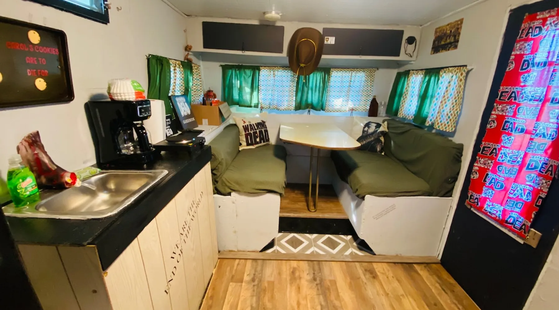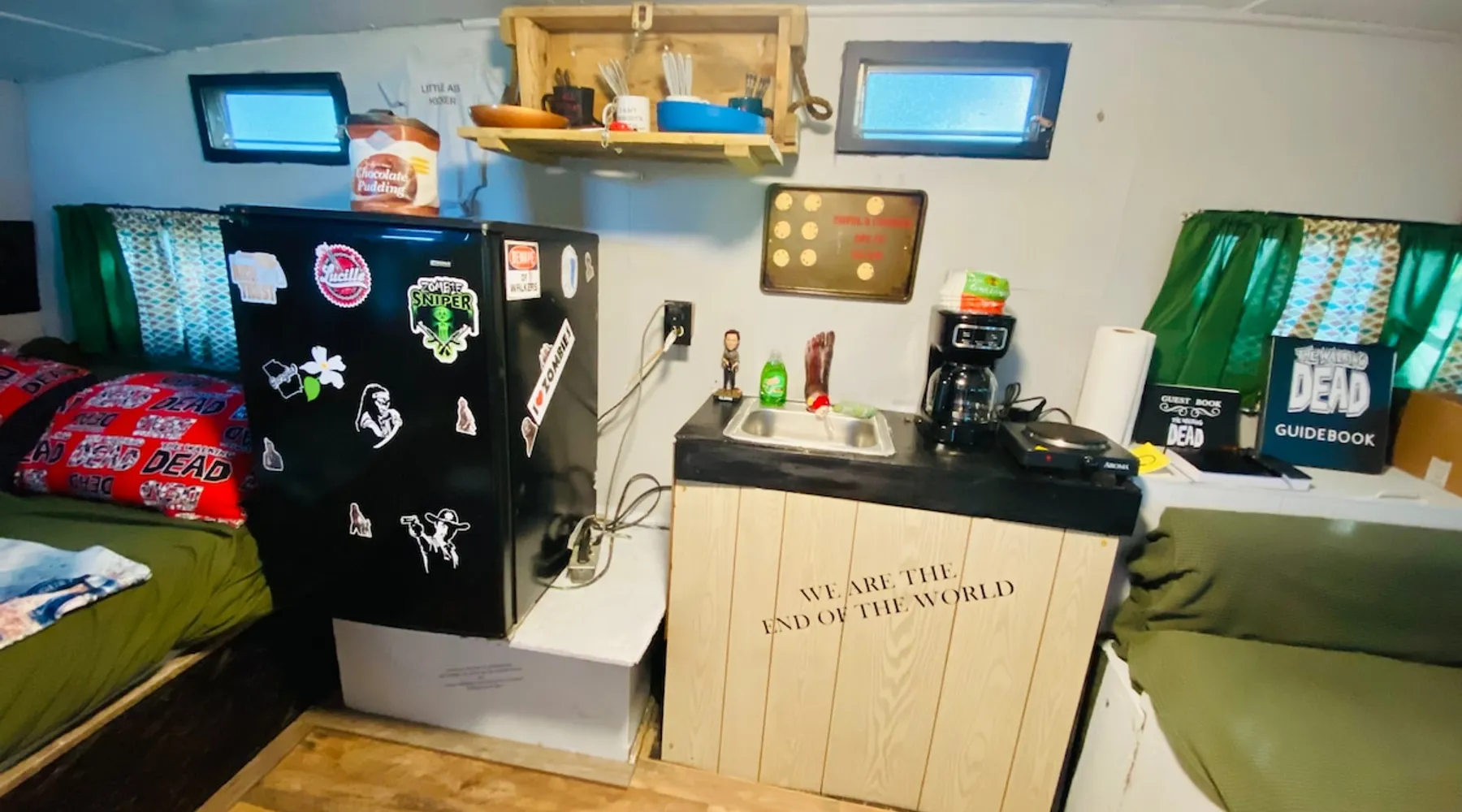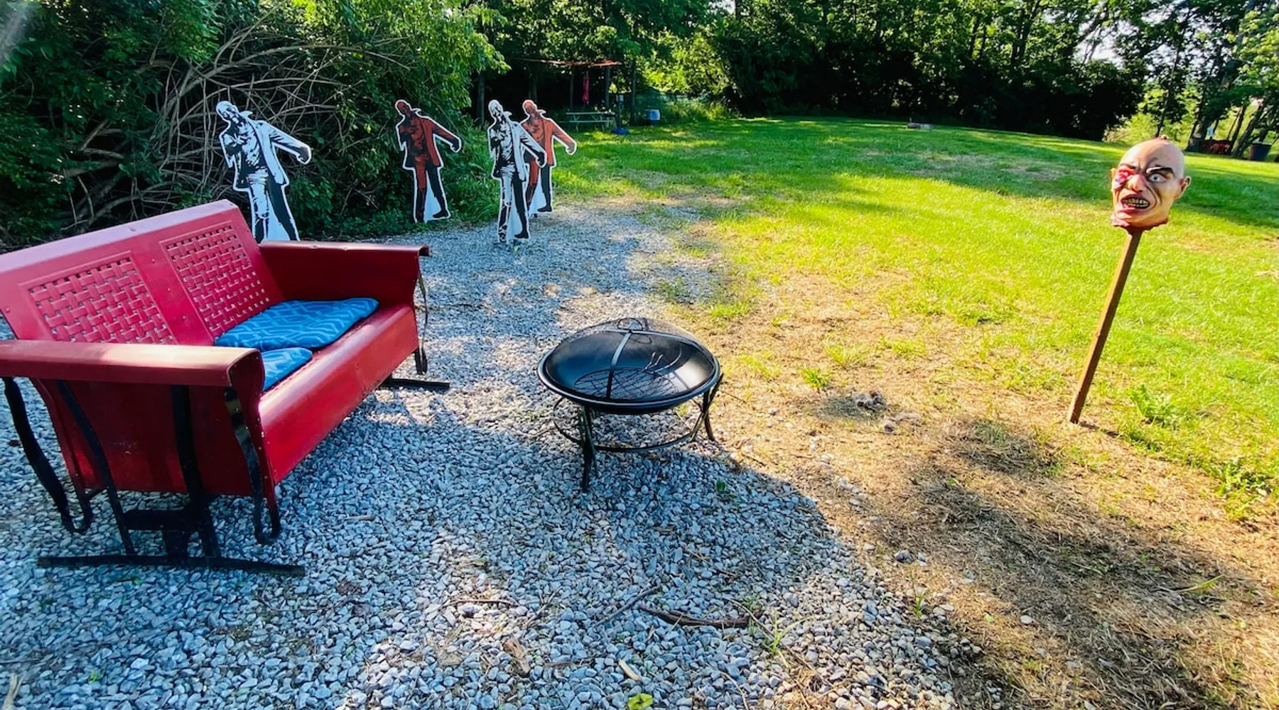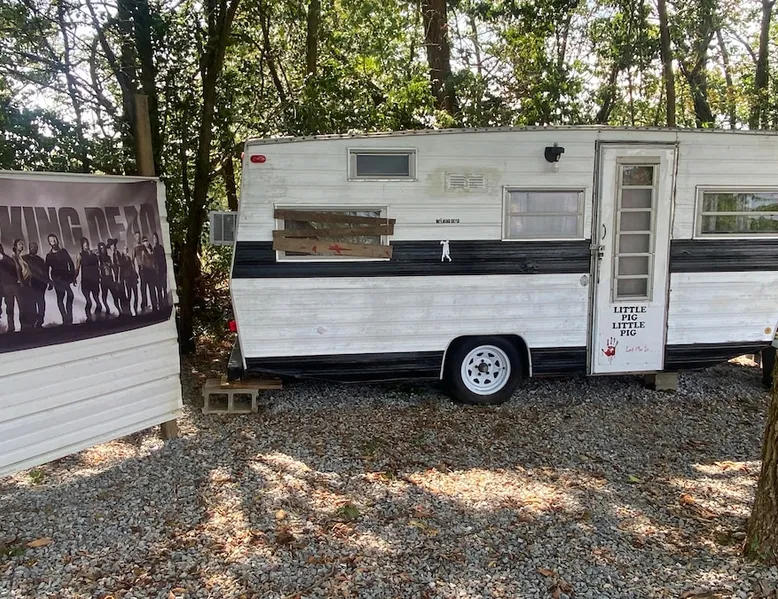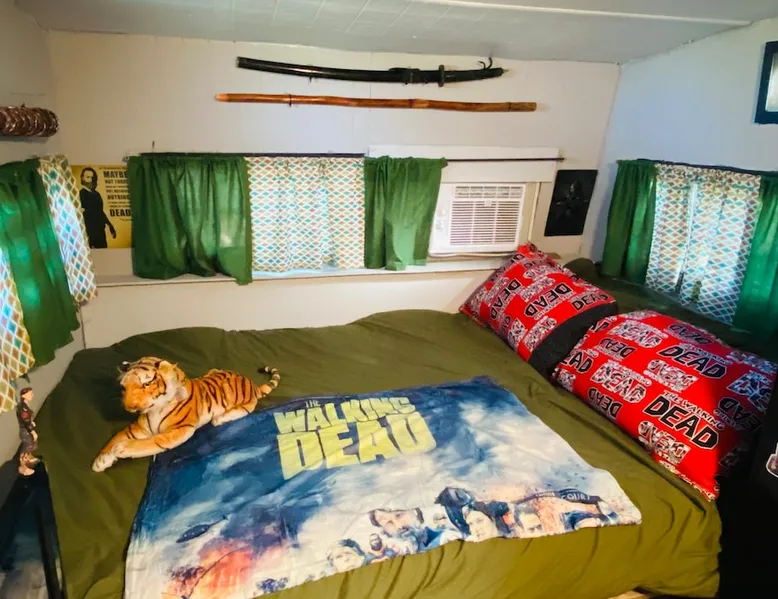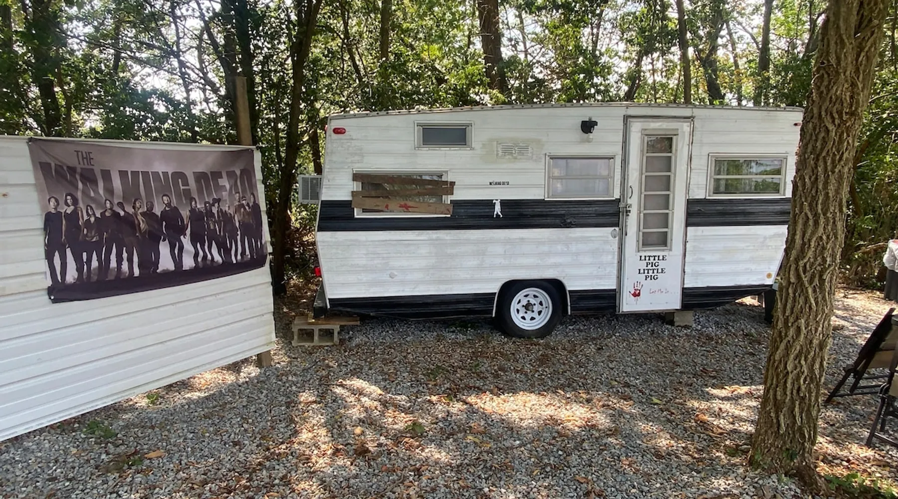 Deciding to stay in this Walking Dead camper is Easy Peasy Lemon Squeezy! Sleeps 4 people with a full-size bed and a table that converts to a bed. Whether you’re a TWD fan or not, I guarantee this will be a unique glamping experience. The camper is decorated with special memorabilia like quotes, tools, walkers, and more! Plenty of photo ops and you can take a selfie with Rick's hat! The space Vintage camper themed with TWD! Sleeps 4 average size adults. Could sleep 5 if 2 adults and one child sleep-in the full-size bed. BEDS: Full size bed with linens and pillows provided & the table converts to a twin bed (shown in pics). Blankets, pillows, and fitted sheet provided. The bed is extremely comfortable, you'll enjoy your time watching TWD on DVD while relaxing. KITCHEN: Coffee pot (bring your own grinds/water), one electric burner, large mini refrigerator, plates, cups, silverware, and a unique Walker's foot faucet (do not drink the water). The camper water is for hand/dish washing. Please remember to bring drinking water, charcoal, and coffee grinds). BATHROOM: The camper does not have a restroom inside. There is a well-maintained portable restroom and a cold-water outdoor shower. OUTSIDE: Table with chairs, charcoal grill (bring your own charcoal), firepit with a glider to sit on. We have provided a tote with $5 in firewood available for your convenience. It can be purchased through money apps or Airbnb. Additional firewood can be purchased upon arrival or any time before your reservation. WHAT WILL YOU SEE? Walkers, herds, gravesite, The Wall, zombie parts, quotes, books, tools, weapons, and so much more. We poured our heart and creativity into this camper! We hope you enjoy it. Want more TWD? It's a short drive to Nic & Norman's in Lexington and then stop by Cynthiana to see TWD Wall. Don't forget to sign the guest book and take a lot of pics to show your friends! Disclosure: Due to some language and gore, this campsite may not be suitable for young kids. Guest access Restroom Shower Other things to note This is a unique Glamping experience, not a hotel! If you’re over 6’ tall, you may have to bend over slightly to walk inside the camper.