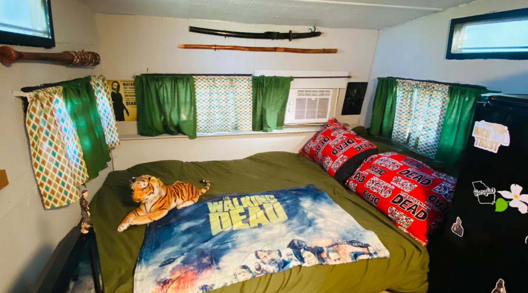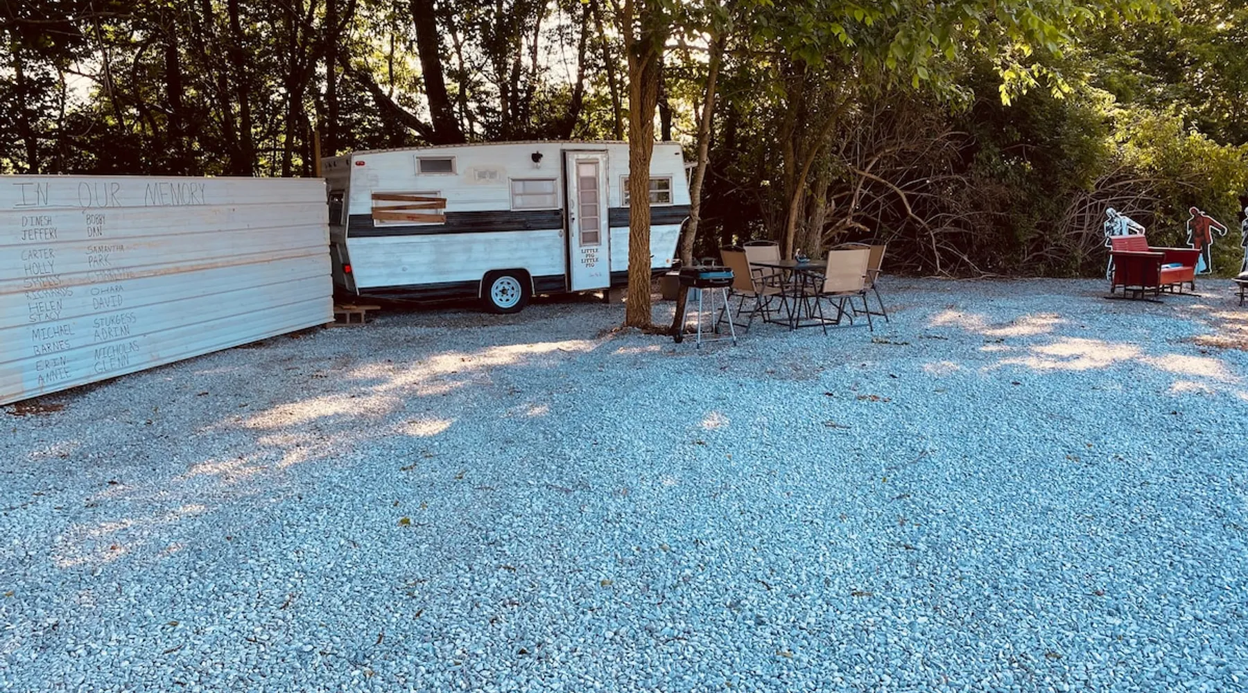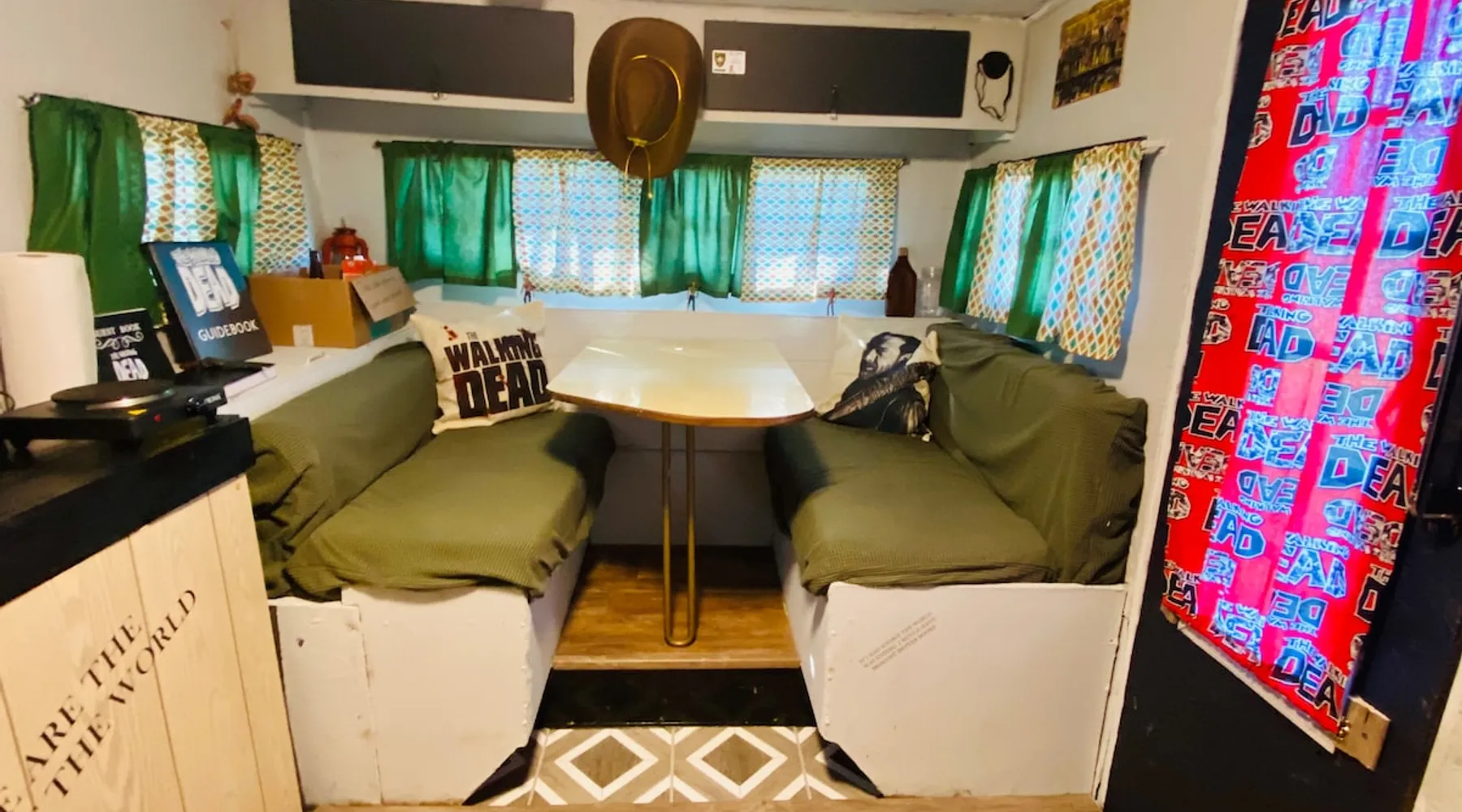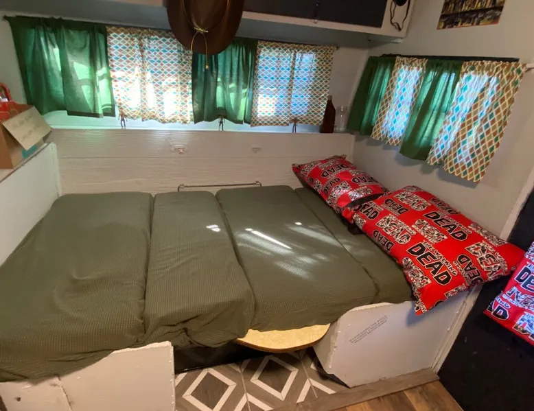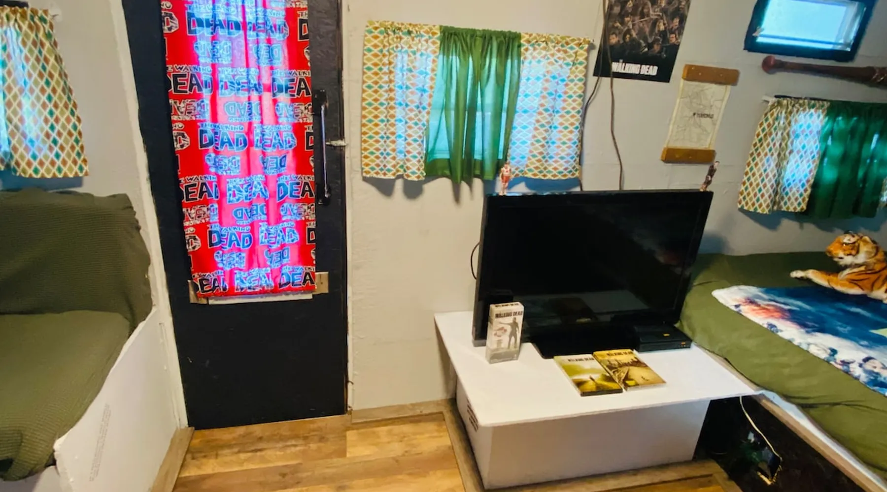 Deciding to stay in this Walking Dead camper is Easy Peasy Lemon Squeezy! Sleeps 4 people with a full-size bed and a table that converts to a bed. Whether you’re a TWD fan or not, I guarantee this will be a unique glamping experience. The camper is decorated with special memorabilia like quotes, tools, walkers, and more! Plenty of photo ops and you can take a selfie with Rick's hat! The space Vintage camper themed with TWD! Sleeps 4 average size adults. Could sleep 5 if 2 adults and one child sleep-in the full-size bed. BEDS: Full size bed with linens and pillows provided & the table converts to a twin bed (shown in pics). Blankets, pillows, and fitted sheet provided. The bed is extremely comfortable, you'll enjoy your time watching TWD on DVD while relaxing. KITCHEN: Coffee pot (bring your own grinds/water), one electric burner, large mini refrigerator, plates, cups, silverware, and a unique Walker's foot faucet (do not drink the water). The camper water is for hand/dish washing. Please remember to bring drinking water, charcoal, and coffee grinds). BATHROOM: The camper does not have a restroom inside. There is a well-maintained portable restroom and a cold-water outdoor shower. OUTSIDE: Table with chairs, charcoal grill (bring your own charcoal), firepit with a glider to sit on. We have provided a tote with $5 in firewood available for your convenience. It can be purchased through money apps or Airbnb. Additional firewood can be purchased upon arrival or any time before your reservation. WHAT WILL YOU SEE? Walkers, herds, gravesite, The Wall, zombie parts, quotes, books, tools, weapons, and so much more. We poured our heart and creativity into this camper! We hope you enjoy it. Want more TWD? It's a short drive to Nic & Norman's in Lexington and then stop by Cynthiana to see TWD Wall. Don't forget to sign the guest book and take a lot of pics to show your friends! Disclosure: Due to some language and gore, this campsite may not be suitable for young kids. Guest access Restroom Shower Other things to note This is a unique Glamping experience, not a hotel! If you’re over 6’ tall, you may have to bend over slightly to walk inside the camper.