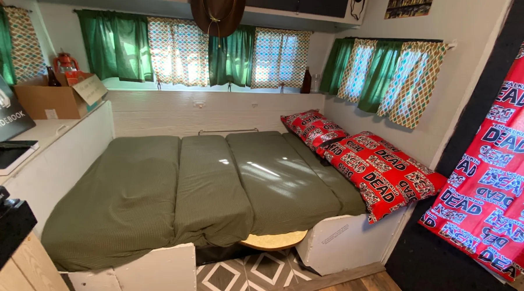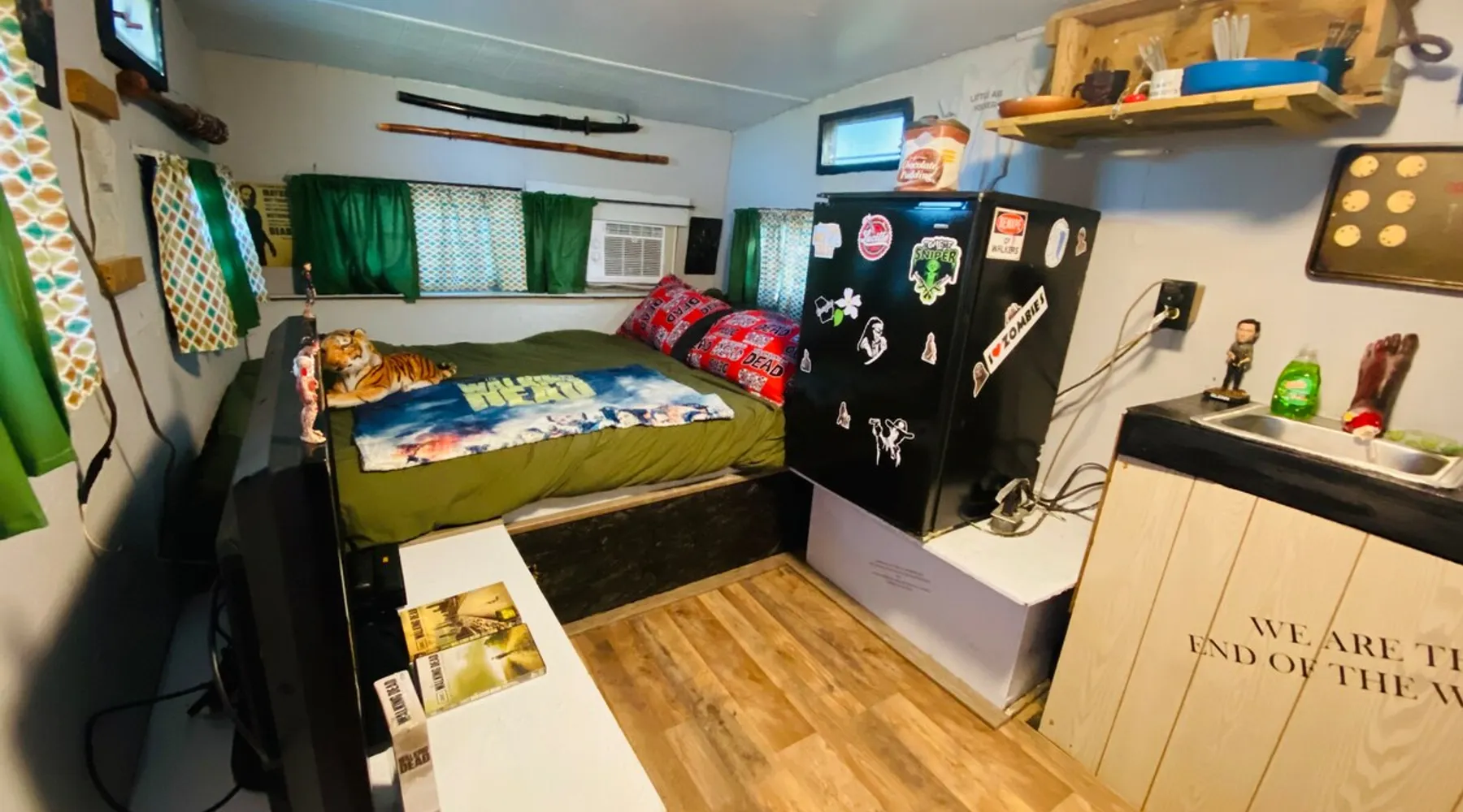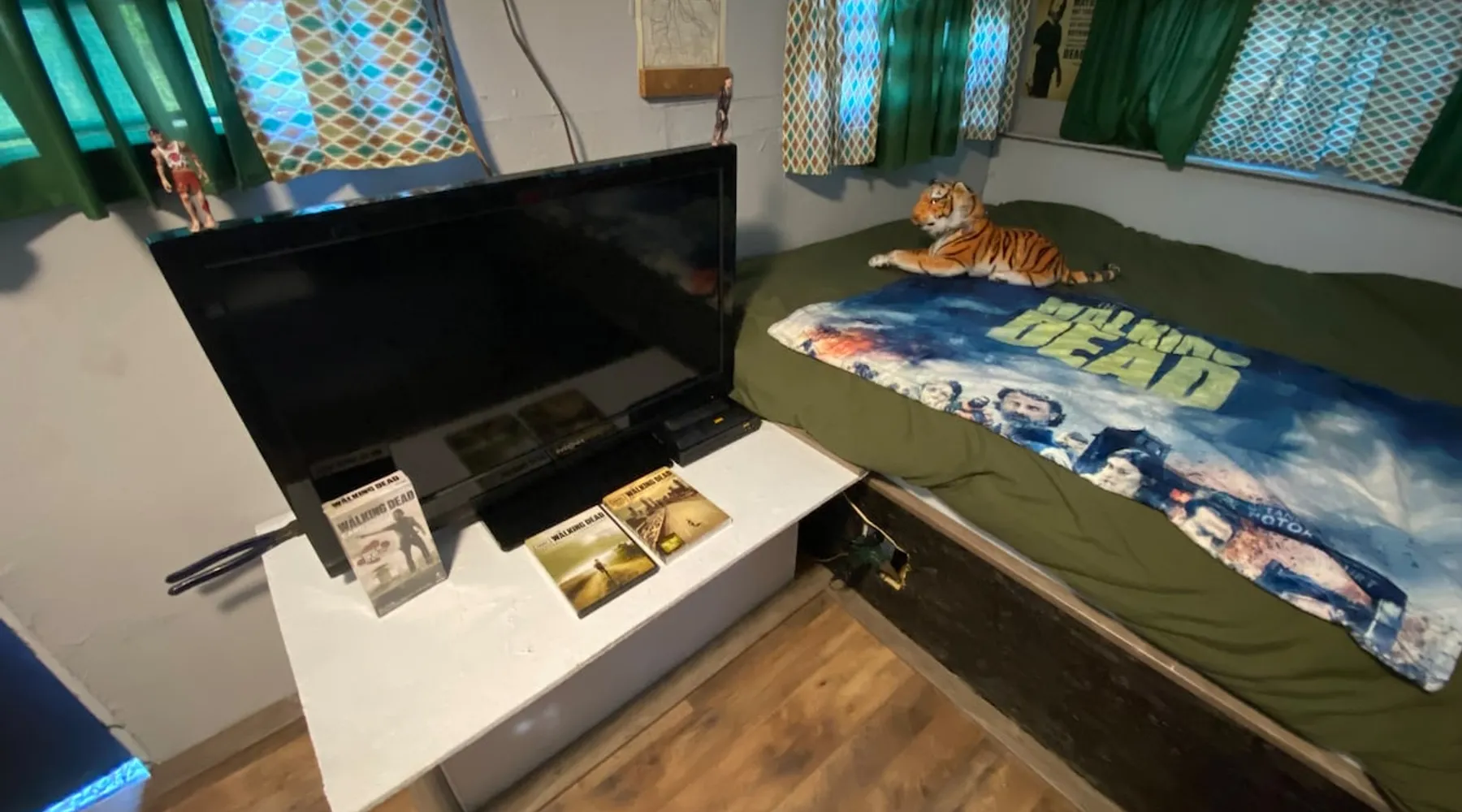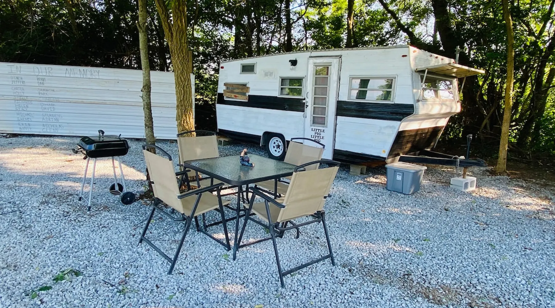 Deciding to stay in this Walking Dead camper is Easy Peasy Lemon Squeezy! Sleeps 4 people with a full-size bed and a table that converts to a bed. Whether you’re a TWD fan or not, I guarantee this will be a unique glamping experience. The camper is decorated with special memorabilia like quotes, tools, walkers, and more! Plenty of photo ops and you can take a selfie with Rick's hat! The space Vintage camper themed with TWD! Sleeps 4 average size adults. Could sleep 5 if 2 adults and one child sleep-in the full-size bed. BEDS: Full size bed with linens and pillows provided & the table converts to a twin bed (shown in pics). Blankets, pillows, and fitted sheet provided. The bed is extremely comfortable, you'll enjoy your time watching TWD on DVD while relaxing. KITCHEN: Coffee pot (bring your own grinds/water), one electric burner, large mini refrigerator, plates, cups, silverware, and a unique Walker's foot faucet (do not drink the water). The camper water is for hand/dish washing. Please remember to bring drinking water, charcoal, and coffee grinds). BATHROOM: The camper does not have a restroom inside. There is a well-maintained portable restroom and a cold-water outdoor shower. OUTSIDE: Table with chairs, charcoal grill (bring your own charcoal), firepit with a glider to sit on. We have provided a tote with $5 in firewood available for your convenience. It can be purchased through money apps or Airbnb. Additional firewood can be purchased upon arrival or any time before your reservation. WHAT WILL YOU SEE? Walkers, herds, gravesite, The Wall, zombie parts, quotes, books, tools, weapons, and so much more. We poured our heart and creativity into this camper! We hope you enjoy it. Want more TWD? It's a short drive to Nic & Norman's in Lexington and then stop by Cynthiana to see TWD Wall. Don't forget to sign the guest book and take a lot of pics to show your friends! Disclosure: Due to some language and gore, this campsite may not be suitable for young kids. Guest access Restroom Shower Other things to note This is a unique Glamping experience, not a hotel! If you’re over 6’ tall, you may have to bend over slightly to walk inside the camper.