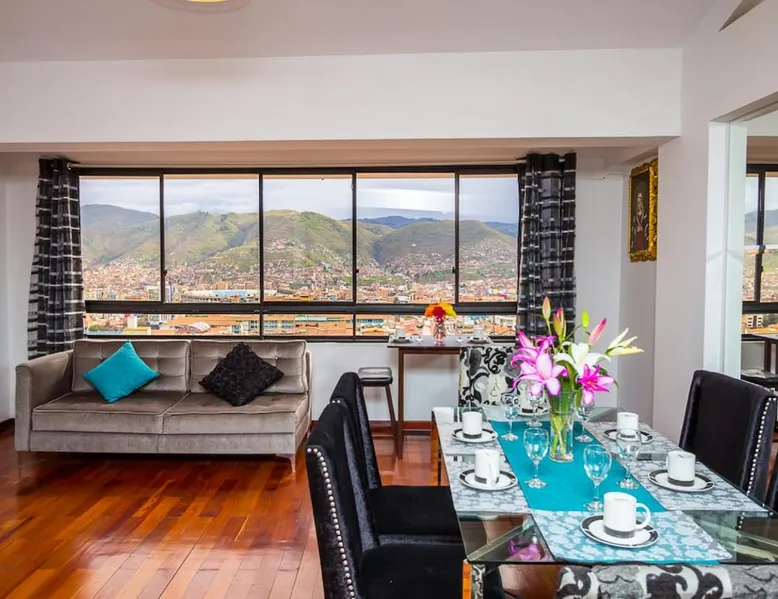 Hotel & Apartments RHD offers recently remodeled apartments. Located in a quiet, residential area of Cusco just 5 minutes from Plaza de Armas. Modern four-bedroom penthouse ideal for large families or group of friends. Includes daily cleaning, breakfast and carport. The space Duplex penthouse of 280m2, quiet, modern, fully equipped and with vintage design. Designed to accommodate a maximum of 10 people, it is perfect for discovering Cusco with family or groups of friends. Dining Room: With the best distribution of space, this apartment offers an extraordinary view of the city. After a long trip, nothing beats enjoying peace of mind. Kitchen: Modern, clean and open with a very wide bar perfect for tasting Peruvian food. 4 bedrooms: - 2 double beds with large beds -2 bedrooms each with two large double beds. Equipped with: closet, hangers, and lockbox (at the request of the guest). Five bathrooms: 4 private bathrooms for each room, 1 additional shared bathroom. They include all toiletries. UTILITIES INCLUDED: - Continental Breakfast - 24-hour front desk - Currency exchange service - Free luggage storage -Wi-Fi internet - Parking ADDITIONAL SERVICES (Additional Fee) - Taxi service Guest access The apartment has its own private kitchen, a dining room, a living room and a terrace. Other things to note Located in a residential, quiet and safe neighborhood just a 12-minute walk from the Plaza de Cusco. We are located a few meters from the Church of La Recoleta and 200 mtr. from the bus stops. The low cost of the taxi makes it the most used mode of transportation by our guests. The cost of the taxi from the Plaza de Armas, usually costs about USD 2.