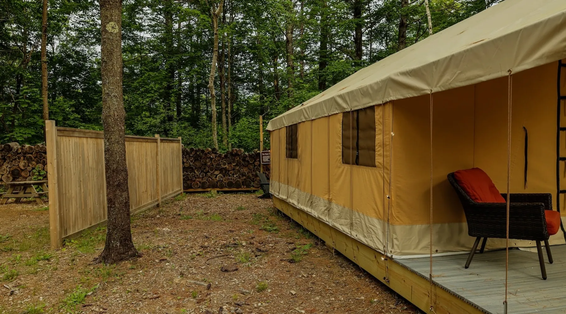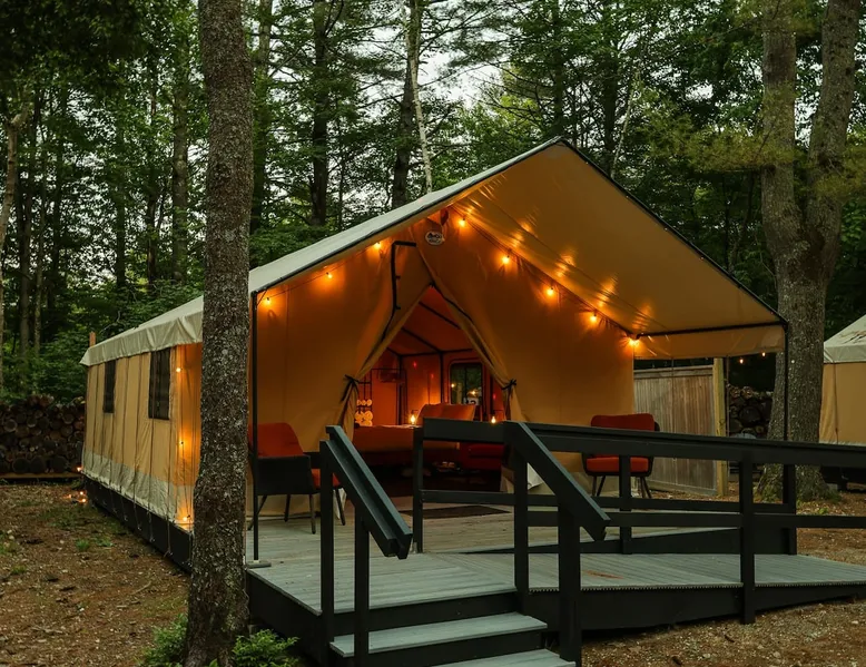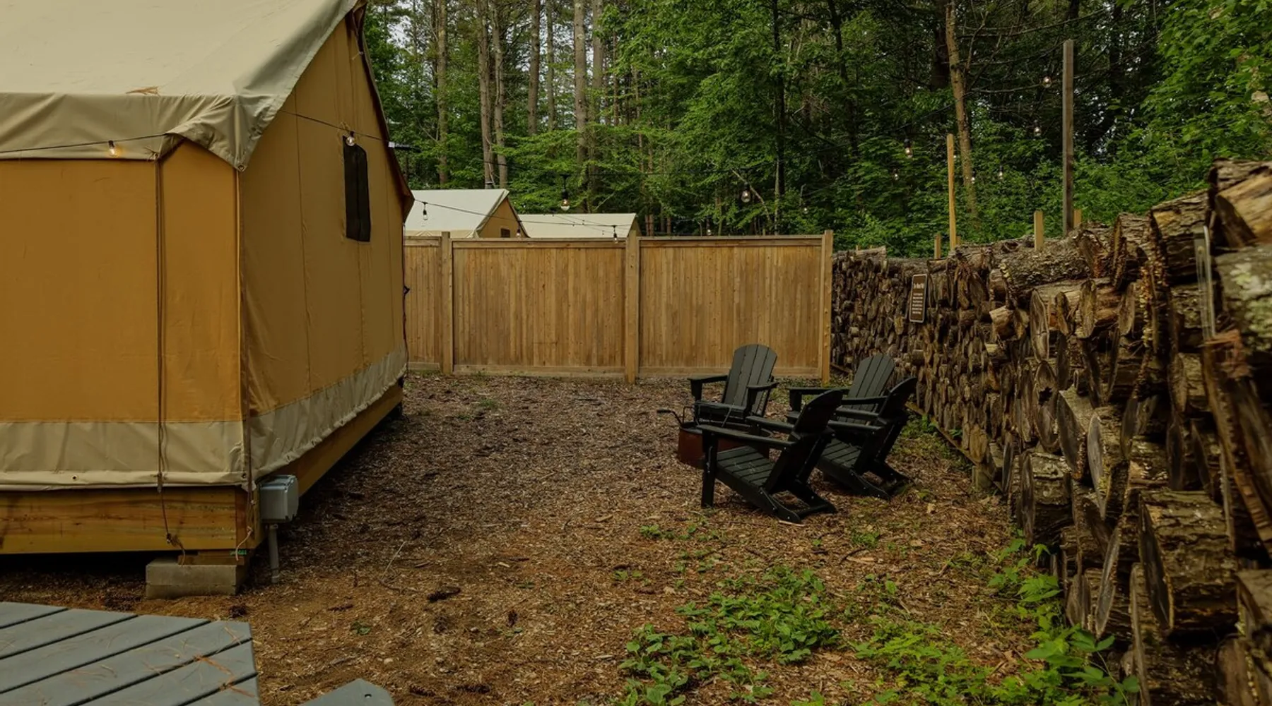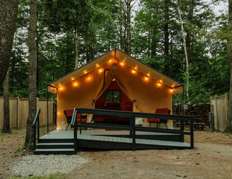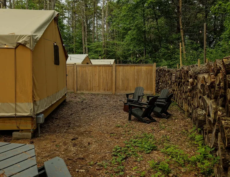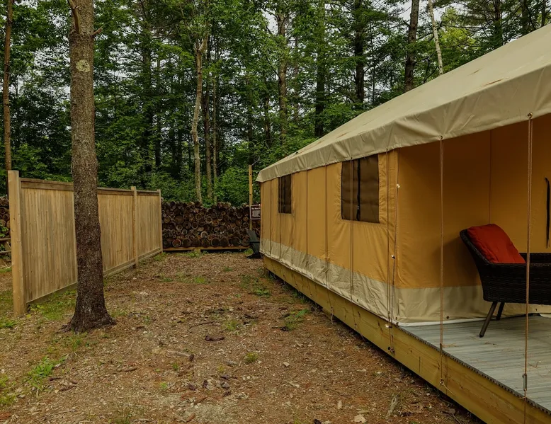 Enjoy a luxury outdoor camping experience like no other! Sleep out in nature in our 16'x20' luxury glamping tent with a queen bed, queen sleeper sofa, and a seating area. Located in a recently renovated luxury campground with tall northern pines all around. It has a front porch with comfy chairs and a charming outdoor seating area with a fire ring, bistro lights, and Adirondack chairs. The space DE “LUXE” CAMPING 🏕️ Spacious 16’x20’ premium canvas tent on a raised platform ☀️ Spacious feel with high ceilings and lots of windows 🛏️ Queen bed with premium linens, quilt/down comforter 🛋️ Ultra comfortable queen sleeper sofa with included linens and pillows 📃 Two twin foam sleeping pads (best for kids) with included linens and pillows 🛋️ 2 cozy chairs inside for reading or relaxing 🏮 Electric heater and heating pad in the bed for colder months 🔥 Cozy wood stove for colder months 👕 Clothes organizer for hanging up your clothes 🟰 Front porch with two comfy chairs AN ENCHANTING SETTING 🌲 Nestled among tranquil northern pines 🔥 Outdoor seating area w/ Adirondack chairs, picnic table, bistro lights, and a fire pit 🐪 Located in a campground on the edge of the dunes of the iconic Desert of Maine ESSENTIALS INCLUDED 🧊 Mini refrigerator for keeping your snacks and drinks chilled ☕ Mini Keurig w/ mugs and assorted coffees, creamers, and sweeteners 🫖 Kettle and assorted teas 💨 Pedestal fan for a gentle breeze to help you sleep 🔌 Plenty of electrical outlets 🇧🇱 Fresh towels for four LUXE AMENITIES 🚽 Short walk away from a gorgeous cedar bath house w/ live edge counters and tile floor 🚿 Individual showers with locking doors and plenty of hot water 🎯 Lawn games like bocce, cornhole, giant Connect 4, and hook & ring ⛳ Walking distance to the Desert of Maine mini golf course 🏜️ Free access to stroll the dunes of the Desert of Maine after hours 🚗 Parking spot right in front the tent CAMP STORE DELIGHTS 🏪 Charming, self-serve Camp Store available 24/7 in the campground 🪵 Firewood, kindling, and matches for making a crackling campfire 🥤 Cold drinks such as water, seltzers, soda, juice boxes, and hot chocolate mix 🍿 Snacks such as Jiffy Pop, s’mores kits, kettle corn, and more 🔋 Essentials such as batteries, toiletries, bug spray, and ice 📼 Microwave available for use – don’t cook fish in it or you will be flogged in public POLICIES 🐕 Dog friendly (registration fee applies, service dogs welcomed for free, max =2) 🐗 Wild boars, hyenas, cats, and other pets not allowed (even if they don't bite) 💤 Quiet hours 10pm to 8am – the crickets should be the loudest sound 🕒 Free early check-in requests; come as soon as your cabin is ready! 🕒 Late checkout until noon available for a small fee 📄 Registration requested (name, email, phone number) ACTIVITIES & ADVENTURES 🏜️ Explore the history, geology, and ecology of the Desert of Maine ⛳ Beat your traveling companion by 20 strokes at mini golf – no mercy 🔥 Unwind, roast marshmallows, read a book by the fire 🏖️ Go to the beach, or the rocky coast – just 10 min from the ocean 🛶 Kayak or canoe through enchanting tidal marshes 🥾 Hike along the ocean or up a mountain 🍺 Sample one of 20+ award-winning breweries nearby 🦞 Eat your way through the best restaurants in Portland 🛍️ Shop at the Freeport outlets or the quirky shops of Old Port WHY STAY ANYWHERE ELSE? Our Luxe tent is luxury camping at its finest. It includes a queen bed, an incredibly comfortable queen sleeper sofa, linens and quilt or down comforter, pillows, two sleeping pads on the floor for kids or hardy adults, fan, coffee/tea, towels, electricity & lights, mini refrigerator, wood stove, clothes organizer, and more. This glamping tent does not have a bathroom but our renovated cedar bath house is just a short walk away (about 300’). This is the nicest campground bathroom you'll ever see, with tiled floors, live edge countertops, and new fixtures everywhere. It actually smells _good_ if you can believe that. And while the bath house is a shared space, don't worry about it being crowded--it gets minimal use because our campground is small and many of our guests will be staying in cabins with their own bathrooms. The bath house has 3 clean, individual showers with gloriously hot water. The tent is located in the recently renovated campground at the Desert of Maine, an iconic tourist attraction established in 1926. The campground is small, quiet, and serene, surrounded by tall northern pines at the edge of the Desert’s rolling sand dunes which were deposited there at the end of the last ice age. The tourist attraction includes fascinating exhibits about the history, ecology, geology of the Desert, activities for kids, a train ride, mini golf, and much more. Campground guests enjoy free access to the dunes after hours, and discounted tickets for mini golf and general admission for daytime visits. Come to the place Where Wanderers Unwind. Guest access You will have the entire glamping tent on a dedicated campsite, all to yourself. In addition, you will have access to our renovated, cedar bath house which is just steps away, with individual showers.