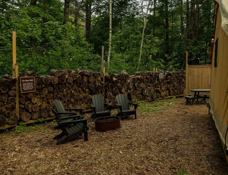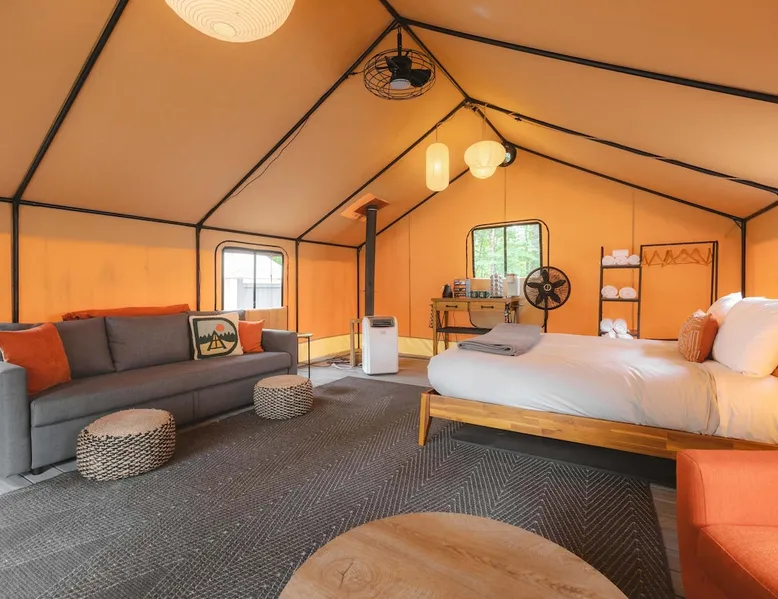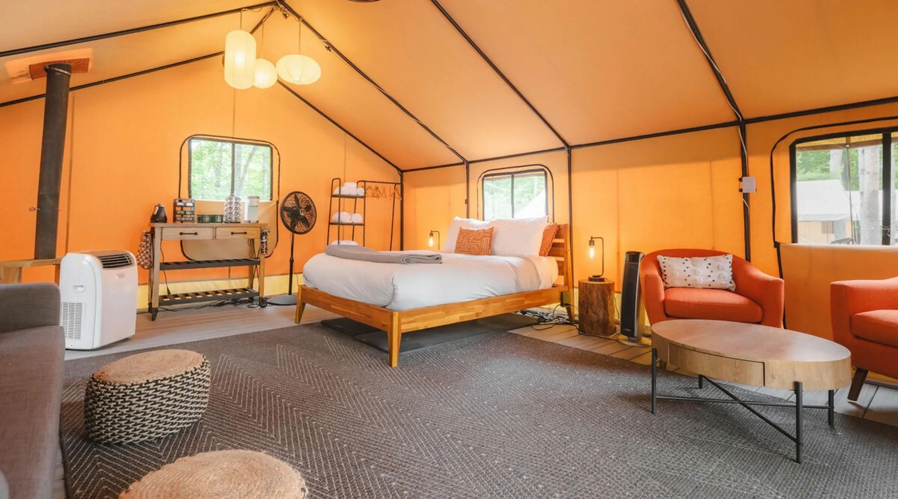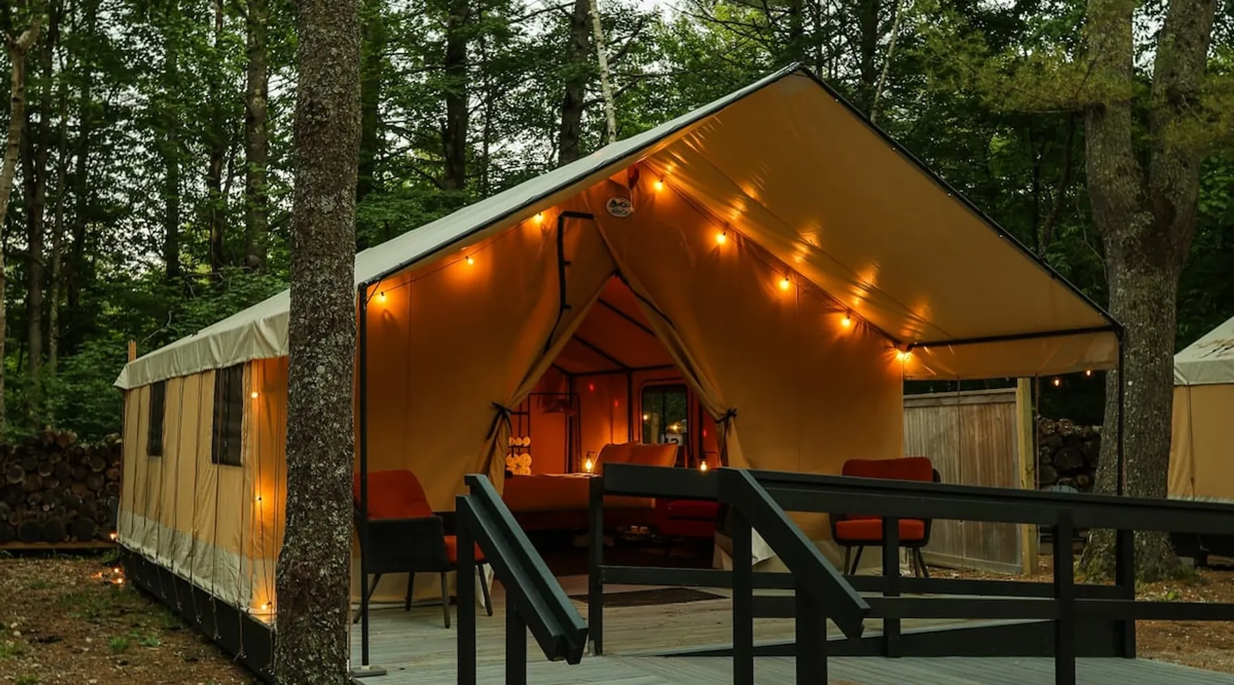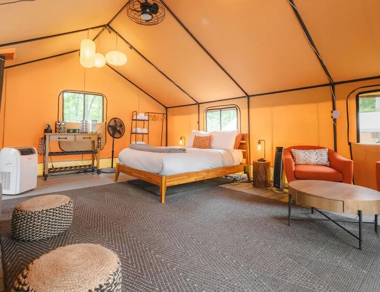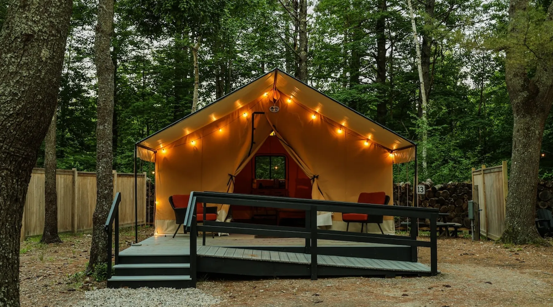 Enjoy a luxury outdoor camping experience like no other! Sleep out in nature in our 16'x20' luxury glamping tent with a queen bed, queen sleeper sofa, and a seating area. Located in a recently renovated luxury campground with tall northern pines all around. It has a front porch with comfy chairs and a charming outdoor seating area with a fire ring, bistro lights, and Adirondack chairs. The space DE “LUXE” CAMPING 🏕️ Spacious 16’x20’ premium canvas tent on a raised platform ☀️ Spacious feel with high ceilings and lots of windows 🛏️ Queen bed with premium linens, quilt/down comforter 🛋️ Ultra comfortable queen sleeper sofa with included linens and pillows 📃 Two twin foam sleeping pads (best for kids) with included linens and pillows 🛋️ 2 cozy chairs inside for reading or relaxing 🏮 Electric heater and heating pad in the bed for colder months 🔥 Cozy wood stove for colder months 👕 Clothes organizer for hanging up your clothes 🟰 Front porch with two comfy chairs AN ENCHANTING SETTING 🌲 Nestled among tranquil northern pines 🔥 Outdoor seating area w/ Adirondack chairs, picnic table, bistro lights, and a fire pit 🐪 Located in a campground on the edge of the dunes of the iconic Desert of Maine ESSENTIALS INCLUDED 🧊 Mini refrigerator for keeping your snacks and drinks chilled ☕ Mini Keurig w/ mugs and assorted coffees, creamers, and sweeteners 🫖 Kettle and assorted teas 💨 Pedestal fan for a gentle breeze to help you sleep 🔌 Plenty of electrical outlets 🇧🇱 Fresh towels for four LUXE AMENITIES 🚽 Short walk away from a gorgeous cedar bath house w/ live edge counters and tile floor 🚿 Individual showers with locking doors and plenty of hot water 🎯 Lawn games like bocce, cornhole, giant Connect 4, and hook & ring ⛳ Walking distance to the Desert of Maine mini golf course 🏜️ Free access to stroll the dunes of the Desert of Maine after hours 🚗 Parking spot right in front the tent CAMP STORE DELIGHTS 🏪 Charming, self-serve Camp Store available 24/7 in the campground 🪵 Firewood, kindling, and matches for making a crackling campfire 🥤 Cold drinks such as water, seltzers, soda, juice boxes, and hot chocolate mix 🍿 Snacks such as Jiffy Pop, s’mores kits, kettle corn, and more 🔋 Essentials such as batteries, toiletries, bug spray, and ice 📼 Microwave available for use – don’t cook fish in it or you will be flogged in public POLICIES 🐕 Dog friendly (registration fee applies, service dogs welcomed for free, max =2) 🐗 Wild boars, hyenas, cats, and other pets not allowed (even if they don't bite) 💤 Quiet hours 10pm to 8am – the crickets should be the loudest sound 🕒 Free early check-in requests; come as soon as your cabin is ready! 🕒 Late checkout until noon available for a small fee 📄 Registration requested (name, email, phone number) ACTIVITIES & ADVENTURES 🏜️ Explore the history, geology, and ecology of the Desert of Maine ⛳ Beat your traveling companion by 20 strokes at mini golf – no mercy 🔥 Unwind, roast marshmallows, read a book by the fire 🏖️ Go to the beach, or the rocky coast – just 10 min from the ocean 🛶 Kayak or canoe through enchanting tidal marshes 🥾 Hike along the ocean or up a mountain 🍺 Sample one of 20+ award-winning breweries nearby 🦞 Eat your way through the best restaurants in Portland 🛍️ Shop at the Freeport outlets or the quirky shops of Old Port WHY STAY ANYWHERE ELSE? Our Luxe tent is luxury camping at its finest. It includes a queen bed, an incredibly comfortable queen sleeper sofa, linens and quilt or down comforter, pillows, two sleeping pads on the floor for kids or hardy adults, fan, coffee/tea, towels, electricity & lights, mini refrigerator, wood stove, clothes organizer, and more. This glamping tent does not have a bathroom but our renovated cedar bath house is just a short walk away (about 300’). This is the nicest campground bathroom you'll ever see, with tiled floors, live edge countertops, and new fixtures everywhere. It actually smells _good_ if you can believe that. And while the bath house is a shared space, don't worry about it being crowded--it gets minimal use because our campground is small and many of our guests will be staying in cabins with their own bathrooms. The bath house has 3 clean, individual showers with gloriously hot water. The tent is located in the recently renovated campground at the Desert of Maine, an iconic tourist attraction established in 1926. The campground is small, quiet, and serene, surrounded by tall northern pines at the edge of the Desert’s rolling sand dunes which were deposited there at the end of the last ice age. The tourist attraction includes fascinating exhibits about the history, ecology, geology of the Desert, activities for kids, a train ride, mini golf, and much more. Campground guests enjoy free access to the dunes after hours, and discounted tickets for mini golf and general admission for daytime visits. Come to the place Where Wanderers Unwind. Guest access You will have the entire glamping tent on a dedicated campsite, all to yourself. In addition, you will have access to our renovated, cedar bath house which is just steps away, with individual showers.