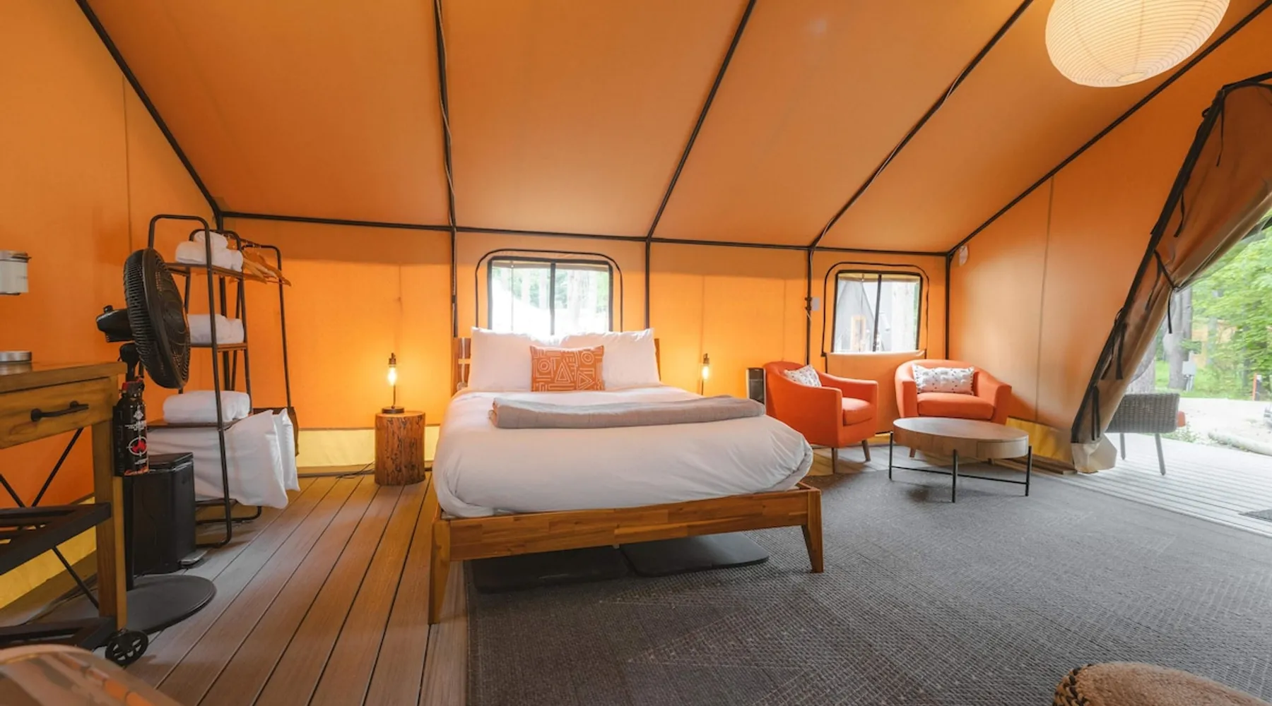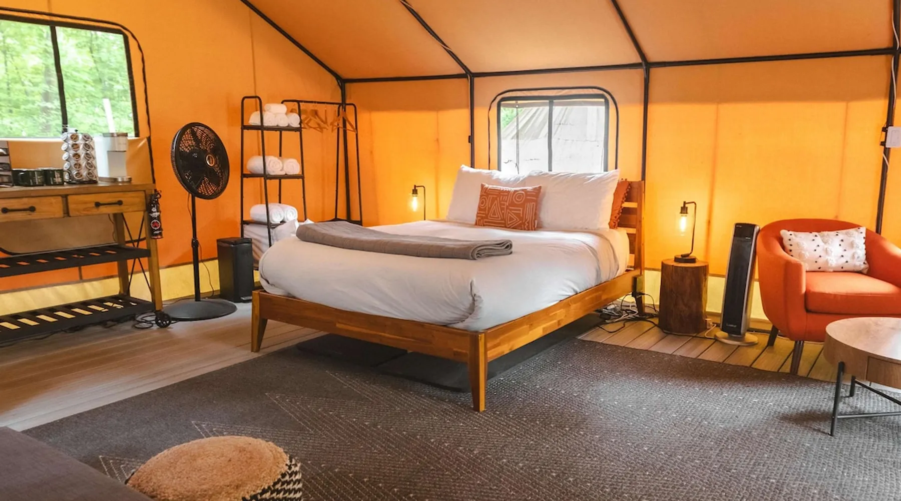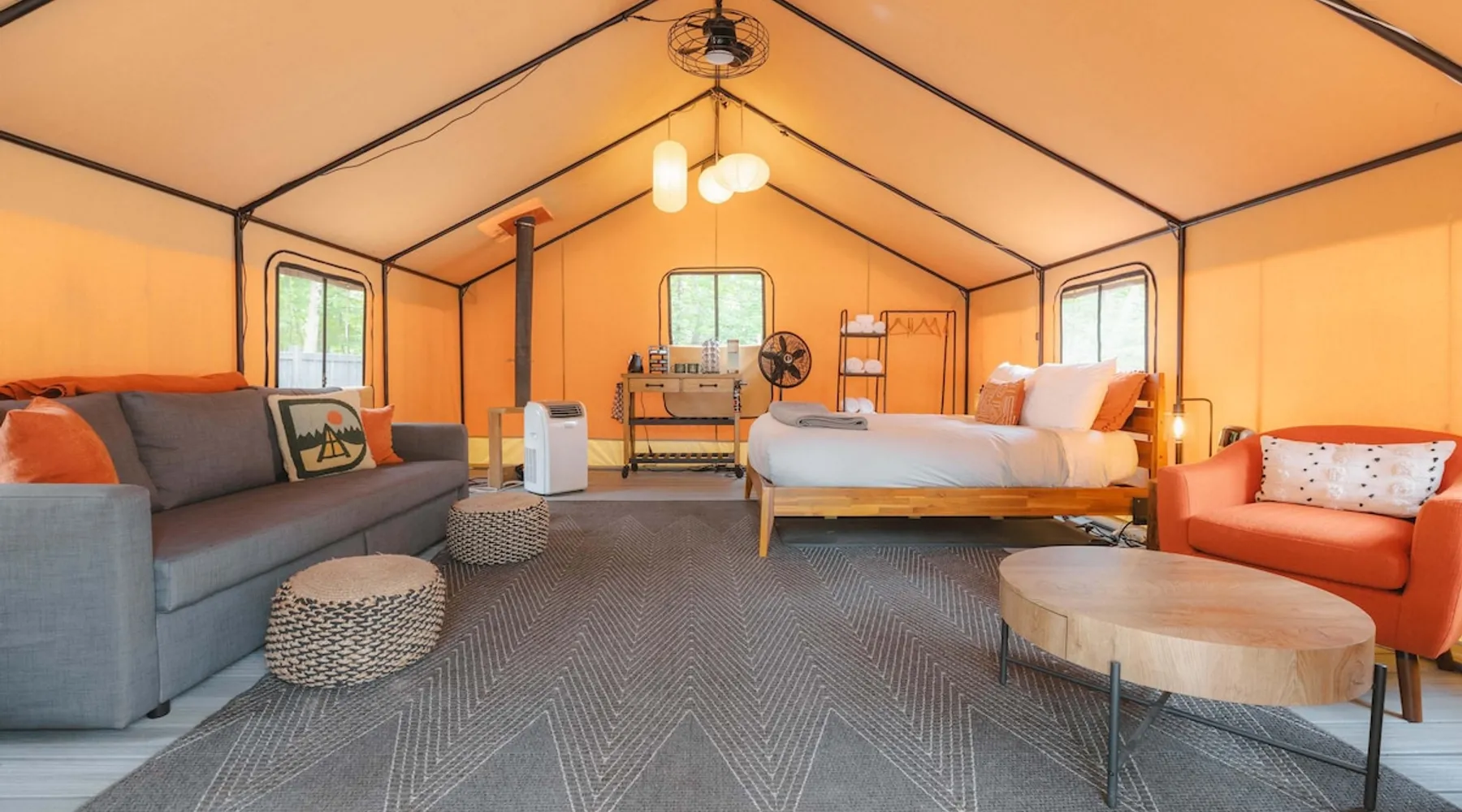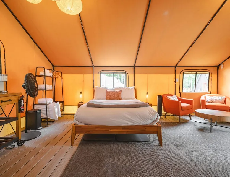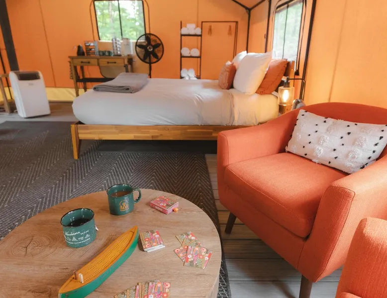 Enjoy a luxury outdoor camping experience like no other! Sleep out in nature in our 16'x20' luxury glamping tent with a queen bed, queen sleeper sofa, and a seating area. Located in a recently renovated luxury campground with tall northern pines all around. It has a front porch with comfy chairs and a charming outdoor seating area with a fire ring, bistro lights, and Adirondack chairs. The space DE “LUXE” CAMPING 🏕️ Spacious 16’x20’ premium canvas tent on a raised platform ☀️ Spacious feel with high ceilings and lots of windows 🛏️ Queen bed with premium linens, quilt/down comforter 🛋️ Ultra comfortable queen sleeper sofa with included linens and pillows 📃 Two twin foam sleeping pads (best for kids) with included linens and pillows 🛋️ 2 cozy chairs inside for reading or relaxing 🏮 Electric heater and heating pad in the bed for colder months 🔥 Cozy wood stove for colder months 👕 Clothes organizer for hanging up your clothes 🟰 Front porch with two comfy chairs AN ENCHANTING SETTING 🌲 Nestled among tranquil northern pines 🔥 Outdoor seating area w/ Adirondack chairs, picnic table, bistro lights, and a fire pit 🐪 Located in a campground on the edge of the dunes of the iconic Desert of Maine ESSENTIALS INCLUDED 🧊 Mini refrigerator for keeping your snacks and drinks chilled ☕ Mini Keurig w/ mugs and assorted coffees, creamers, and sweeteners 🫖 Kettle and assorted teas 💨 Pedestal fan for a gentle breeze to help you sleep 🔌 Plenty of electrical outlets 🇧🇱 Fresh towels for four LUXE AMENITIES 🚽 Short walk away from a gorgeous cedar bath house w/ live edge counters and tile floor 🚿 Individual showers with locking doors and plenty of hot water 🎯 Lawn games like bocce, cornhole, giant Connect 4, and hook & ring ⛳ Walking distance to the Desert of Maine mini golf course 🏜️ Free access to stroll the dunes of the Desert of Maine after hours 🚗 Parking spot right in front the tent CAMP STORE DELIGHTS 🏪 Charming, self-serve Camp Store available 24/7 in the campground 🪵 Firewood, kindling, and matches for making a crackling campfire 🥤 Cold drinks such as water, seltzers, soda, juice boxes, and hot chocolate mix 🍿 Snacks such as Jiffy Pop, s’mores kits, kettle corn, and more 🔋 Essentials such as batteries, toiletries, bug spray, and ice 📼 Microwave available for use – don’t cook fish in it or you will be flogged in public POLICIES 🐕 Dog friendly (registration fee applies, service dogs welcomed for free, max =2) 🐗 Wild boars, hyenas, cats, and other pets not allowed (even if they don't bite) 💤 Quiet hours 10pm to 8am – the crickets should be the loudest sound 🕒 Free early check-in requests; come as soon as your cabin is ready! 🕒 Late checkout until noon available for a small fee 📄 Registration requested (name, email, phone number) ACTIVITIES & ADVENTURES 🏜️ Explore the history, geology, and ecology of the Desert of Maine ⛳ Beat your traveling companion by 20 strokes at mini golf – no mercy 🔥 Unwind, roast marshmallows, read a book by the fire 🏖️ Go to the beach, or the rocky coast – just 10 min from the ocean 🛶 Kayak or canoe through enchanting tidal marshes 🥾 Hike along the ocean or up a mountain 🍺 Sample one of 20+ award-winning breweries nearby 🦞 Eat your way through the best restaurants in Portland 🛍️ Shop at the Freeport outlets or the quirky shops of Old Port WHY STAY ANYWHERE ELSE? Our Luxe tent is luxury camping at its finest. It includes a queen bed, an incredibly comfortable queen sleeper sofa, linens and quilt or down comforter, pillows, two sleeping pads on the floor for kids or hardy adults, fan, coffee/tea, towels, electricity & lights, mini refrigerator, wood stove, clothes organizer, and more. This glamping tent does not have a bathroom but our renovated cedar bath house is just a short walk away (about 300’). This is the nicest campground bathroom you'll ever see, with tiled floors, live edge countertops, and new fixtures everywhere. It actually smells _good_ if you can believe that. And while the bath house is a shared space, don't worry about it being crowded--it gets minimal use because our campground is small and many of our guests will be staying in cabins with their own bathrooms. The bath house has 3 clean, individual showers with gloriously hot water. The tent is located in the recently renovated campground at the Desert of Maine, an iconic tourist attraction established in 1926. The campground is small, quiet, and serene, surrounded by tall northern pines at the edge of the Desert’s rolling sand dunes which were deposited there at the end of the last ice age. The tourist attraction includes fascinating exhibits about the history, ecology, geology of the Desert, activities for kids, a train ride, mini golf, and much more. Campground guests enjoy free access to the dunes after hours, and discounted tickets for mini golf and general admission for daytime visits. Come to the place Where Wanderers Unwind. Guest access You will have the entire glamping tent on a dedicated campsite, all to yourself. In addition, you will have access to our renovated, cedar bath house which is just steps away, with individual showers.