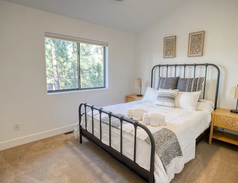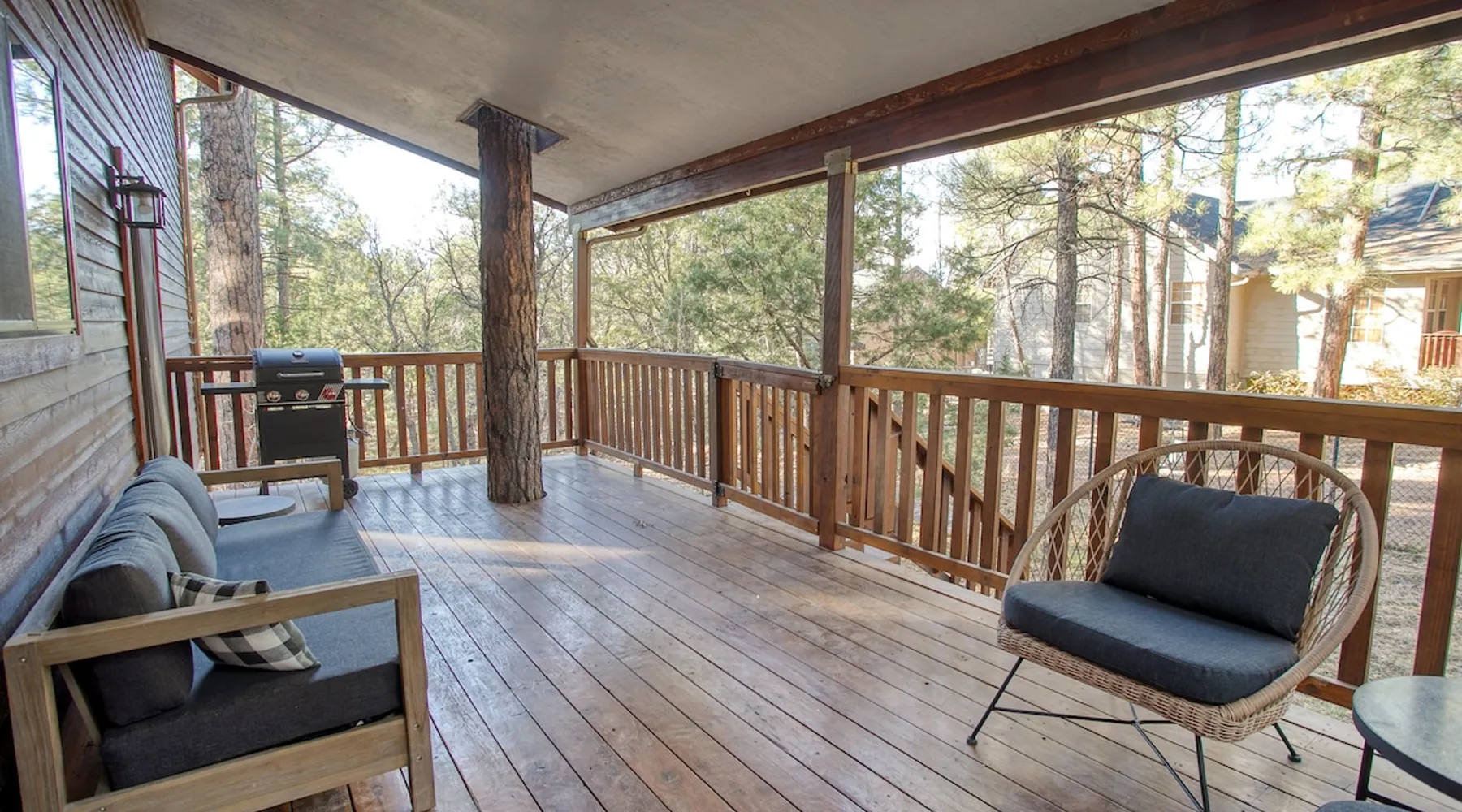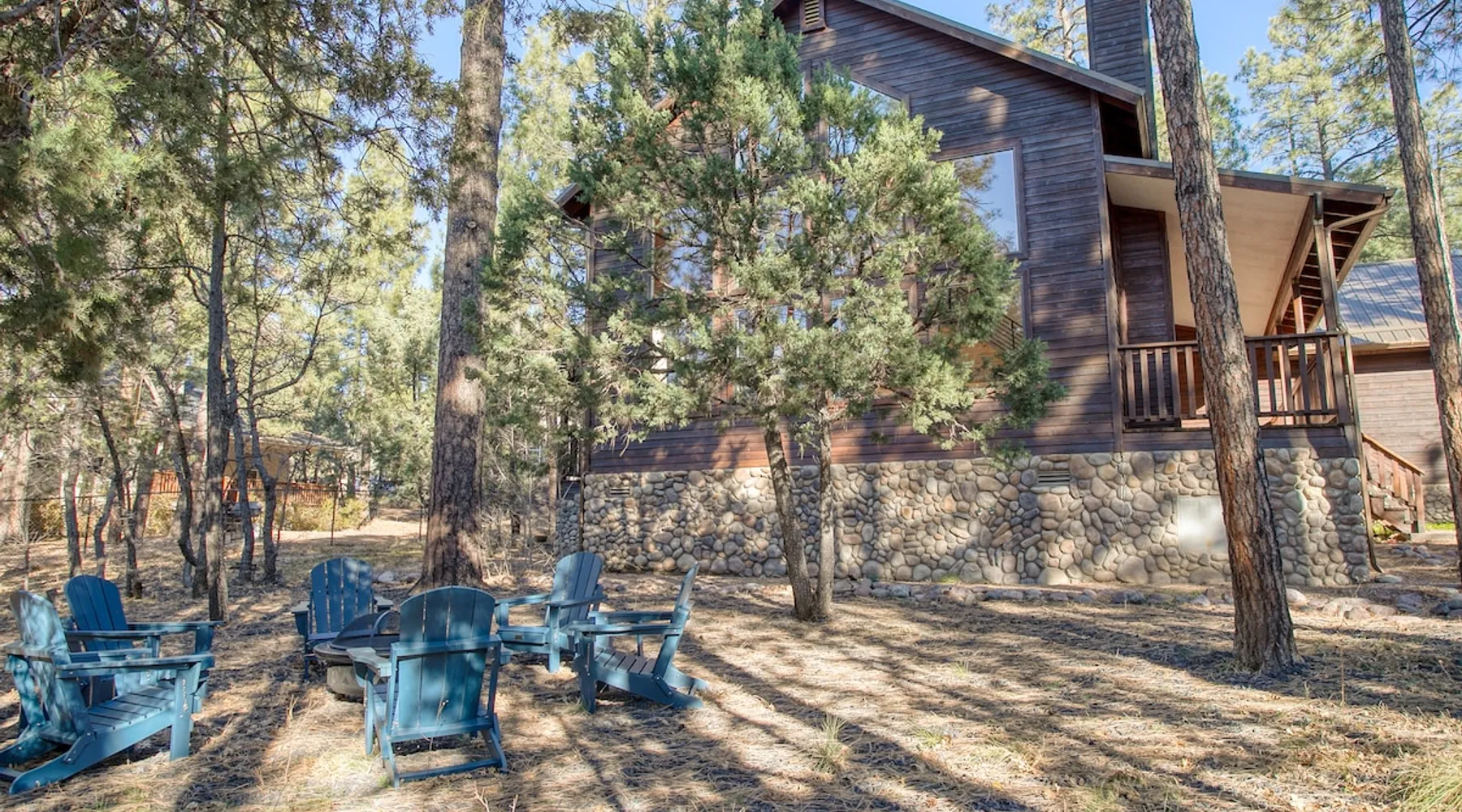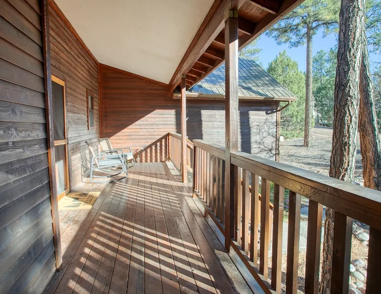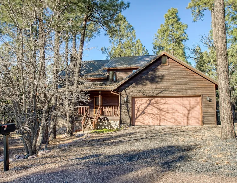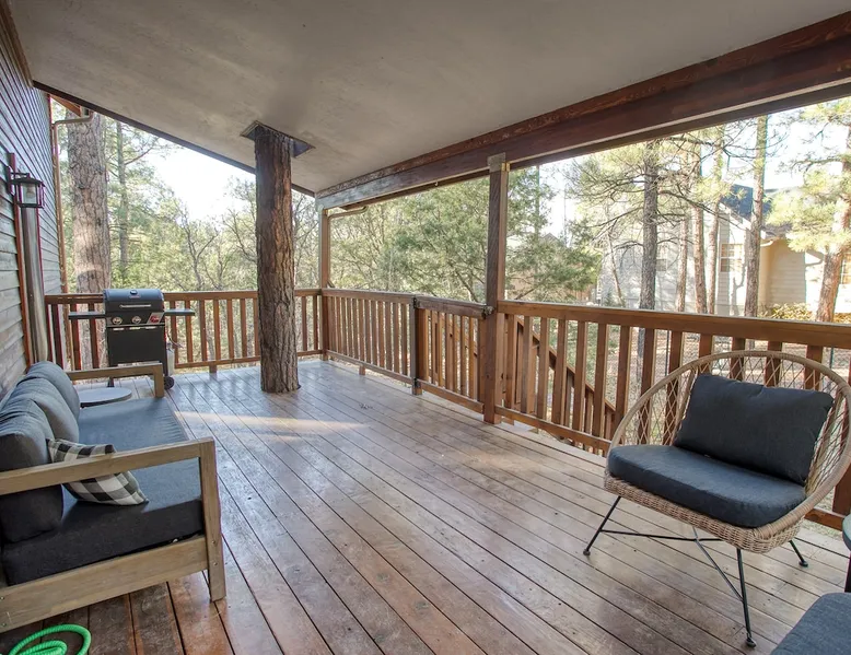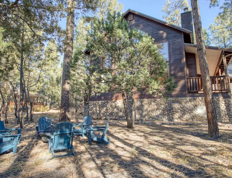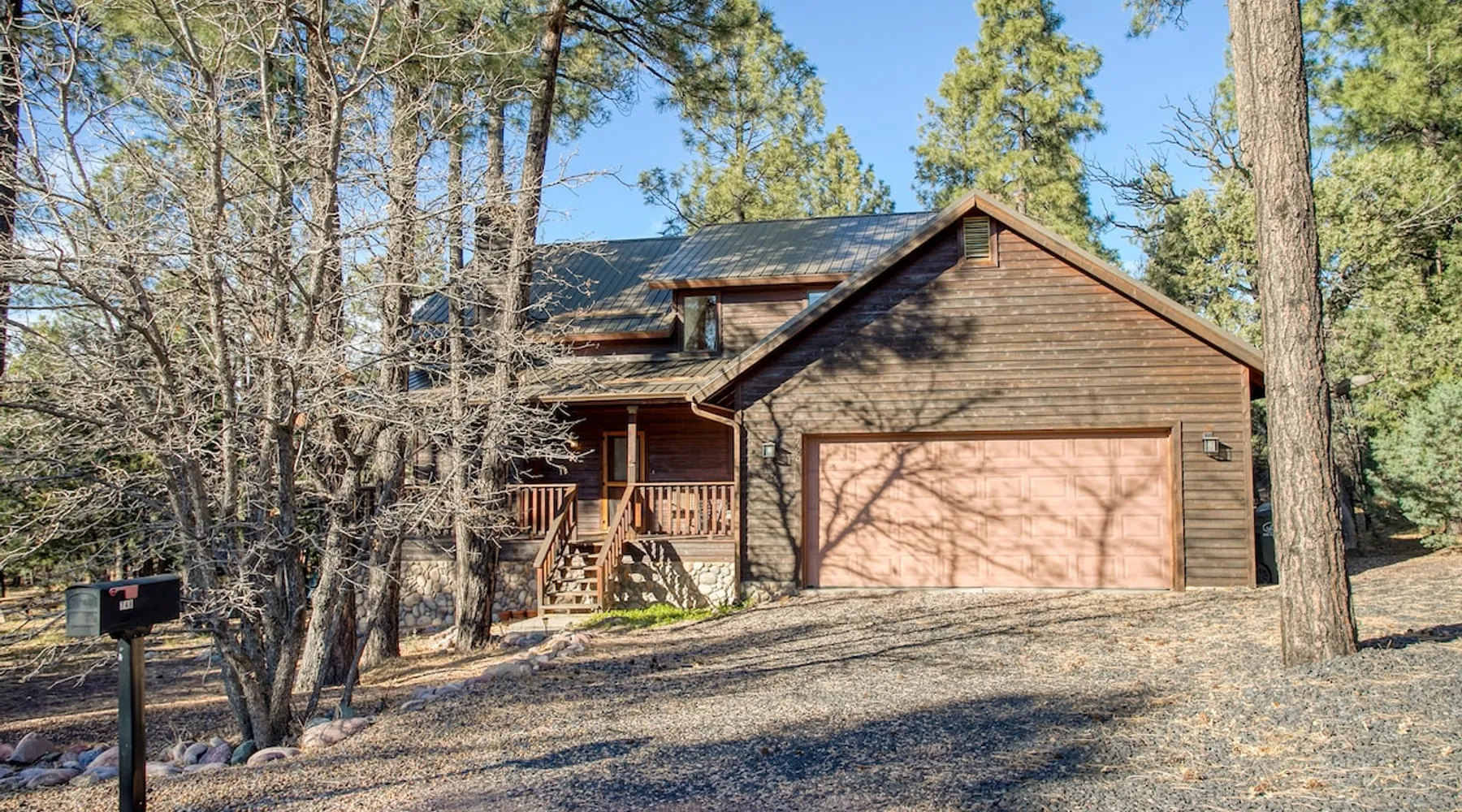 Welcome to Pinetop!!! This beautiful 3-bedroom, 2.5 bathroom retreat is nestled in the scenic community of Pine Top. This home features it all – central heating and A/C, a fully stocked kitchen, BBQ, fire pit and a garage filled with tons of games! This newly renovated cabin sleeps 10 people comfortably. The cabin is close to cafes, restaurants, local shopping, and many other wonderful attractions! See the full description for more. The space The cabin has 2 levels. The main level of the home features a large and spacious living room with 2 couches, 2 chairs and is equipped with a smart TV. The kitchen is fully stocked for all your cooking and baking needs, and a 6-foot dining table with 8 chairs for fun family dinners and game nights! The main level also features the primary bedroom which has a king bed, 2 nightstands, a 50” smart tv, a dresser for storage, and an en-suite bathroom. The bathroom features a double vanity, oversized shower and walk in closet. The upper level of the home features two additional bedrooms and a full-size bathroom with a shower/tub combo. The 2nd bedroom has a queen beds, 2 nightstands and a 50” smart TV. The 3rd bedroom has 2 sets of bunk (stacked 3 high) and sleeps 6 people!!! For guests that plan to have longer stays, there is a full-size washer and dryer available for use. The laundry room is located inside the home with a door leading in/out of the two-car garage. The home features a beautiful outdoor deck. The is located off the dining room and comes complete with patio furniture and a BBQ. The firepit is located on the left side of the property and is equipped with lounge chairs for relaxing evenings and smores nights. This home is also equipped with high-speed internet! The WIFI password will be posted in many areas throughout the home. Guest access Guests will use the outdoor staircase which leads to the front door which enters into the main living area. The front door has a smart lock on the handle and you will be provided a personalized door code to use to access/enter the home curing your stay. You may park your vehicles in the dedicated property driveway. Other things to note This mountain oasis is close to so many other attractions such as Sunrise Park Resort, Pinetop Lakes Public Golf Course, white mountain family fun park, Horseback riding stables, and so many other restaurants, shops and cafes. Winter weather may bring snow. Please note that we do not accept any liability if you’re snowed in/out, experience loss of power, road closures, or other issues out of the host's control. Power outages may happen due to weather, utilities shut off, etc. If you book the cabin you are accepting these possibilities and will not receive a refund. We recommend all guests get their own trip insurance if you are concerned about these possibilities. We also recommend all guests carry chains in the winter. Please note that snow is not removed from the property by the hosts. However, shovels are provided for guests.