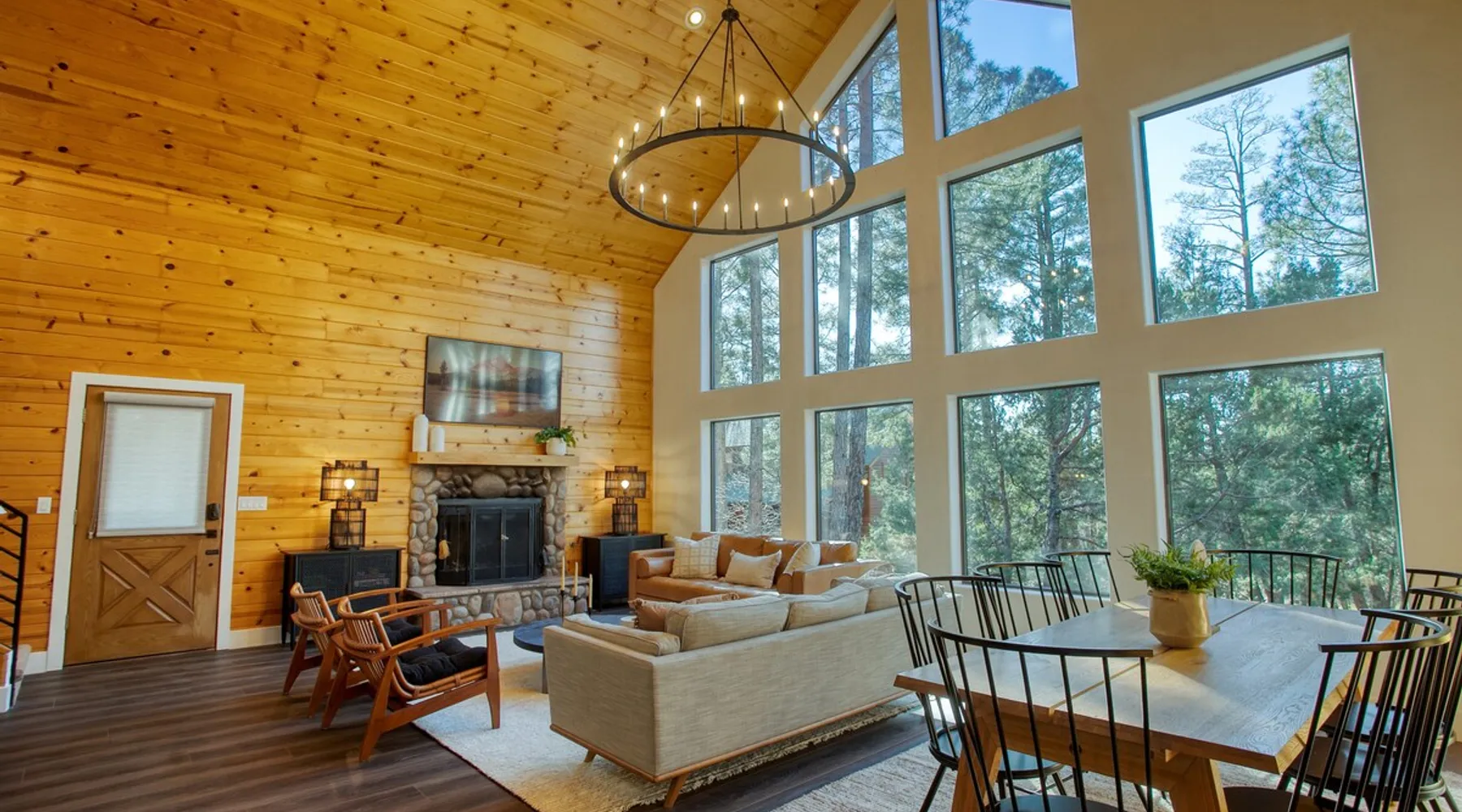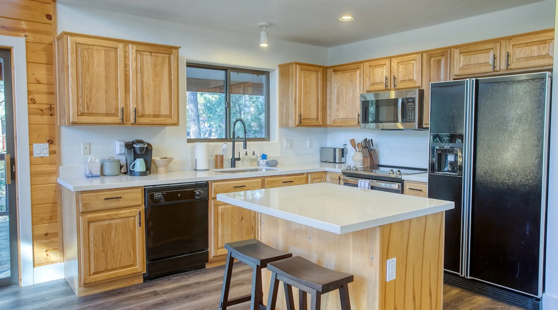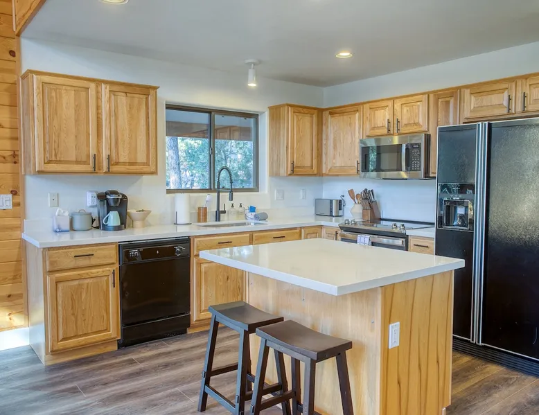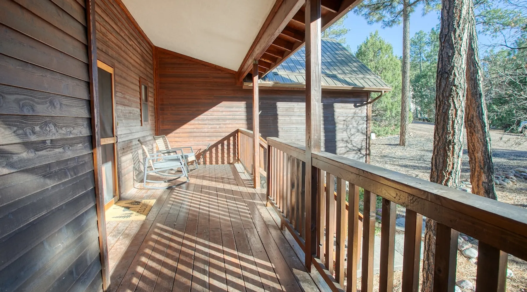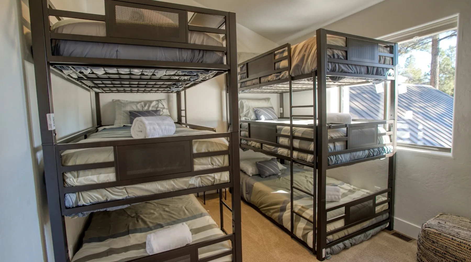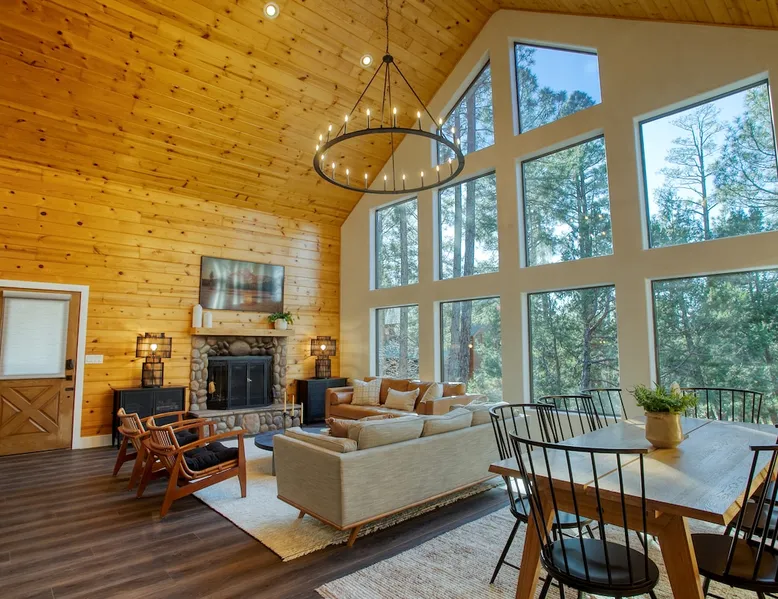 Welcome to Pinetop!!! This beautiful 3-bedroom, 2.5 bathroom retreat is nestled in the scenic community of Pine Top. This home features it all – central heating and A/C, a fully stocked kitchen, BBQ, fire pit and a garage filled with tons of games! This newly renovated cabin sleeps 10 people comfortably. The cabin is close to cafes, restaurants, local shopping, and many other wonderful attractions! See the full description for more. The space The cabin has 2 levels. The main level of the home features a large and spacious living room with 2 couches, 2 chairs and is equipped with a smart TV. The kitchen is fully stocked for all your cooking and baking needs, and a 6-foot dining table with 8 chairs for fun family dinners and game nights! The main level also features the primary bedroom which has a king bed, 2 nightstands, a 50” smart tv, a dresser for storage, and an en-suite bathroom. The bathroom features a double vanity, oversized shower and walk in closet. The upper level of the home features two additional bedrooms and a full-size bathroom with a shower/tub combo. The 2nd bedroom has a queen beds, 2 nightstands and a 50” smart TV. The 3rd bedroom has 2 sets of bunk (stacked 3 high) and sleeps 6 people!!! For guests that plan to have longer stays, there is a full-size washer and dryer available for use. The laundry room is located inside the home with a door leading in/out of the two-car garage. The home features a beautiful outdoor deck. The is located off the dining room and comes complete with patio furniture and a BBQ. The firepit is located on the left side of the property and is equipped with lounge chairs for relaxing evenings and smores nights. This home is also equipped with high-speed internet! The WIFI password will be posted in many areas throughout the home. Guest access Guests will use the outdoor staircase which leads to the front door which enters into the main living area. The front door has a smart lock on the handle and you will be provided a personalized door code to use to access/enter the home curing your stay. You may park your vehicles in the dedicated property driveway. Other things to note This mountain oasis is close to so many other attractions such as Sunrise Park Resort, Pinetop Lakes Public Golf Course, white mountain family fun park, Horseback riding stables, and so many other restaurants, shops and cafes. Winter weather may bring snow. Please note that we do not accept any liability if you’re snowed in/out, experience loss of power, road closures, or other issues out of the host's control. Power outages may happen due to weather, utilities shut off, etc. If you book the cabin you are accepting these possibilities and will not receive a refund. We recommend all guests get their own trip insurance if you are concerned about these possibilities. We also recommend all guests carry chains in the winter. Please note that snow is not removed from the property by the hosts. However, shovels are provided for guests.