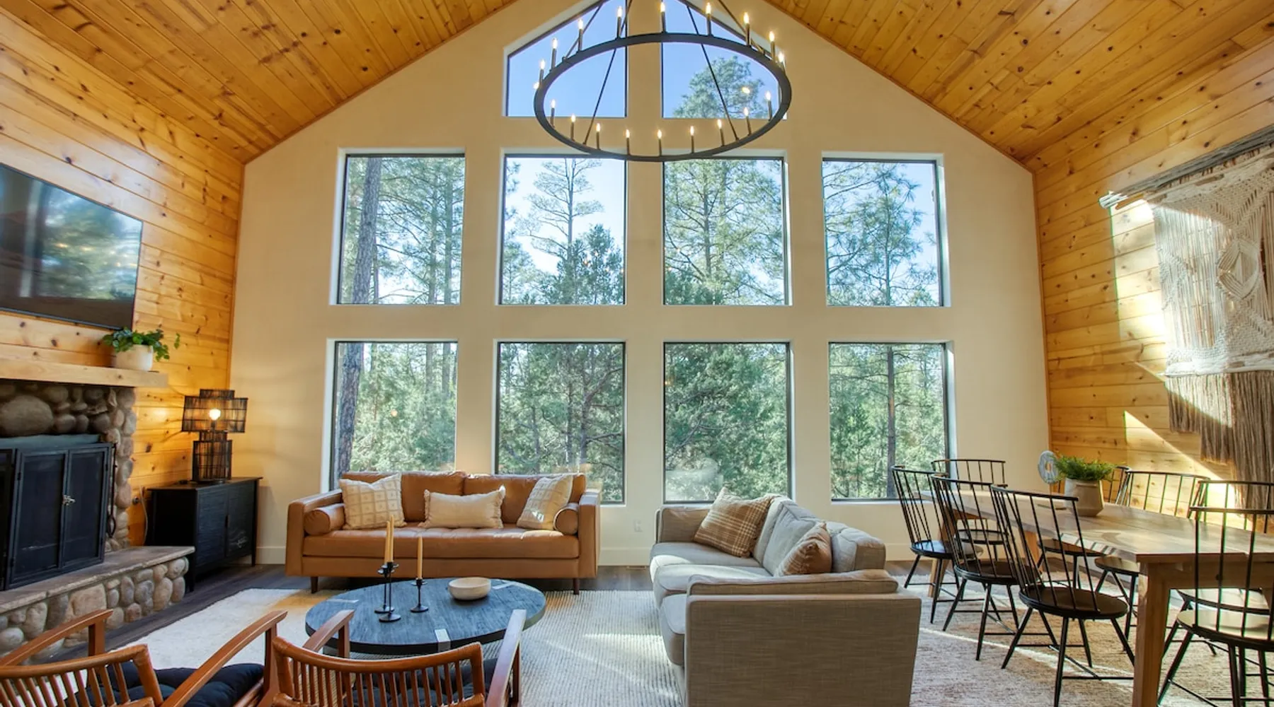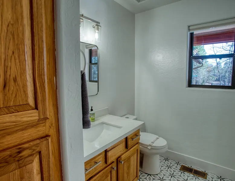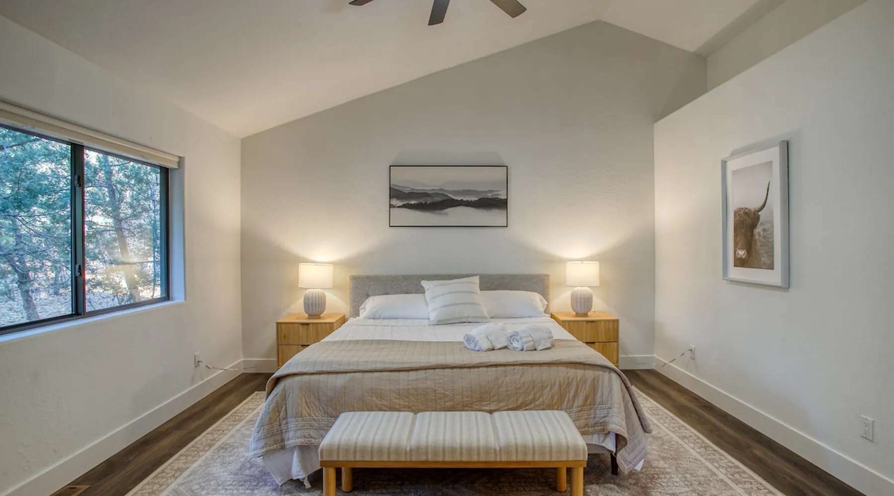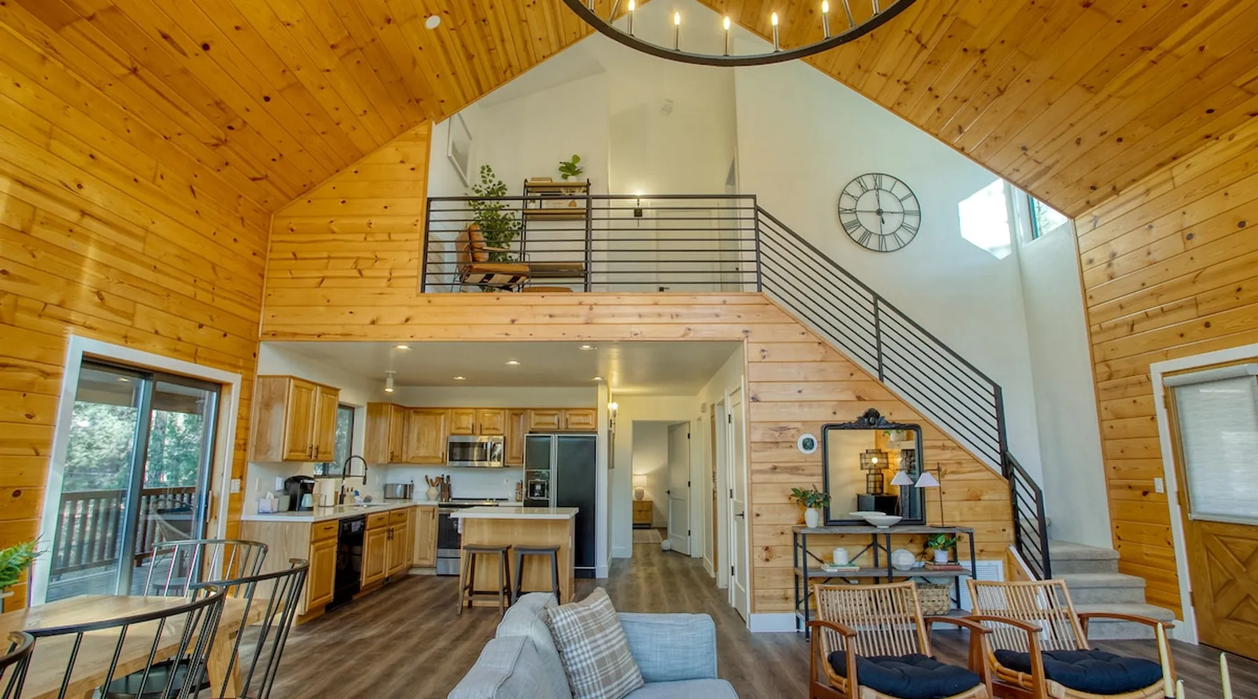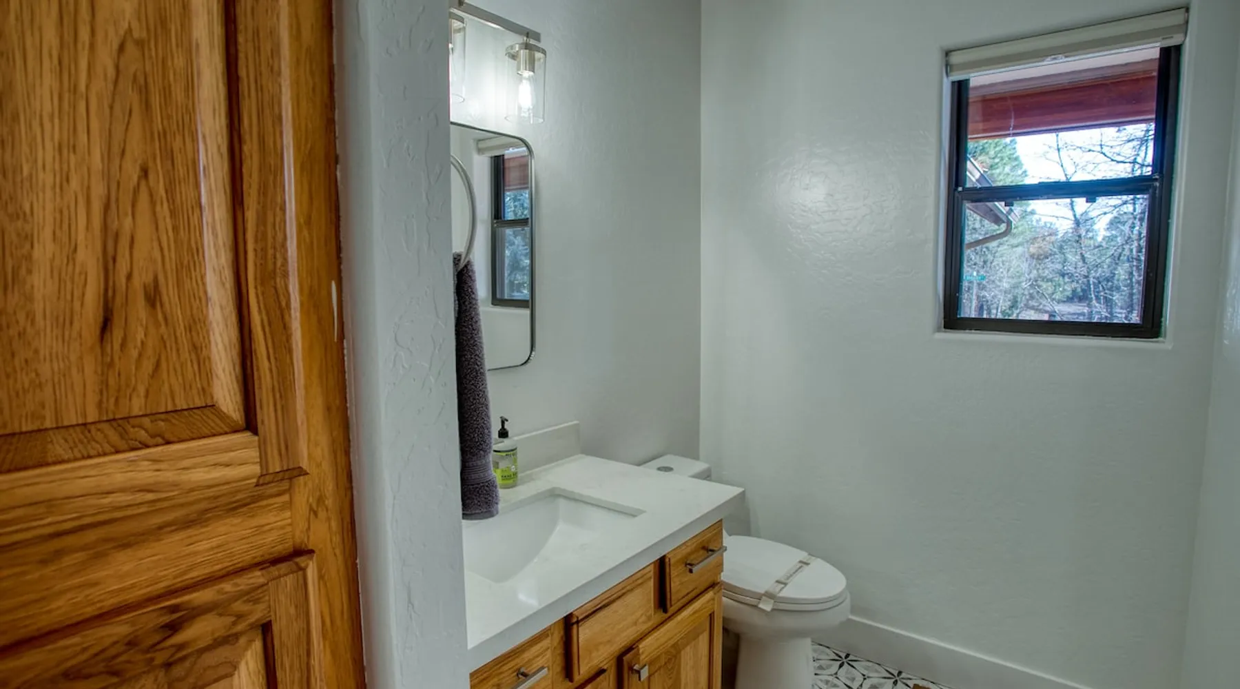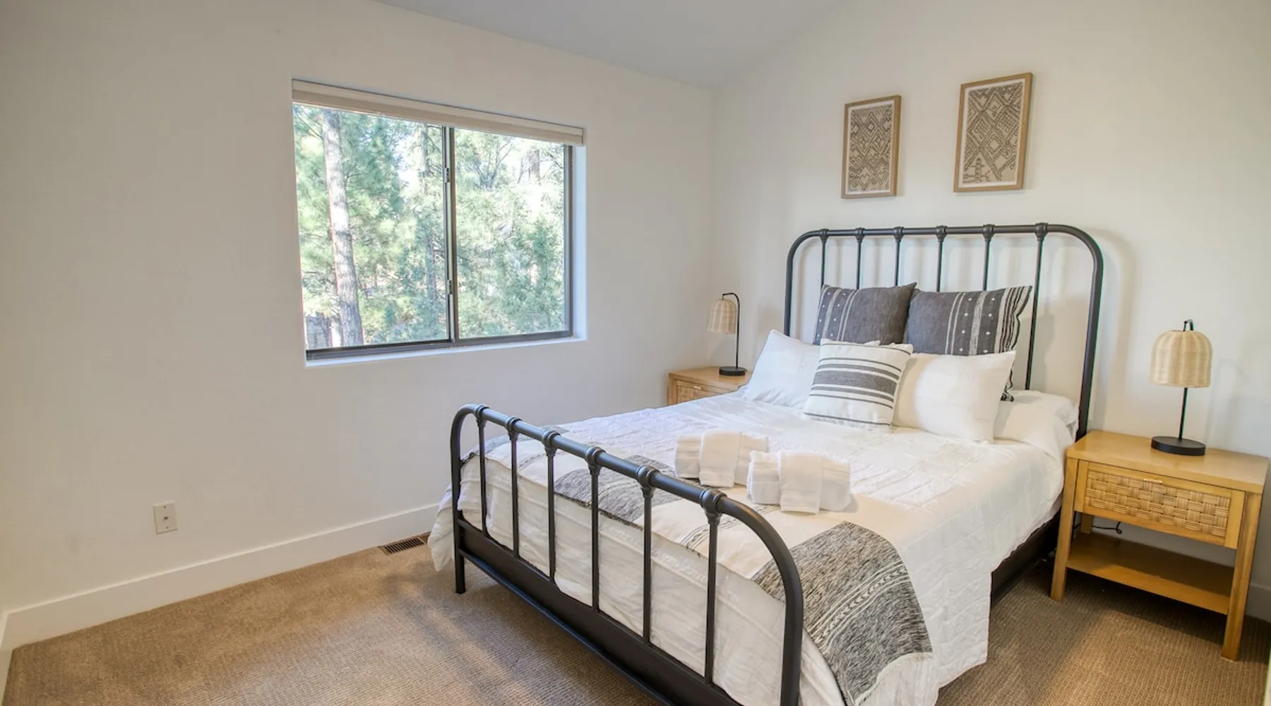 Welcome to Pinetop!!! This beautiful 3-bedroom, 2.5 bathroom retreat is nestled in the scenic community of Pine Top. This home features it all – central heating and A/C, a fully stocked kitchen, BBQ, fire pit and a garage filled with tons of games! This newly renovated cabin sleeps 10 people comfortably. The cabin is close to cafes, restaurants, local shopping, and many other wonderful attractions! See the full description for more. The space The cabin has 2 levels. The main level of the home features a large and spacious living room with 2 couches, 2 chairs and is equipped with a smart TV. The kitchen is fully stocked for all your cooking and baking needs, and a 6-foot dining table with 8 chairs for fun family dinners and game nights! The main level also features the primary bedroom which has a king bed, 2 nightstands, a 50” smart tv, a dresser for storage, and an en-suite bathroom. The bathroom features a double vanity, oversized shower and walk in closet. The upper level of the home features two additional bedrooms and a full-size bathroom with a shower/tub combo. The 2nd bedroom has a queen beds, 2 nightstands and a 50” smart TV. The 3rd bedroom has 2 sets of bunk (stacked 3 high) and sleeps 6 people!!! For guests that plan to have longer stays, there is a full-size washer and dryer available for use. The laundry room is located inside the home with a door leading in/out of the two-car garage. The home features a beautiful outdoor deck. The is located off the dining room and comes complete with patio furniture and a BBQ. The firepit is located on the left side of the property and is equipped with lounge chairs for relaxing evenings and smores nights. This home is also equipped with high-speed internet! The WIFI password will be posted in many areas throughout the home. Guest access Guests will use the outdoor staircase which leads to the front door which enters into the main living area. The front door has a smart lock on the handle and you will be provided a personalized door code to use to access/enter the home curing your stay. You may park your vehicles in the dedicated property driveway. Other things to note This mountain oasis is close to so many other attractions such as Sunrise Park Resort, Pinetop Lakes Public Golf Course, white mountain family fun park, Horseback riding stables, and so many other restaurants, shops and cafes. Winter weather may bring snow. Please note that we do not accept any liability if you’re snowed in/out, experience loss of power, road closures, or other issues out of the host's control. Power outages may happen due to weather, utilities shut off, etc. If you book the cabin you are accepting these possibilities and will not receive a refund. We recommend all guests get their own trip insurance if you are concerned about these possibilities. We also recommend all guests carry chains in the winter. Please note that snow is not removed from the property by the hosts. However, shovels are provided for guests.