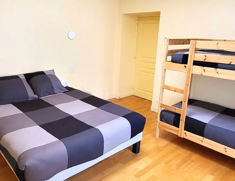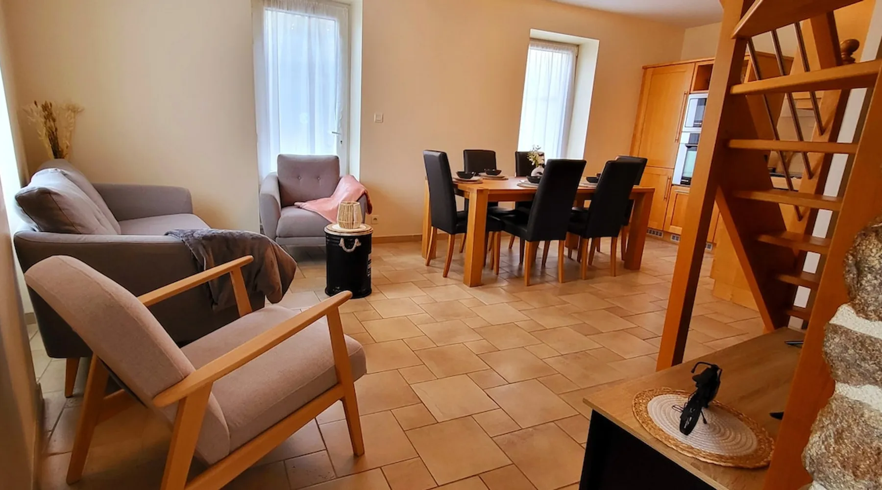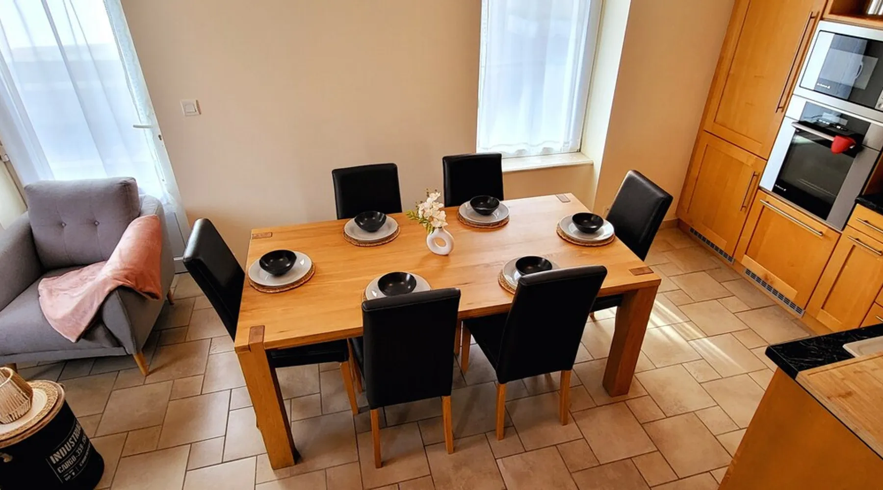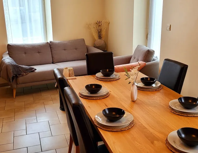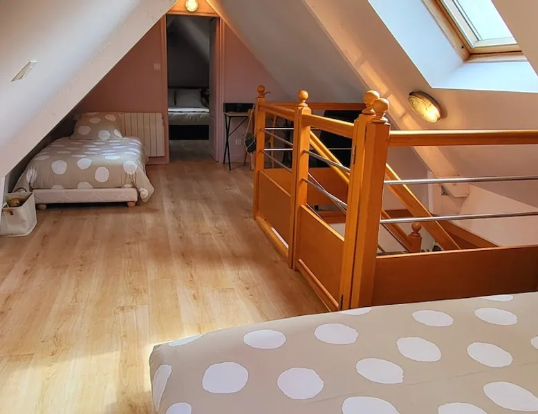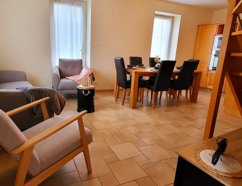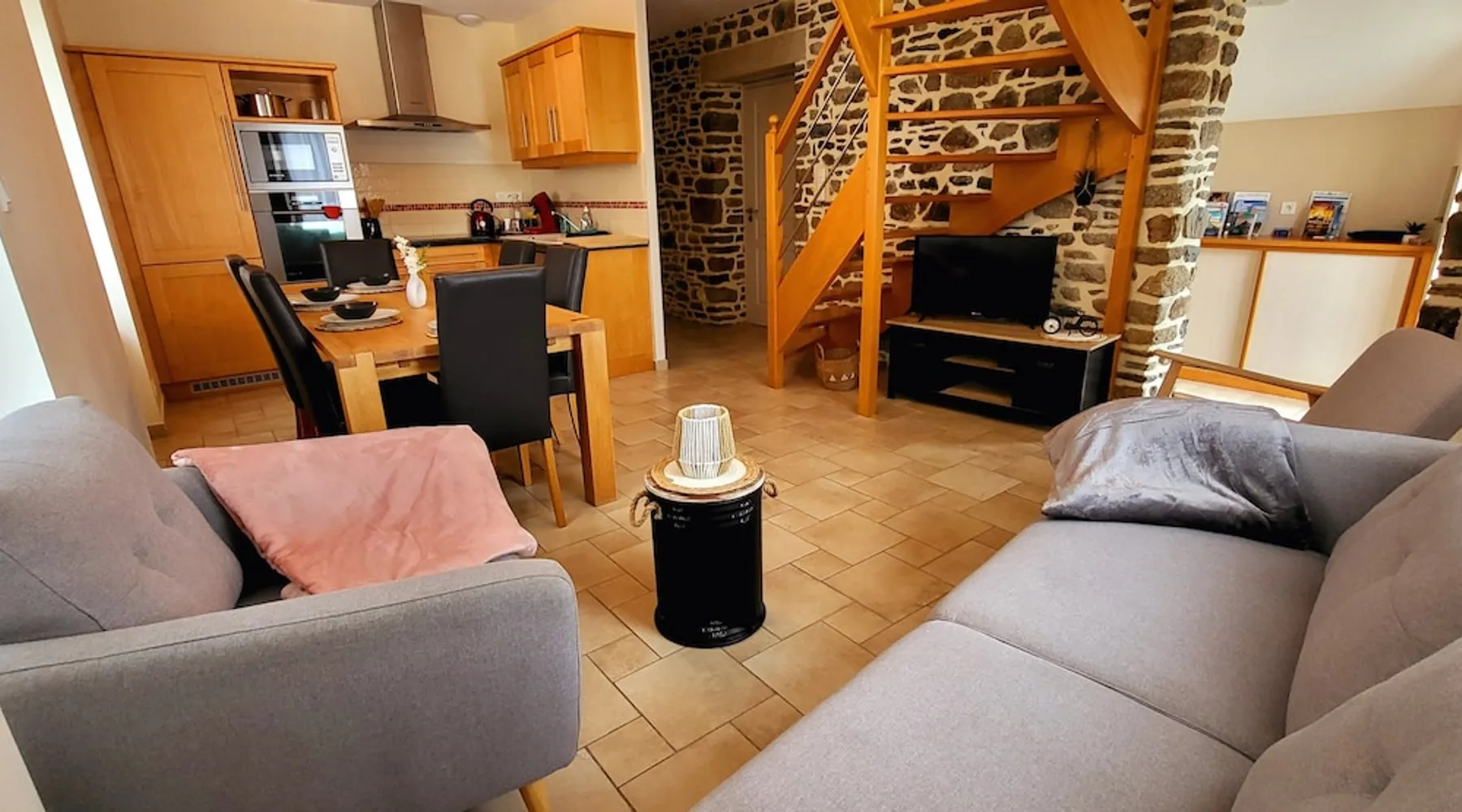 Located in the heart of Pontorson, this townhouse, typical in old stones without a garden or terrace, is close to all shops, restaurants with terraces, bakery, fishmonger, butcher, grocery store, train station, shuttle to Mont Saint-Michel, greenway and children's park all within walking distance!! This house is ideal for families or groups of friends. Free public parking is available in front of the house for easy parking. The space This typical townhouse in the region, recently renovated, offers the possibility of living on one level with its large bedroom on the ground floor as well as a shower room, a living room and a kitchen. Indeed, the ground floor bedroom has a 160 x 200 queen size bed and a 90 x 200 bunk bed. The living room offers a fully equipped kitchen with a large table for 8 people and a living room. The bathroom has a sink, shower, toilet and washing machine. Upstairs you will find a mezzanine room with 2 single beds and a bedroom with a 140 x 200 double bed. The house is a few meters from Rue du Couesnon so you can enjoy all the shops/restaurants in the city center. Guest access The house is entirely yours (no sharing). Other things to note We provide bed sheets, a large bath towel per person, a shower mat and dish towels. Please let us know your needs when booking in terms of the number and type of beds, as the Airbnb app does not specify the age of the children or whether guests sleep in a double bed or separate bed, so that we have all the sheets necessary for your comfort. Registration Details 14004*04