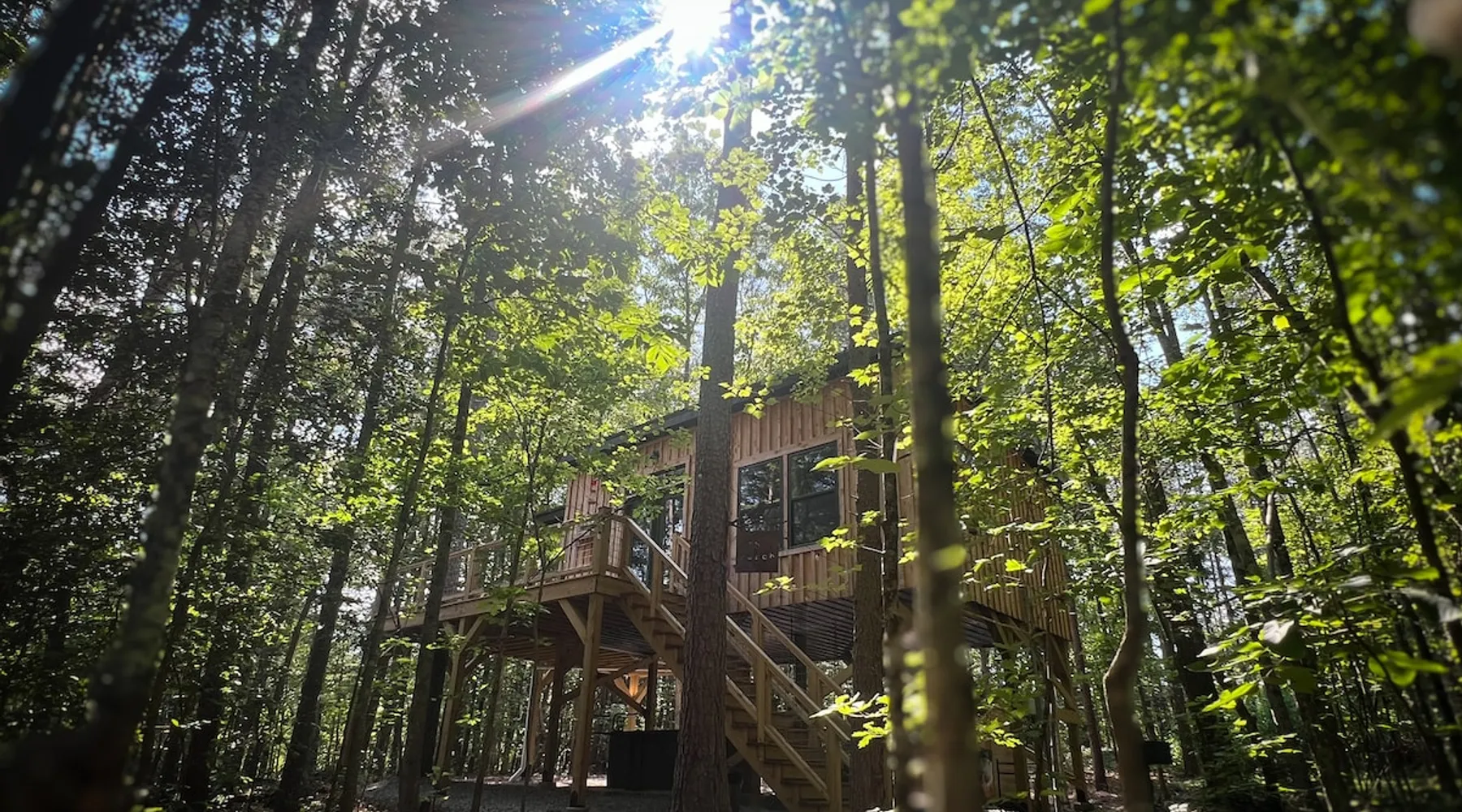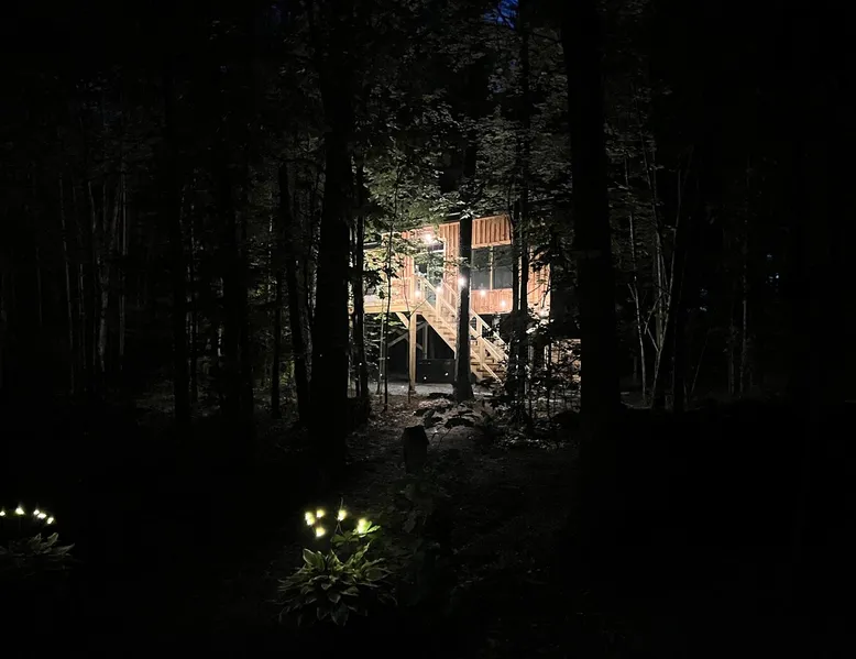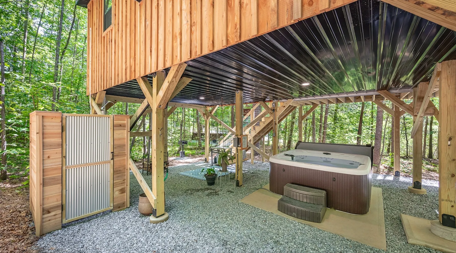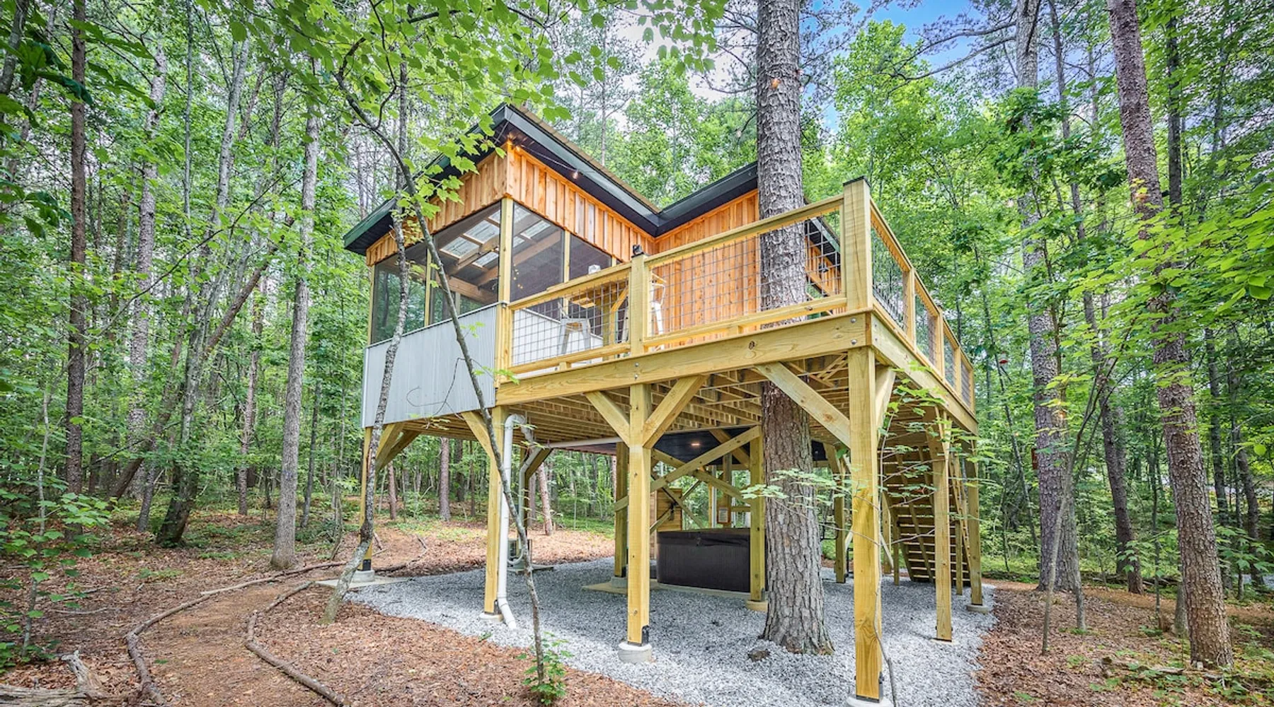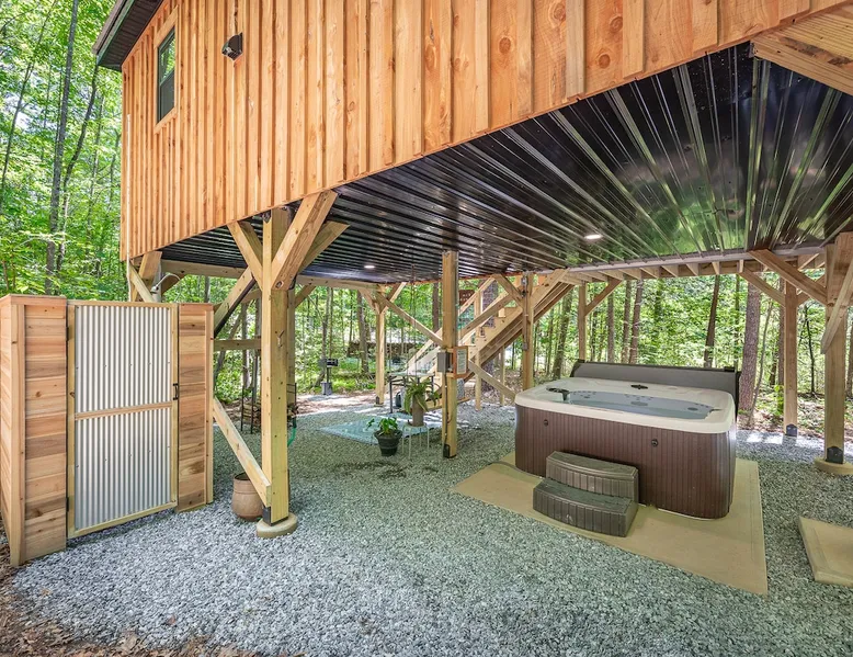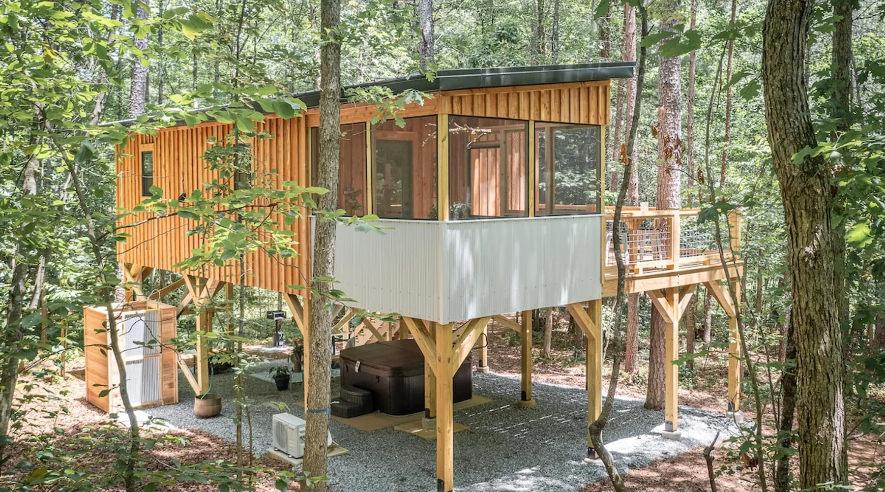 Modern storybook treehouse with hot tub