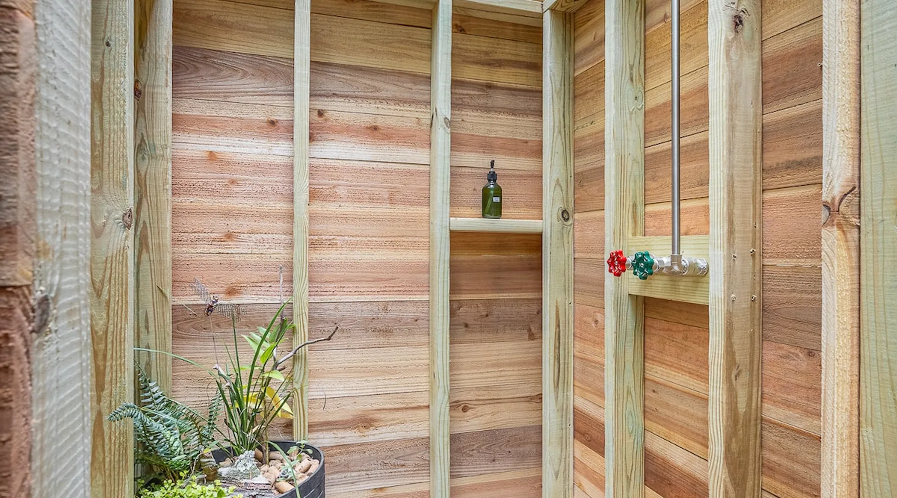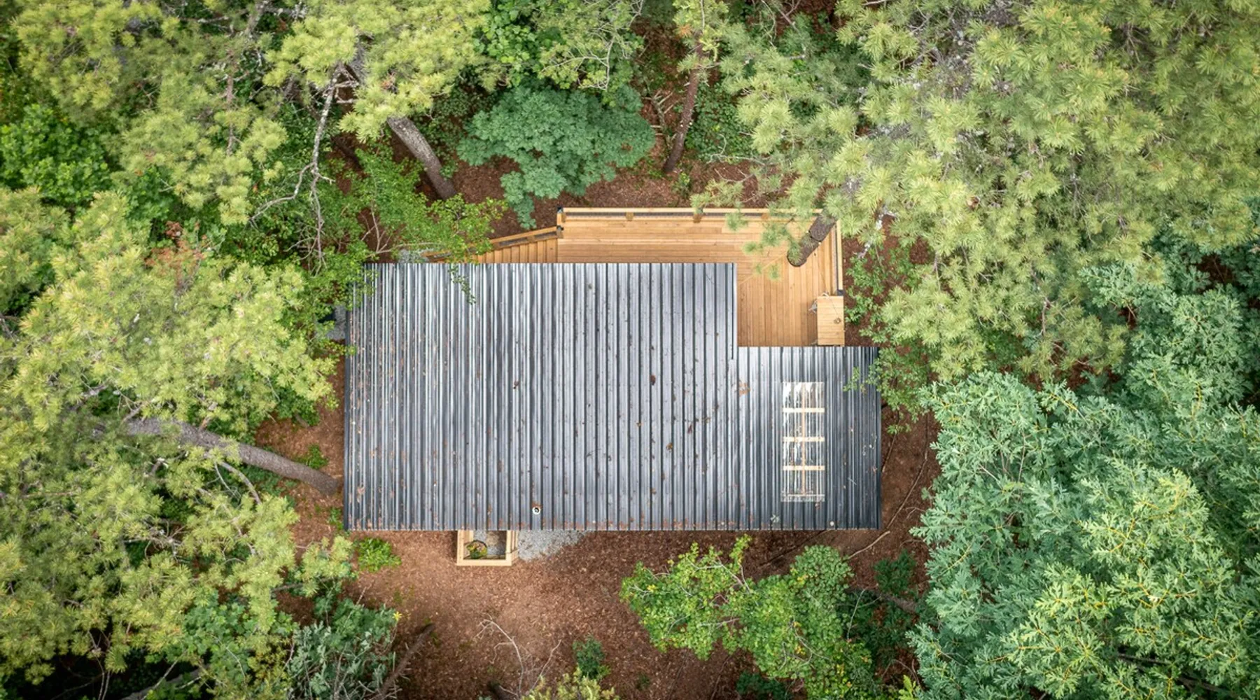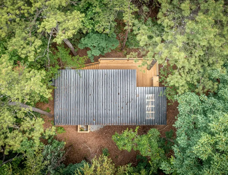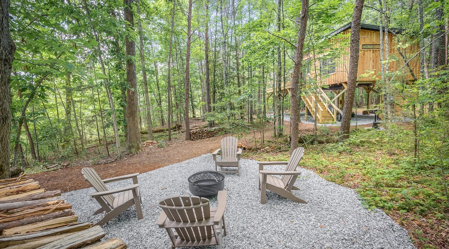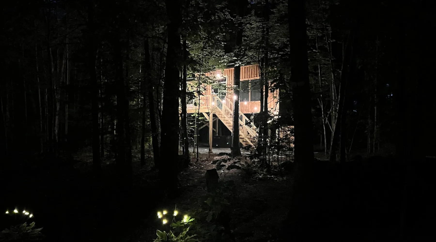Modern storybook treehouse with hot tub