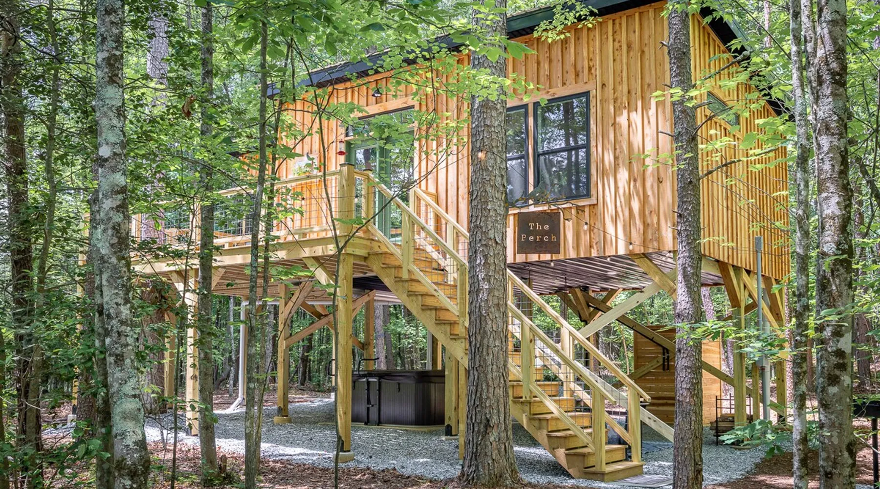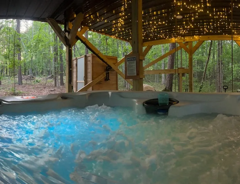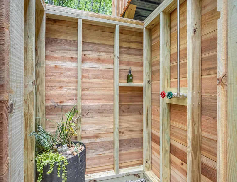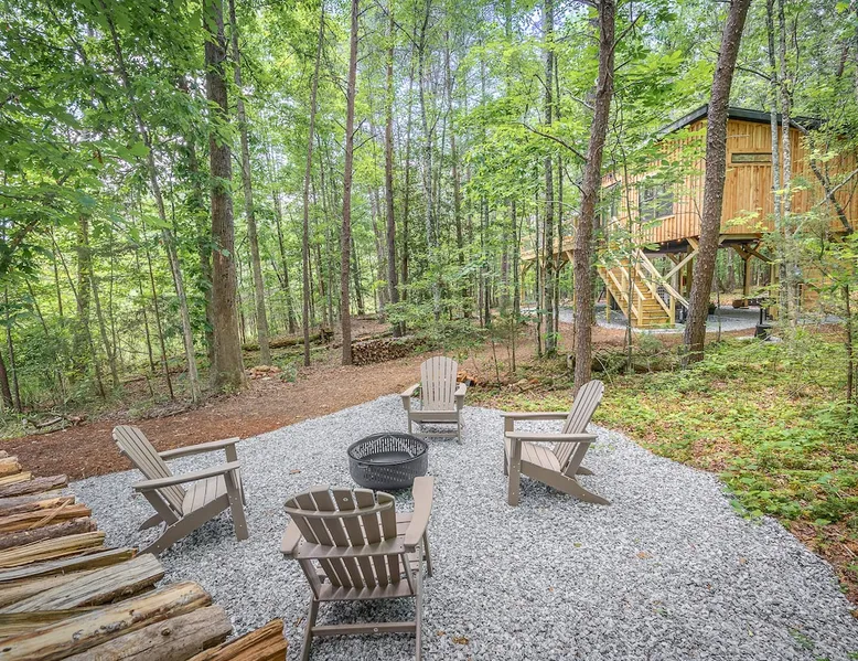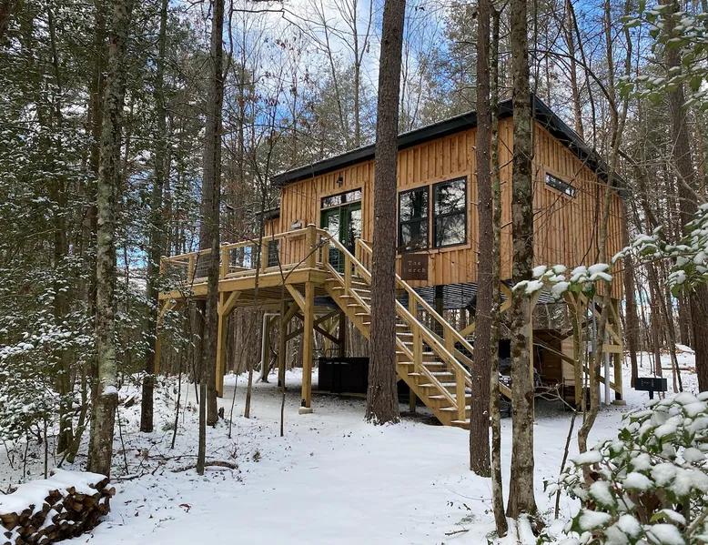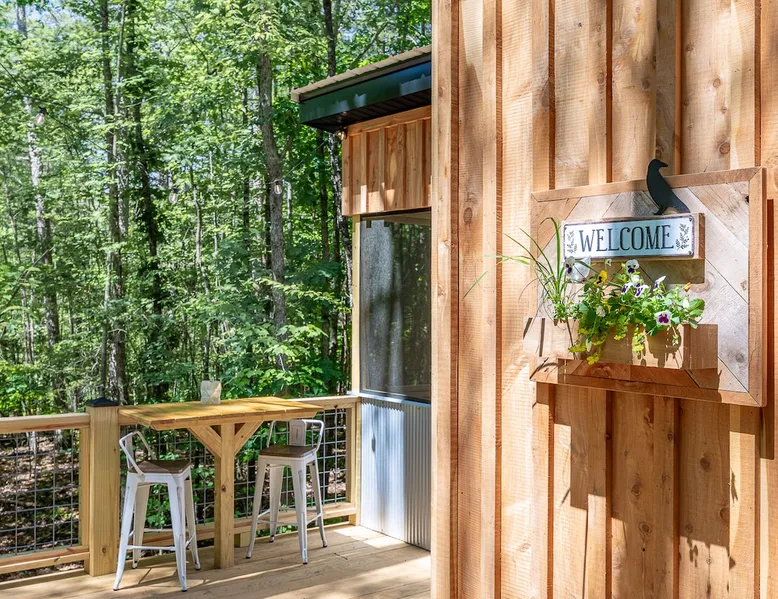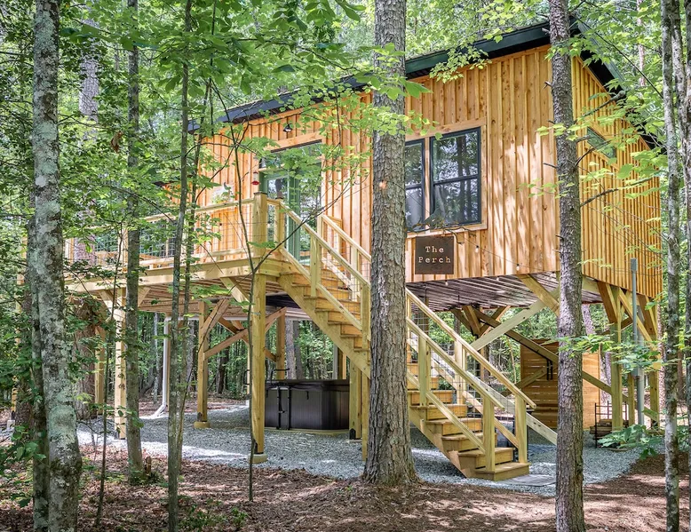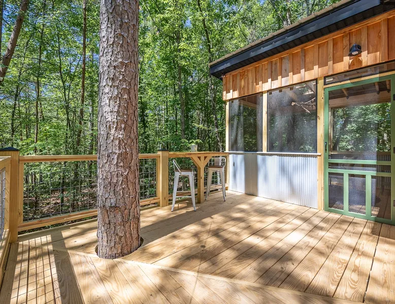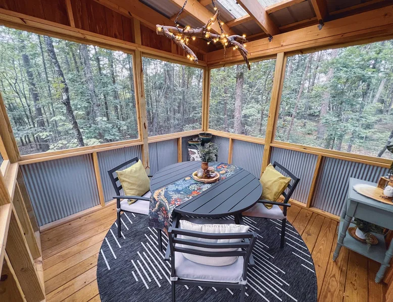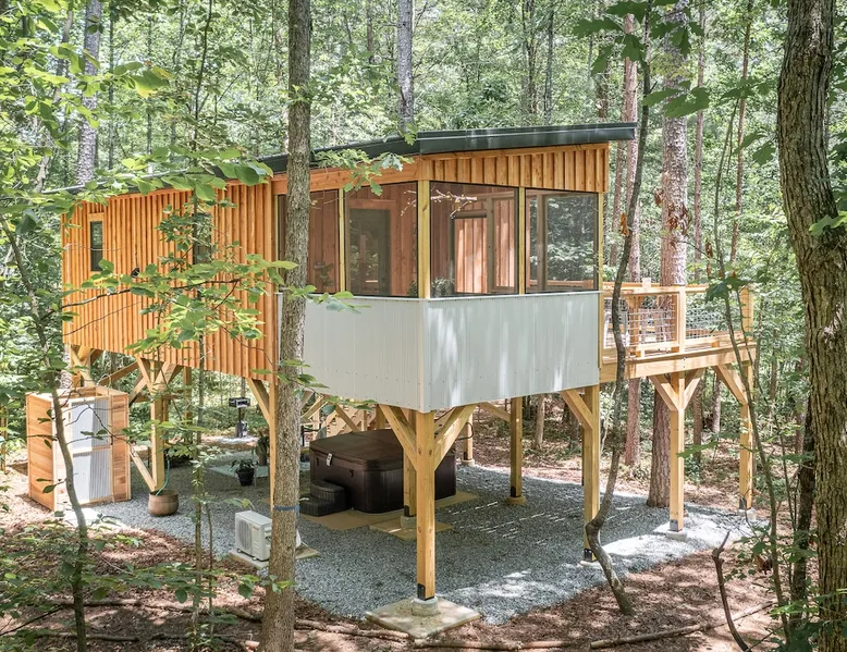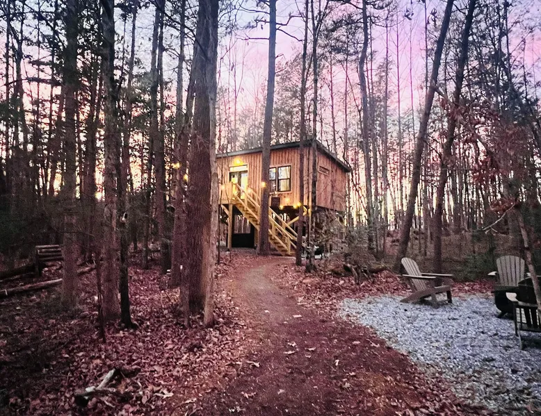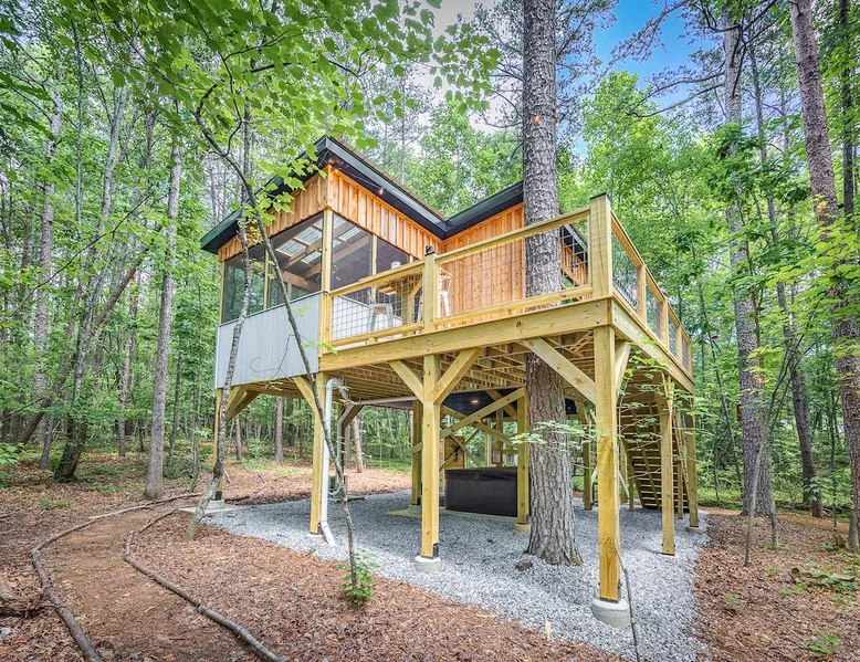 Nestle into your own corner of our 8 acres. Kick back in a forest setting while leaving the rest behind. Wander the nature path. Sit on the screened in porch or by the crackling firepit, take a shower outdoors or soak in the roomy spa. Rural foothills living in Western NC, convenient to Hickory, Morganton, Valdese & Lenoir. Great parks & lakes to explore. (Boat launch is 4 miles away). Check out a local winery/brewery. The Blue Ridge parkway is a short drive & absolutely breathtaking. The space ‘The Perch’ Tiny treehouse is a custom built tiny house (just under 400 square feet). It is situated in a mixed forest. Perfect for a couple or cozy for a small family. Modern design with whimsical storybook touches. It’s like stumbling across granny’s cottage in the forest, but way cooler. The space offers a screened-in porch with dining for four plus a two-seater bar top by the big pine through the deck. Cook up a tasty meal in the full kitchen or on the charcoal grill. Wander on our little nature path through the forest. There are hammock swings available creekside. Enjoy a soak in your private hot tub and then sink into the daybed, turn on the fireplace and candles, borrow a book from our mini library or watch a movie. The Perch has its own dedicated hi-speed internet for our guests. Guest access This is a private home with its own gravel driveway and parking area. The flat, mulched path from your vehicle to the Perch is approximately 40 feet. It is suitable for about any vehicle to access (yes, even a Prius) and ample room for truck and boat/utility trailer to park. Other things to note Please note this is a rural/country environment. While guests find our area very peaceful, you may hear a passing vehicle/lawn mower from time to time, encounter wildlife and sounds common to country life such as a dog bark, woodpeckers pecking, a tractor, a dirt bike/4 wheeler, children at play or even hunting/target practice in the distance. While we offer most of the amenities of a standard American home, we do not have a dishwasher on property. To keep a sanitary environment, minimize critters and keep our cleaning fee low, guests are asked to wash the dishes they have used. There is a queen bed and 2 twins. A partition is between the sleeping areas, but no door. Per our insurance carrier, all guests must agree to hot tub waiver (sent upon booking). The hot tub is cleaned and chemistry is balanced and video documented daily. Time-stamped video footage is taken indoors just prior to each guest check in as well.