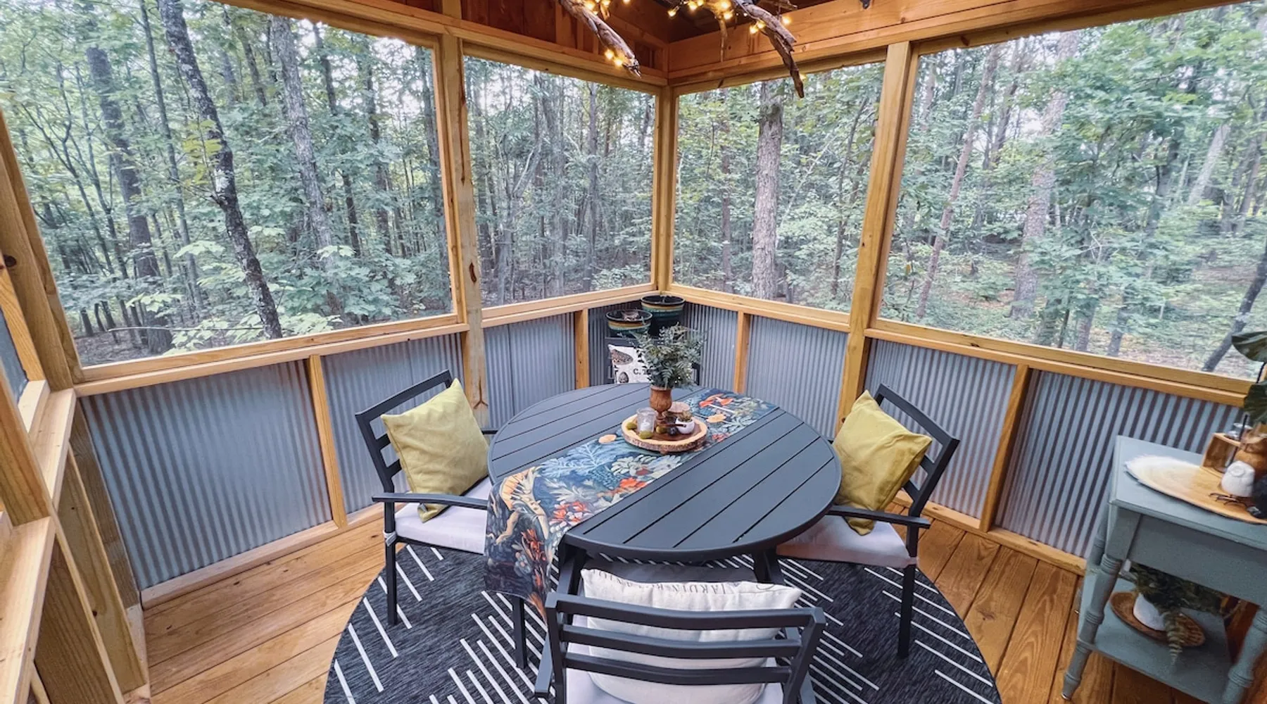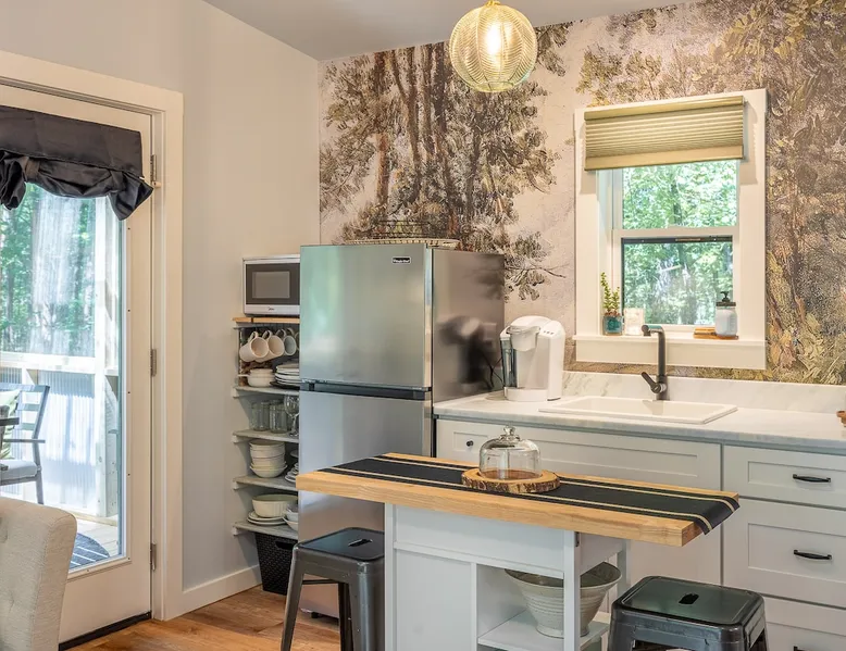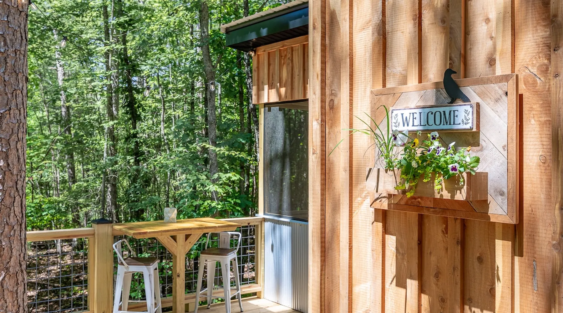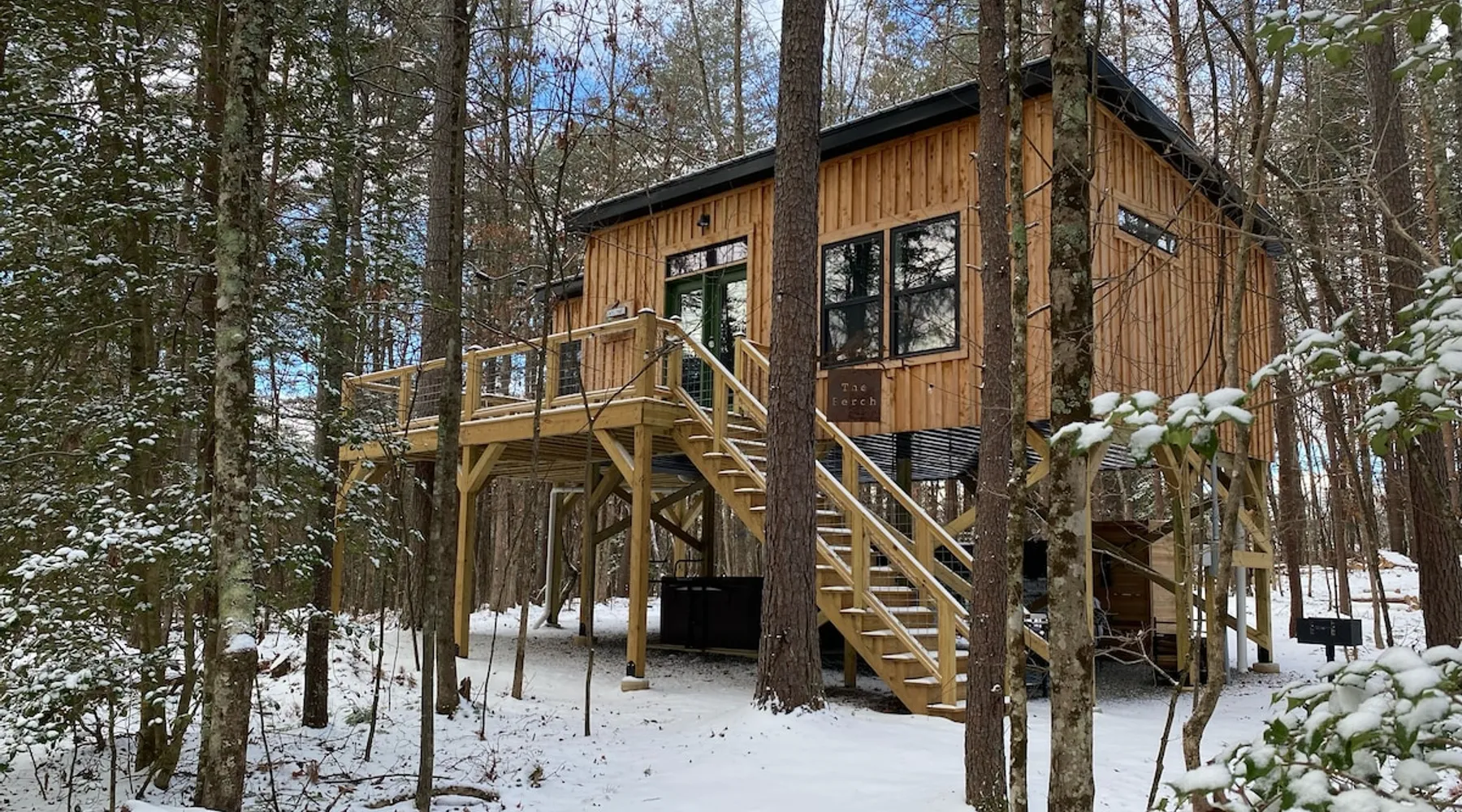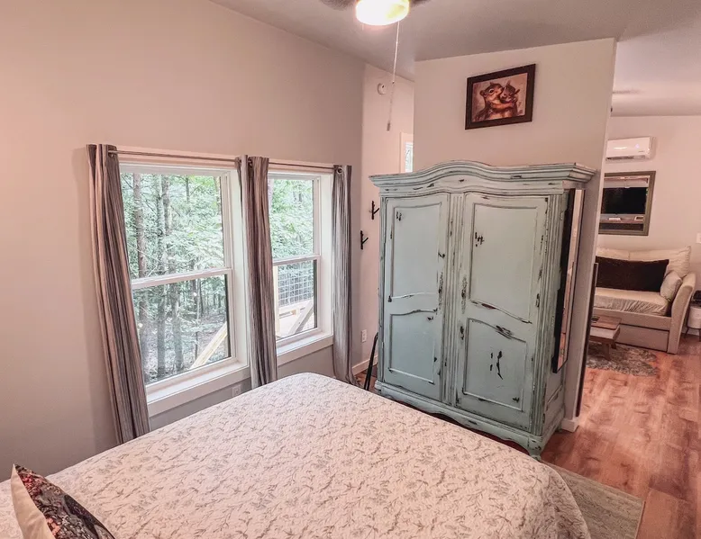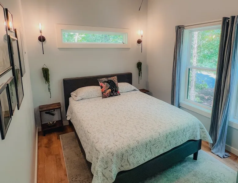 Nestle into your own corner of our 8 acres. Kick back in a forest setting while leaving the rest behind. Wander the nature path. Sit on the screened in porch or by the crackling firepit, take a shower outdoors or soak in the roomy spa. Rural foothills living in Western NC, convenient to Hickory, Morganton, Valdese & Lenoir. Great parks & lakes to explore. (Boat launch is 4 miles away). Check out a local winery/brewery. The Blue Ridge parkway is a short drive & absolutely breathtaking. The space ‘The Perch’ Tiny treehouse is a custom built tiny house (just under 400 square feet). It is situated in a mixed forest. Perfect for a couple or cozy for a small family. Modern design with whimsical storybook touches. It’s like stumbling across granny’s cottage in the forest, but way cooler. The space offers a screened-in porch with dining for four plus a two-seater bar top by the big pine through the deck. Cook up a tasty meal in the full kitchen or on the charcoal grill. Wander on our little nature path through the forest. There are hammock swings available creekside. Enjoy a soak in your private hot tub and then sink into the daybed, turn on the fireplace and candles, borrow a book from our mini library or watch a movie. The Perch has its own dedicated hi-speed internet for our guests. Guest access This is a private home with its own gravel driveway and parking area. The flat, mulched path from your vehicle to the Perch is approximately 40 feet. It is suitable for about any vehicle to access (yes, even a Prius) and ample room for truck and boat/utility trailer to park. Other things to note Please note this is a rural/country environment. While guests find our area very peaceful, you may hear a passing vehicle/lawn mower from time to time, encounter wildlife and sounds common to country life such as a dog bark, woodpeckers pecking, a tractor, a dirt bike/4 wheeler, children at play or even hunting/target practice in the distance. While we offer most of the amenities of a standard American home, we do not have a dishwasher on property. To keep a sanitary environment, minimize critters and keep our cleaning fee low, guests are asked to wash the dishes they have used. There is a queen bed and 2 twins. A partition is between the sleeping areas, but no door. Per our insurance carrier, all guests must agree to hot tub waiver (sent upon booking). The hot tub is cleaned and chemistry is balanced and video documented daily. Time-stamped video footage is taken indoors just prior to each guest check in as well.