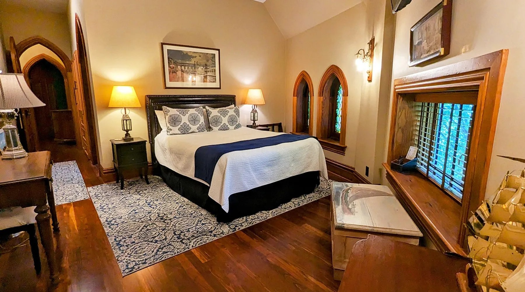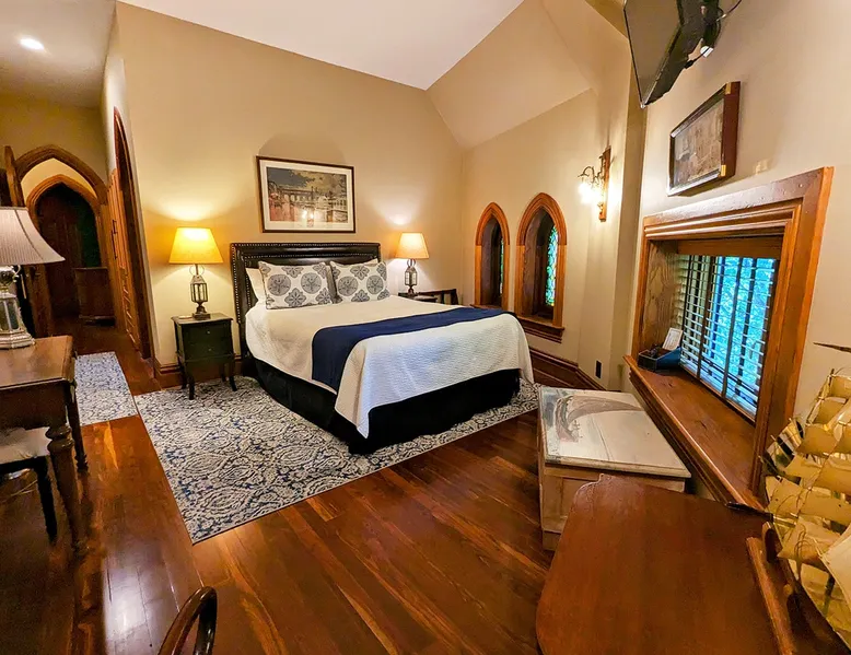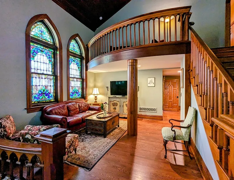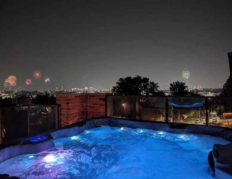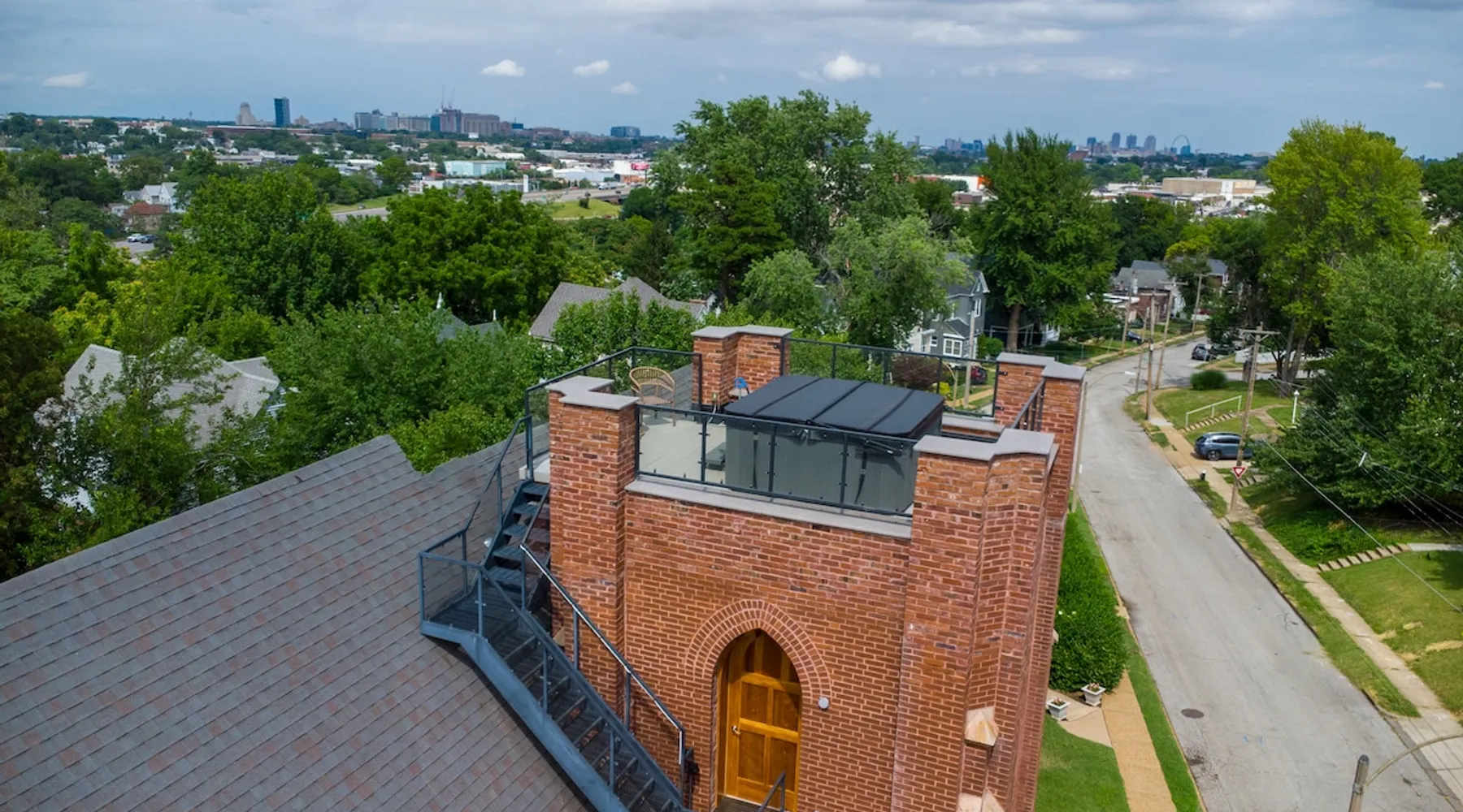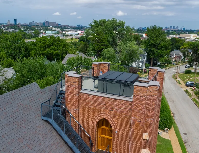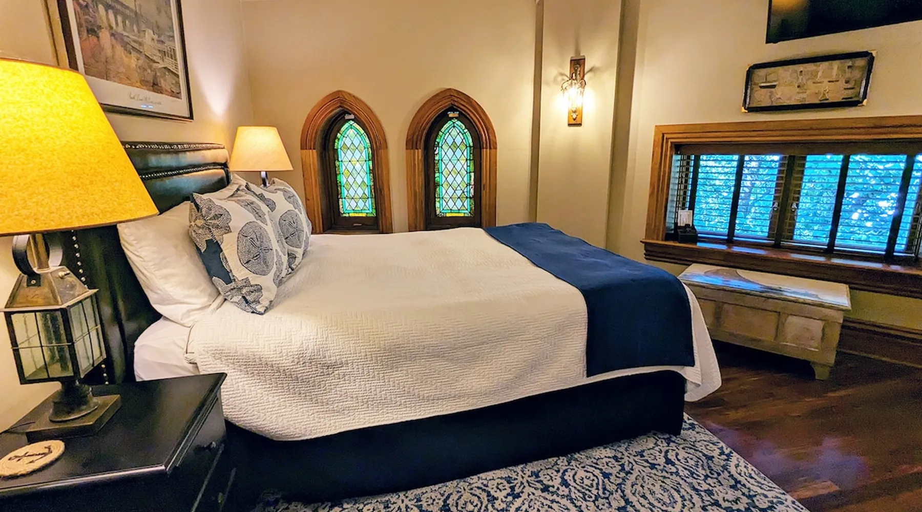 Discover refined elegance in The Riverfront Suite, where Gothic grandeur meets contemporary comfort. This distinctive retreat showcases original stained glass windows and exotic wood finishes . A plush queen bed and ambient electric fireplace create an intimate atmosphere, while the luxurious en-suite bathroom features heated floors, designer tile work, and a 2-person soaking tub. Take in panoramic city views from the shared rooftop hot tub. Perfect for couples seeking a romantic escape. The space Discover a Truly Divine Stay in St. Louis - A Historic Gothic-Style Church Transformed into Luxury Boutique Inn. Step into an architectural masterpiece where historical grandeur meets contemporary luxury. Our meticulously restored early 1900s Gothic-style church offers an extraordinary hospitality experience that goes beyond the ordinary. DISTINCTIVE FEATURES: • Breathtaking rooftop hot tub in the former bell tower, offering panoramic 360° views of St. Louis, including the iconic Gateway Arch, Forest Park, and the Central West End • Two monumental stained glass windows from 1905 grace the former gathering space, masterworks of artisanal craftsmanship featuring intricate details and vibrant colors that rank among St. Louis's finest examples of turn-of-the-century stained glass artistry. Throughout the building, original stained glass windows of varying sizes create an ever-changing dance of colored light, from intimate gothic windows in the suites to dramatic arched pieces in common areas, each telling its own part of the building's artistic legacy • Four luxurious guest rooms, each uniquely designed with romantic touches including ambient electric fireplaces that create a cozy glow. All rooms feature heated bathroom floors, rainfall showers, and indulgent soaking or jetted tubs, perfect for relaxation after exploring the city • Tranquil secret garden perfect for morning coffee or evening wine • Fully equipped shared kitchen featuring modern appliances, coffee station, and ample space for meal preparation • Multiple elegant common spaces throughout the building for relaxation and socializing • Convenient self check-in and dedicated host support throughout your stay • Free on-site parking PERFECT FOR: • Romantic getaways • Honeymoons and babymoons • Unique business travel accommodation • Special occasions and celebrations • Luxury staycations PRIME LOCATION: Nestled in safe, serene Clifton Heights, our location offers the perfect balance of peaceful seclusion and urban convenience. Just steps away: • 1-block walk to Clifton Park's serene pond and fountains • 0.3 miles to the Historic Hill neighborhood's renowned Italian restaurants • 1.5 miles to Forest Park attractions (St. Louis Zoo, Science Center, The Muni) • 2.0 miles to Historic Downtown Maplewood • 3.4 miles to Missouri Botanical Gardens • 3.5 miles to Washington University • 3.8 miles to The Cathedral Basilica & Central West End • 4 miles to The Pageant and Delmar Loop • 5 miles to The Fabulous Fox Theater • 6 miles to Busch Stadium Conveniently located with easy access to major highways, our inn is no more than 10 minutes from most of St. Louis’s top attractions. Whether you're seeking a peaceful retreat or planning to explore the city, our converted former Methodist church offers an unforgettable stay where historic charm blends seamlessly with modern comforts. Experience the magic of a space where every corner tells a story and every amenity has been thoughtfully curated to create an exceptional hospitality experience. Welcome to your sanctuary in the heart of St. Louis. Guest access You will have access to your private room with an en-suite bathroom as well as shared access to multiple living areas including: a shared kitchen, living and dining spaces, reading nooks, balcony, grand staircase, outdoor patio, secret garden, bell tower and roof-top hot tub. Other things to note The Riverfront Suite is one of four rooms in our boutique inn. Guests have access to shared spaces including the kitchen, dining area, former sanctuary, and rooftop hot tub. Per City of St. Louis regulations, a government-issued ID must be provided before check-in. Guests using the hot tub must complete a waiver and agreement. Security cameras with audio are installed at all exterior entrances. For guest safety, interior cameras are also present in shared areas including the check-in location of the kitchen & dining in the former sanctuary. Registration Details Exempt