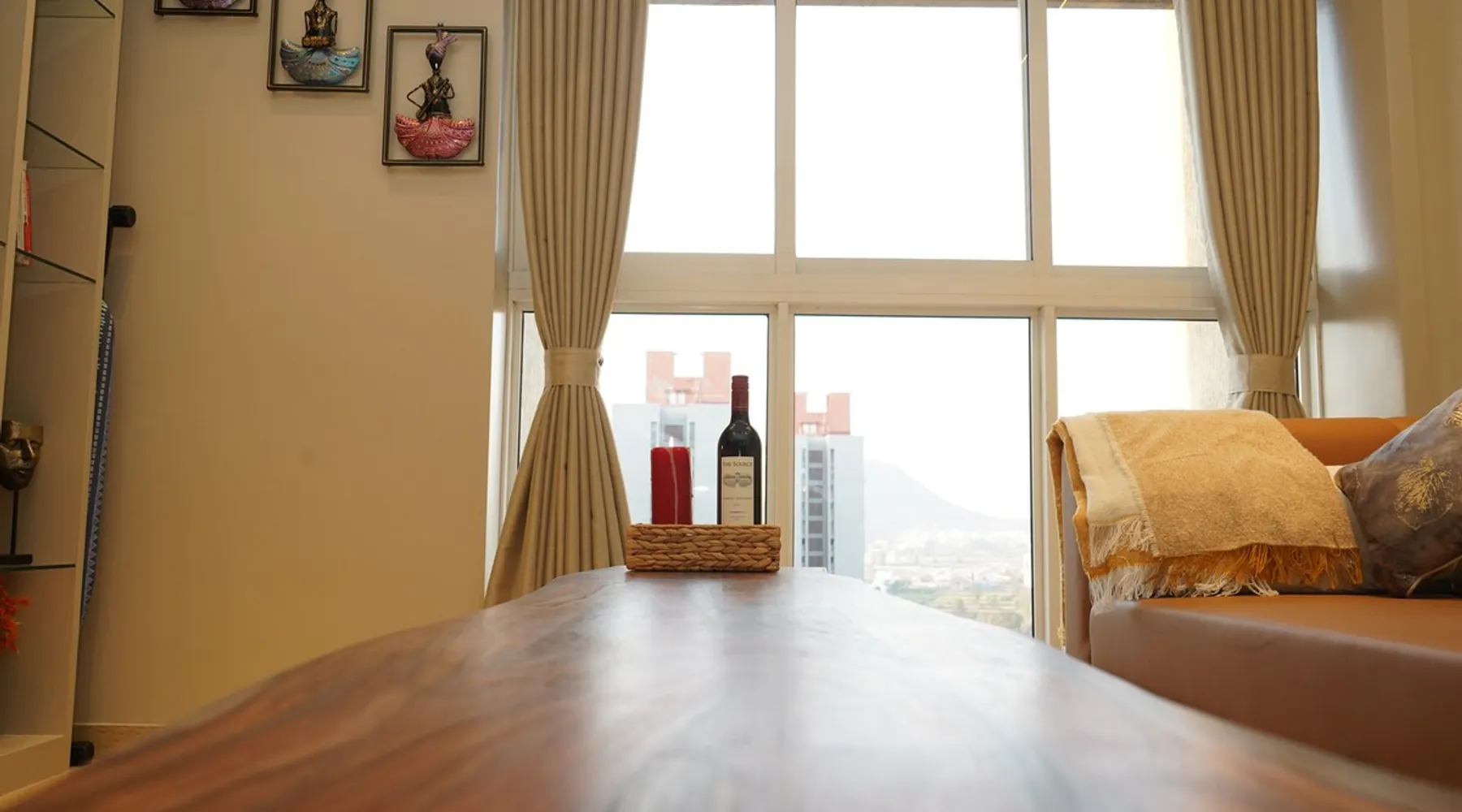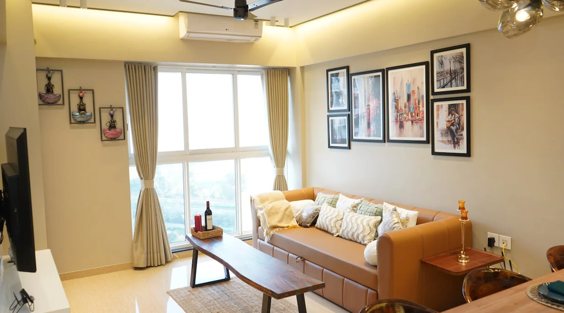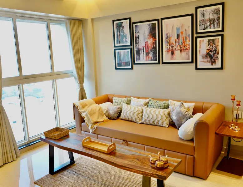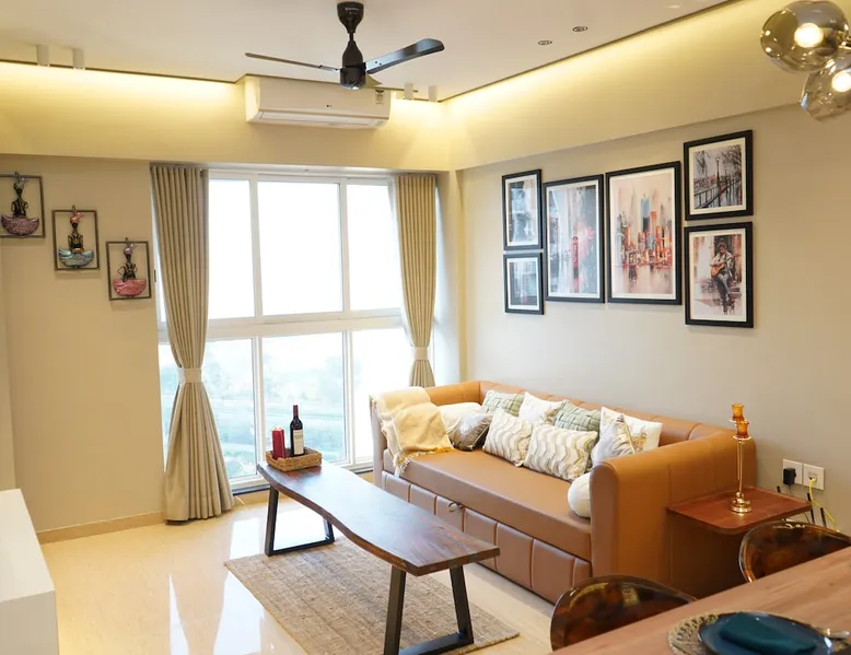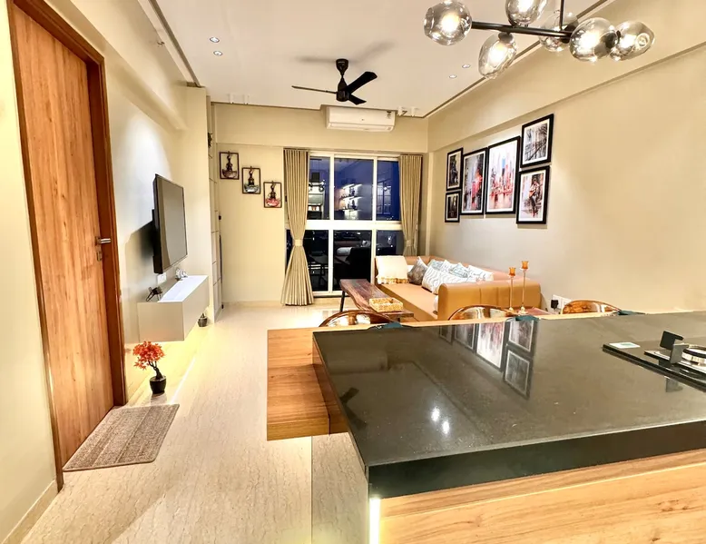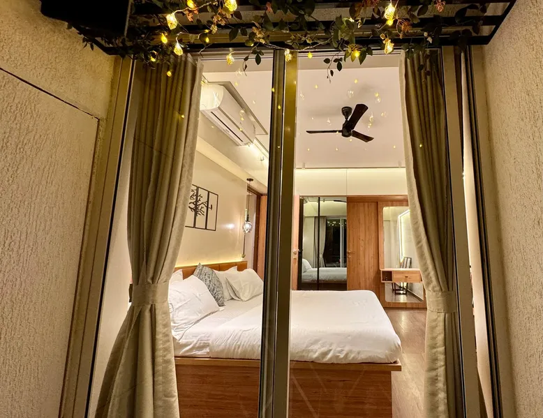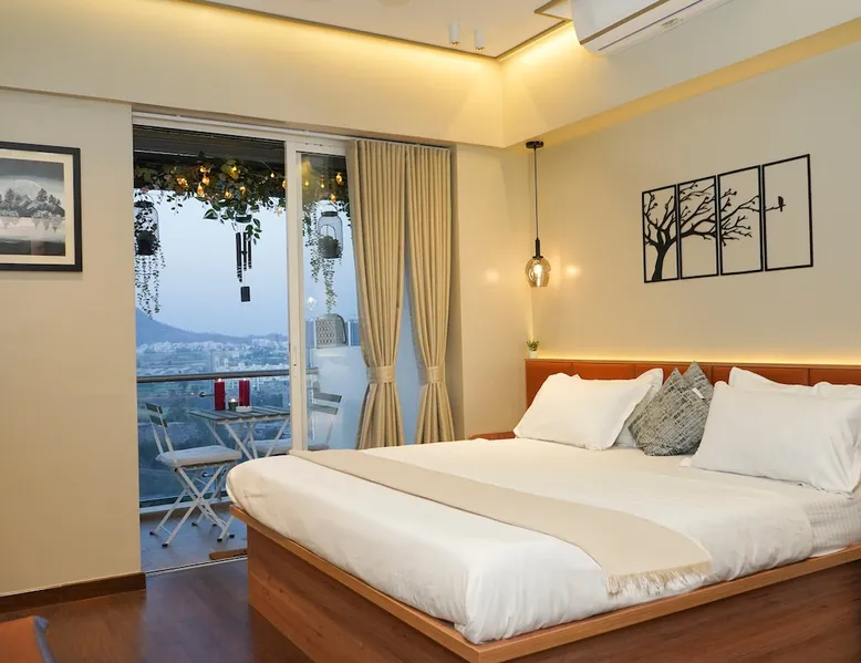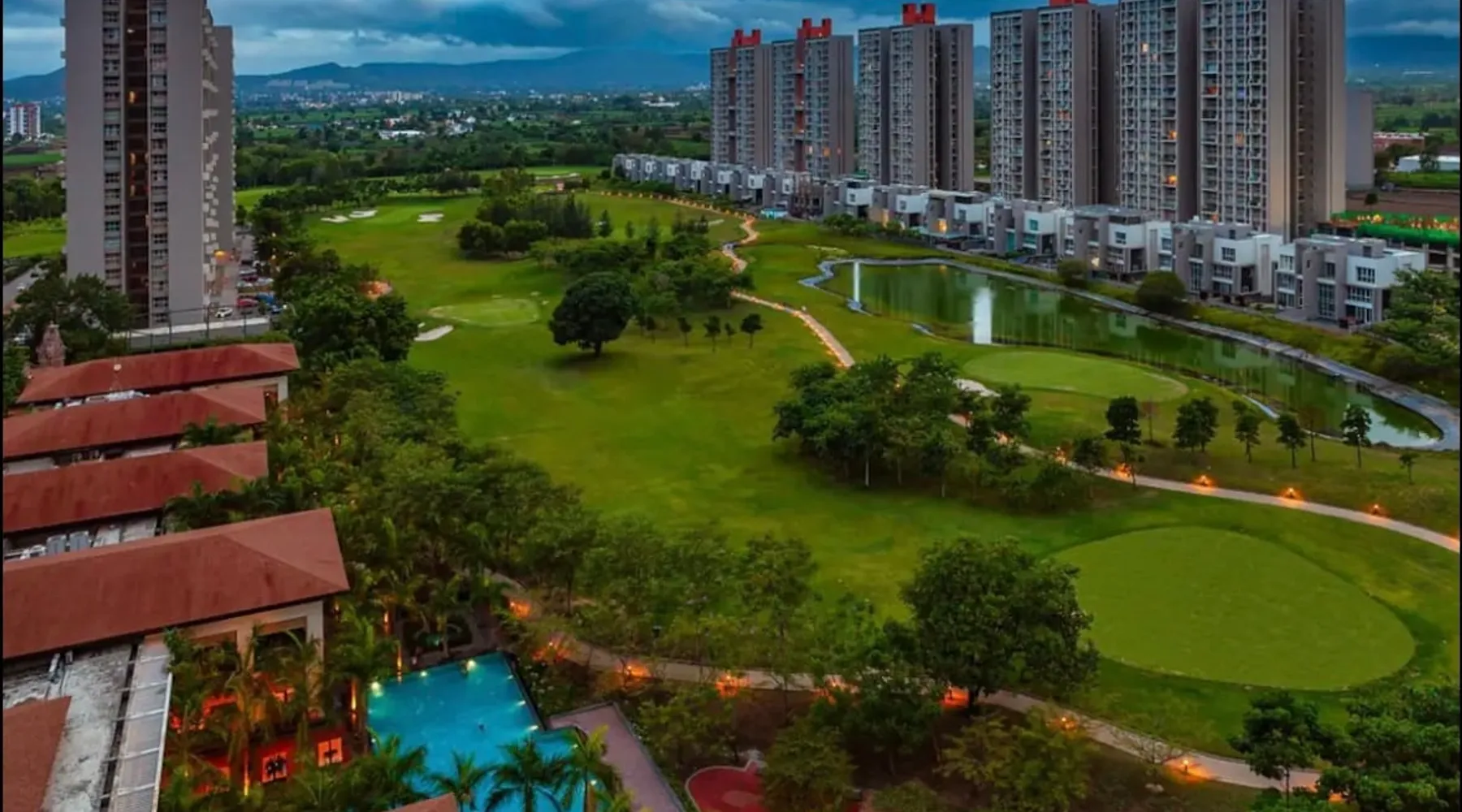 Step into a world of peace and serenity as you open doors to “The Manor” Nestled admist serene garden our charming studio apartment offers a perfect blend of modern comfort and rustic charm, providing you with a home away from home during your travel. We invite you to experience the luxury of stay with all modern facilities and cozy balcony adorned with seating, lush green plants & warmlights to savor the moment in absolute tranquility. Every detail is thoughtfully curated to enhance your stay! The space The studio is thoughtfully designed overlooking open skyline view, on the 20th floor with a serene balcony. At the foyer area inside, a sleek bar unit featuring a mirrored back panel to reflect the glimmering bottles of various liquors. Its design adds elegance, while wooden shelves showcase antique artifacts. LED lighting accents the display, casting a warm glow over the sophisticated setting. A spacious island serves as both a functional workspace and a stylish focal point, adorned with a cascading chandelier overhead , lead you to a luxury dining table set with fine dining and sparkling crystal glassware. A luxurious kitchen exudes opulence with its expansive marble countertops, complemented by rich, dark wood cabinetry and gold accents. State-of-the-art appliances seamlessly integrate into the design; provides all amenities you need to whip up a delicious meal, with modern appliances like microwave, fridge, toaster, sandwich maker, electric kettle,mixer grinder,air fryer, 2 burner auto ignition hob along with essential cookware & serveware. A spacious living room adorned with tasteful furnishings, featuring a large, plush tan sofa adorned with throw, pillows in rich tones, complemented by a cozy area rug beneath the centre table. Tall, arched windows allow natural light to illuminate the space, enhancing the warmth of the room. Adorning the walls are captivating paintings of people wondering, lost in different cities, story of love and longing in its own right, adding depth and character to the room. Sink into the embrace of our plush, king-sized bed, enveloped in crisp, high-thread-count linens that promise a restful night’s sleep. Soft, ambient lighting casts a warm glow across the room, accentuating the elegant decor. While a carefully curated balcony draws the eye and sparks conversation. Cozy seating invite relaxation, and a table in the center provides a perfect spot for gatherings or quiet moments of contemplation. Book your stay with us today and embark on an unforgettable journey filled with comfort, convenience, and unforgettable memories.” Guest access Guests will have exclusive access to the entire apartment along with access to OTT platforms - Netflix, PrimeVideo. Also Spa services can be availed at the discounted rates. Please check with the host for the same. The complex has well-maintained beautiful walking paths dotted with benches to take in the lush tranquil surroundings. The complex has a 9 hole golf course for which paid access is available. Golf kits and caddies are also available for hire. Beginners can avail of coaching with the in-house coach. The golf course is closed on Tuesdays and certain designated holidays. The clubhouse is functional from 8 a.m. to 10 p.m. on all days EXCEPT Tuesday and certain designated holidays. Entry to the clubhouse is chargeable @Rs.250 per person per day(8 am to 10 PM).Club passes are only issued to the apartment owners. Therefore, if you wish to use the clubhouse facilities you will need to inform our local host in advance. Below is a partial list of amenities at the clubhouse: • Swimming pools for adults and kids • Gym • Table tennis, pool table and other indoor games • Kids arena (up to 12 years) with rock climbing, Playstation, etc. • Steam, sauna, and jacuzzi • Tennis court and basketball court • 30 yard lush green T20 cricket ground • Playground for kids with slides, seesaw, etc. Guests can avail of the following additional facilities located in the clubhouse which are chargeable on actuals: • Salon and spa • All-day cafe serving vegetarian fare. • Multi-cuisine vegetarian restaurant serving lunch and dinner. Other things to note 1. Clubhouse facilities(Boating,gym,pool,kids play zone,horse riding) are chargeable per person per day and are not available on Tuesdays. 2. Swimming costume is a must to get into the pool. 3. We have many leading restaurants delivering food at the home via ZOMATO. 4. There are 3 to 4 tiffin services available, where homemakers are cooking food at their home and delivering at nominal costs. 5. BIG BASKET, JIO MART, DMART online apps are functional 6. OLA and UBER both are operational 7. Amazon considers this as PRIME location along side Flipkart. 8. WIFI has a superfast 50 MBPS speed and is dedicated for the guests. 9.Home is facing the Grand MCA stadium and the Mumbai Pune expressway. 10.Local shopping complex with salon, gym, grocery shops, vegetable vendors and supermarkets are available just outside building main gate. having said all of that, we have all modern day apps available for the perfect resort WFH staycation, weekend getaway or just to simply chill.