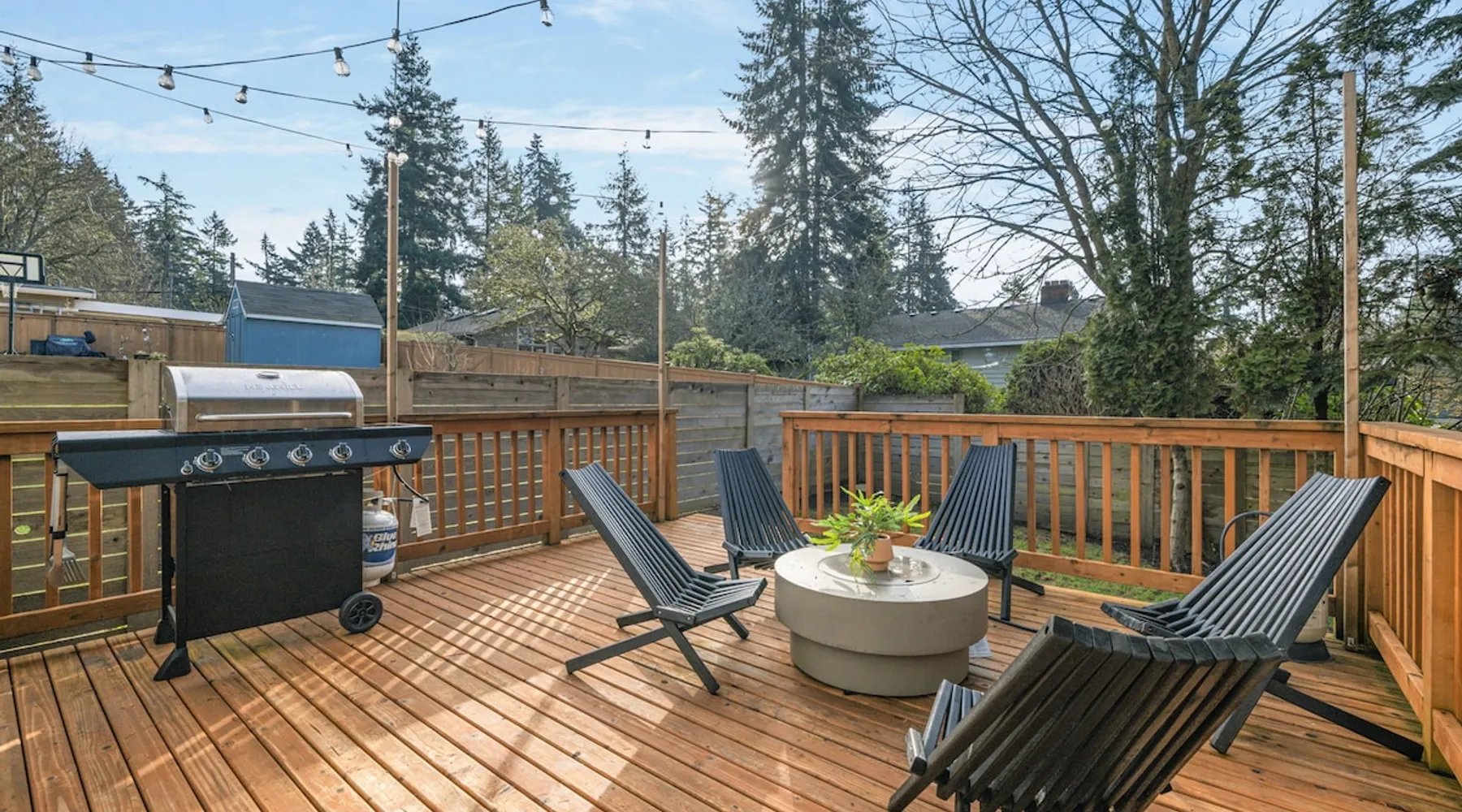 Seeking a serene yet vibrant Seattle getaway? Our Shoreline home, 20 mins from downtown, awaits you. It comfortably sleeps up to 10 guests in this unit, with its kitchen and living space. You'll enjoy the perfect mix of tranquility and easy city access, ideal for any group or family. Immerse yourself in the peaceful surroundings of Shoreline with the excitement of Seattle just a short drive away. Ready for relaxation and adventure? Your unforgettable escape starts here. The space **30-day min stay after September 2** ➤Unit A 5 Bedrooms / 2 Bathrooms ● Spacious Great Room: A harmonious blend of kitchen, living room, and dining room, perfect for relaxing and entertaining ● Primary Bedroom + Bathroom: 1 king bed, en-suite bathroom with bathtub, shower, and dual-sink vanity ● Second Bedroom: 1 queen bed ● Third Bedroom: 1 bunk bed ● Fourth Bedroom: 1 queen bed ● Fifth Bedroom: 1 queen bed ● Full Guest Bathroom: Enjoy a rejuvenating soak in the bathtub ● In-Unit Laundry + Foosball: Enjoy the convenience of effortless living and fun! ● Family-Friendly: High chair and pack n play available for young kids ● Twinkling Patio Lights, Gas firepit, BBQ, and Outdoor Furnitures on the deck: Let the enchanting ambiance guide your way to leisure while you relax in style ● Private Full-Fenced Backyard Other things to note 🔷Please make sure you read all the Important Notes before you book: ► NO PARTIES or EVENTS: In the unfortunate event of disruptions alerting neighbors, GUESTS WILL BE ASKED TO VACATE THE PROPERTY IMMEDIATELY and you’ll forfeit your deposit. Violations of these rules, including hosting private parties, will result in a $1000 charge.