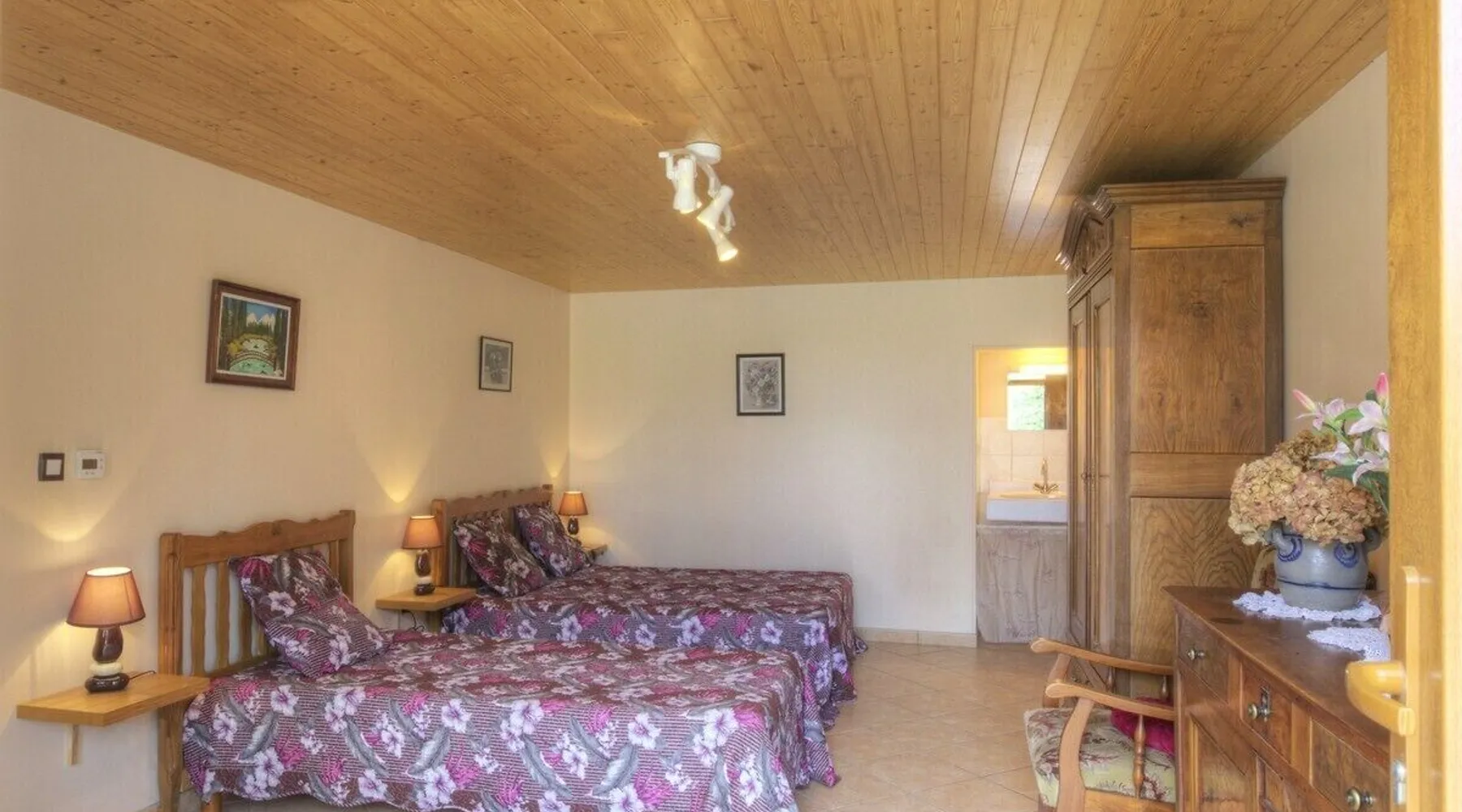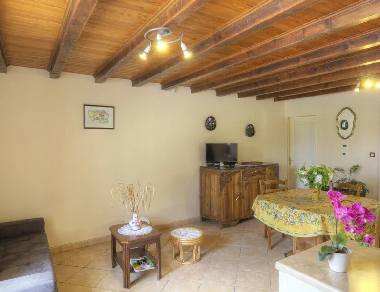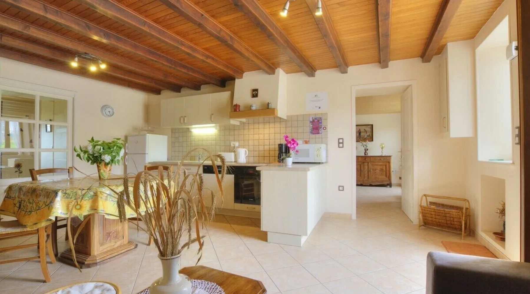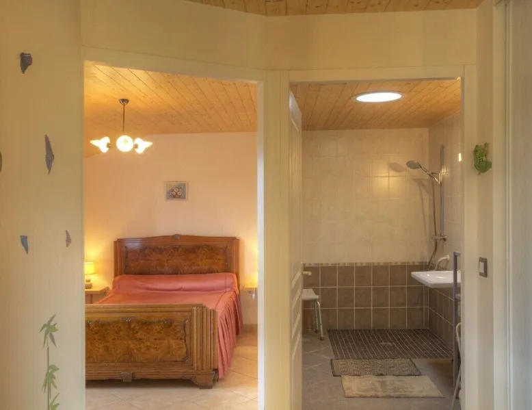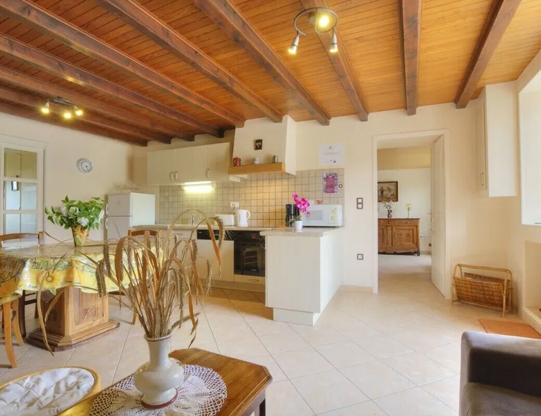 In a bocage Bressan landscape, single storey gîte (82 m²) in a renovated farm, adjoining another gîte. Living room / kitchen area with relaxation area. A room with disabled access (with 1 double bed and 1 single bed) with washbasin. A separate toilet. One bedroom (with 1 double bed) and a "small" bedroom (with 1 single bed). A walk-in bathroom with integrated WC. Terrace, garden furniture, enclosed grounds, children's games, car shelters. Visits: Ferme des Mangettes, Ferme de la Claison to visit in the village. Tree climbing park 1.5 km away. Tree park, tree and sense and the Pin Barn leisure center 6 km away. Discovery of Revermont.