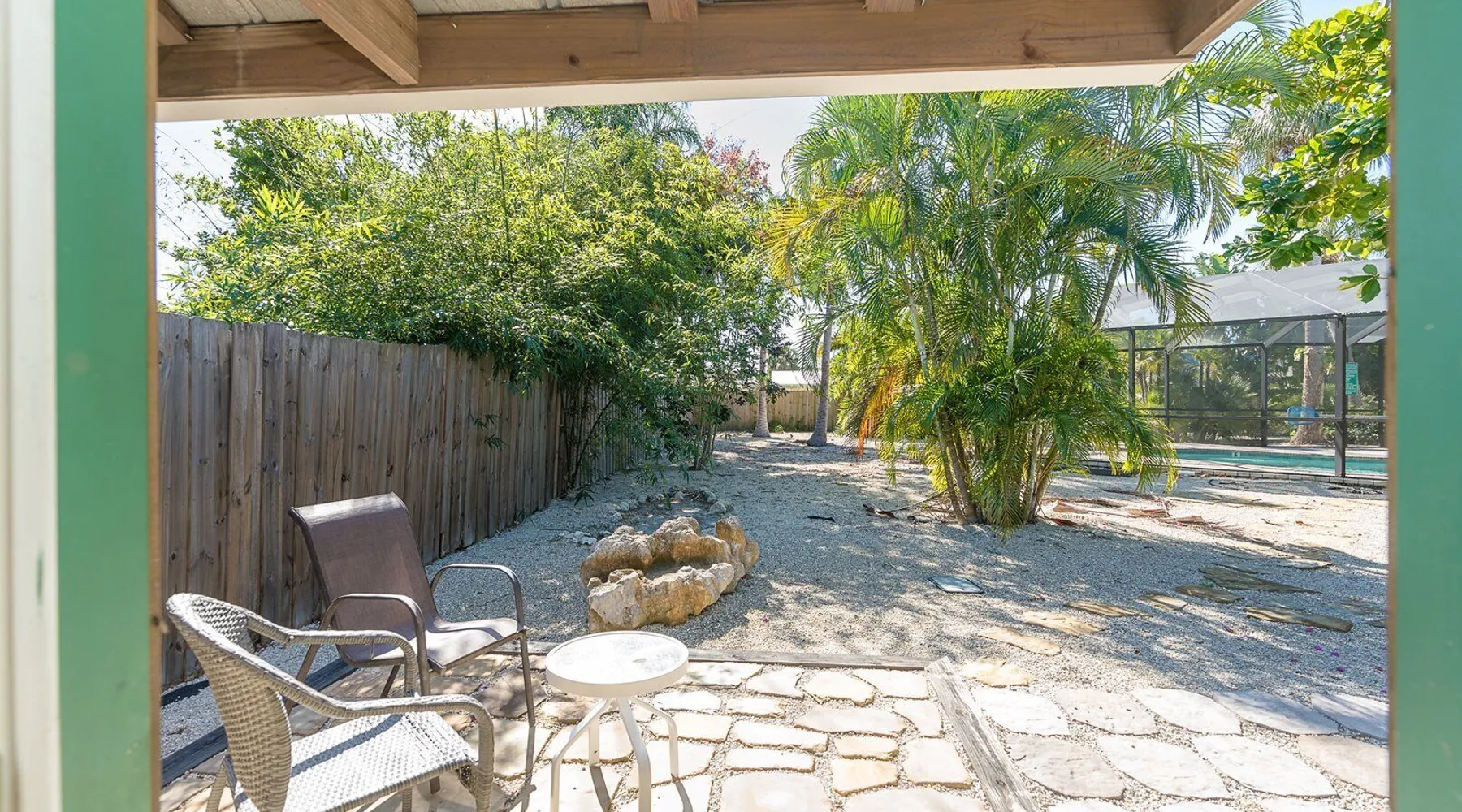 875 Spruce Street - This lovely home is situated just minutes from the beaches of Manasota Key, beautiful Lemon Bay, parks, shopping, restaurants, and great waterfront dining! Enjoy your morning coffee on the colorful front porch. When it's time to eat, dine in or enjoy your meal in the fresh air on the lanai area or relax in the lattice shade house. This home is ideally situated just a 1-minute drive from the causeway to Manasota Key. There are three major county park beaches at the north, middle, and south end of the Key. You'll have a short 20-minute drive to the Boca Grande Causeway and in about 5 minutes, you can be at Englewood Beach with first-class saltwater fishing and water sports facilities all in easy reach. Shelling, snorkeling, boating, beach combing, and kayaking are some of the activities within minutes of your doorstep. The Cape Haze Peninsula is also home to the Tarpon and Snook capital of the world - Boca Grande. You'll love this 3-bedroom, 2-bath classic Florida-style home. The third bedroom is a separate cozy backyard bungalow with its A/C wall unit to keep you nice and cool. The two bathrooms both contain pedestal sinks and walk-in showers. One of the bathrooms is in the garage, convenient to the bungalow. The pool is in like-new condition and is fully automated with a heater and lighting. The backyard is fully fenced for your privacy. You can alternate between lounging inside the screened pool cage, lying on your hammock under a tree, or sitting in one of two covered outdoor dining areas. Maximum Occupancy/Gatherings: Our properties are in residential areas and are rented for personal vacation uses only. Each property has a specific maximum occupancy. Parties and other large gatherings are not permitted. Those who break this rule risk forfeiture of their security deposit, rental fees, and eviction. Please refer to the Terms and Conditions at the time you make your reservation. Initial payments include the property's refundable Security (Damage) Deposit, 25% of the total rental fee, and the booking fee. Damage Deposit refund will be processed within 30 days of departure. Final payments are due 60 days from arrival. Amenities Include: - Bed Size 1st/Master: Queen - BR1 Info: 32" TV - Bed Size 2nd Rm: Queen - BR2 Info: 21" TV - Bed Size 3rd Rm: Queen - BR3 Info: 32" TV - Bed Size 4th Rm: N/A - Bed Size 5th Rm: N/A - Max # Guests: 4 - # Bedrooms: 2 - Coffee Maker: Keurig - Microwave: Yes - Dishwasher: Yes - Refrig and Ice Maker: Yes/Yes - Stove/Oven Elec/Gas: Yes/Electric - Dist. to Beach: 2 Miles - Dist. to Rest/Shop: Short Drive - A/C: Yes - TV Cable/Satellite: Digital Ant and Streaming - Fireplace, Wood/Gas: Yes - Patio: Yes/Screened - Lanai / Screened: Yes - Bath1 Info: Shower - Bath2 Info: Shower (in garage) - washer dryer: Yes - Iron / Ironing Board: Yes - Pool (Priv or Comm): Private/Heated - County: Sarasota - Laundry: In finished Garage - Children Welcome: Yes