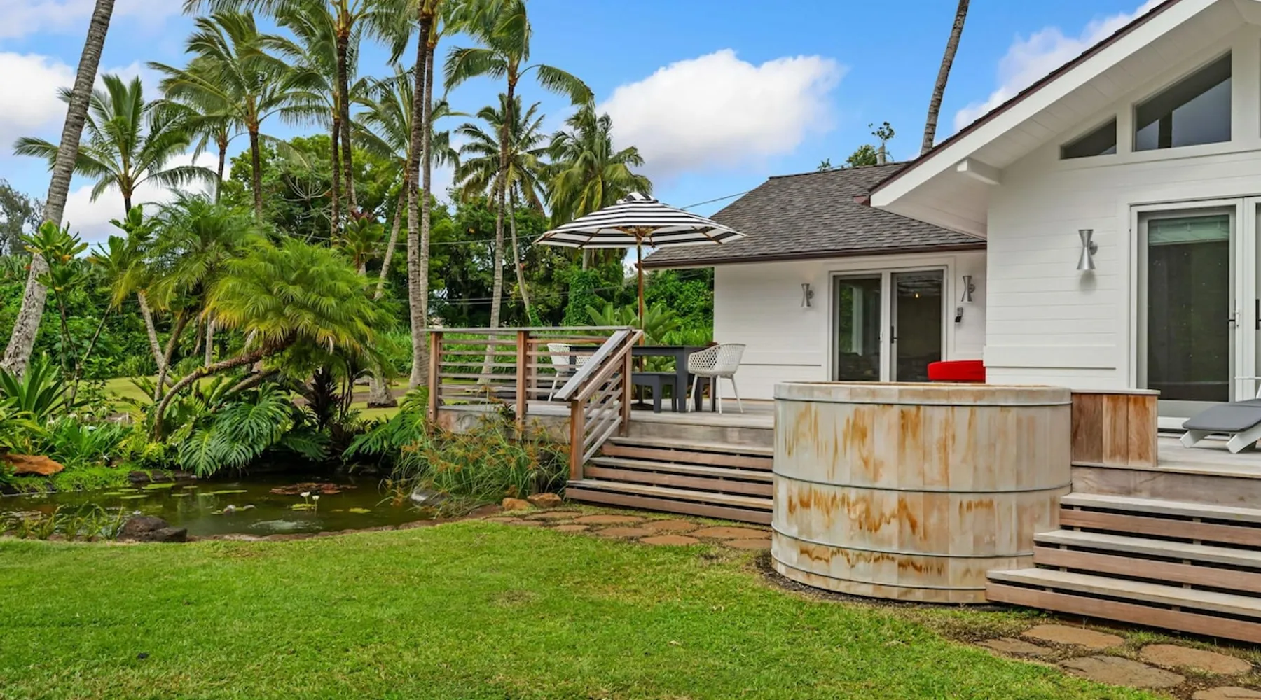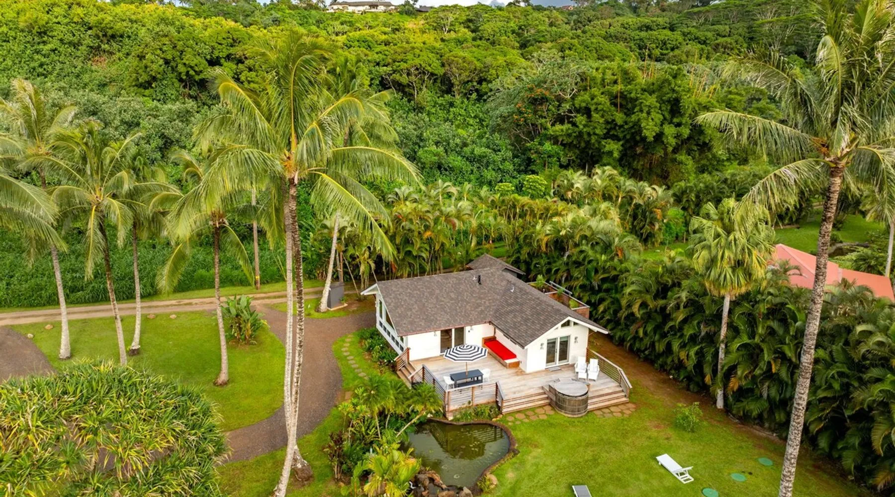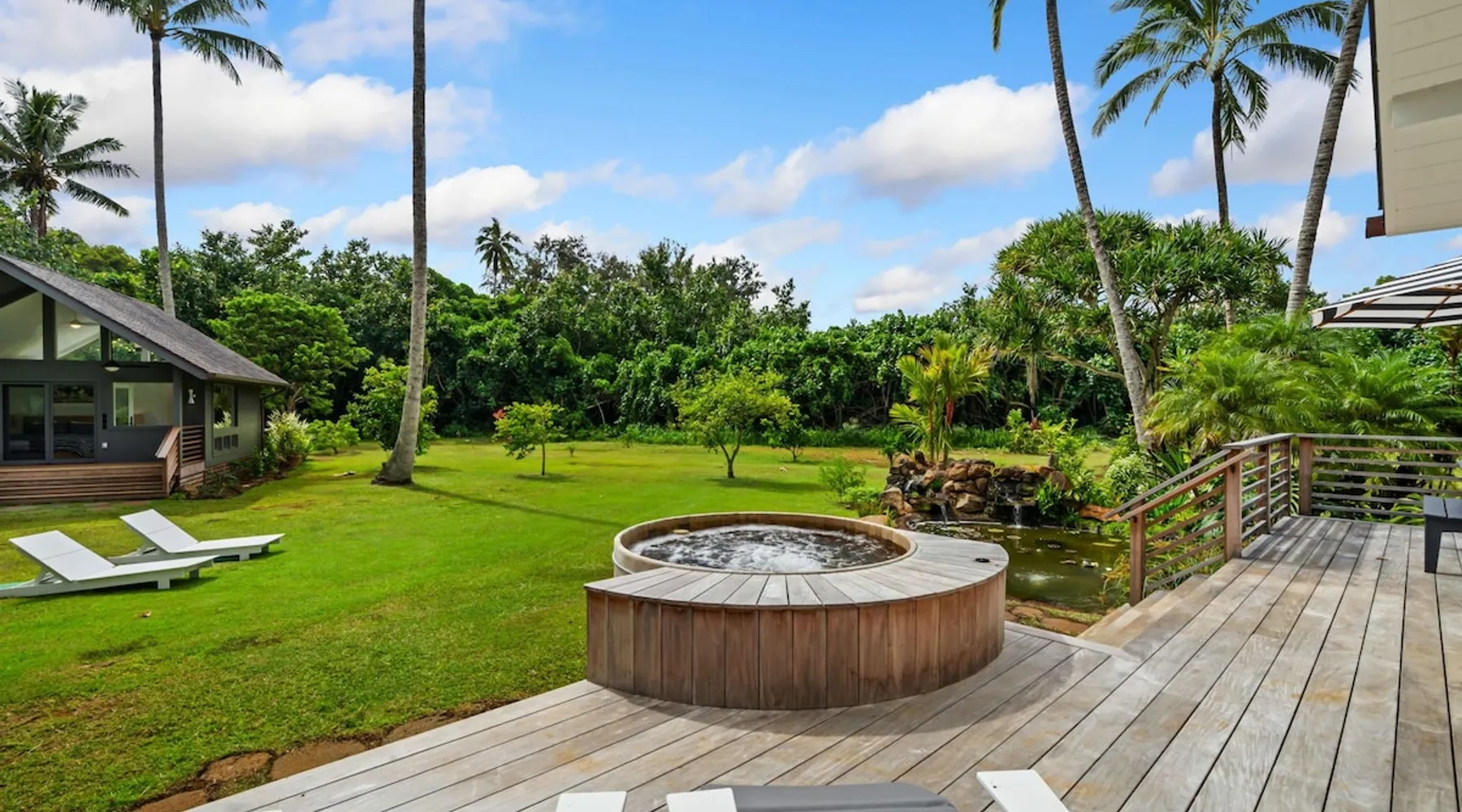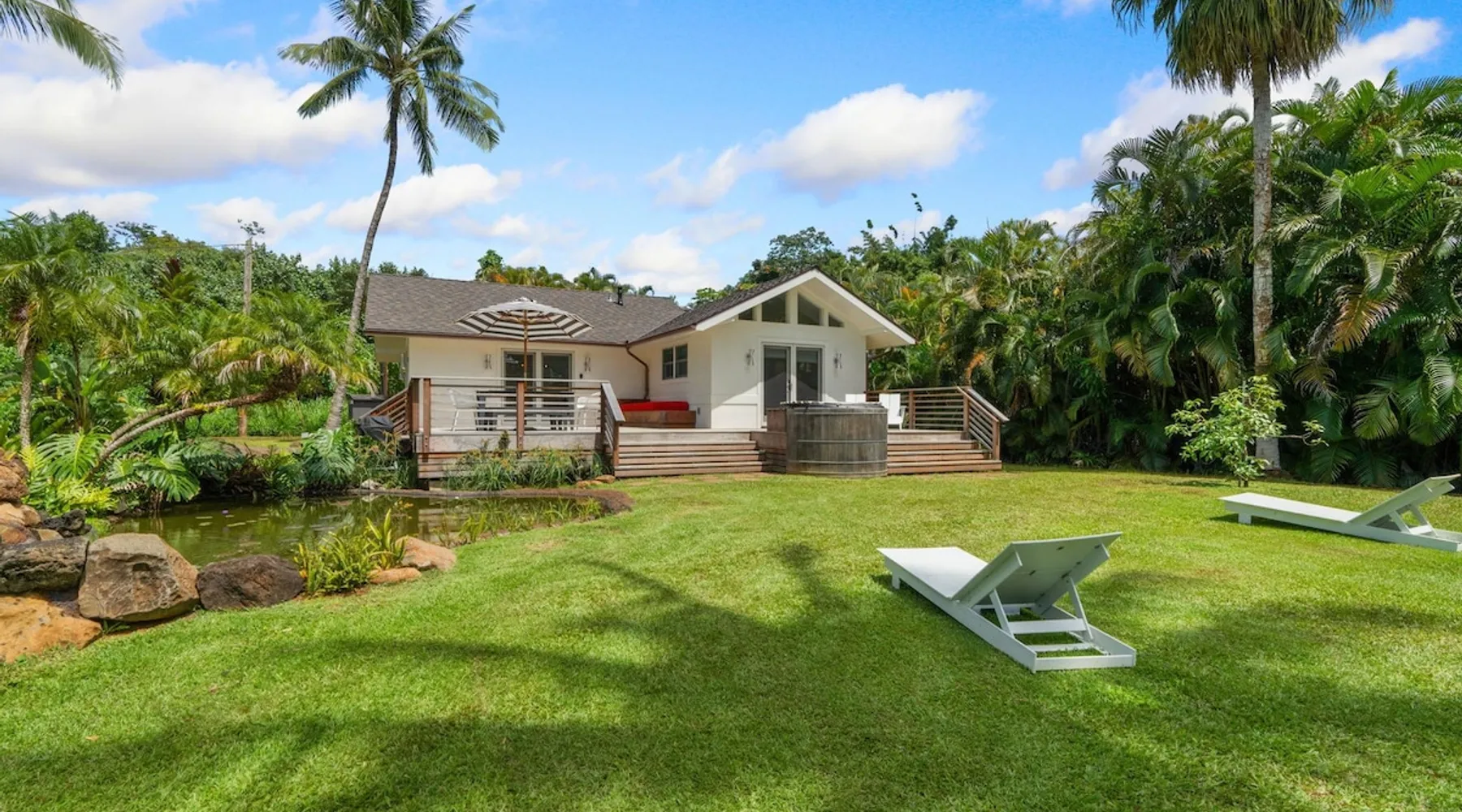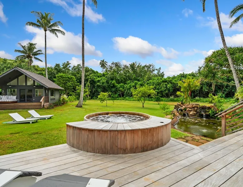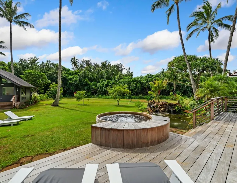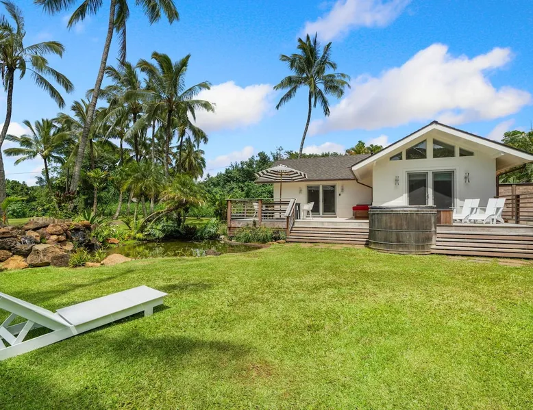 Coconut Hut The space A stylish reimagining of our ever-popular Coconut Hut. This perfectly positioned gem sits in a secluded park-like paradise within a 5-minute walk to the idyllic Anini beach. With new construction, the house contains hardwood floors, whole house water filtration, AC in all rooms, portable Sonos speakers, and WiFi indoors and on the deck. The living spaces boast a large fold out flat screen TV, Wolfe range with indoor grill, LG washer/dryer, dishwasher, refrigerator, and freezer with ice maker. There is a Heston outdoor bbq for grilling. The interior furnishings are a mix of vintage bamboo, midcentury classics, and koa wood Hawaiian furniture. The great room is filled with light, complete with an expansive view of the coconut trees on the property. A large remote-controlled shade allows for complete privacy, day or night, from the glass wall in the living room. The light and ambiance are fantastic throughout the house. It is serene and modern with a big nod to midcentury design, Hawaiian, and Asian art. Beautiful inside and out. The primary king bedroom includes a stunning bathroom with Toto toilet, dual sinks, private outdoor shower garden featuring unique Hawaiian plants and a redwood soaking tub. There are ample closets, built in storage, and a dresser. The secondary queen bedroom includes a bathroom with Toto toilet and an adjacent private outdoor shower garden featuring Hawaiian native plants. There is ample storage available in the second bedroom. The exterior includes a new, expansive deck with hot tub, outdoor dining, and built in daybed. The outdoor water features in the pond create a backdrop for relaxation. Enjoy looking up at the stars and taking in the vast surrounds. At the rear of the property, there is a private guest house that will remain unoccupied during vacation rentals and is not available to rent. Indoor Features: - 1 King, 1 Queen Bed - Air Conditioning in all rooms - Full Kitchen - Washer & Dryer Outdoor Features: - Lanai - Yard - Hot Tub - Grill The Area: - Short Walk to Anini Beach - 10 minute drive to Princeville - 20 minute drive to Hanalei Bay Hawaii Life Rentals is a locally owned, licensed real estate company with rentals on Kauai, Maui, Oahu, and Hawaii. We offer on-island personal assistance and Concierge services. Rates do not include taxes, cleaning and applicable fees. VRBO/Hawaii Life bookings: Guests must sign a rental contract within 48 hours of booking to confirm the reservation. * This home is located in a Tsunami Evacuation Zone * TA-199-886-0288-01 SP 2012-25 TVNCU 4243 Registration Details 530040180000, TA-199-886-0288-01