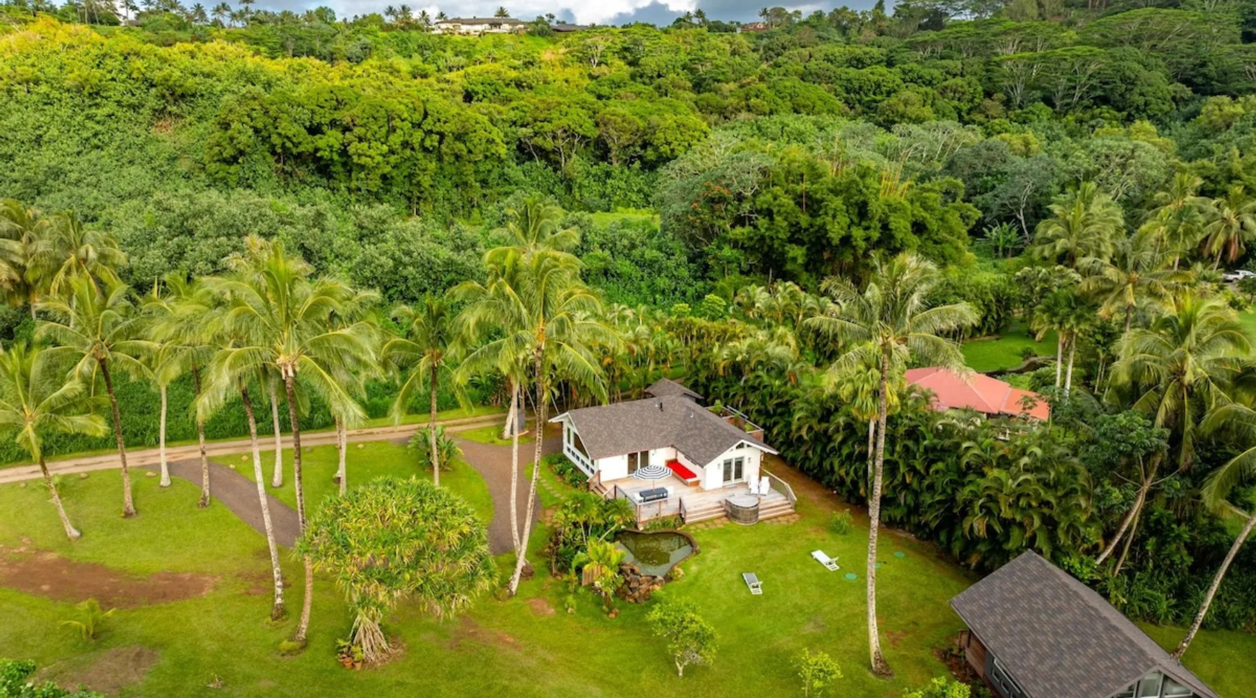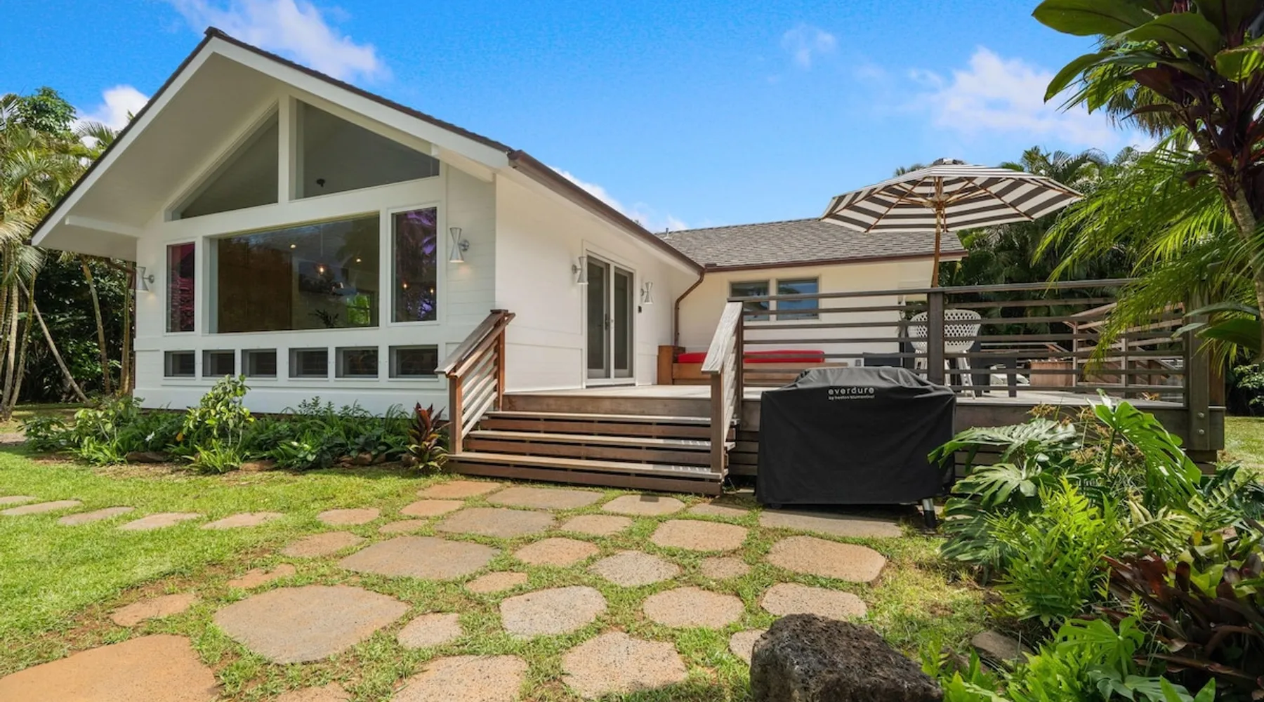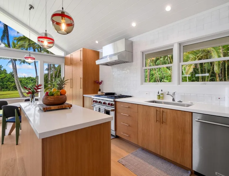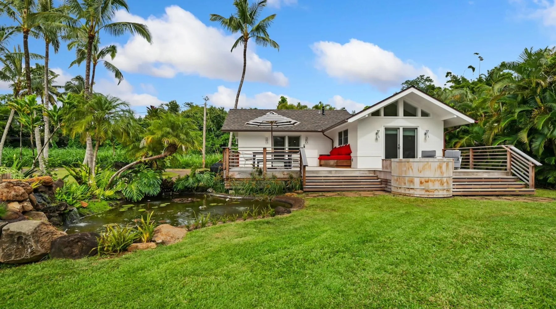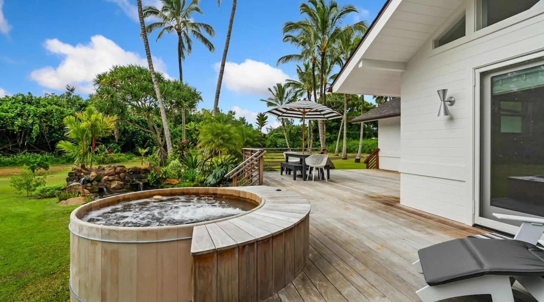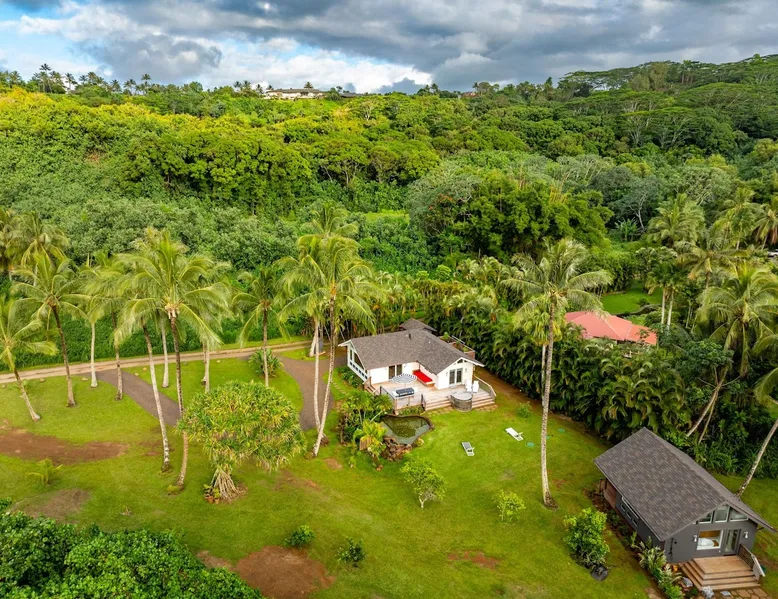 Coconut Hut The space A stylish reimagining of our ever-popular Coconut Hut. This perfectly positioned gem sits in a secluded park-like paradise within a 5-minute walk to the idyllic Anini beach. With new construction, the house contains hardwood floors, whole house water filtration, AC in all rooms, portable Sonos speakers, and WiFi indoors and on the deck. The living spaces boast a large fold out flat screen TV, Wolfe range with indoor grill, LG washer/dryer, dishwasher, refrigerator, and freezer with ice maker. There is a Heston outdoor bbq for grilling. The interior furnishings are a mix of vintage bamboo, midcentury classics, and koa wood Hawaiian furniture. The great room is filled with light, complete with an expansive view of the coconut trees on the property. A large remote-controlled shade allows for complete privacy, day or night, from the glass wall in the living room. The light and ambiance are fantastic throughout the house. It is serene and modern with a big nod to midcentury design, Hawaiian, and Asian art. Beautiful inside and out. The primary king bedroom includes a stunning bathroom with Toto toilet, dual sinks, private outdoor shower garden featuring unique Hawaiian plants and a redwood soaking tub. There are ample closets, built in storage, and a dresser. The secondary queen bedroom includes a bathroom with Toto toilet and an adjacent private outdoor shower garden featuring Hawaiian native plants. There is ample storage available in the second bedroom. The exterior includes a new, expansive deck with hot tub, outdoor dining, and built in daybed. The outdoor water features in the pond create a backdrop for relaxation. Enjoy looking up at the stars and taking in the vast surrounds. At the rear of the property, there is a private guest house that will remain unoccupied during vacation rentals and is not available to rent. Indoor Features: - 1 King, 1 Queen Bed - Air Conditioning in all rooms - Full Kitchen - Washer & Dryer Outdoor Features: - Lanai - Yard - Hot Tub - Grill The Area: - Short Walk to Anini Beach - 10 minute drive to Princeville - 20 minute drive to Hanalei Bay Hawaii Life Rentals is a locally owned, licensed real estate company with rentals on Kauai, Maui, Oahu, and Hawaii. We offer on-island personal assistance and Concierge services. Rates do not include taxes, cleaning and applicable fees. VRBO/Hawaii Life bookings: Guests must sign a rental contract within 48 hours of booking to confirm the reservation. * This home is located in a Tsunami Evacuation Zone * TA-199-886-0288-01 SP 2012-25 TVNCU 4243 Registration Details 530040180000, TA-199-886-0288-01