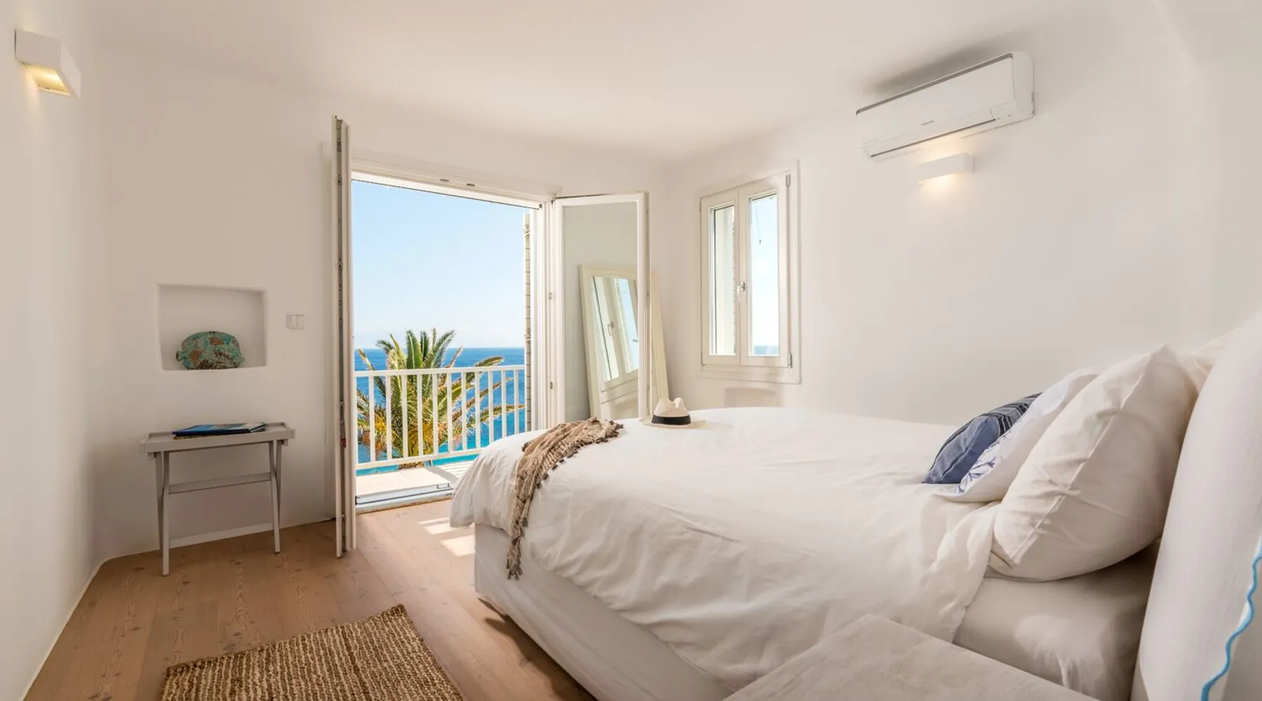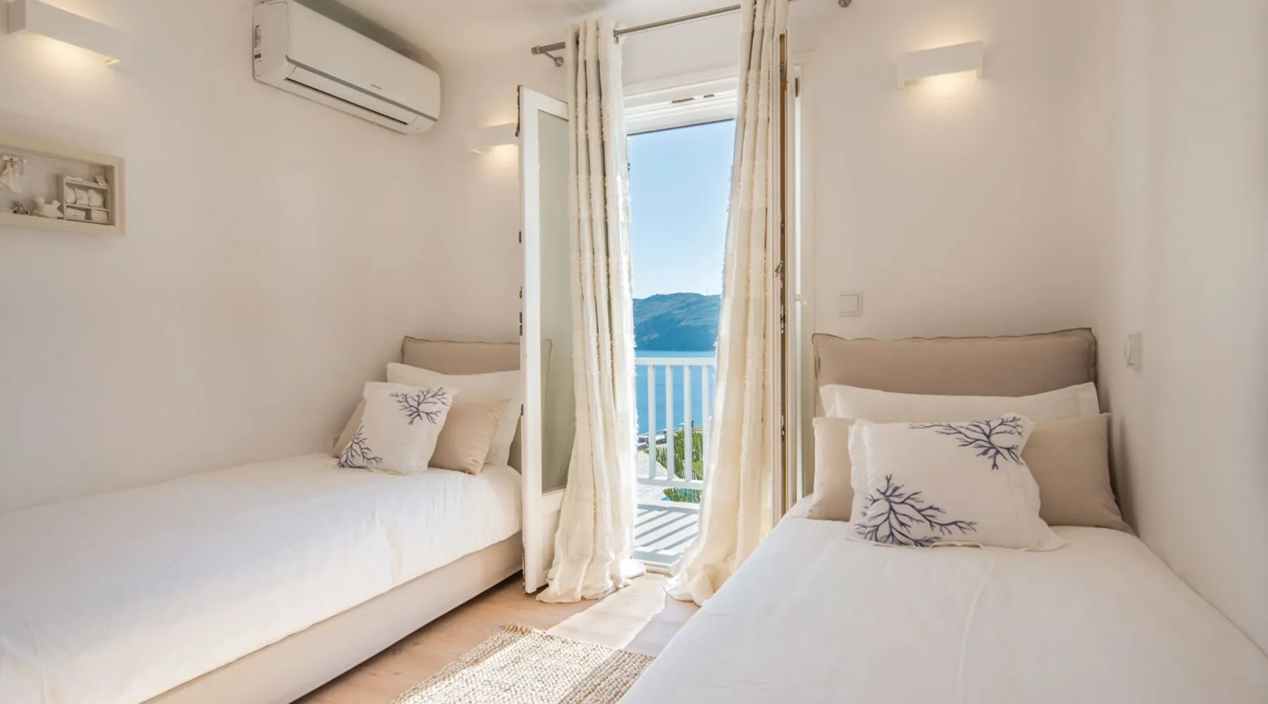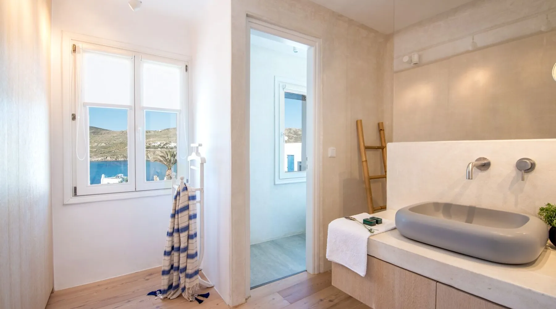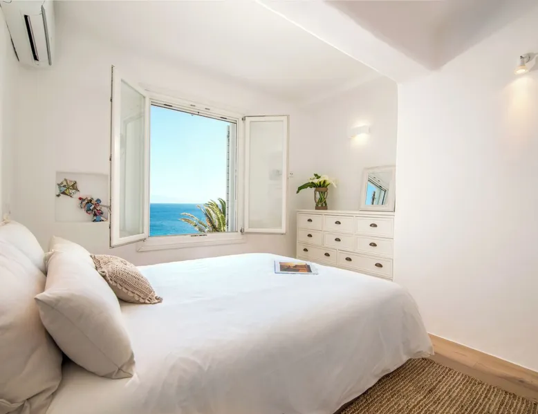 VILLA ISLAND Villa Island is located by the sea, in one of the most beautiful and picturesque beaches of the island Kalo Livadi beach. The villa is developed in two levels both of them with amazing sea view. Entrance Level - The living room is modern, warm and inviting. The large comfortable sofa and the signature furniture items compose a stylish ambiance. The well-equipped, functional, open space kitchen is located on the same floor with the open air dining area. At the same level there is a modern, atmospheric bathroom. Mezzanine - the convertible sofa of the mezzanine can host an extra guest if needed. Top Level - On the upper floor there are the three bedrooms of the villa. The master bedroom with an extra large bed and en-suite bathroom has amazing view to the big blue Aegean Sea. At the same floor are the second double bedroom, the bedroom with twin beds and the shared bathroom. An independent guestroom with a single bed is located close to the outdoor entrance of the villa. Please be aware that a 15€ per night Climate Resilience Tax is applied to all reservations from 1st of March to 30th of October.