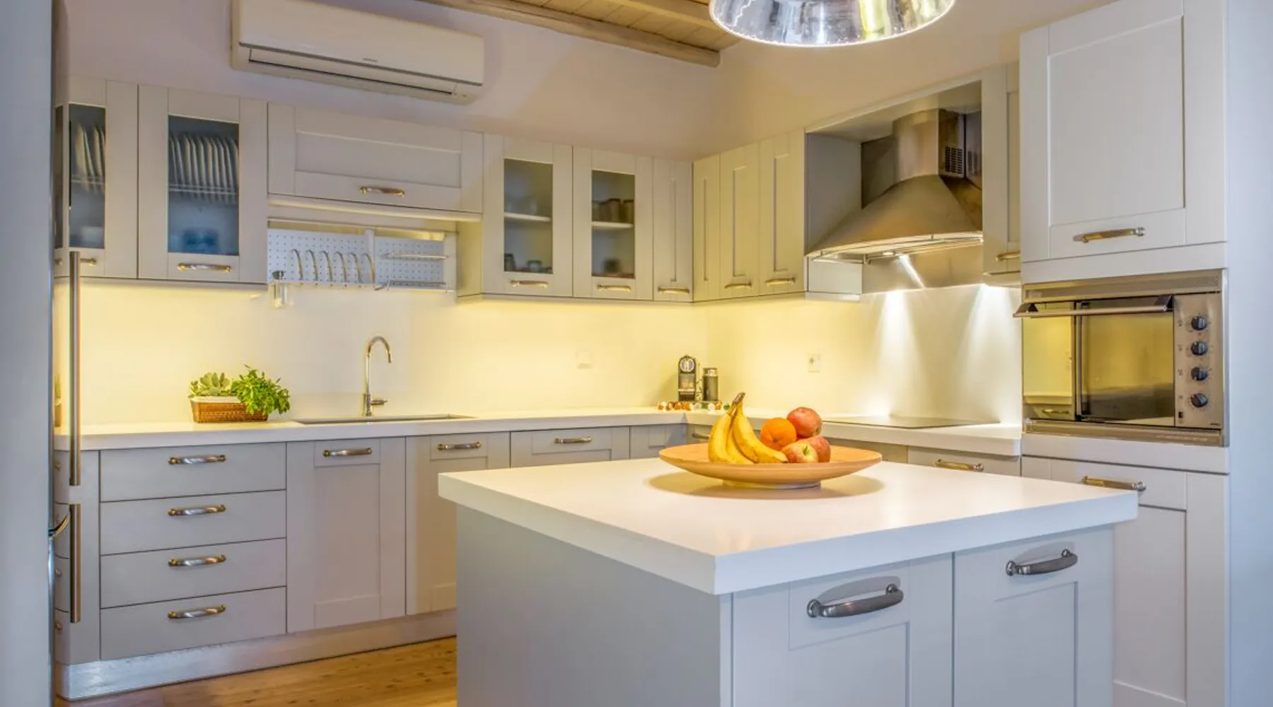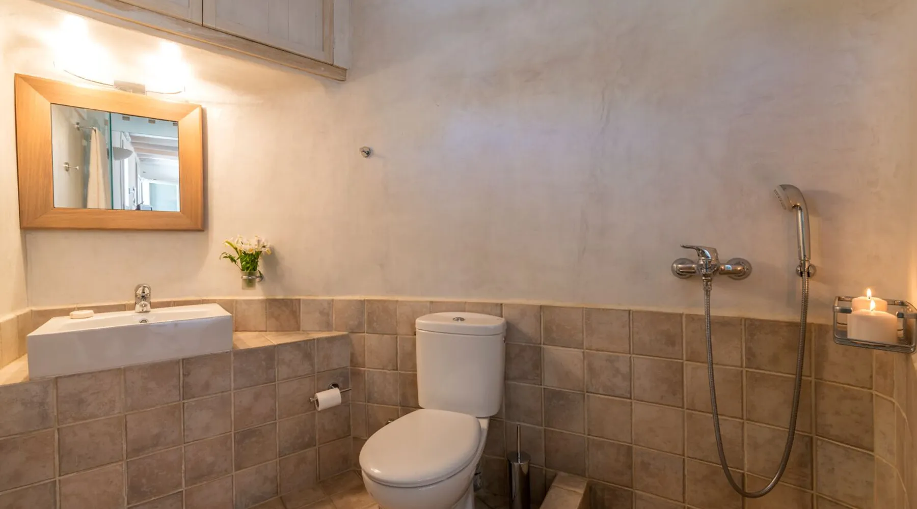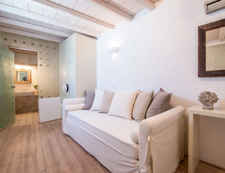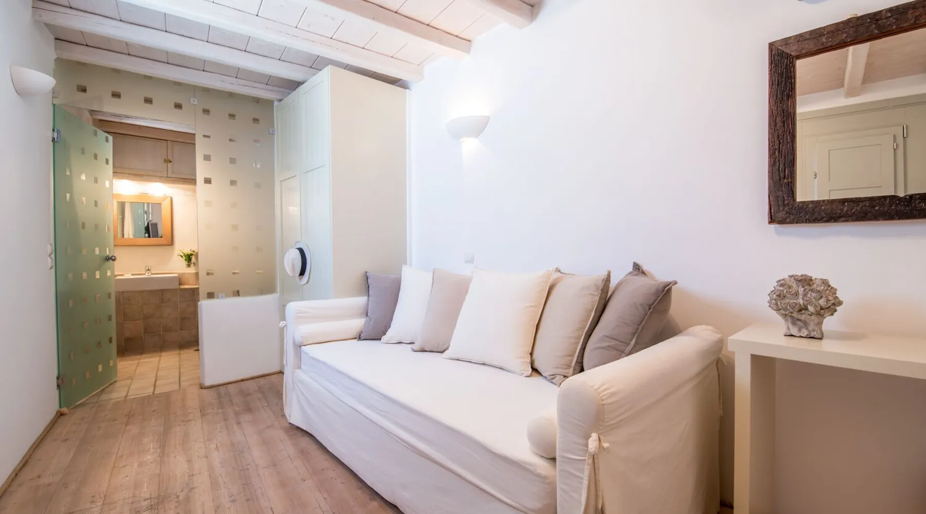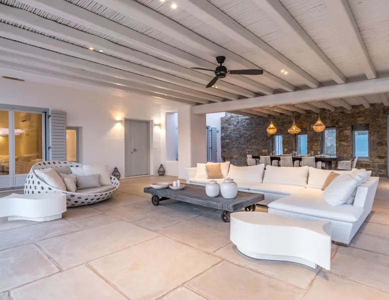 VILLA ISLAND Villa Island is located by the sea, in one of the most beautiful and picturesque beaches of the island Kalo Livadi beach. The villa is developed in two levels both of them with amazing sea view. Entrance Level - The living room is modern, warm and inviting. The large comfortable sofa and the signature furniture items compose a stylish ambiance. The well-equipped, functional, open space kitchen is located on the same floor with the open air dining area. At the same level there is a modern, atmospheric bathroom. Mezzanine - the convertible sofa of the mezzanine can host an extra guest if needed. Top Level - On the upper floor there are the three bedrooms of the villa. The master bedroom with an extra large bed and en-suite bathroom has amazing view to the big blue Aegean Sea. At the same floor are the second double bedroom, the bedroom with twin beds and the shared bathroom. An independent guestroom with a single bed is located close to the outdoor entrance of the villa. Please be aware that a 15€ per night Climate Resilience Tax is applied to all reservations from 1st of March to 30th of October.