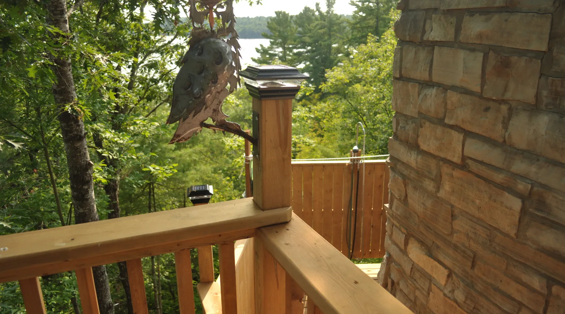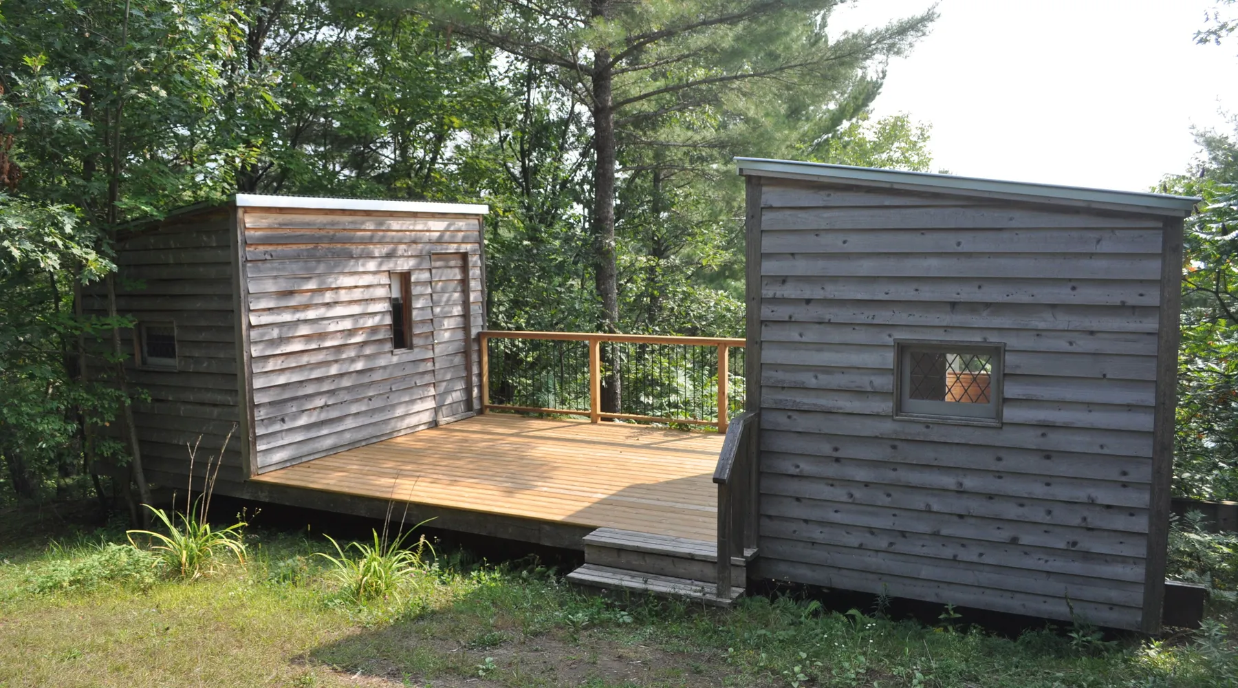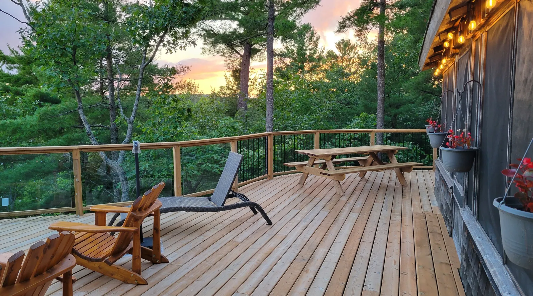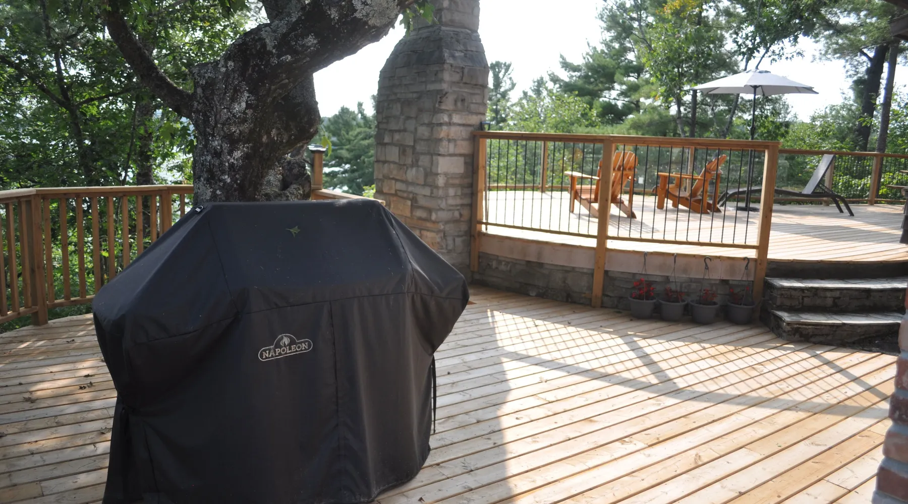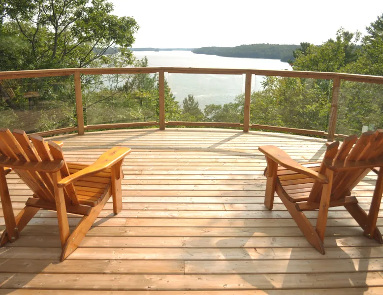 With stunning views from the highest point on the lake, a wrap-around deck, wood-fired sauna with outdoor shower and 4+ acres of privacy, the Upper Deck is the perfect off-grid getaway for those who are looking slow down, relax, and unwind. If you're looking for a modern drywall-and-tile Muskoka party house, this isn't it. This is a place where you come to watch the smooth waters of the lake and listen to the sounds of the forest. If you're lucky, you'll see our local wildlife, which includes deer, foxes, porcupines, owls, eagles and more! The master bedroom upstairs has a queen bed, half-bath, and breathtaking views of the lake from a built-in desk (if you absolutely have to answer that one email, but we really recommend you don't). Downstairs is a full bath (shower only, no tub), but we highly recommend using the private and screened outdoor shower by the sauna (only occasionally will you get an audience of squirrels). If you're inclined to share this beautiful hideaway with your friends, adjacent to the main cabin are a pair of bunkies with their own shared deck. Each bunkie contains a built-in queen bed and sitting area with a loveseat, and has large windows that you can open to catch the night-time breeze up the cliff from the lake. For those times when you've got last-minute additions to your group, there is a queen-size pull-out couch in the main cabin. The highlight of this property isn't what's inside, though, it's what's outside. Nearly 1,000sq ft of deck wrap around three sides of the main cabin and give panoramic views down the length of Gull Lake, one of the largest lakes in the area. A picnic table, sun umbrella and outdoor seating (including two hand-finished wooden Muskoka chairs) mean you'll want to spend every spare minute you've got soaking up the sun and enjoying a cold drink (Coleman cooler provided, we recommend picking up ice and ice cream at Kawartha Dairy). For those days when the weather won't co-operate, there is a gorgeous screened-in porch with a day bed (which is amazing for afternoon naps even on sunny days). When the weather is a bit cooler, hidden under the deck is a cedar-panelled wood-fired sauna (firewood provided), and the previously-mentioned outdoor shower. The Upper Deck is off-grid and powered by solar. There is a backup generator in the event the sun suddenly takes an extended vacation, but you've got enough battery power for the general living. High-draw and high-use appliances (hotplates, heaters, air-conditioners or big stereos) may draw down the batteries quickly and leave you in the dark. Our experience has been that if you're just using normal amounts of power (this includes high-draw items that are only used occasionally, like an electric kettle or an air fryer), the system will run indefinitely. Phone chargers, laptops, TVs, etc aren't going to cause a problem, even if it's been cloudy for a few days. Heat is propane or wood. Both are provided, more details will be given once your booking is confirmed. We cut and split our own wood from the property, please do not bring in firewood from off-site (this can transport invasive species and diseases to our beautiful forest). We provide sparkless fire logs for the fireplace on the deck since there's no hearth to catch sparks from real wood. The property includes private waterfront on Gull River, with easy access to Gull Lake. The waterfront is about a 5min walk down a walking trail, a map will be provided once booking is confirmed. Please bring your own life jackets and water toys. For those of you bringing boats, there are several launches on the lake, or you can launch at Rotary Park in Minden and boat down the river to the lake. There are no dock facilities at the Upper Deck, however we have a place on the lake nearby (a 10 minute walk to the cabin) and we can generally arrange moorings for most types of boats. The lake has excellent fishing and is great for water sports or simply cruising around. We want you to enjoy your time at the Upper Deck as much as we do when we stay there, please treat it with love and respect and come back often. If you have any questions, special requests, or compliments, send us a message!