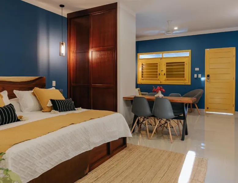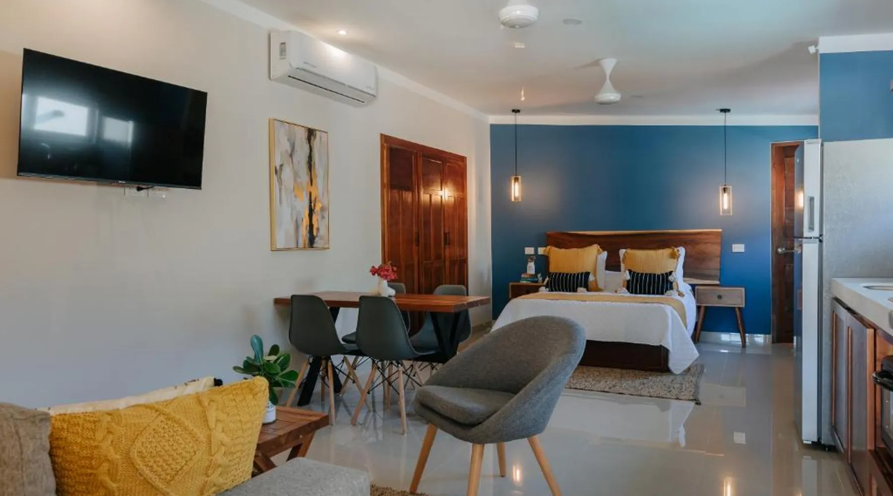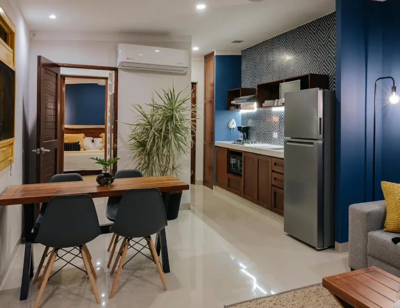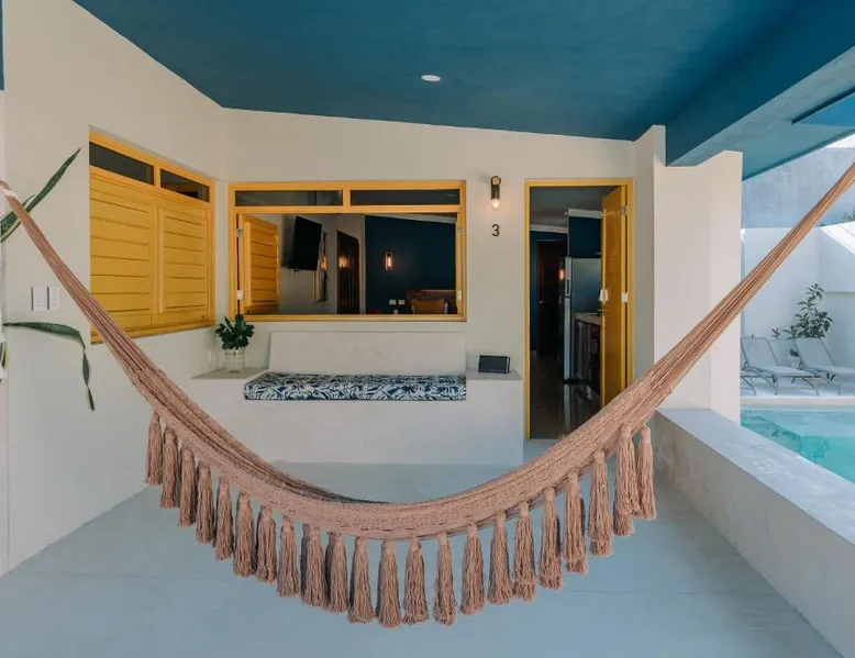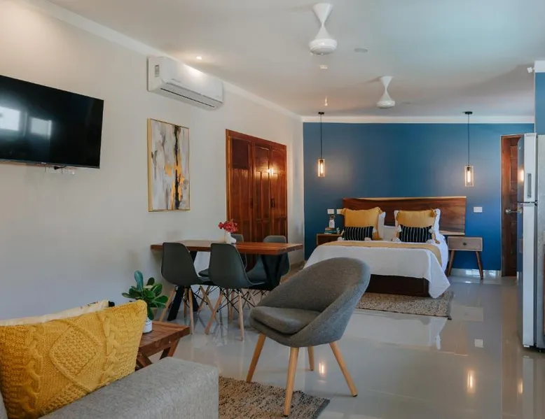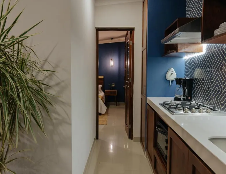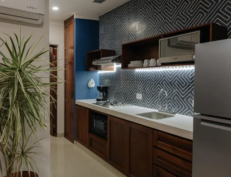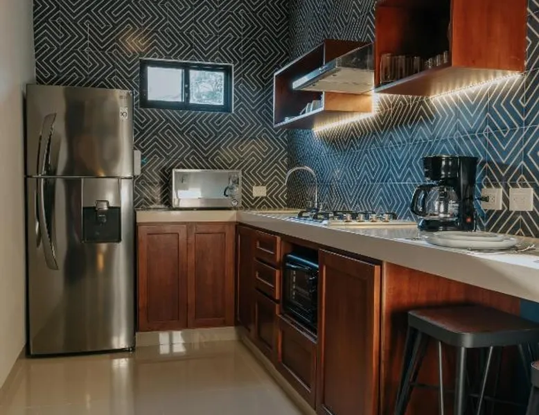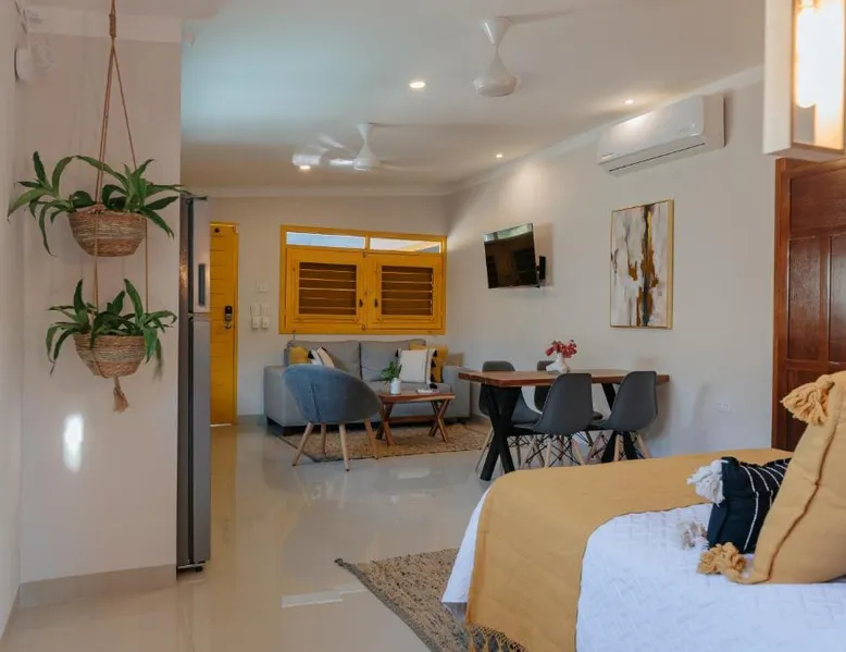 Elegant Accommodations: Mare Lindo Studios in Progreso offers an adults-only apartment with a garden, terrace, and a year-round outdoor swimming pool. Guests enjoy free WiFi, air-conditioning, and a private bathroom. Comfortable Amenities: The apartment features a fully equipped kitchen with a coffee machine, dining table, and outdoor furniture. Additional amenities include a balcony, patio, work desk, and free toiletries. Prime Location: Progreso Beach is a 2-minute walk away, while the Manuel Crescencio Rejón International Airport is 26 mi distant. Nearby attractions include Mundo Maya Museum (19 mi) and Dzibilchaltun Archaeological Site (17 mi). In the well-fitted kitchen, guests will find a stovetop, a refrigerator, kitchenware and a microwave. A seating area with a flat-screen TV, a desk, a terrace and a private bathroom are offered in this studio. The unit has 1 bed.