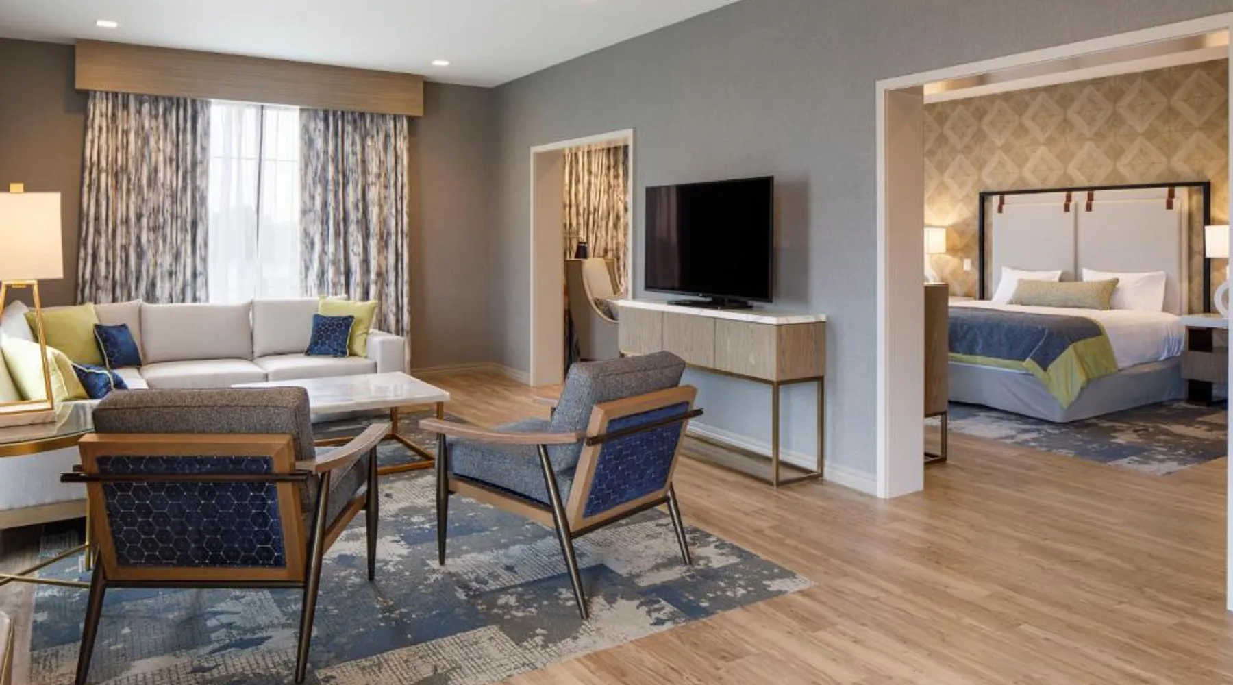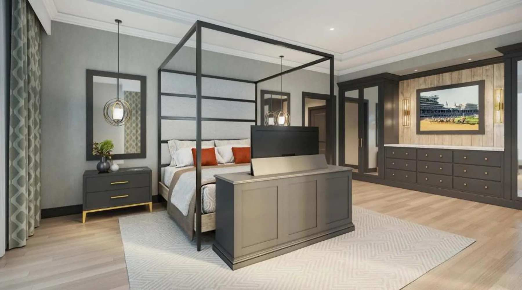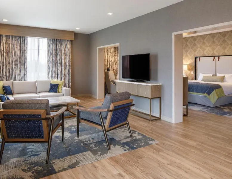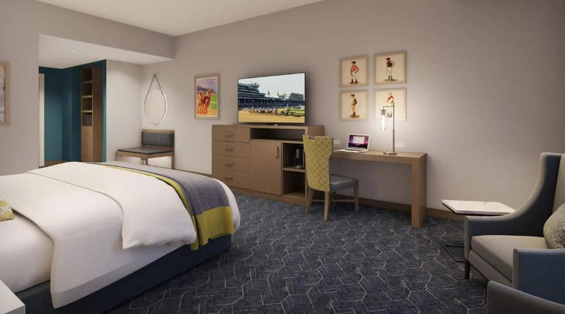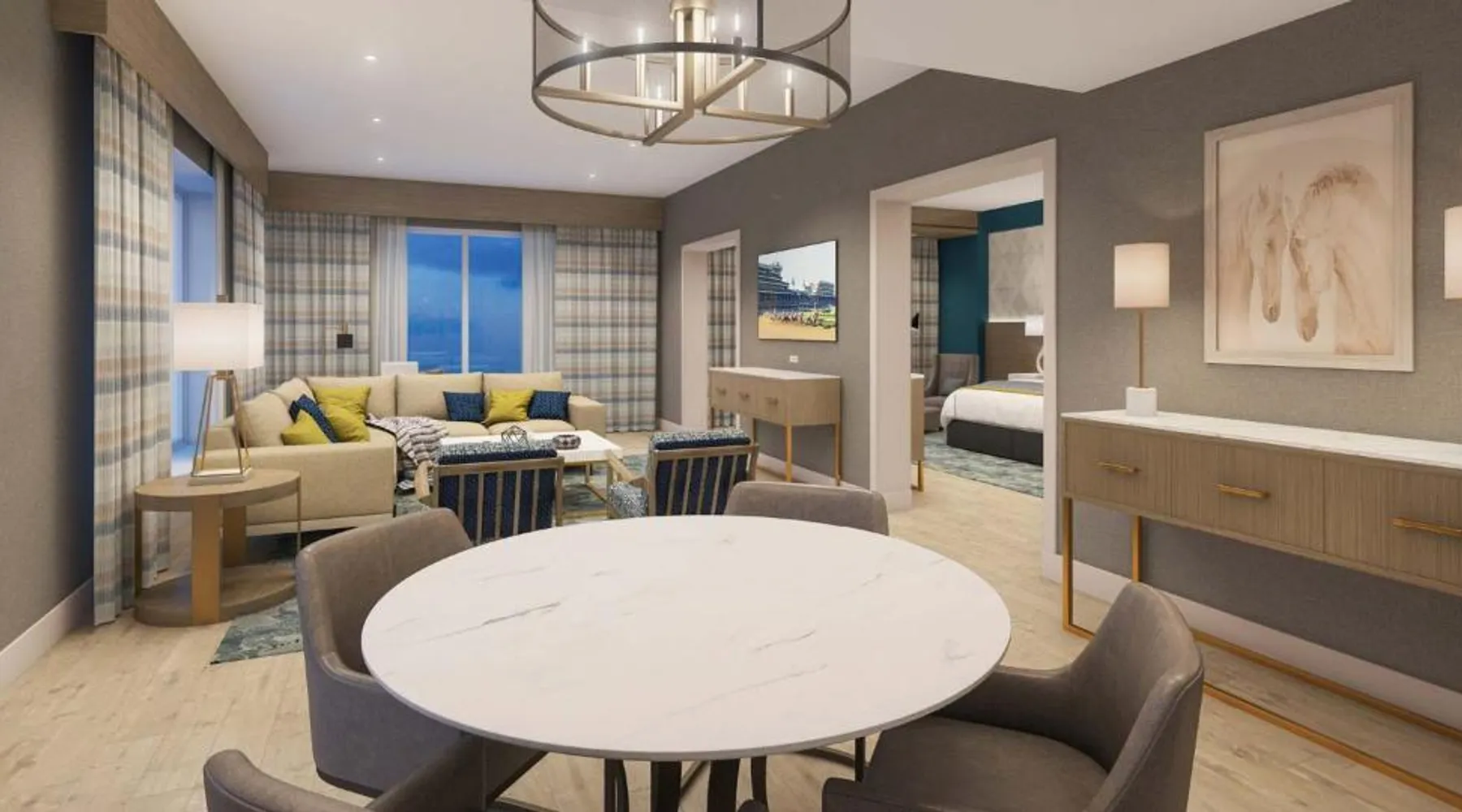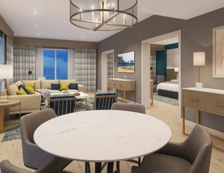 Comfortable Accommodations: Derby City Gaming & Hotel in Louisville offers spacious rooms with air-conditioning, private bathrooms, and modern amenities. Guests appreciate the room cleanliness and comfort. Dining and Entertainment: The hotel features a restaurant serving local and steakhouse cuisines, a bar, and a coffee shop. Evening entertainment includes live music and a casino. Convenient Location: Located 3.7 mi from Louisville International Airport, the hotel is near attractions such as Louisville Mega Cavern (1.7 mi) and Kentucky Derby (5.6 mi). Free on-site parking is available. This spacious suite consists of 1 living room, 1 separate bedroom and 1 bathroom with a walk-in shower and free toiletries. The suite features parquet floors, a seating area with a flat-screen TV with streaming services, air conditioning, a mini-bar, as well as a tea and coffee maker. The unit offers 1 bed.