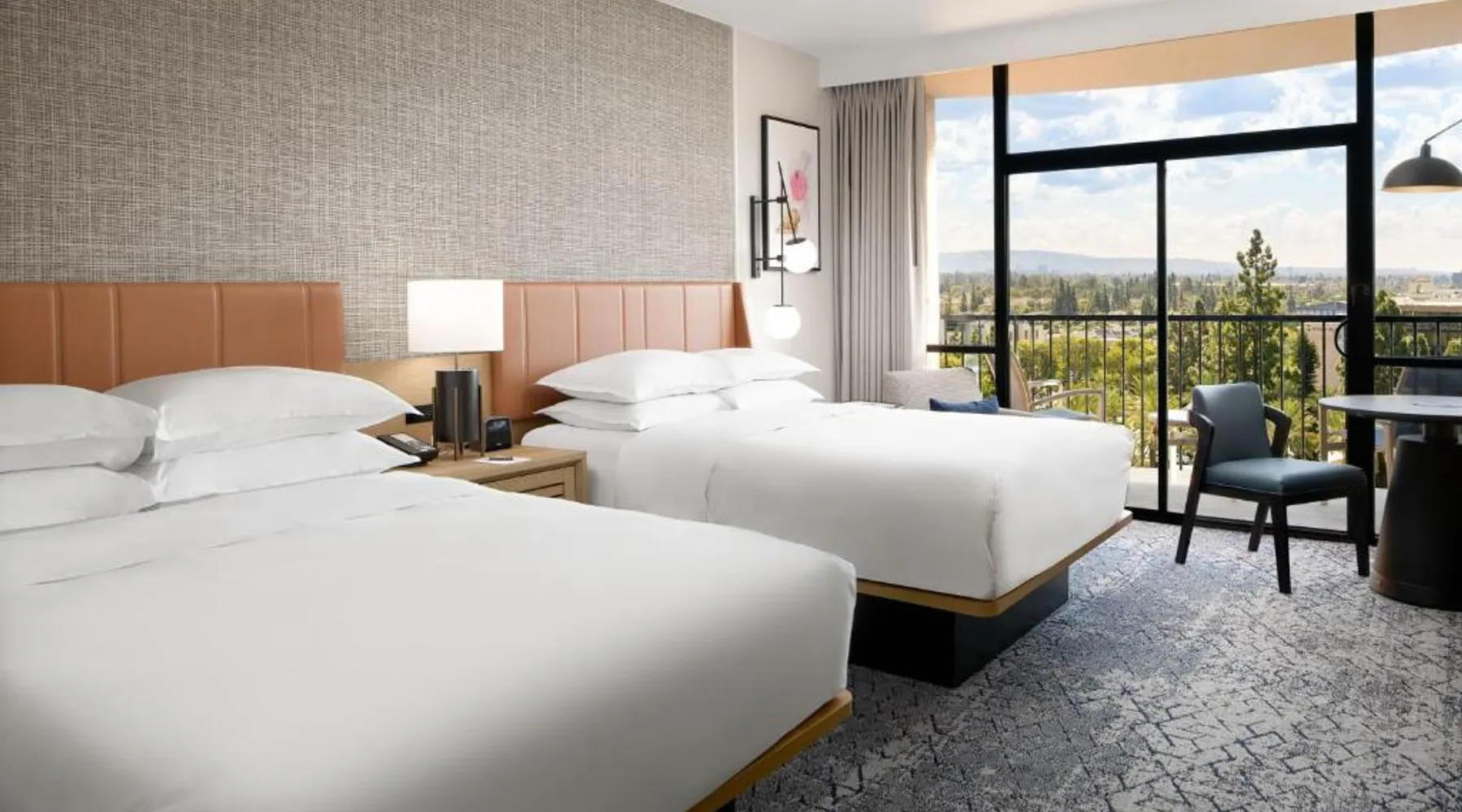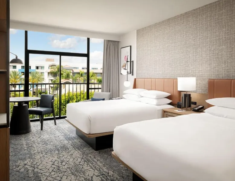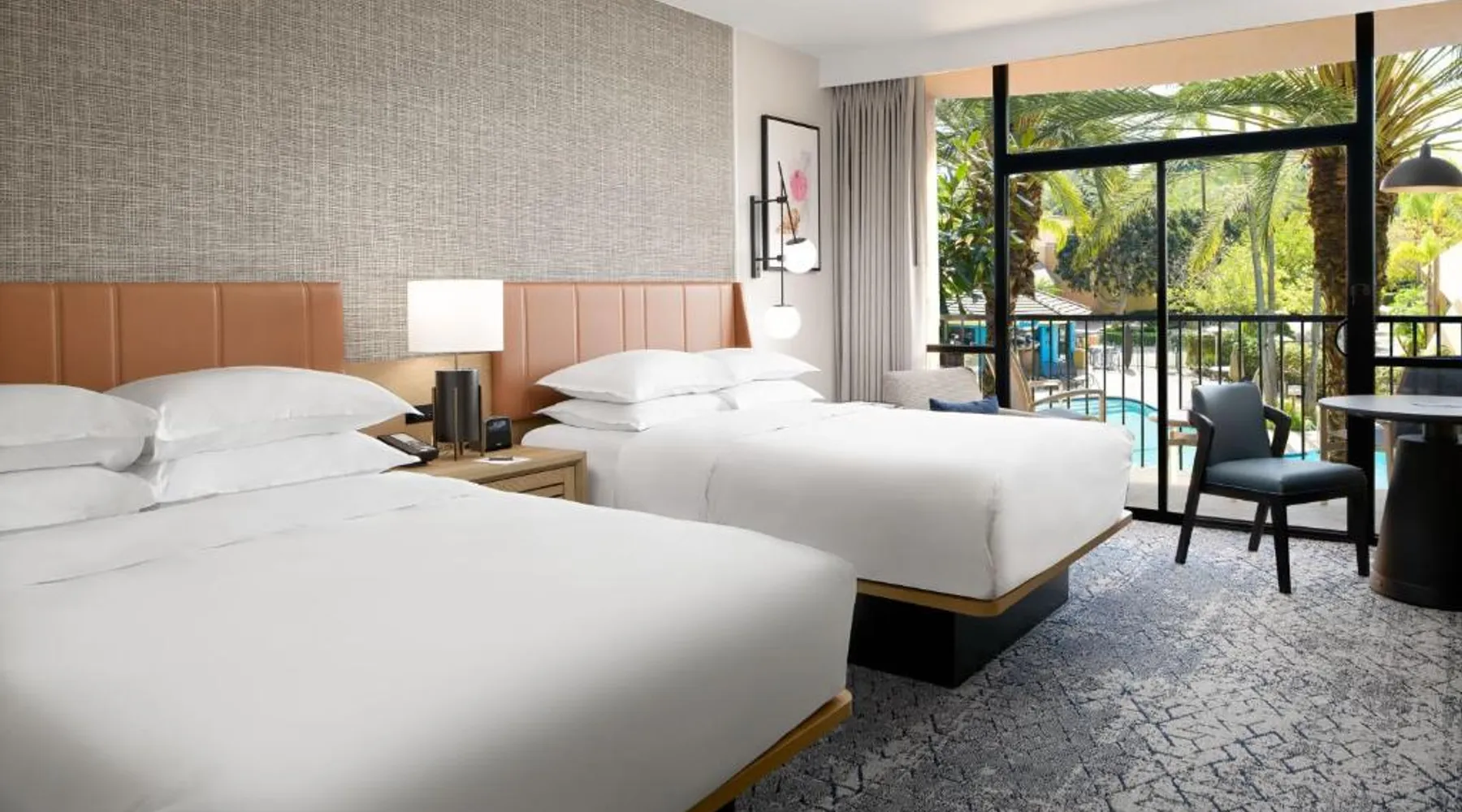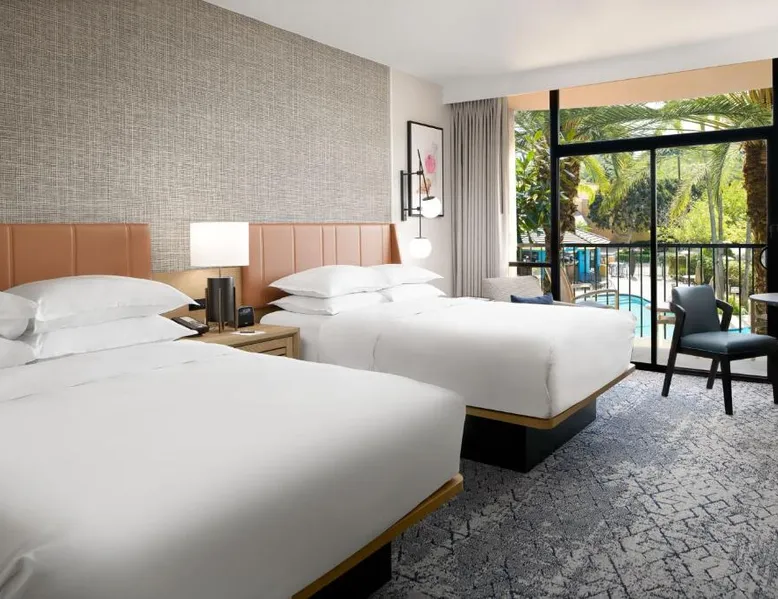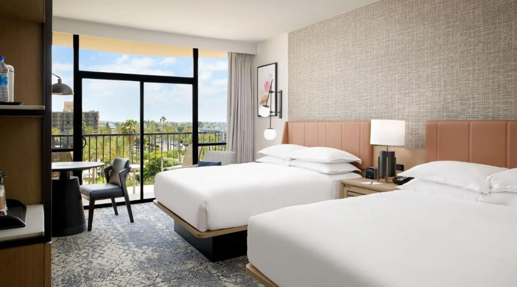 The Sheraton Park Hotel at the Anaheim Resort is ideally located within walking distance to the Disneyland Resort, the new Anaheim GardenWalk and the Anaheim Convention Center. Settle into one of the 490 guest rooms and suites, all featuring private balconies with views of either the lushly landscaped patio and pool area, or the Disneyland Resort and GardenWalk. Savor Stone Hearth Pizza & Wine is our full service restaurant offering Neapolitan-style pizza featuring seasonal prime toppings cooked before your eyes in a stone hearth oven and served as a continuous dining experience. Enjoy additional on-site dining at Savor breakfast, &More a la carte dinner, and SPLASH Pool Bar. The unit has 2 beds.